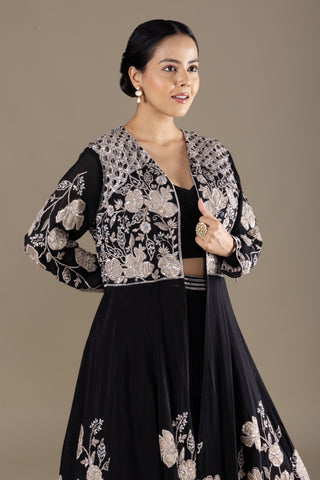 Onyx Black Lehenga with Statement Silver Floral Hand Embroidery