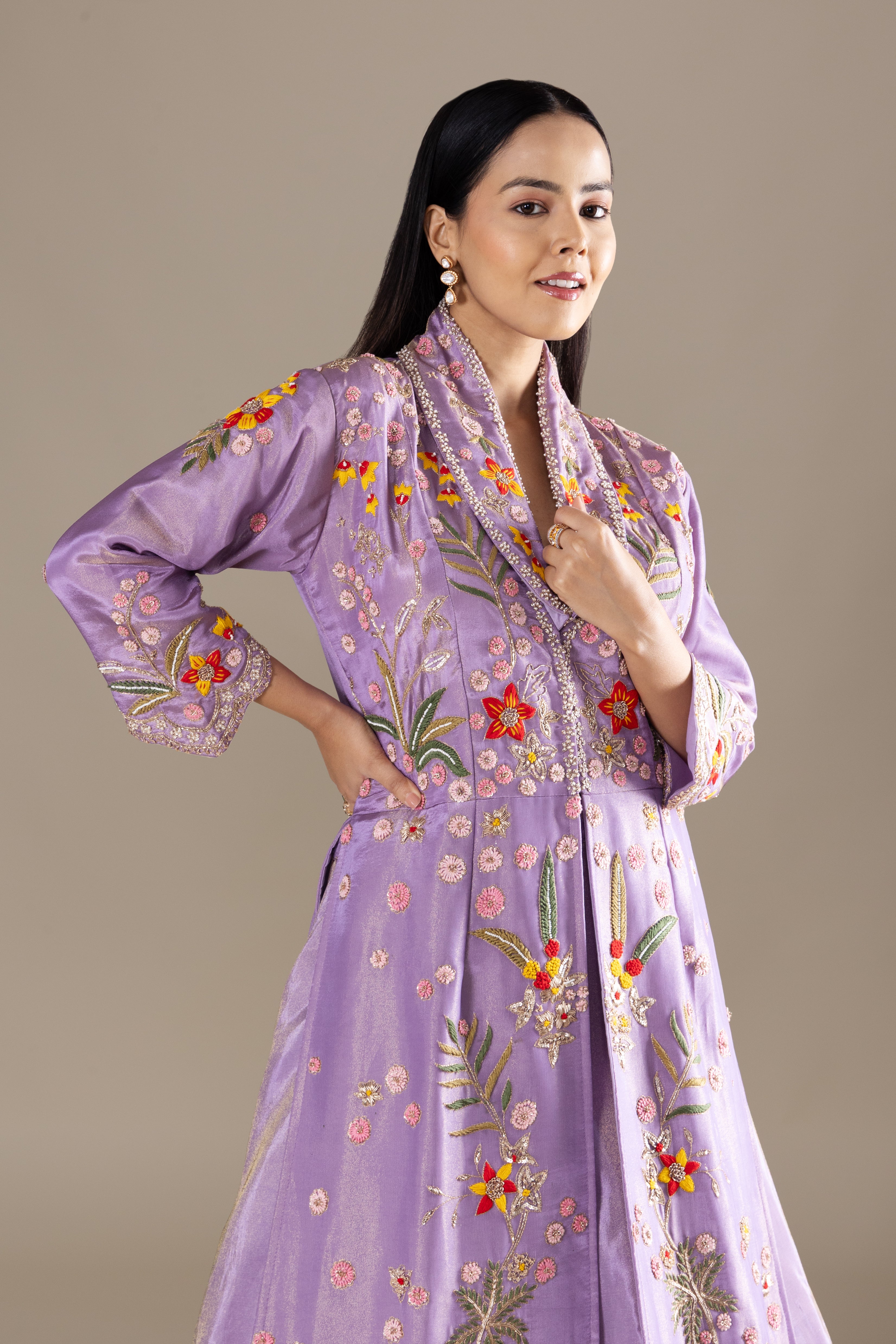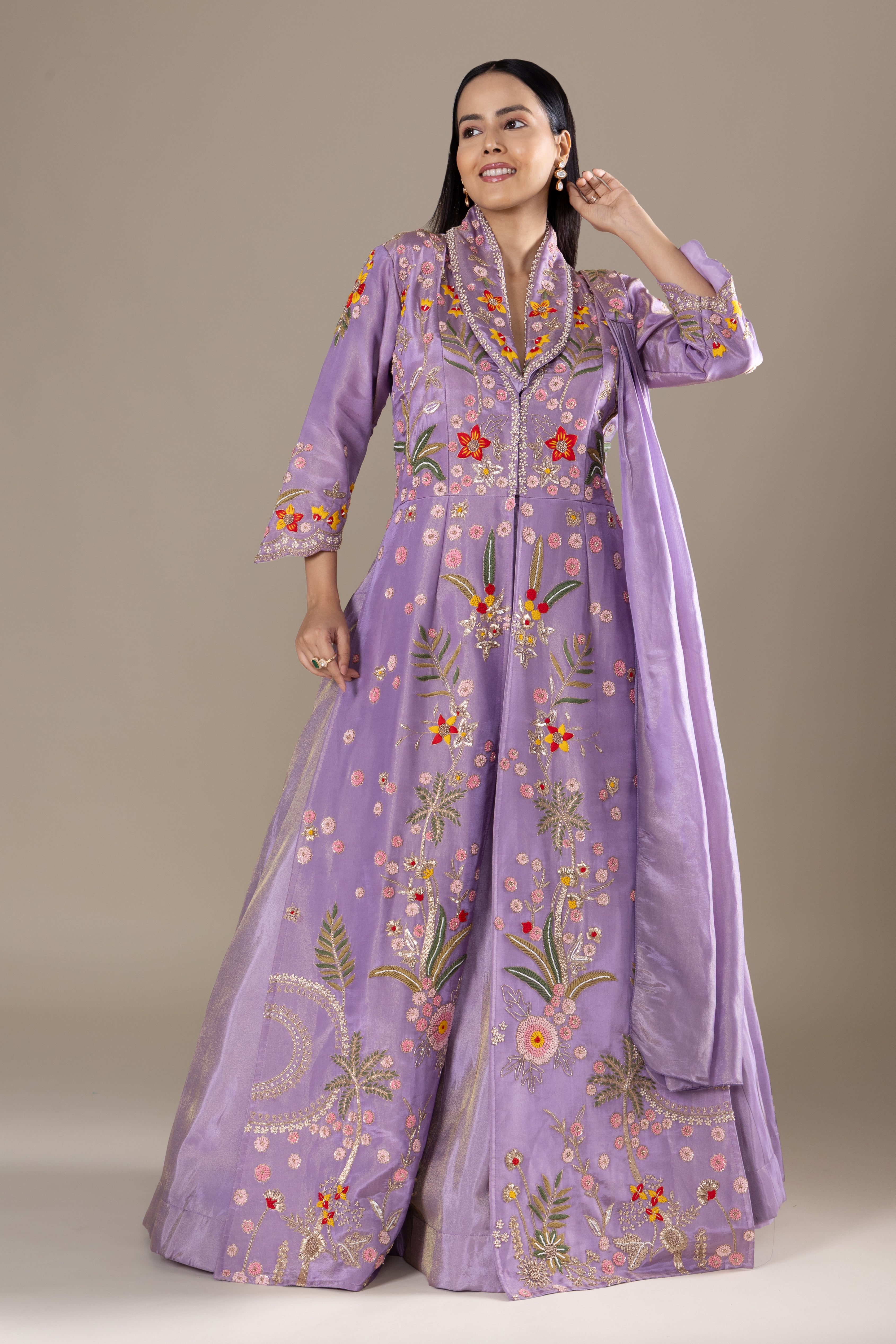 Step into whimsical beauty with this collared jacket lehenga featuring vibrant multi-coloured floral embroidery and a breezy Dupatta, creating a soft yet statement-worthy festive look.
