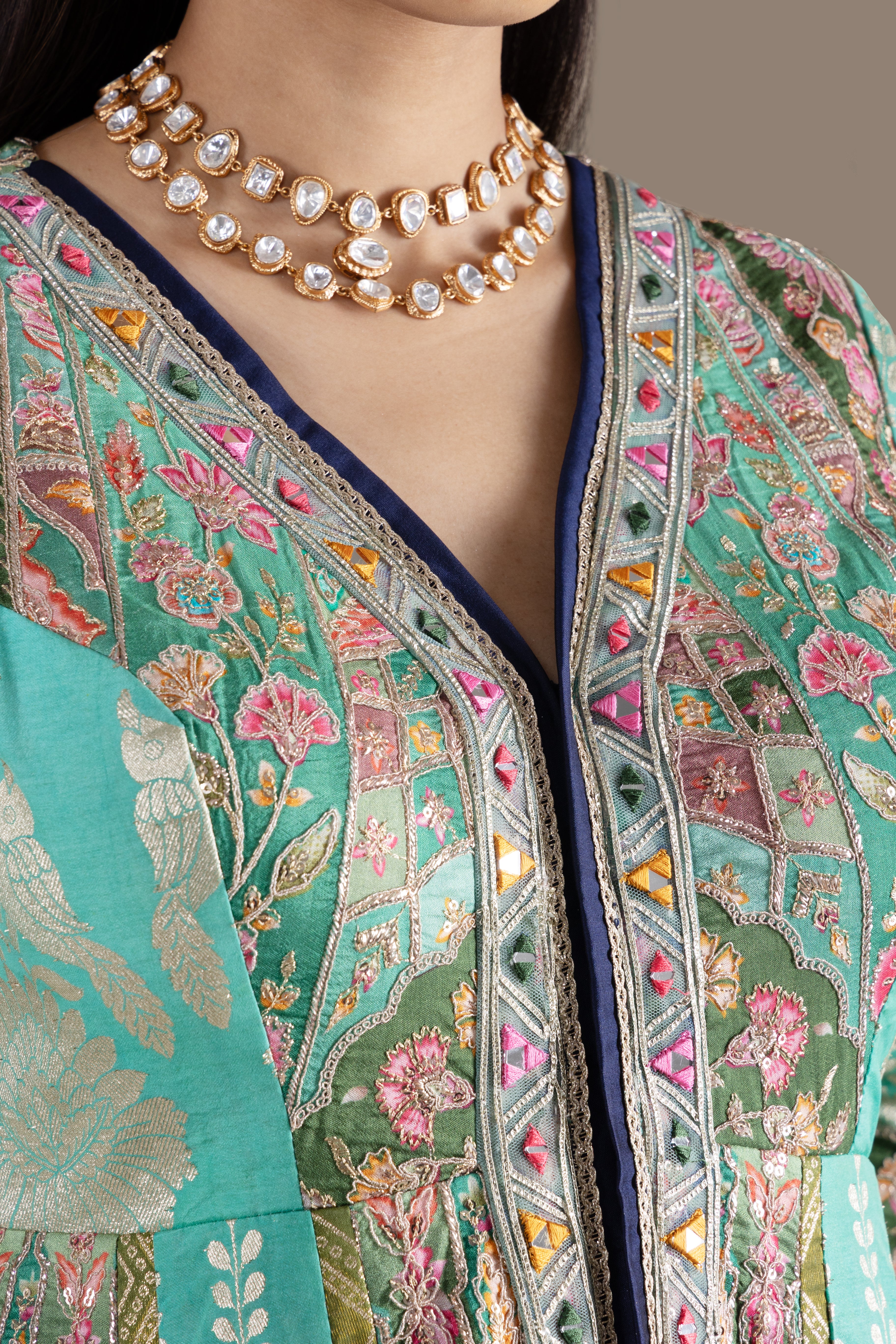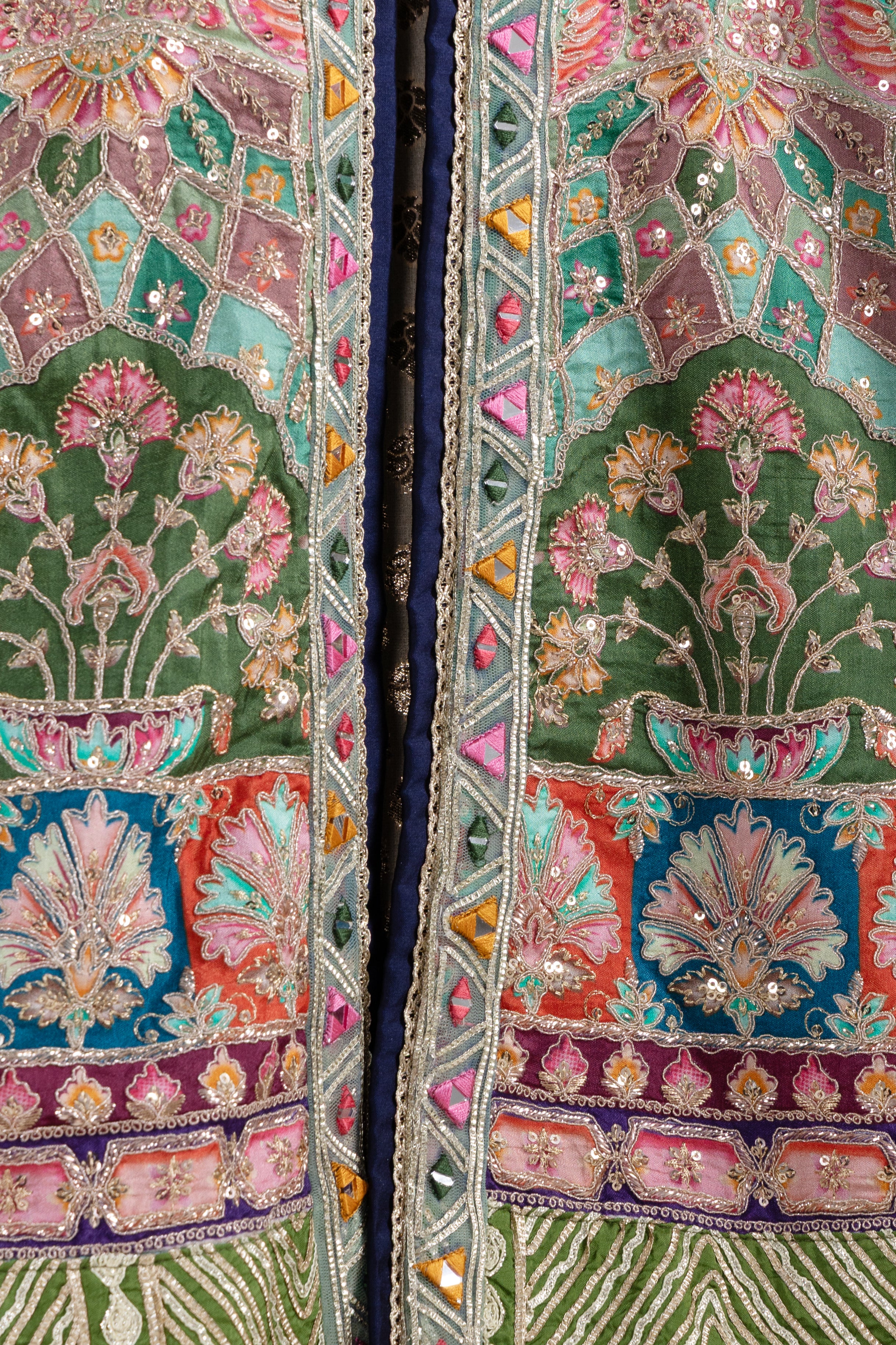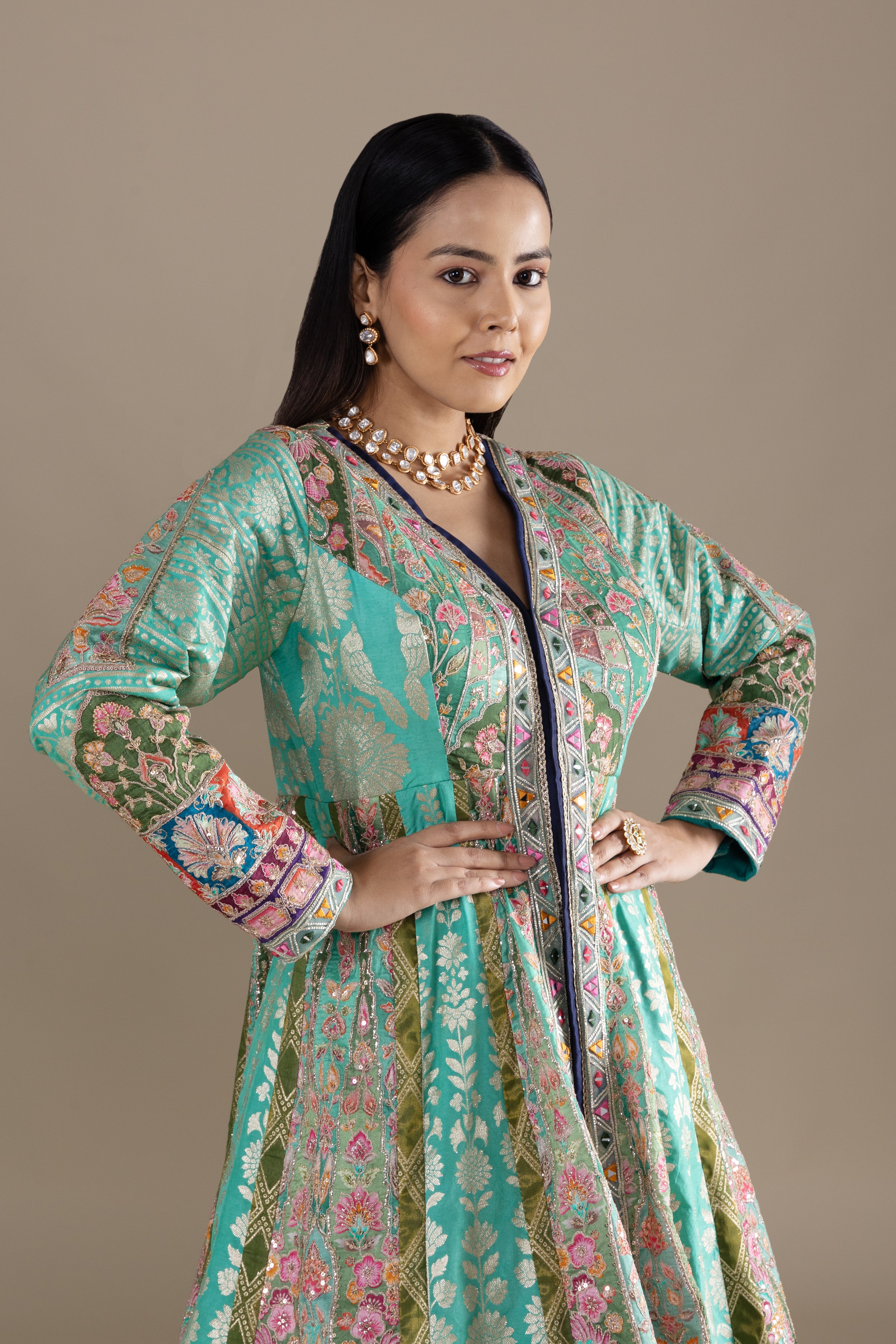 Step into pastel dreams with this mint green brocade Jacket Lehenga featuring multi-coloured floral and geometric weaving, highlighted with mirror work and an airy net Dupatta for added grace.