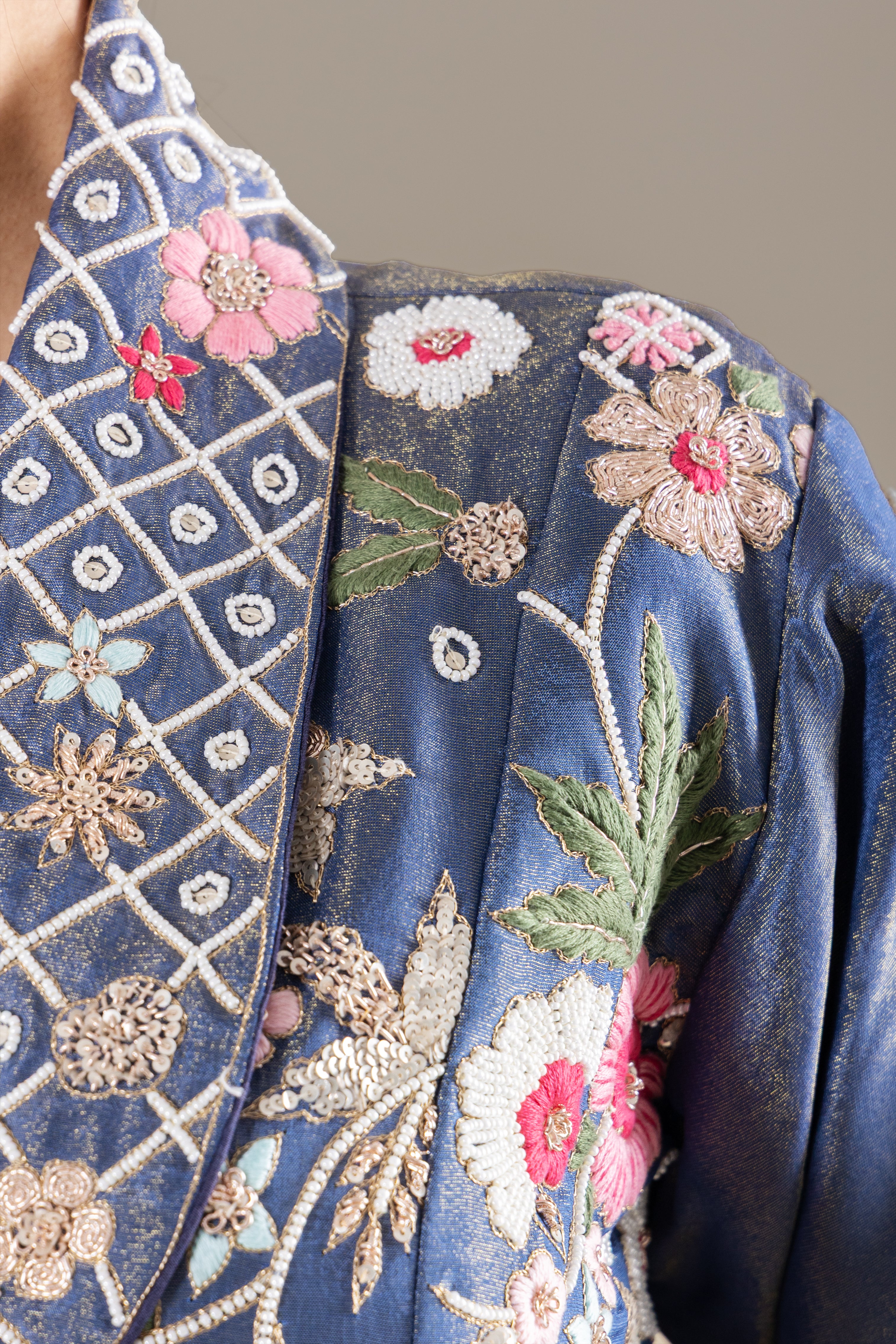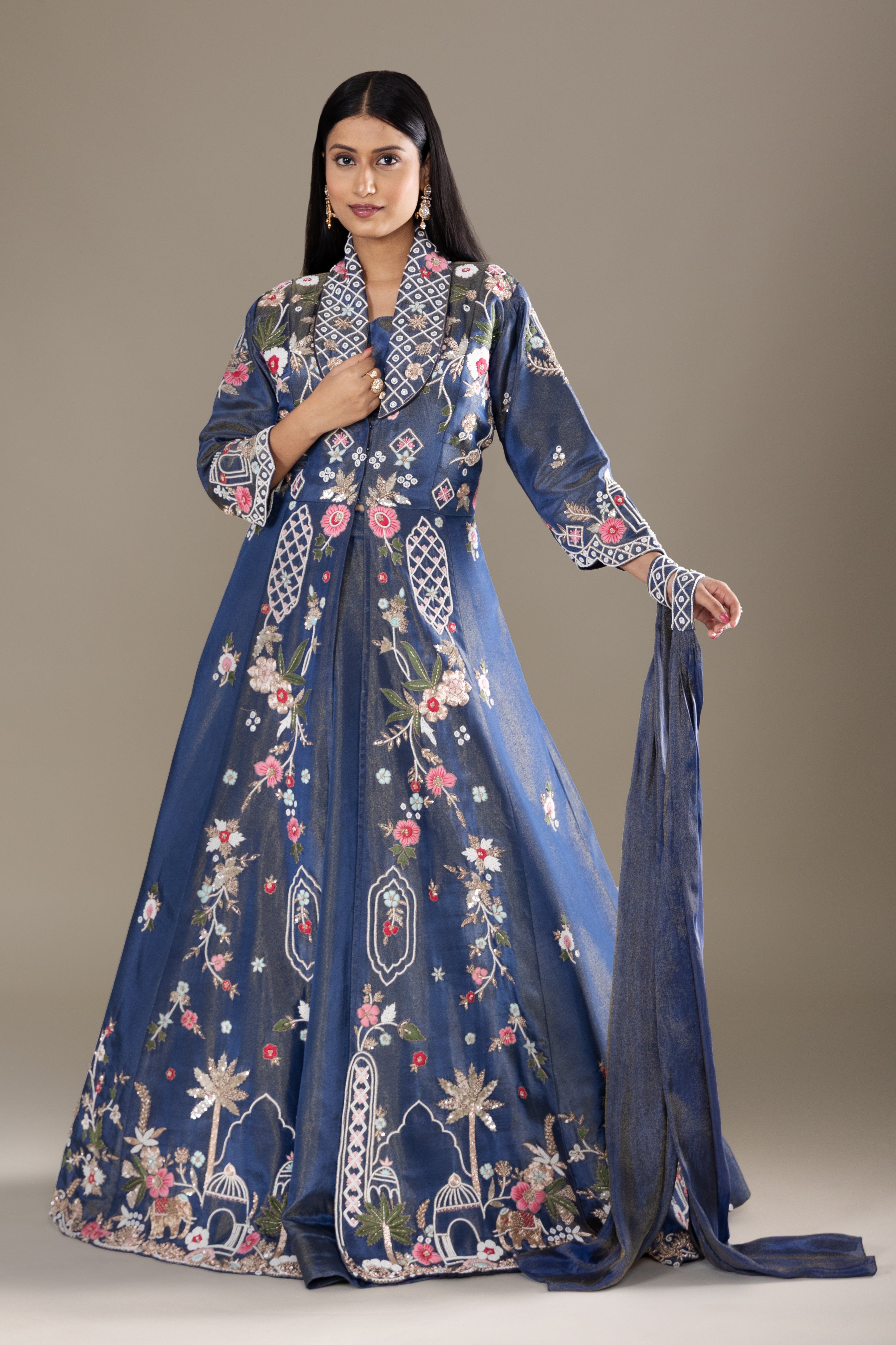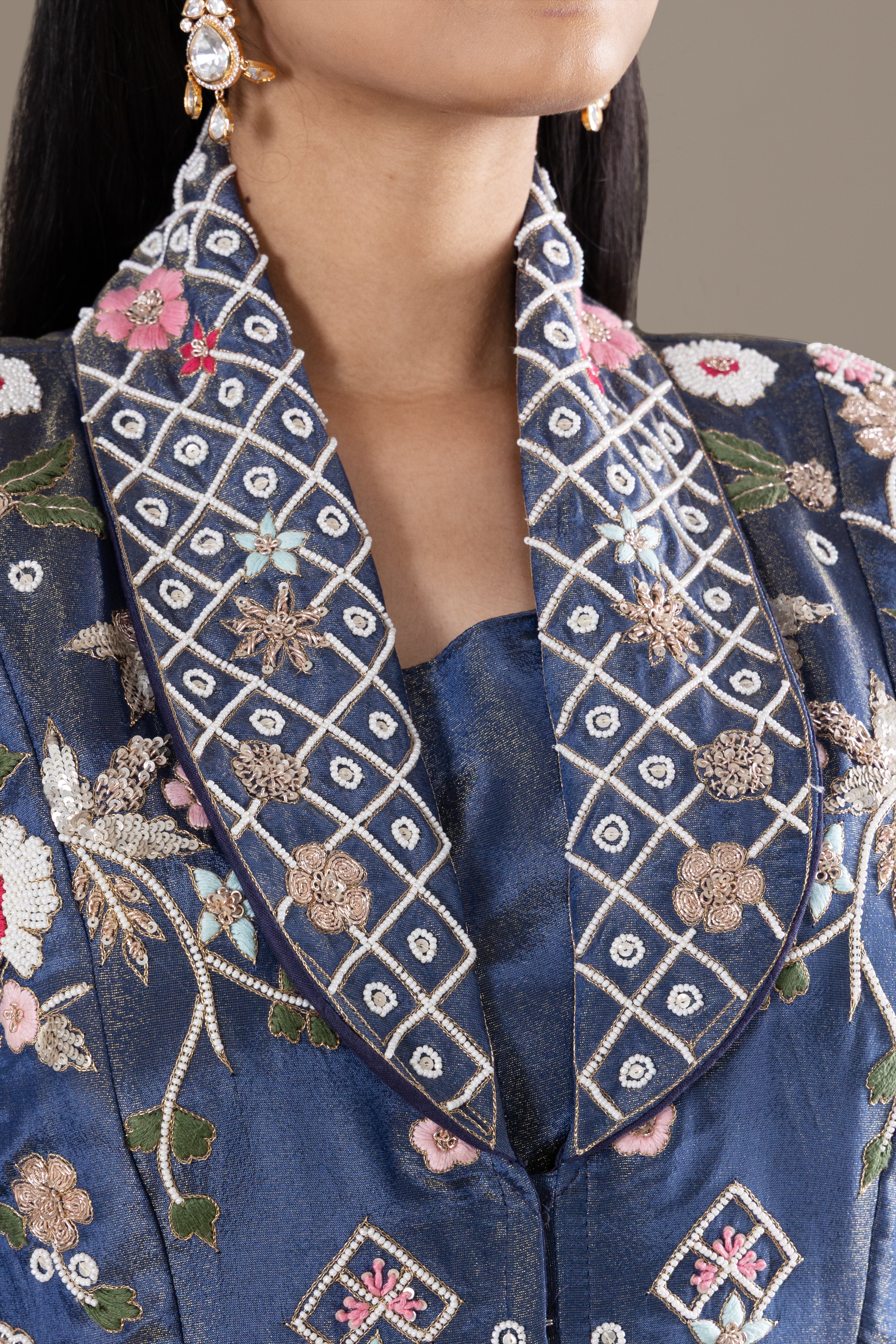 Celebrate regal charm in this midnight blue Jacket Lehenga featuring intricate multicolour floral embroidery, a tailored shawl collar, and a flowy ghagra, giving a majestic silhouette.