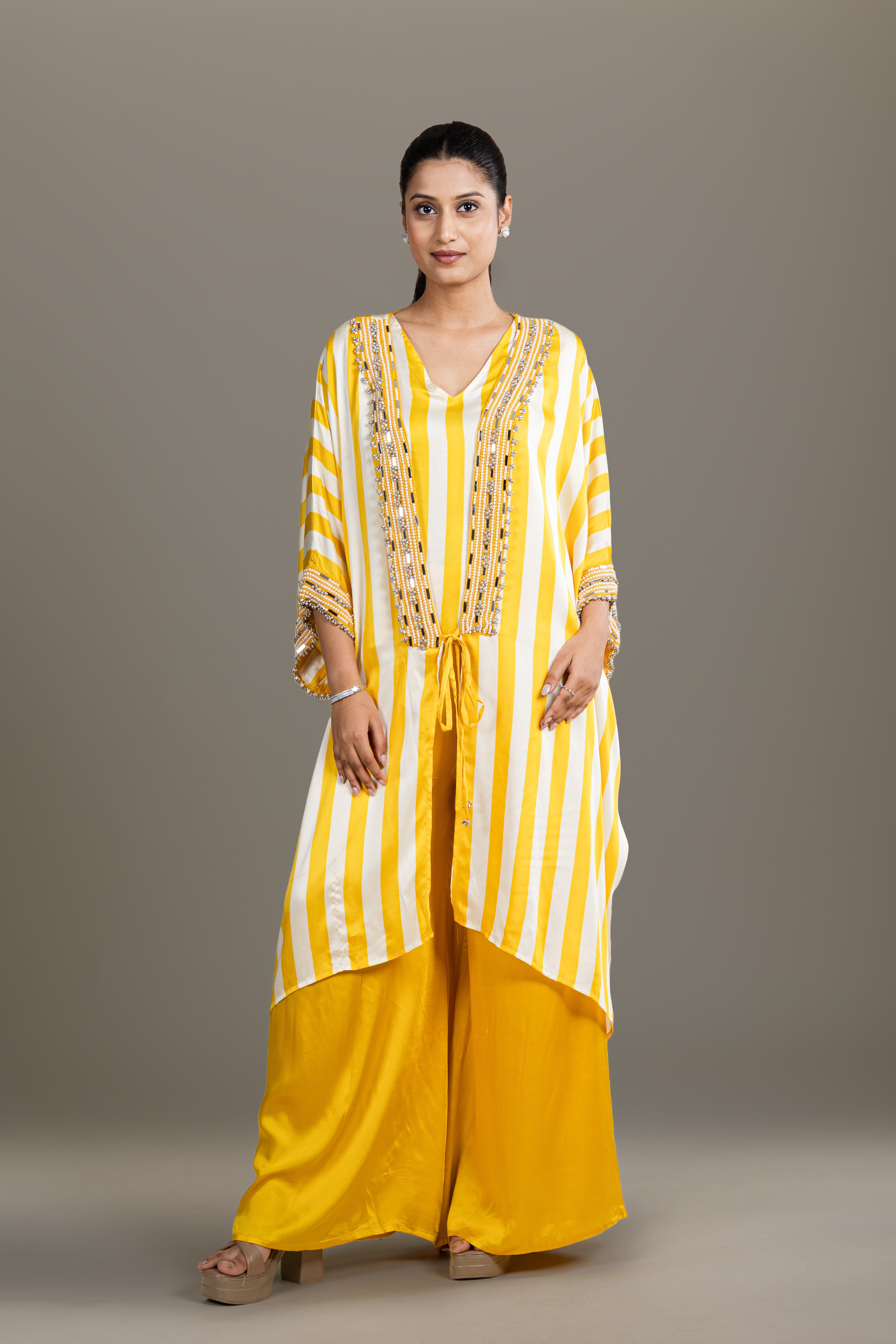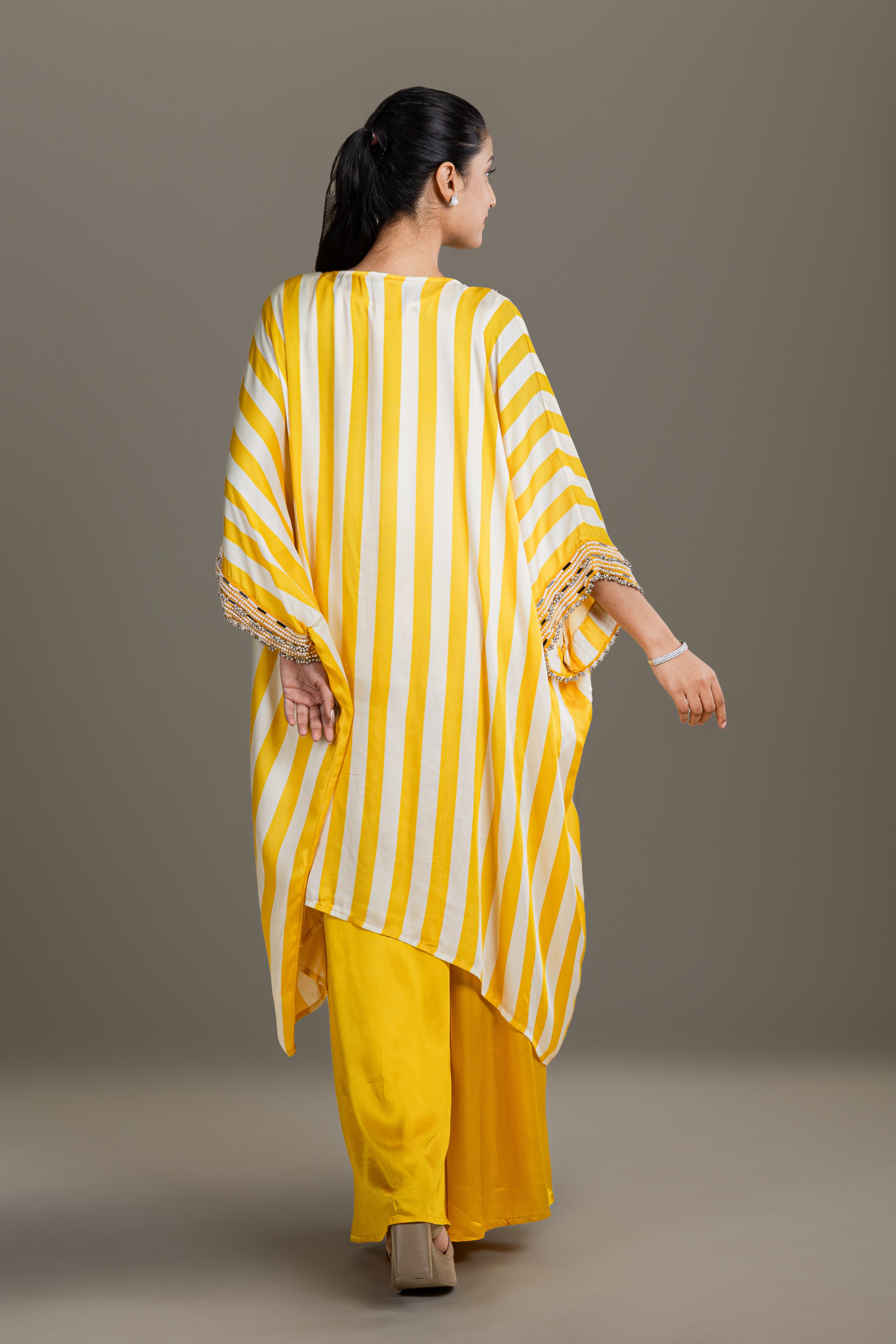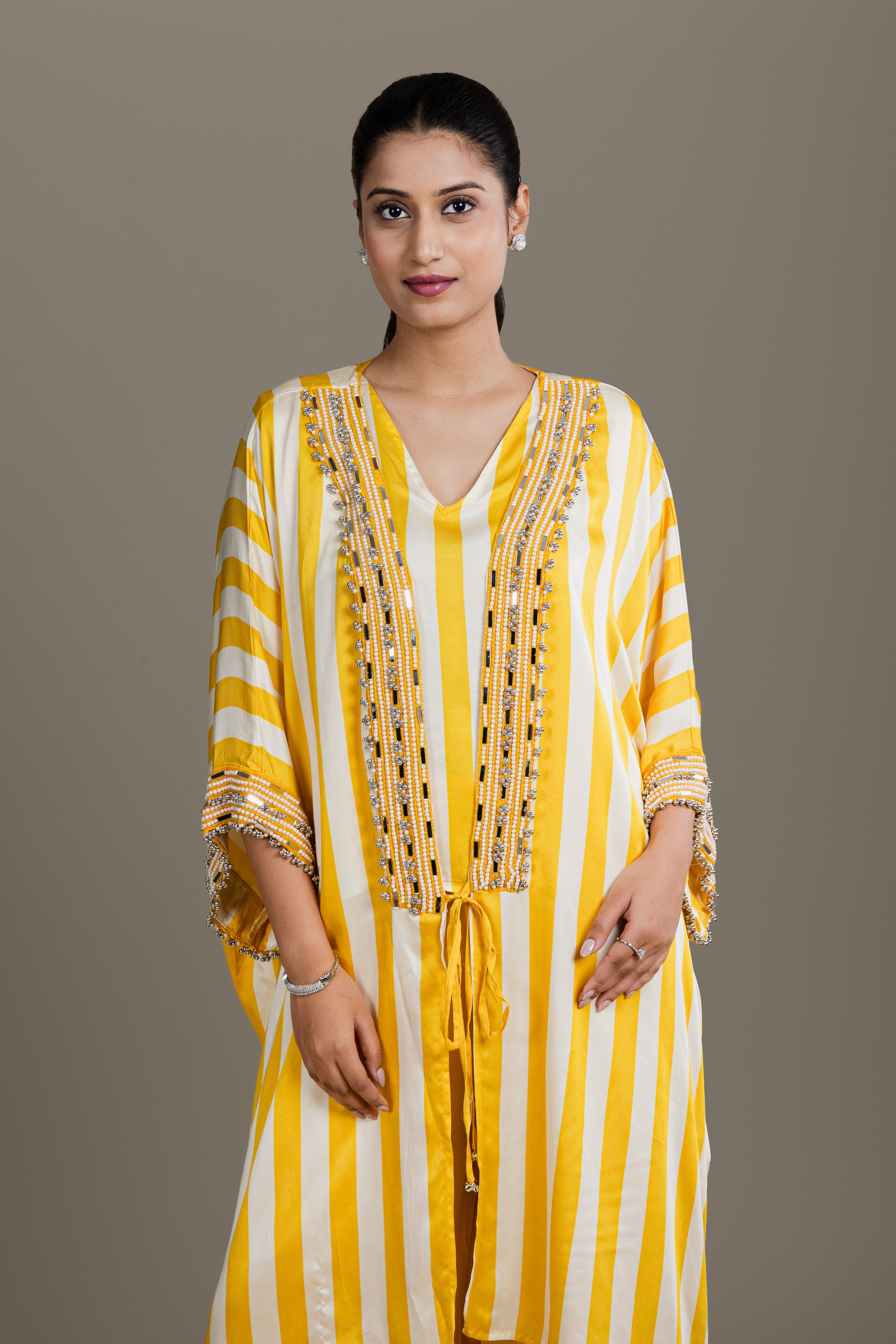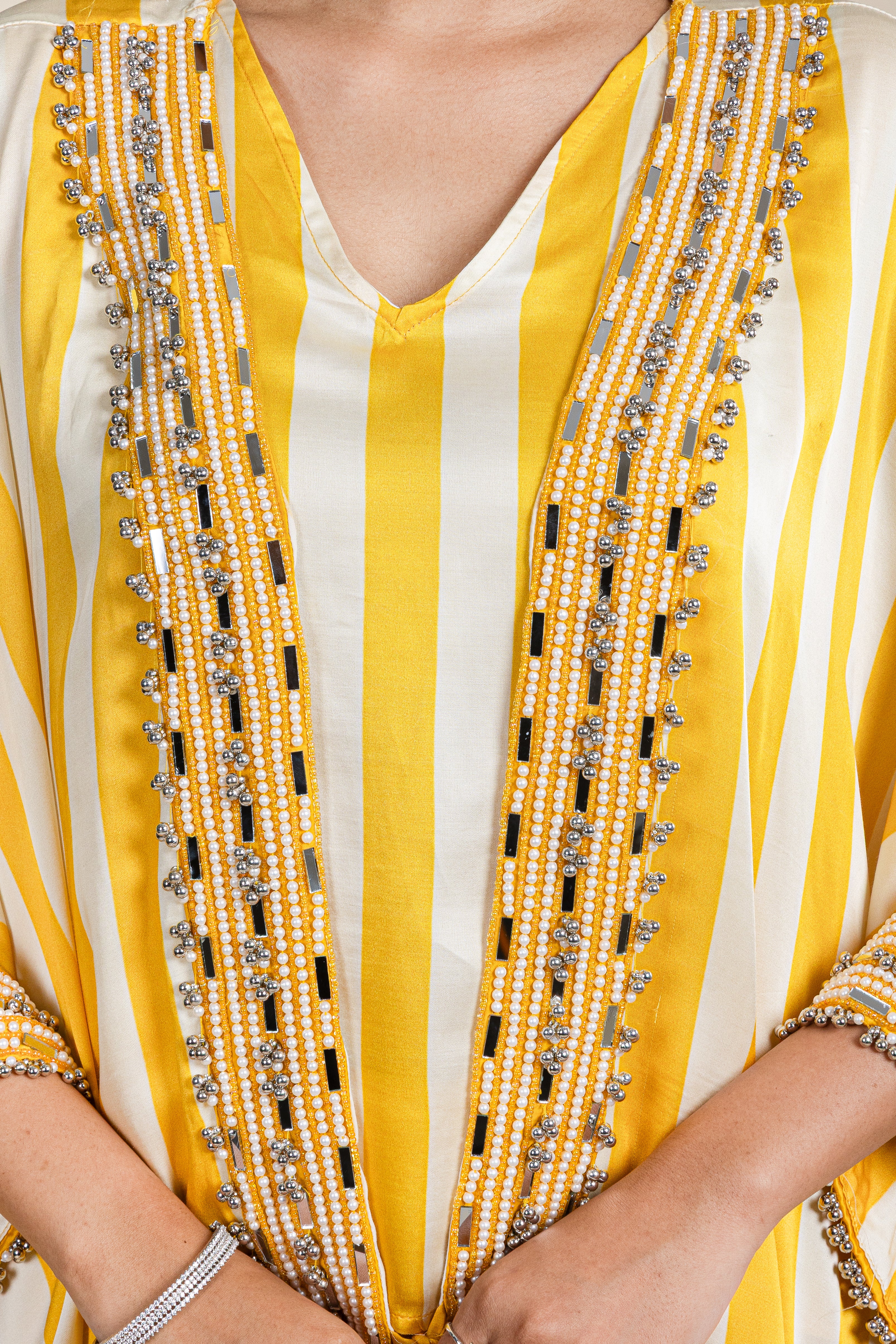 Elevate your ethnic elegance with this lemon zest and pearl white striped kaftan set, adorned with intricate beadwork, perfect for luxurious summer brunches and festive soir.