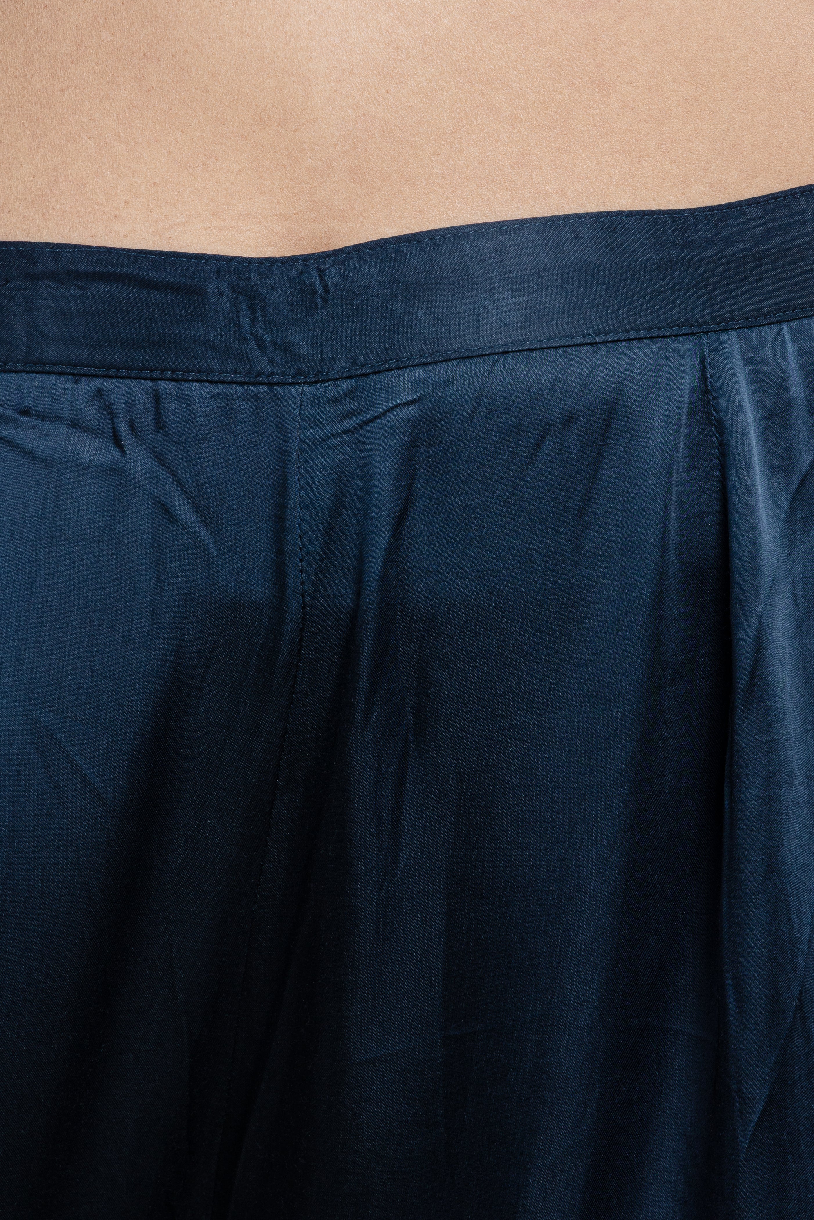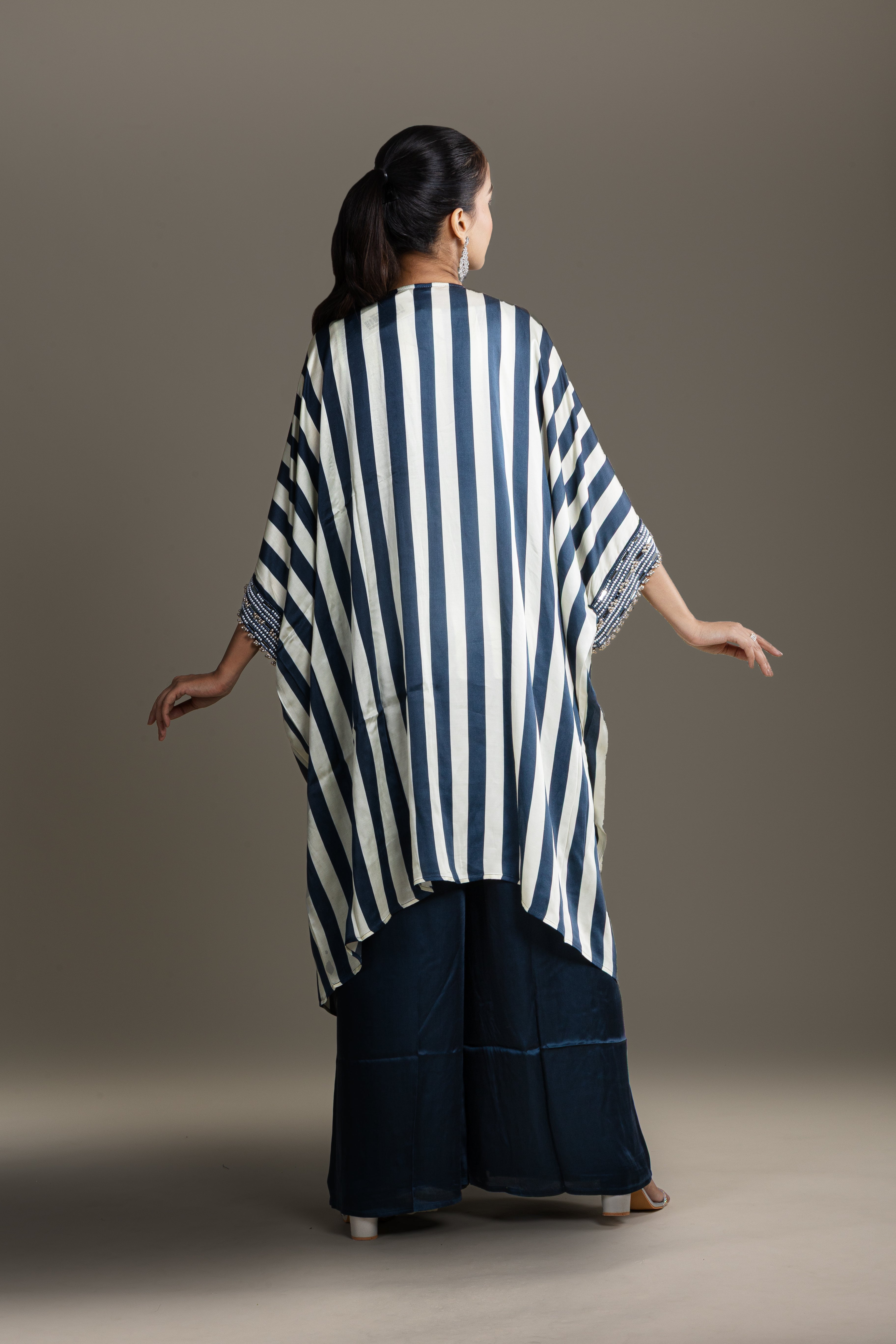 Add a modern twist to ethnic wear with this Indigo Mist striped kaftan set, elegantly detailed with bead embellishments for a chic yet traditional look.