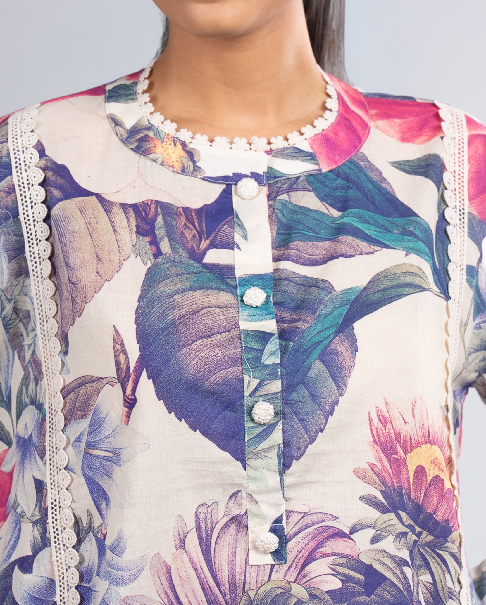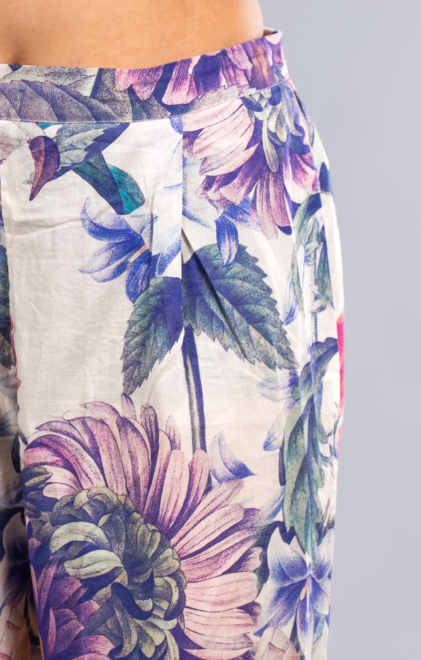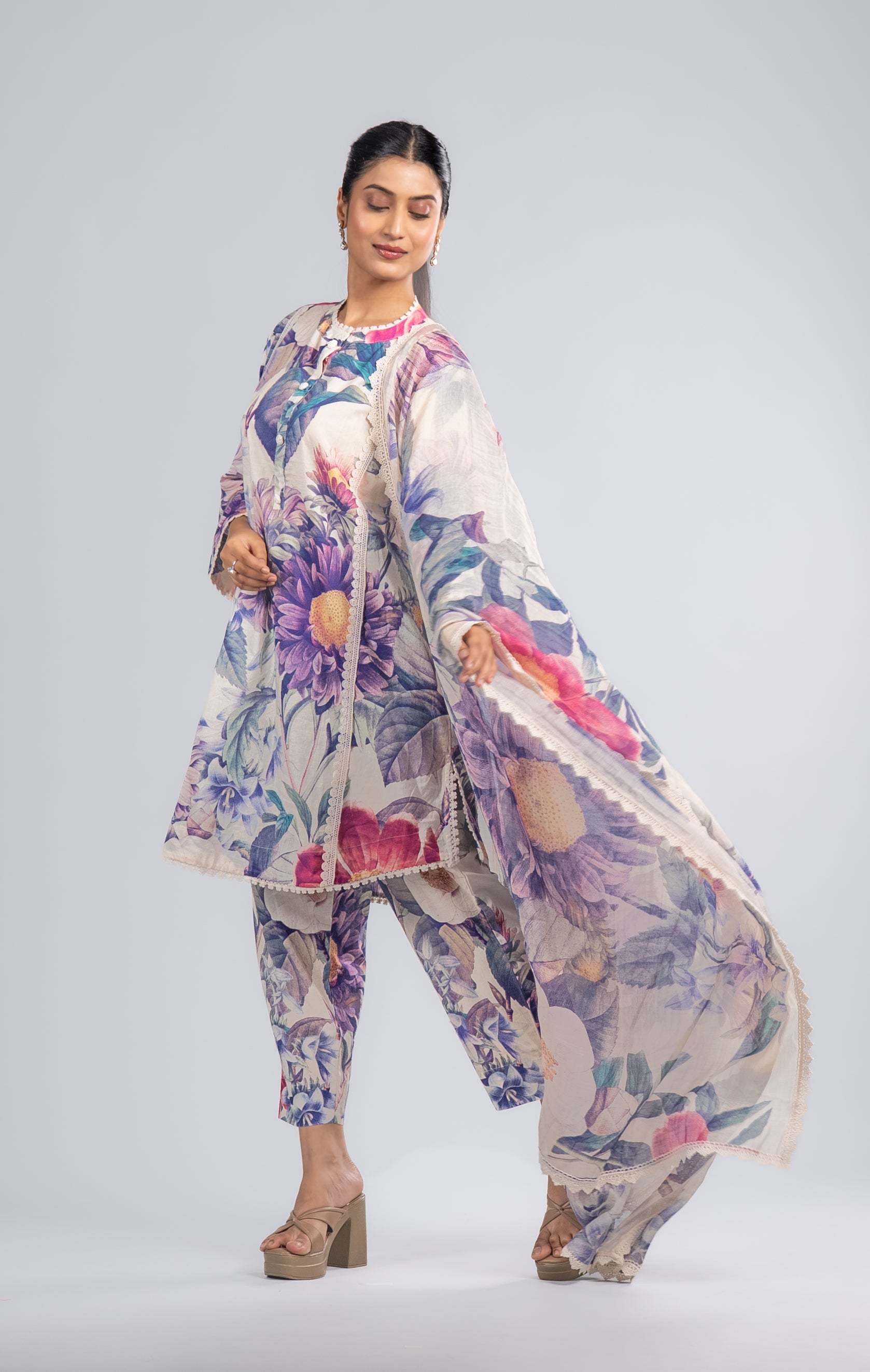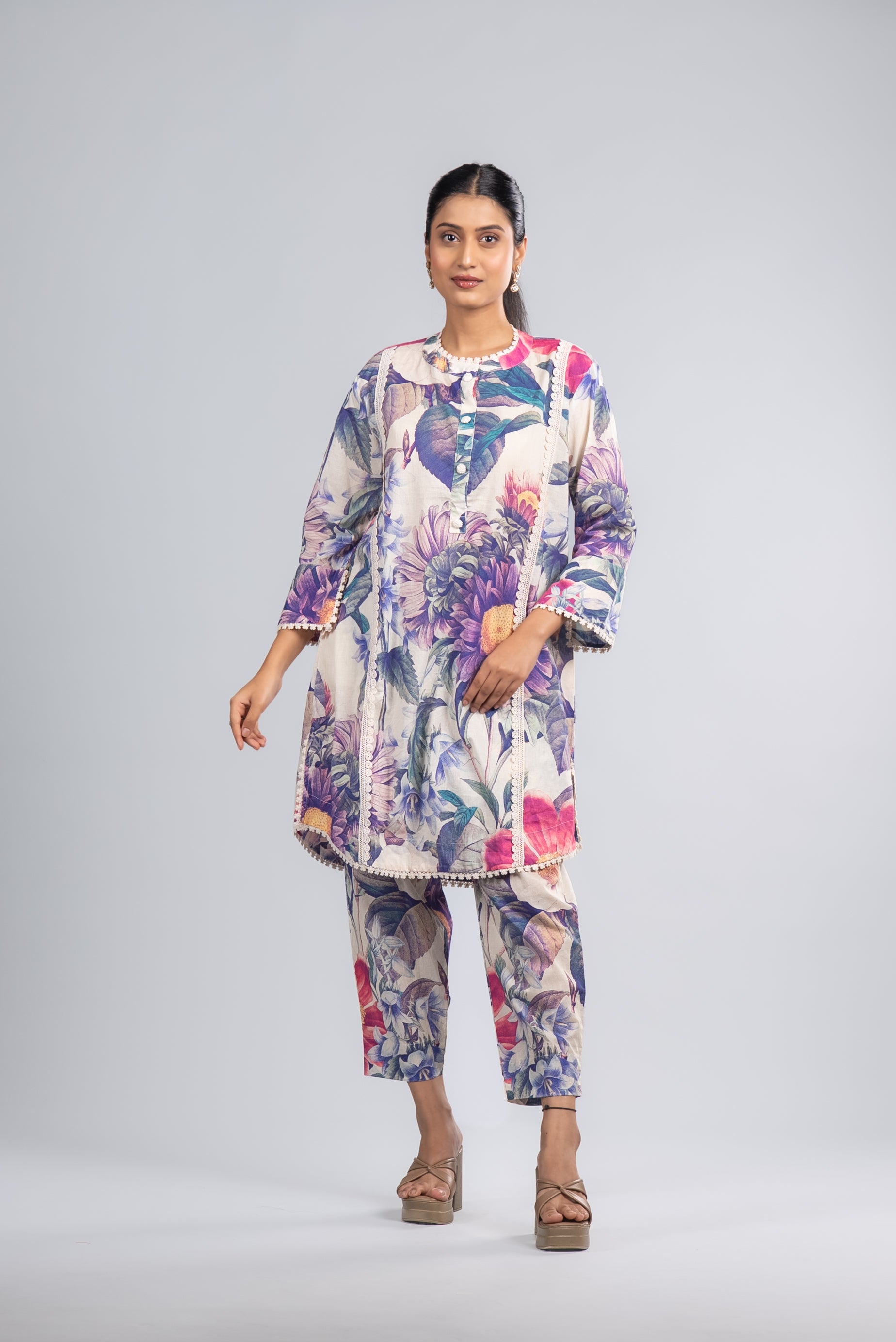 This ivory kurta set with striking purple and pink floral prints exudes elegance. Its soft fabric and modern tailoring make it an ideal pick for chic day-to-evening looks.