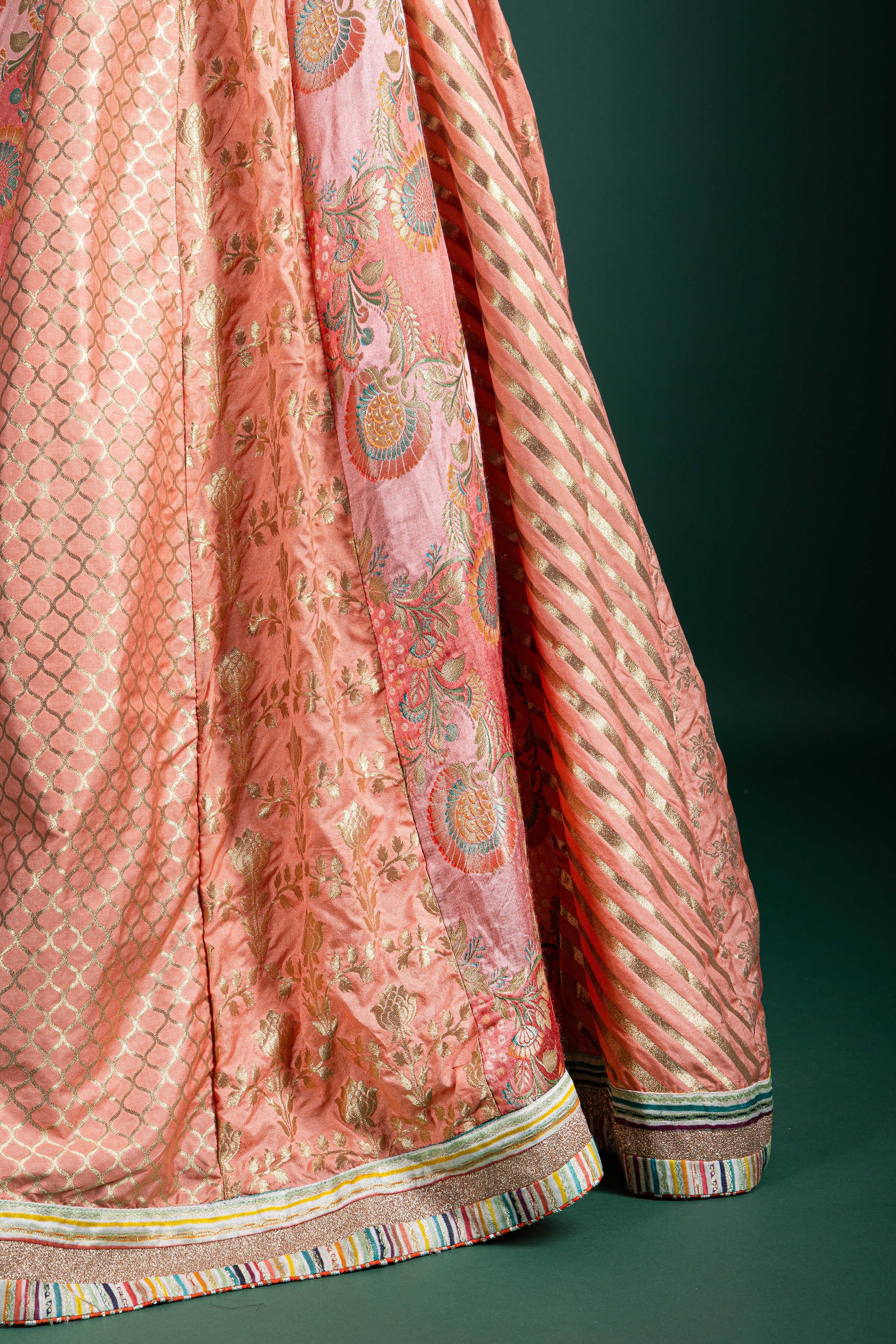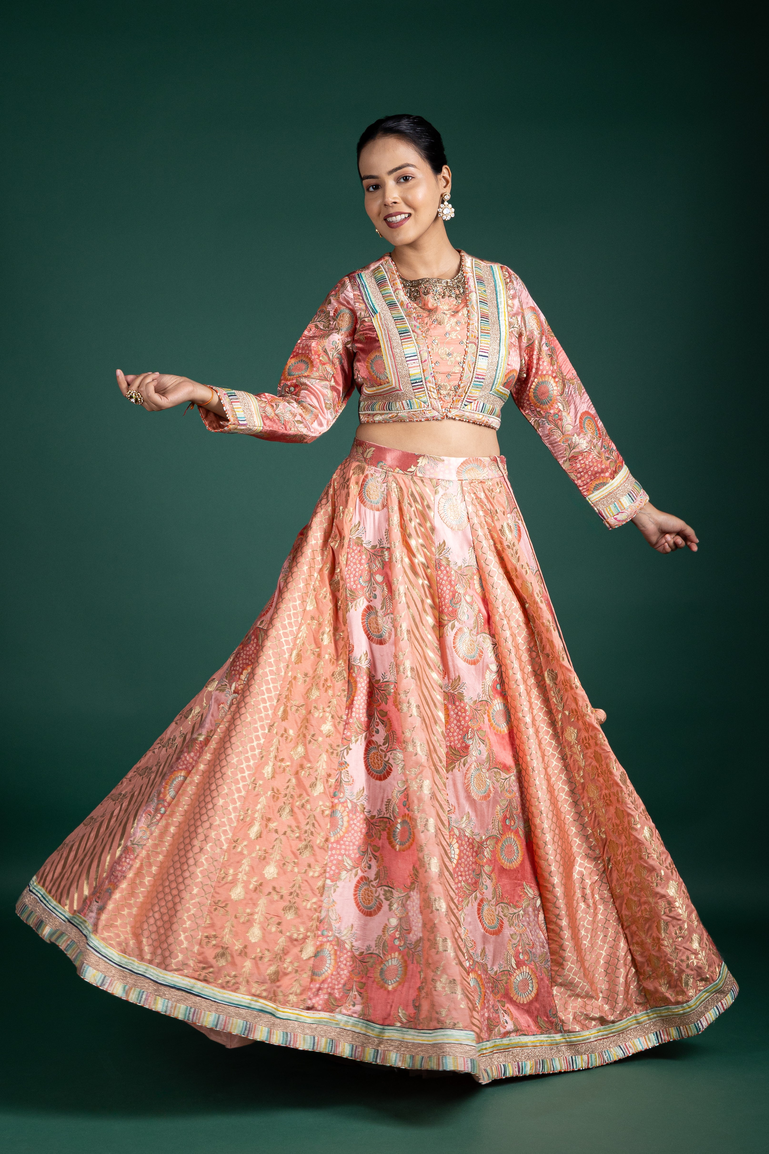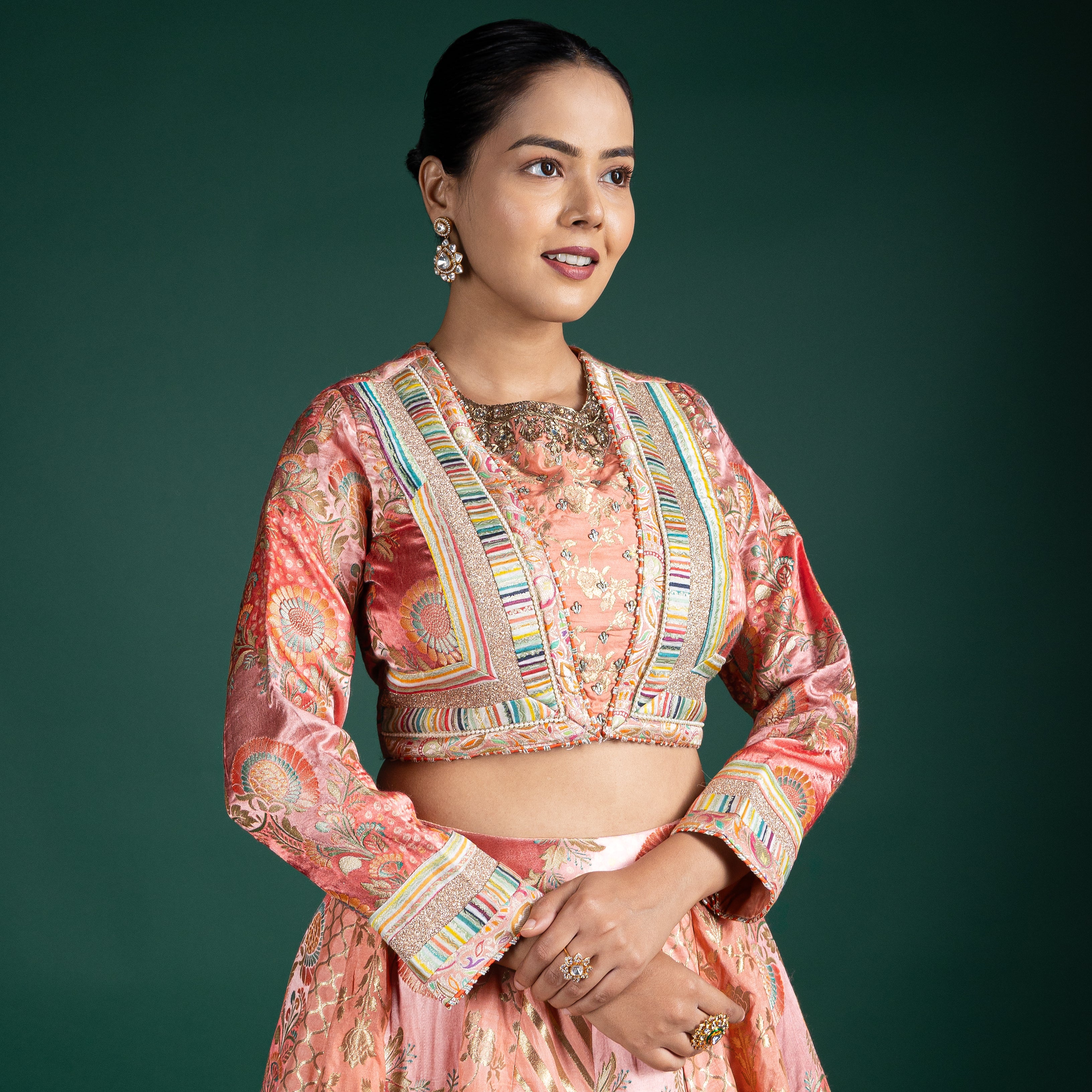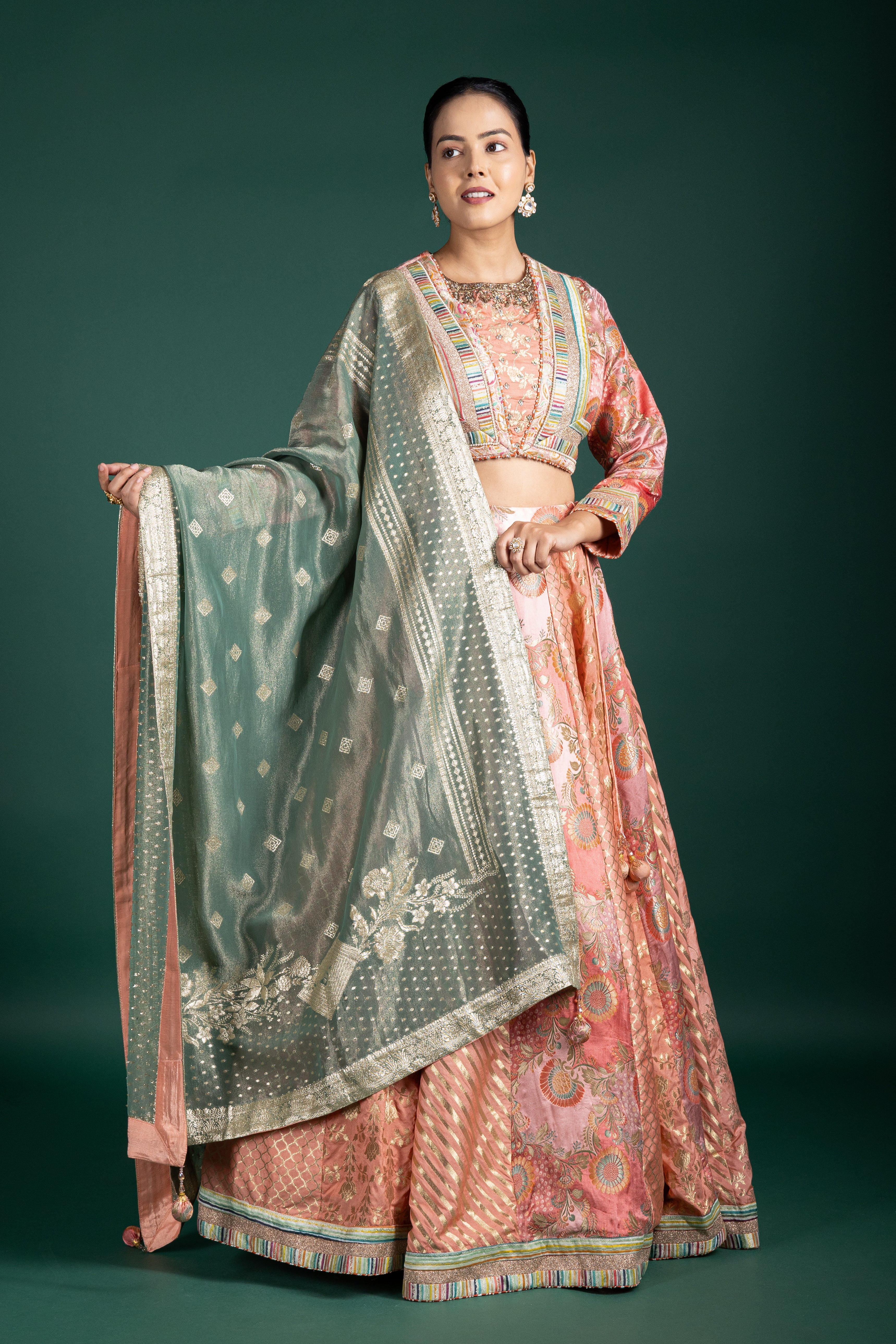 This stunning lehenga blends sunset peach tones with sage mist green, adorned with intricate Banarasi motifs and a contemporary jacket-style blouse for a timeless yet modern silhouette.