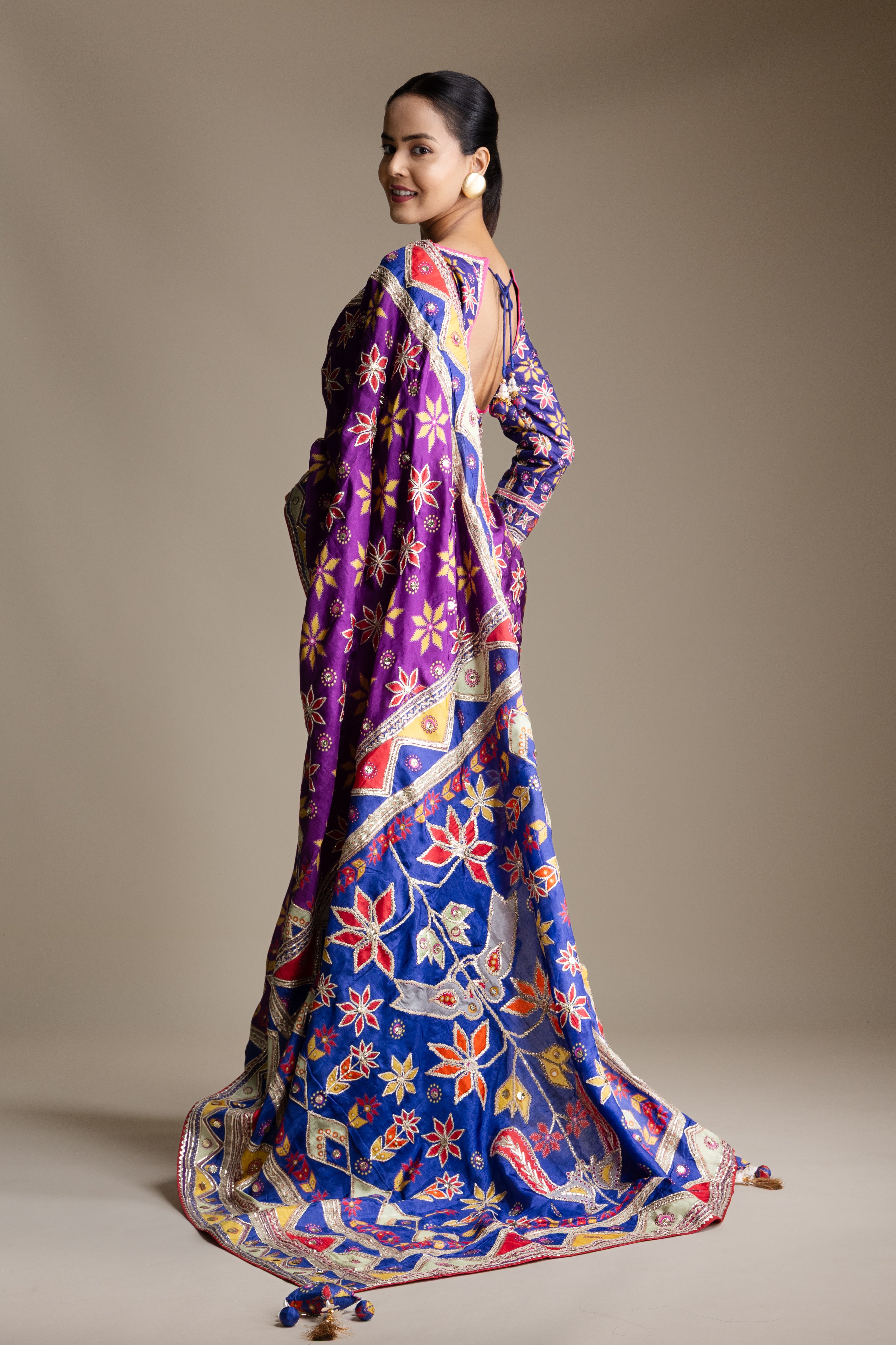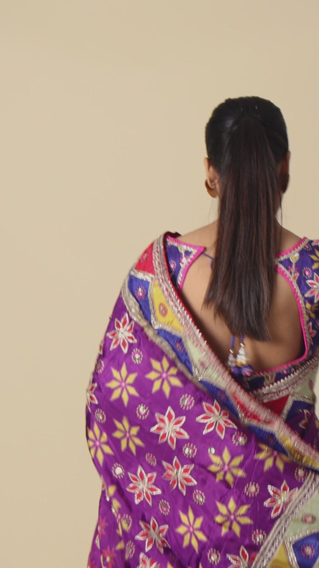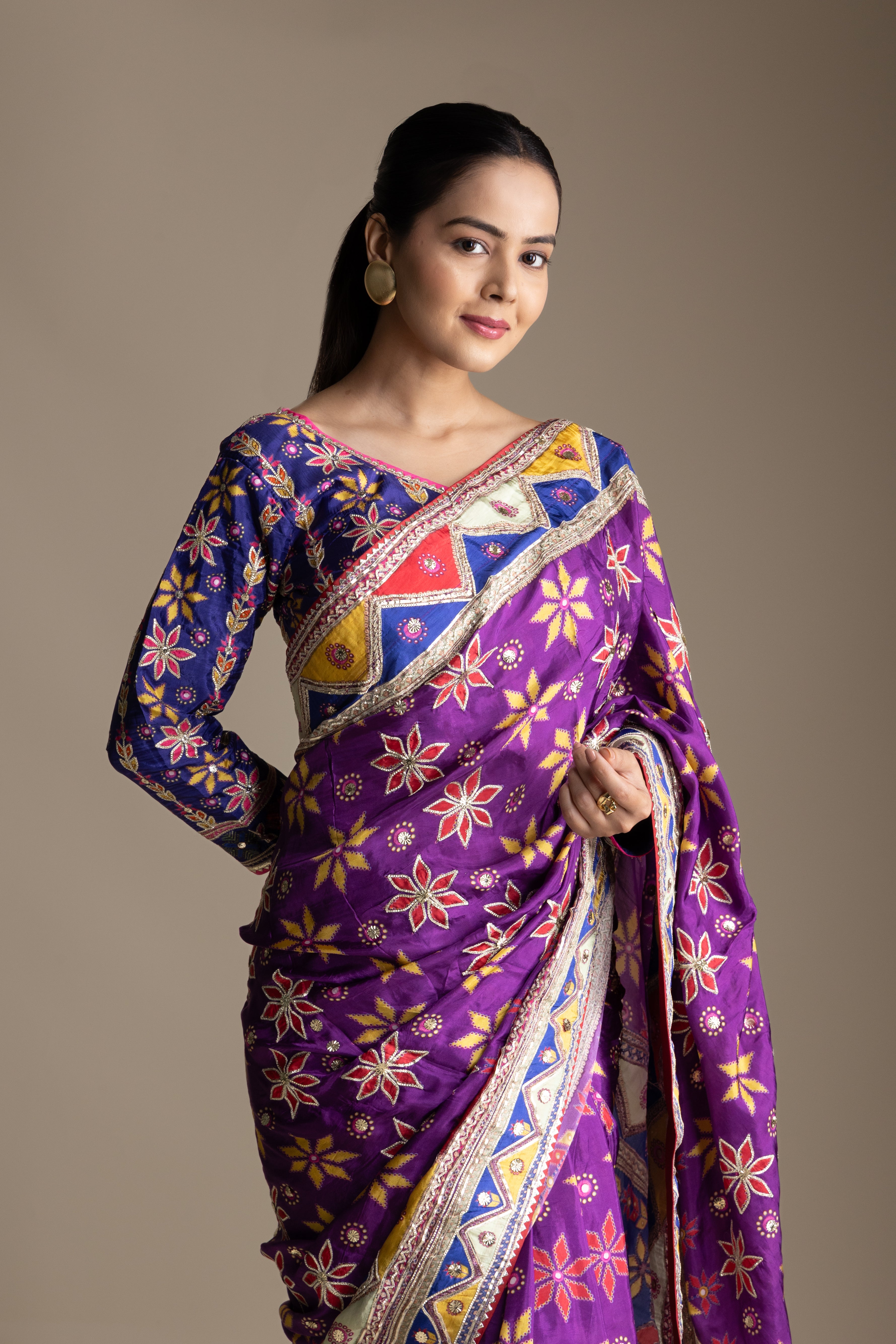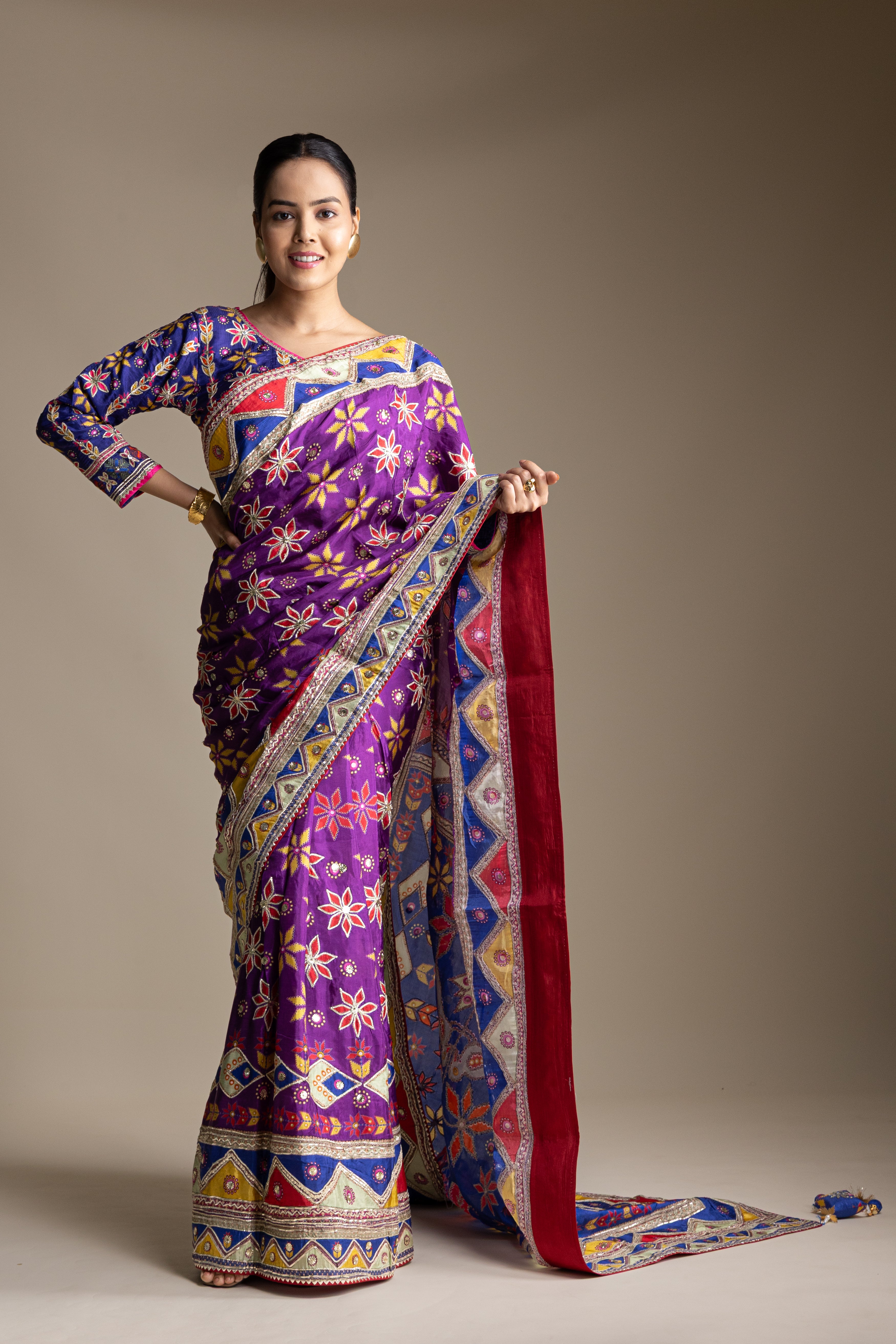 A vibrant plum silk saree adorned with intricate multicolor embroidery and mirrorwork, reflecting a perfect harmony of tradition and modern design.
