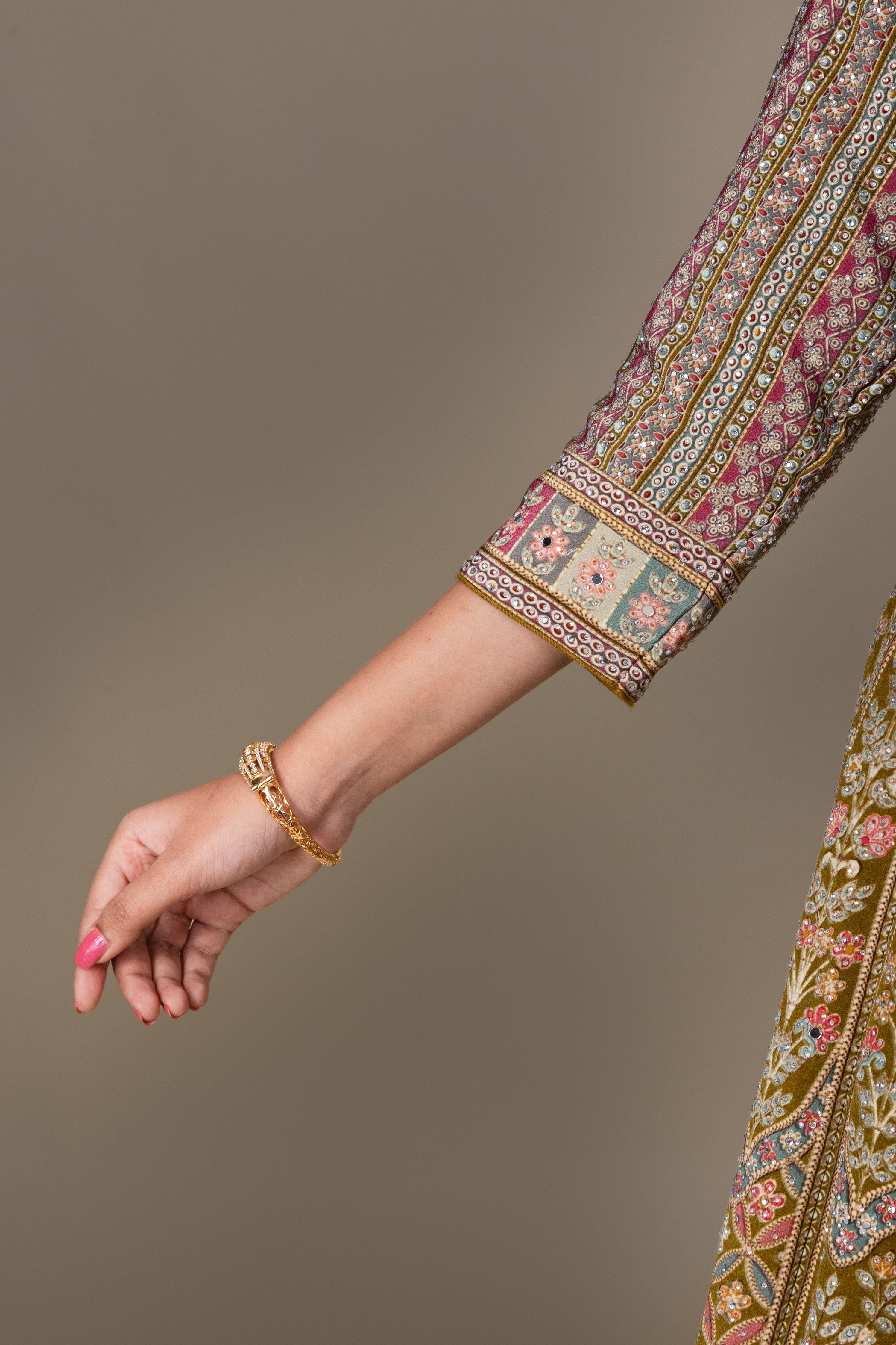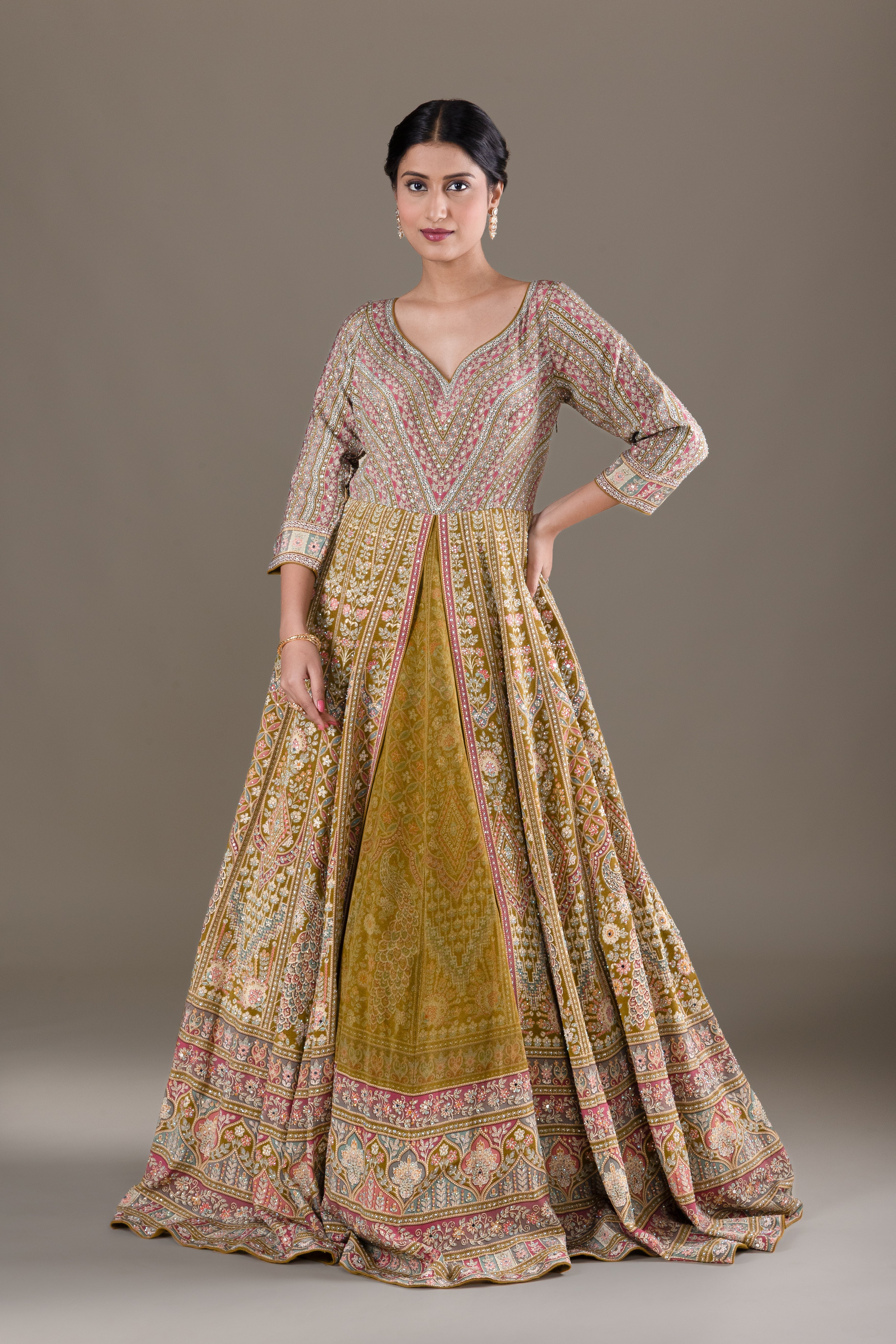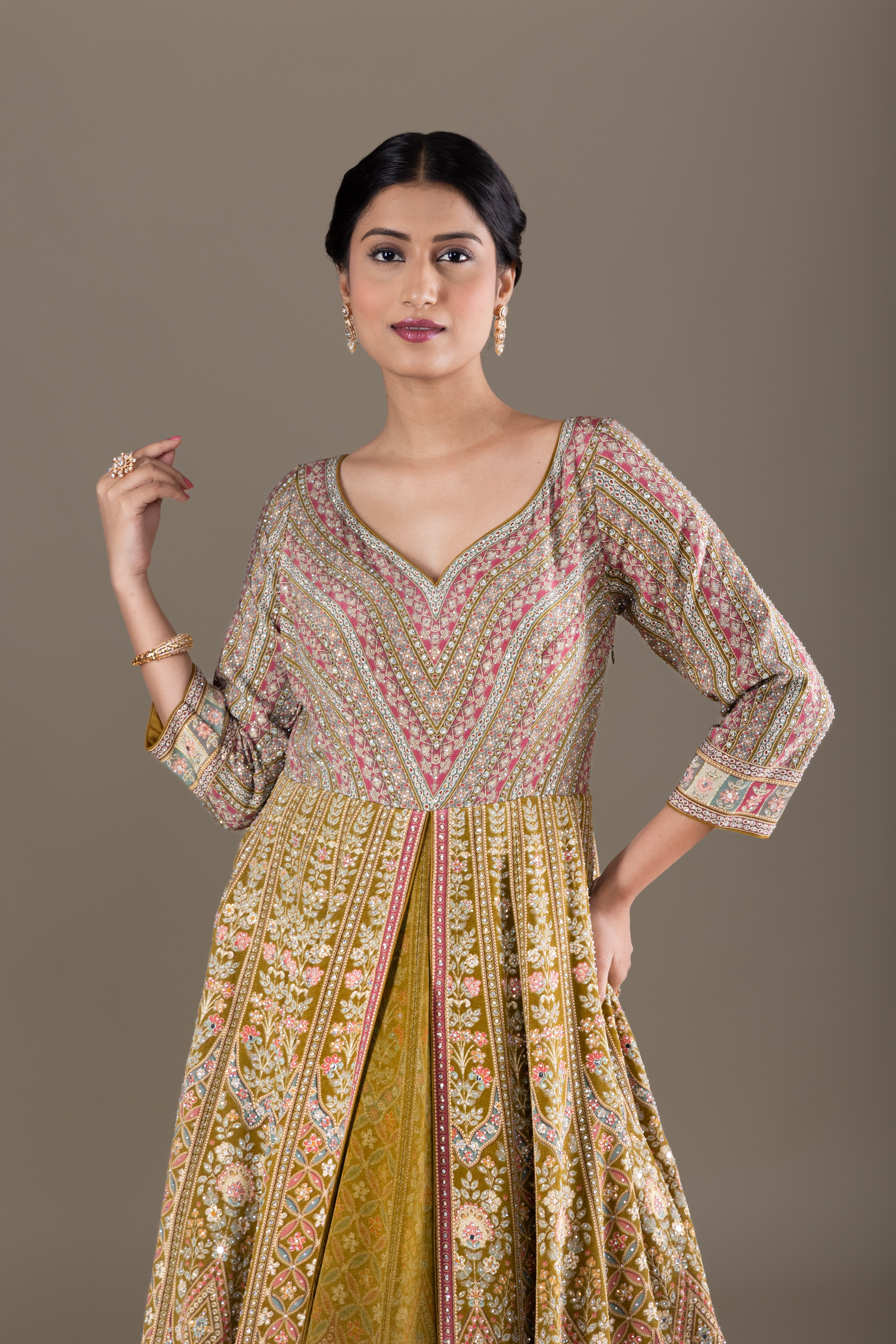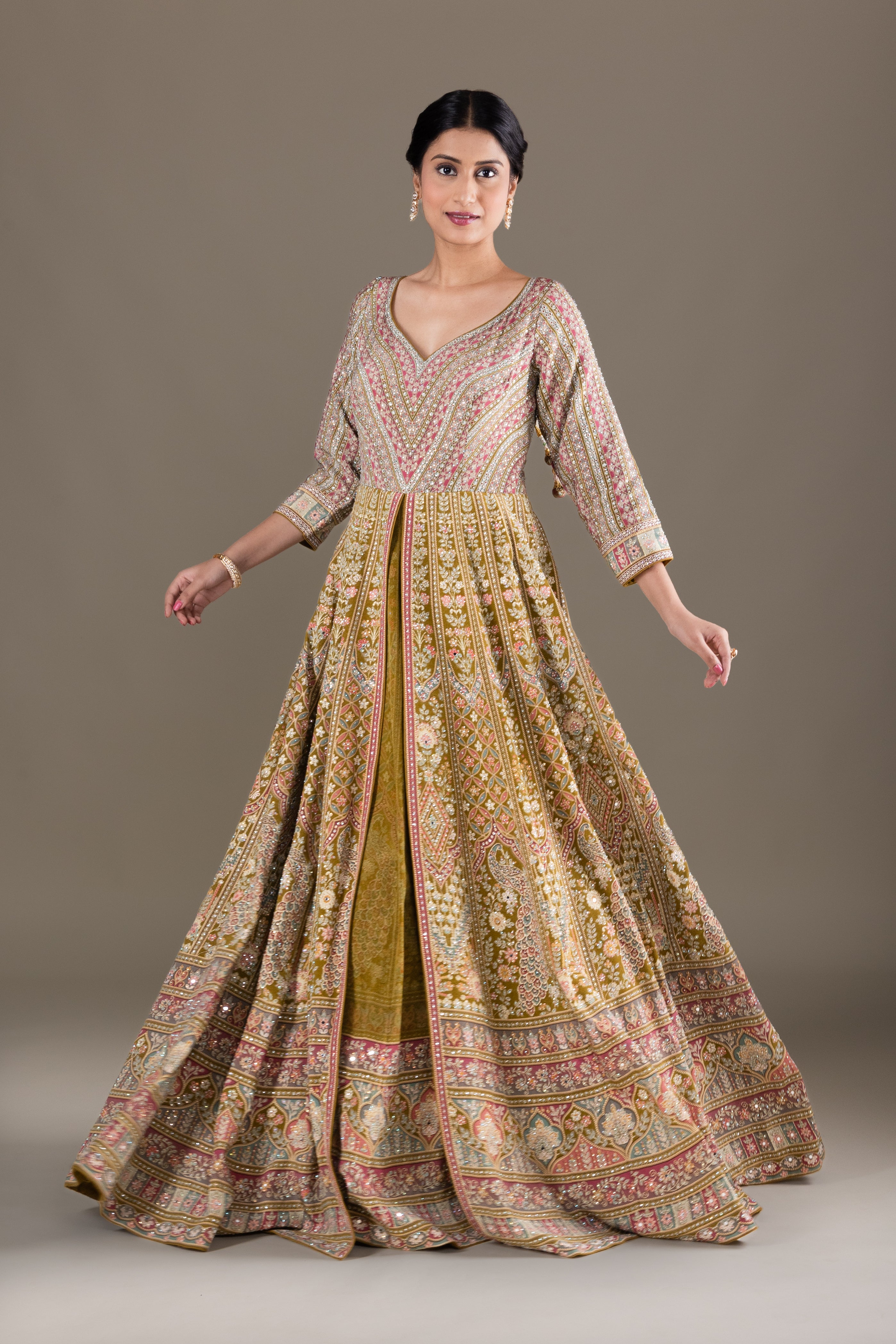 Exude heritage charm in this olive rose Jacket Lehenga , crafted with handwoven Banarasi motifs, multi-thread embroidery, and zari detailing for a look that’s both festive and timeless.