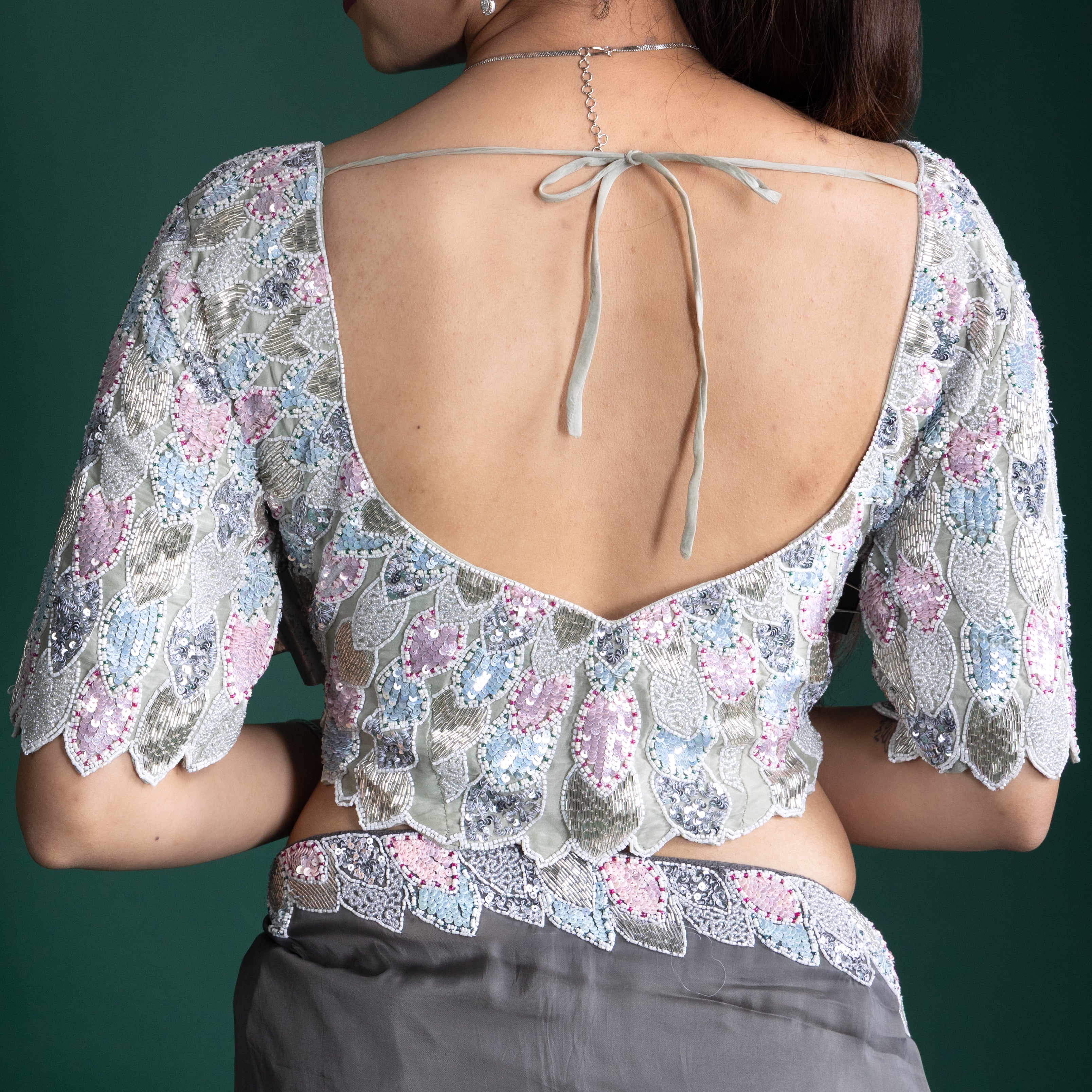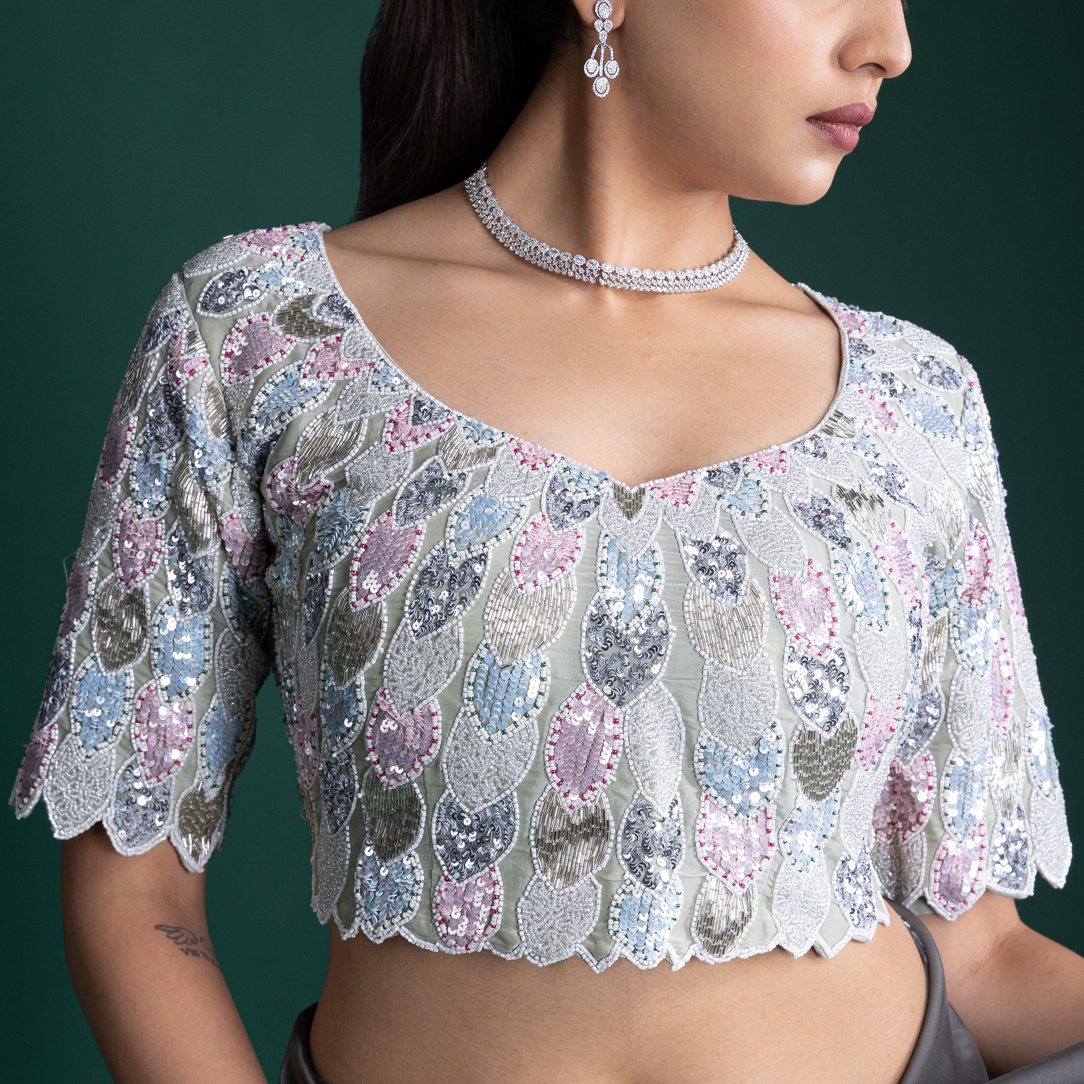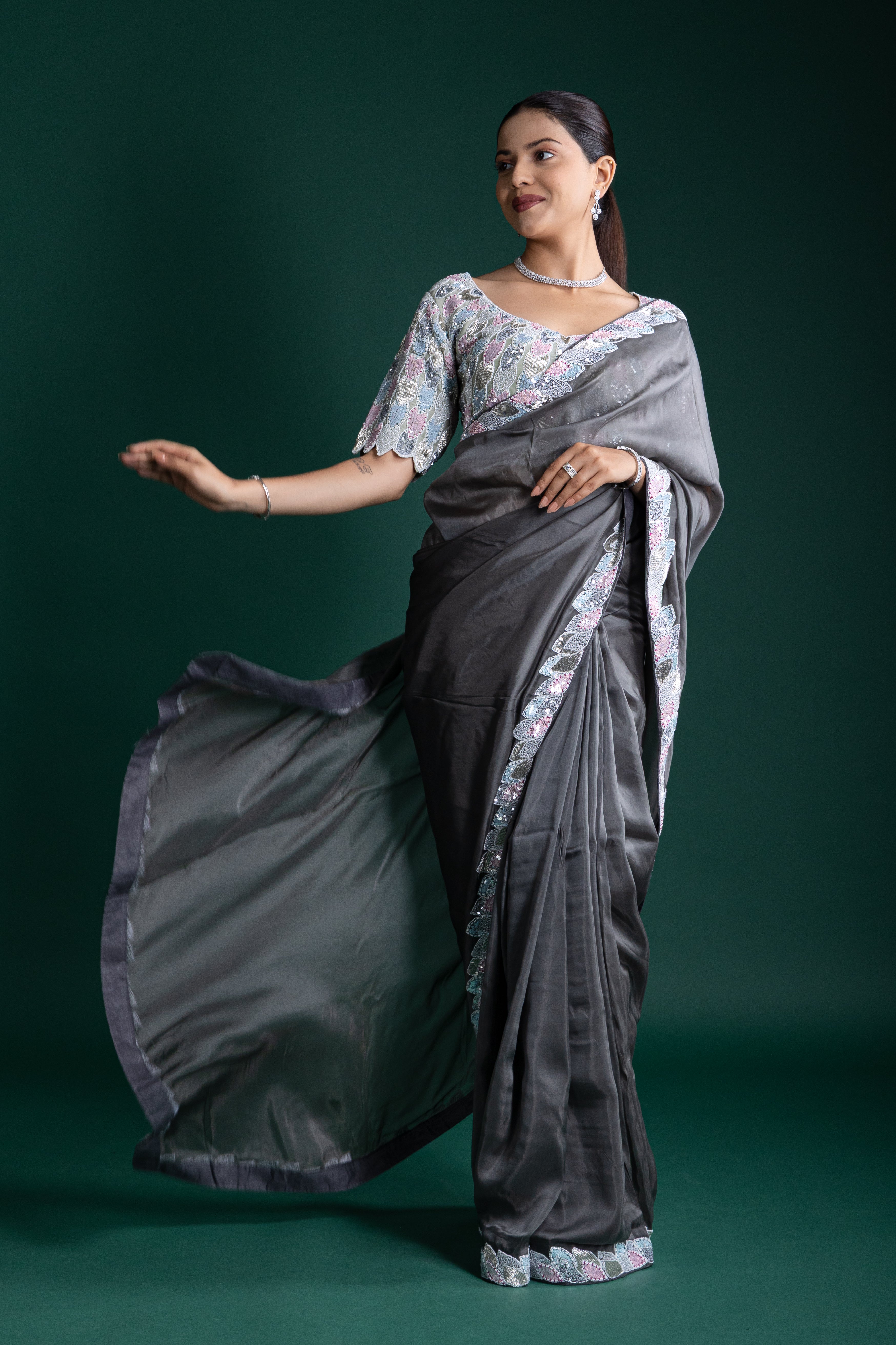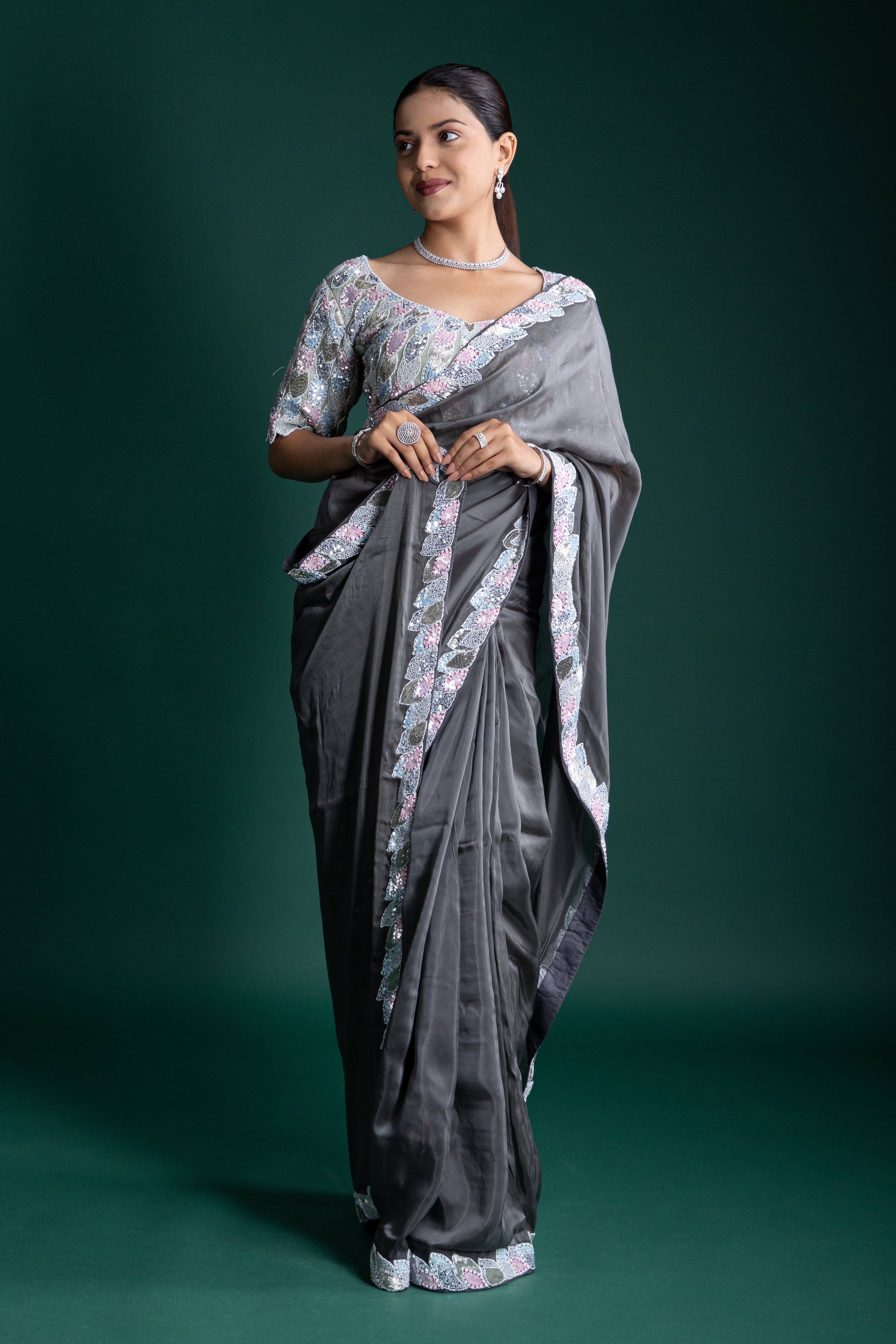 This charcoal grey satin saree boasts shimmering embellished borders, offering a stunning blend of modern glamour and classic tradition, ideal for evening events and grand celebrations.