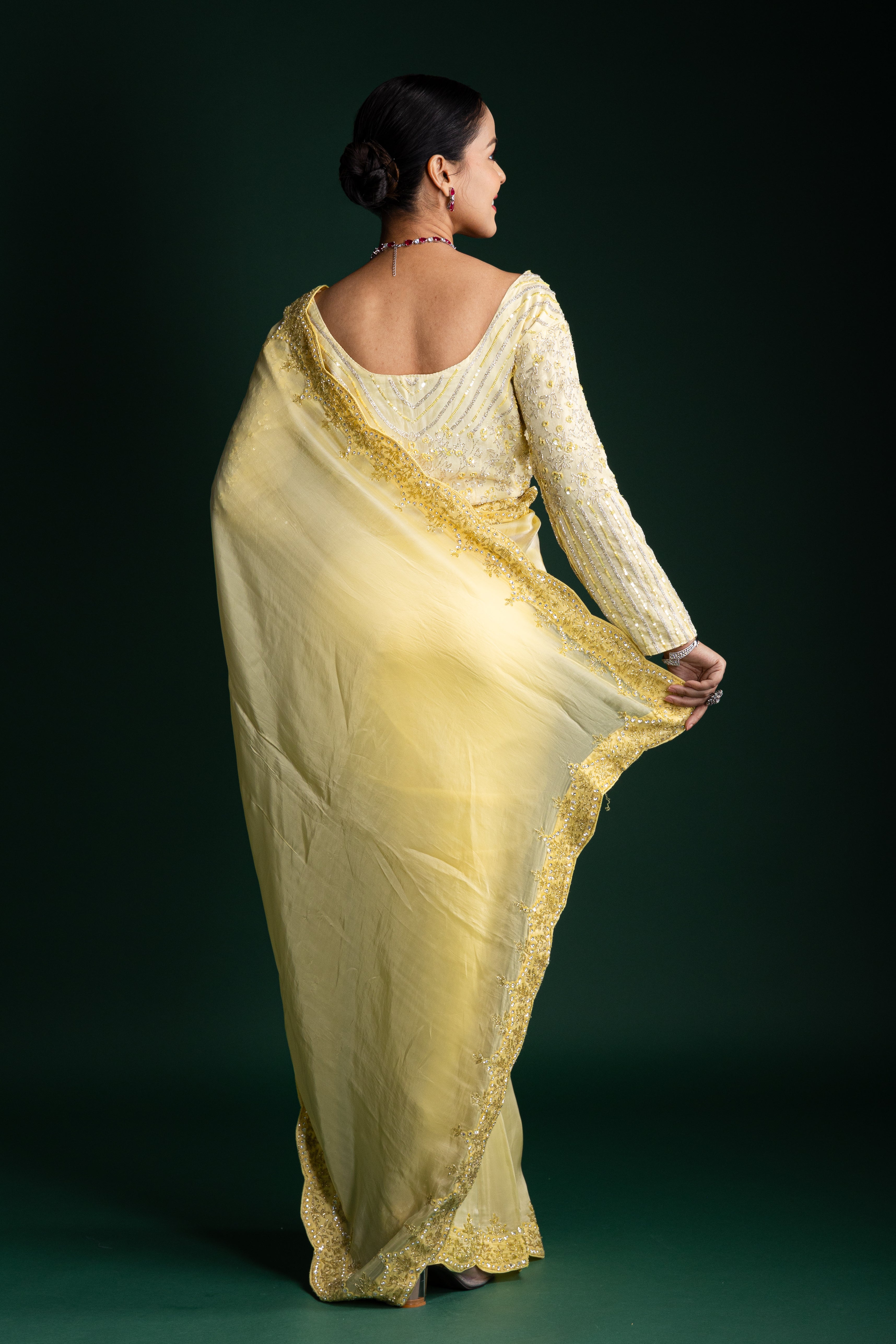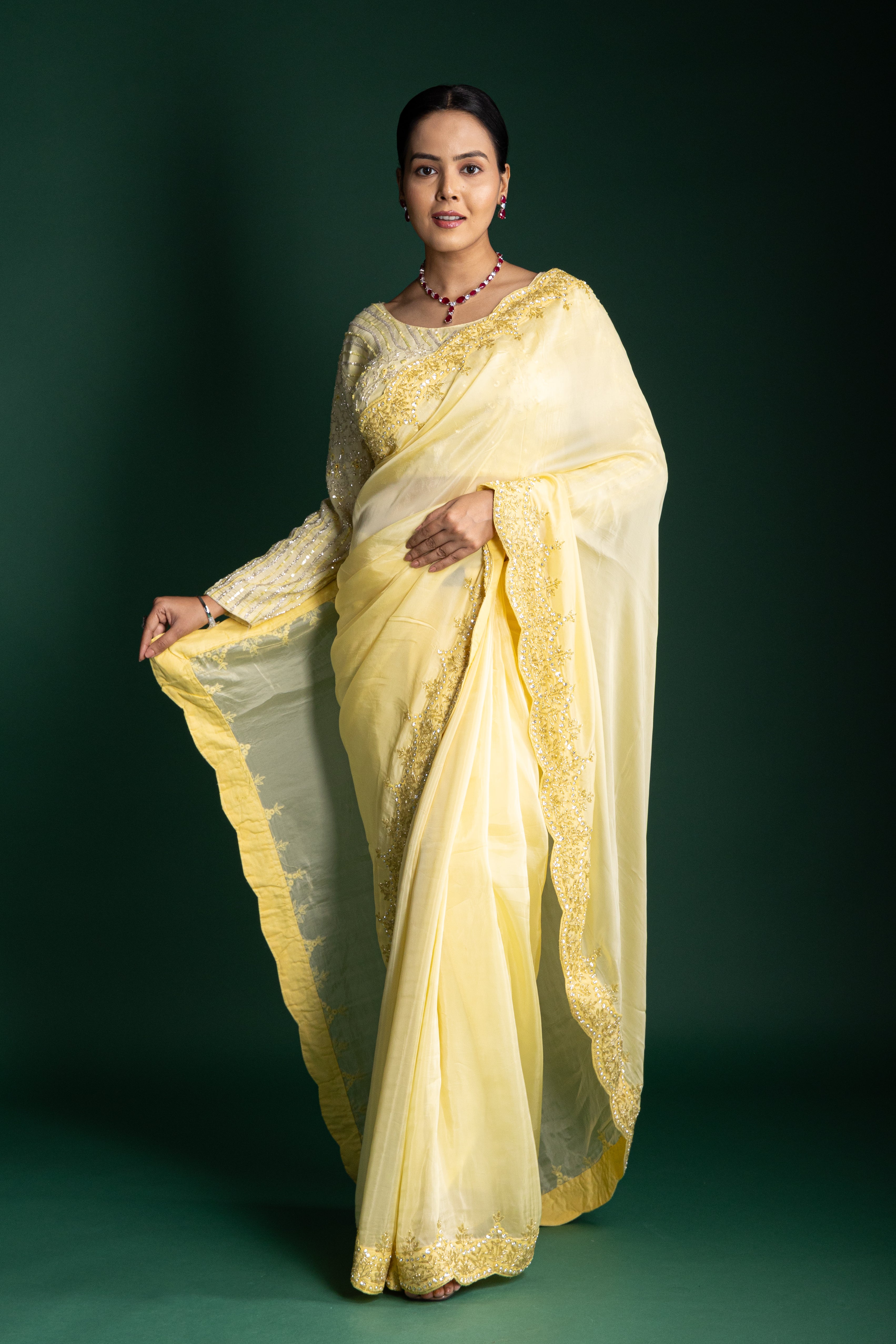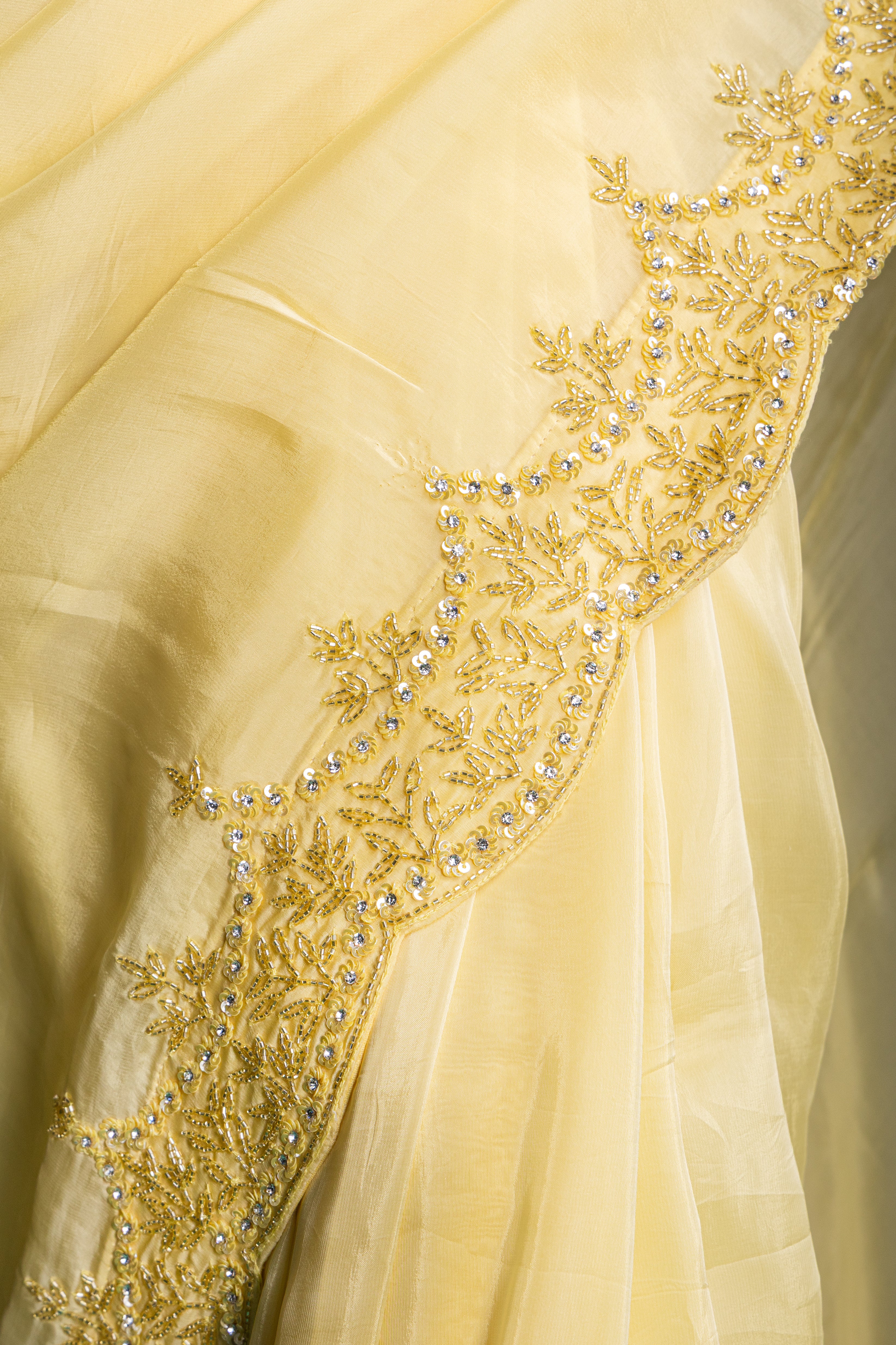 A refreshing lemon yellow saree highlighted with intricate golden embroidery, perfect for vibrant yet graceful styling during opulent celebrations.
