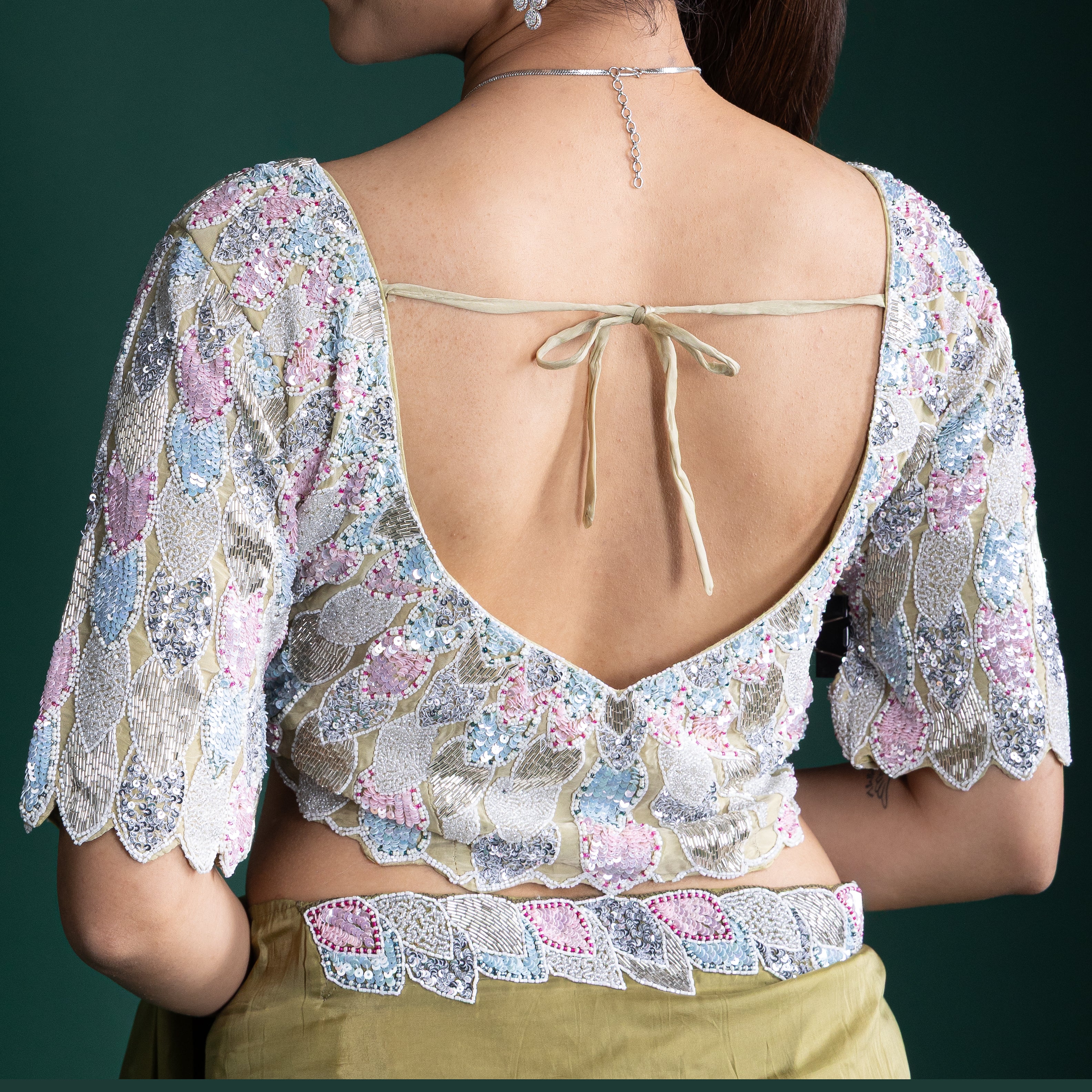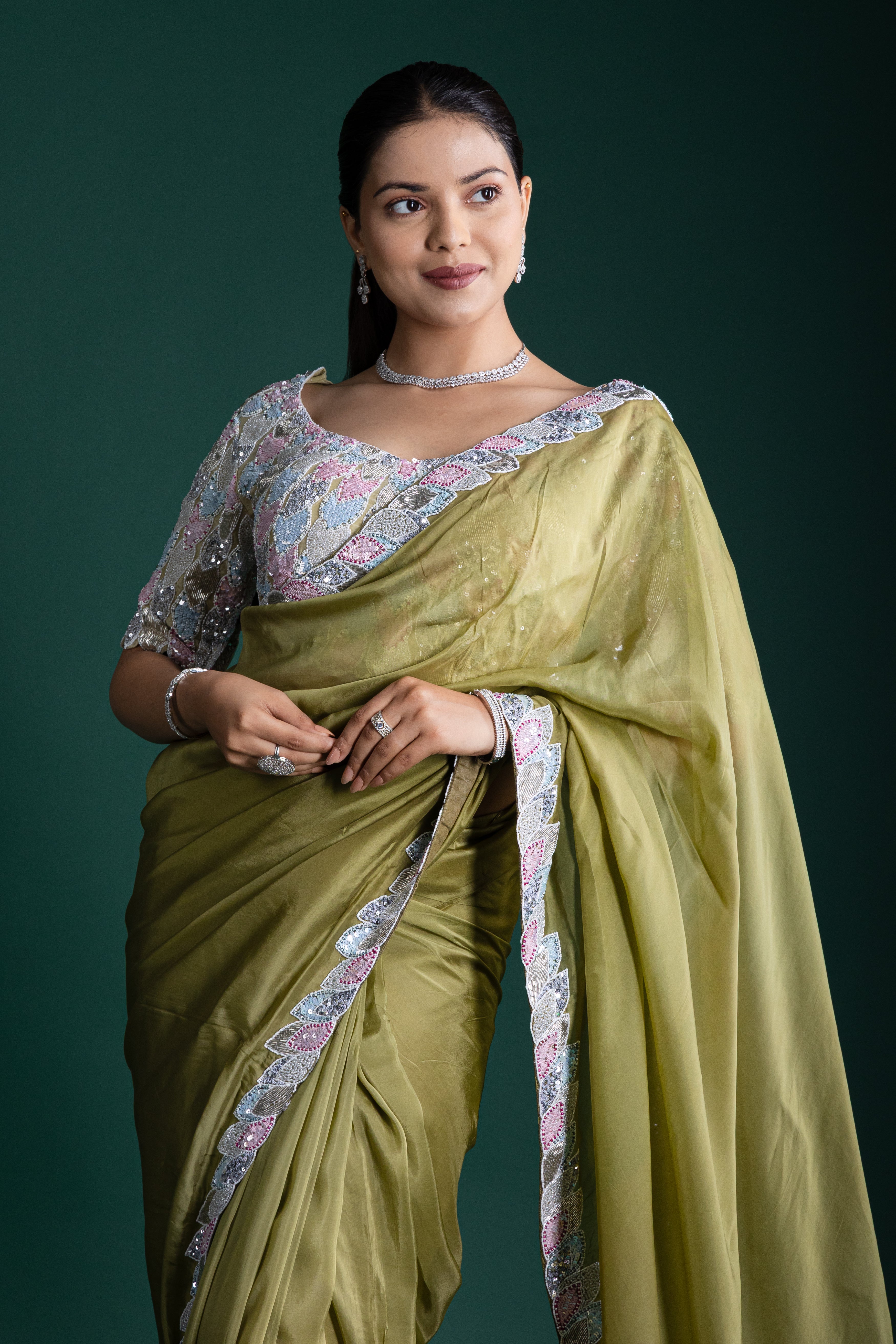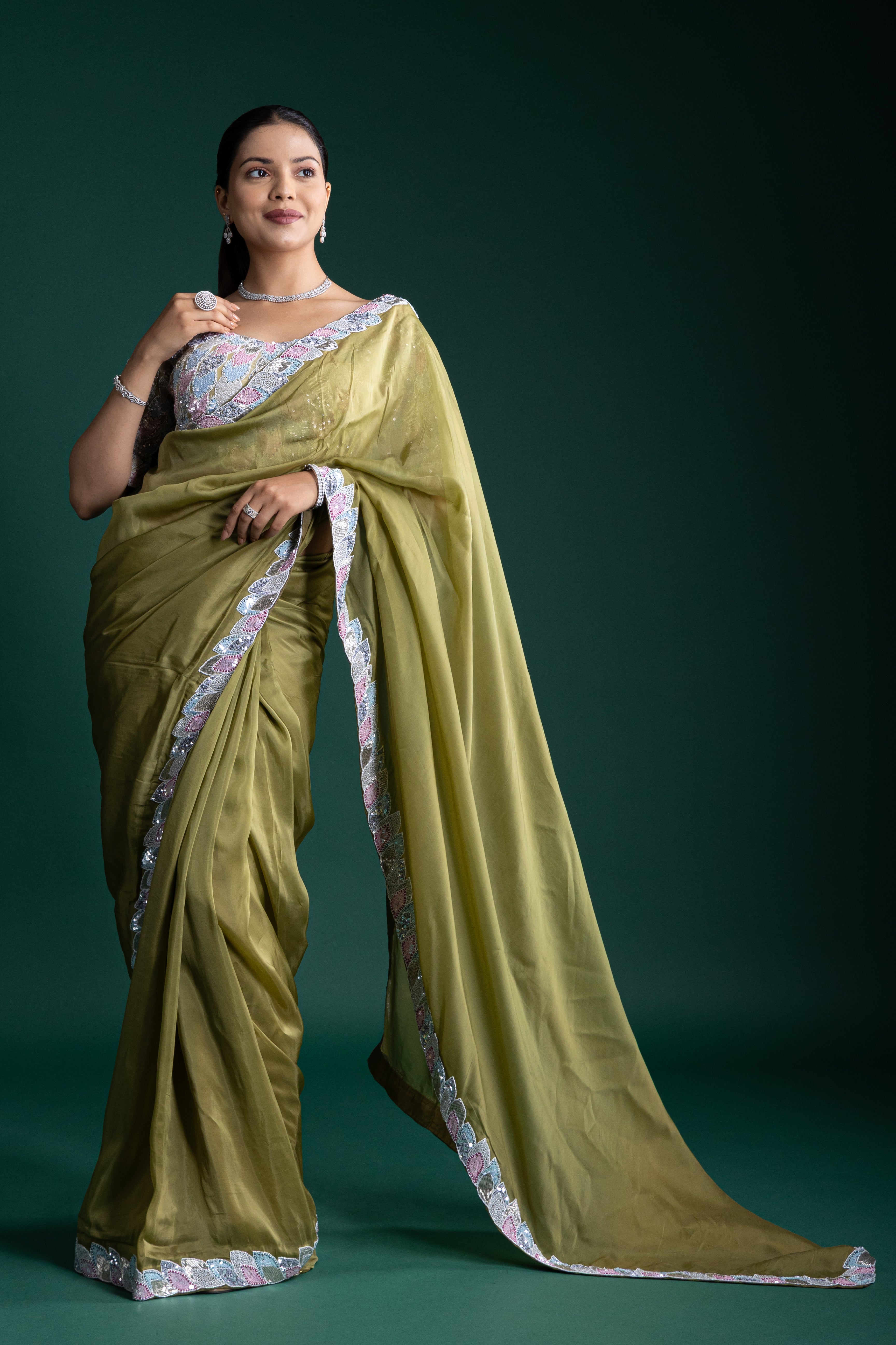 This elegant moss green silk saree features delicate sequin work on the border and pallu, creating a timeless appeal. Perfect for high-end celebrations, it radiates understated luxury for sophisticated women.