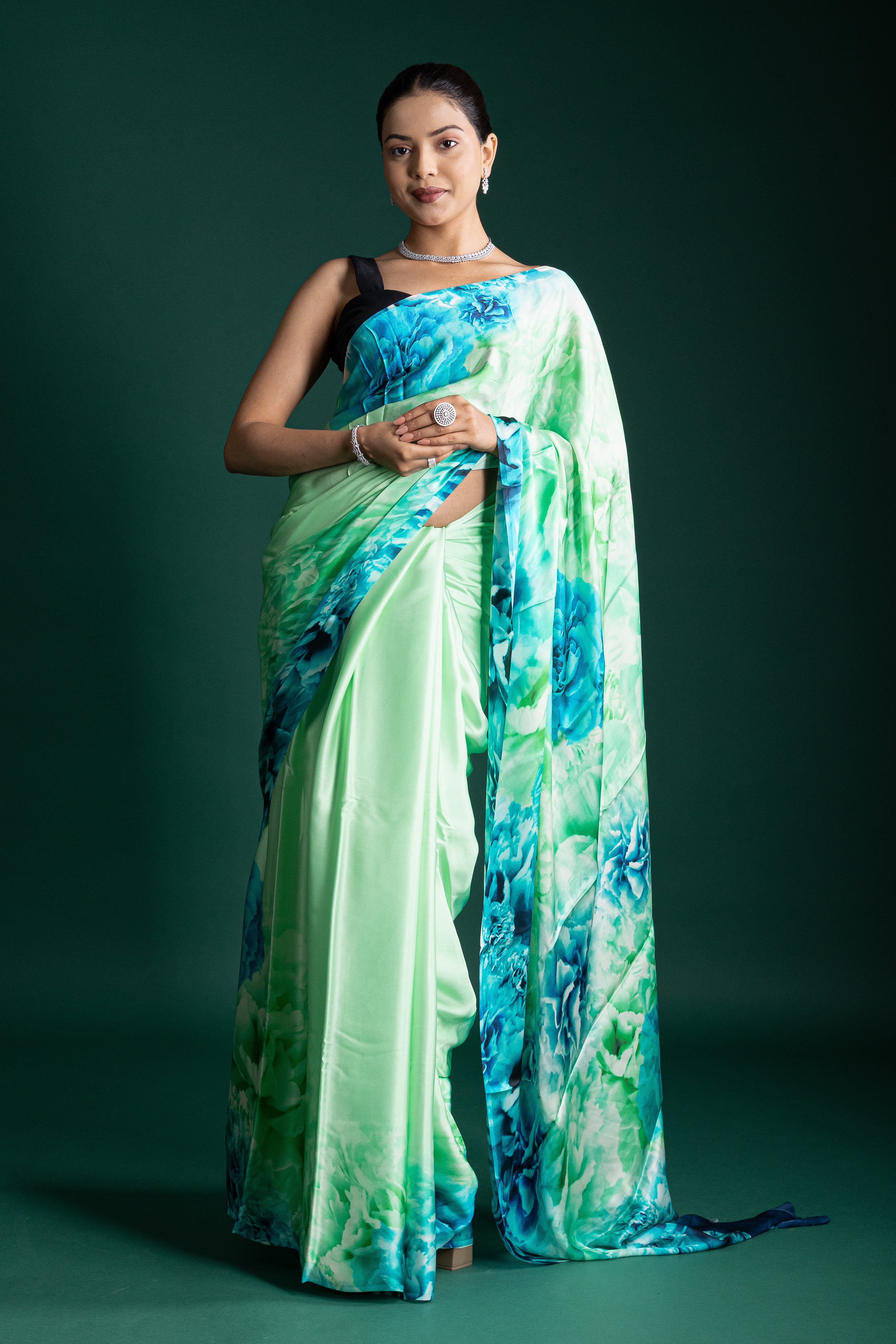 Ocean Mist Aqua Bloom Contemporary Floral Satin Saree