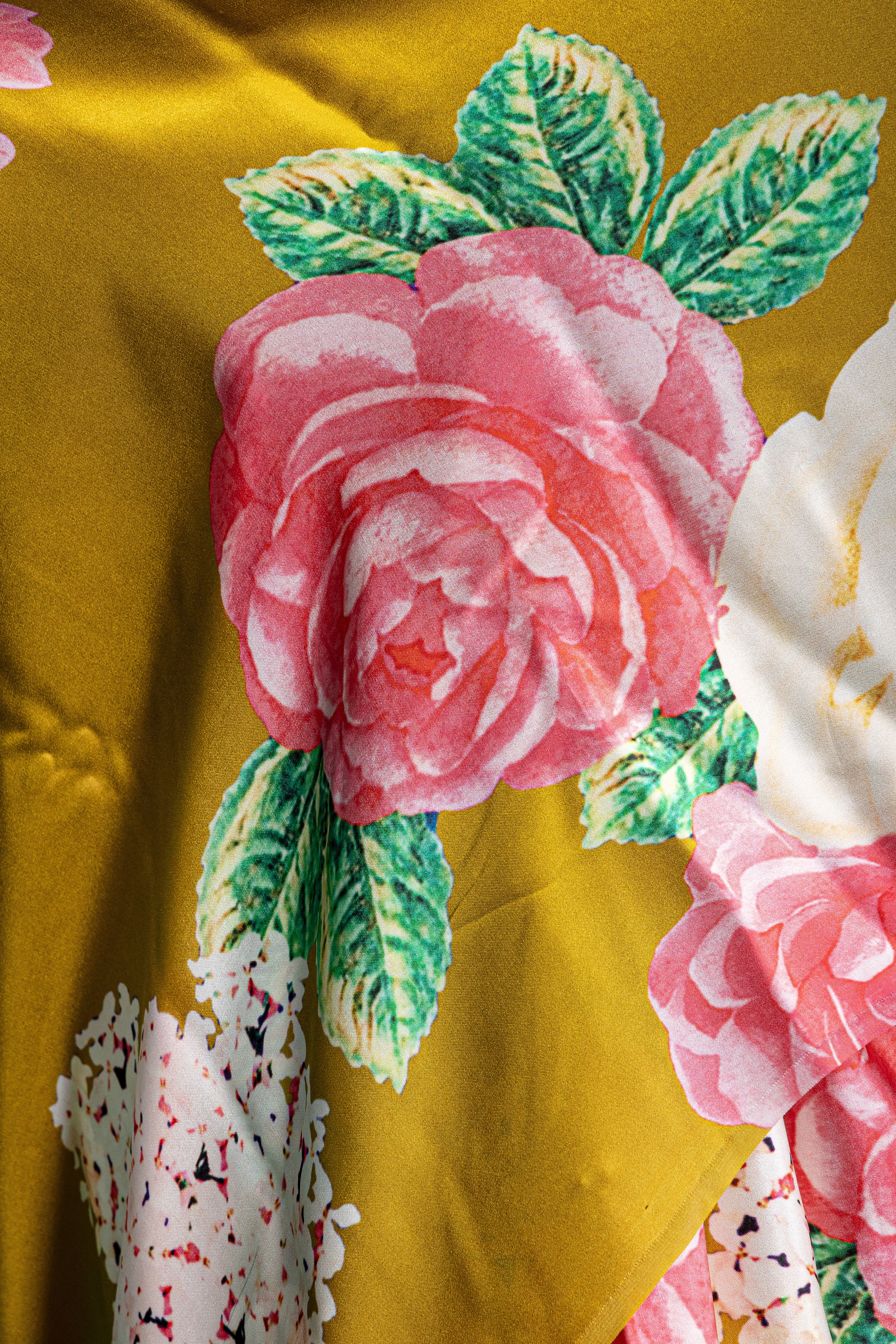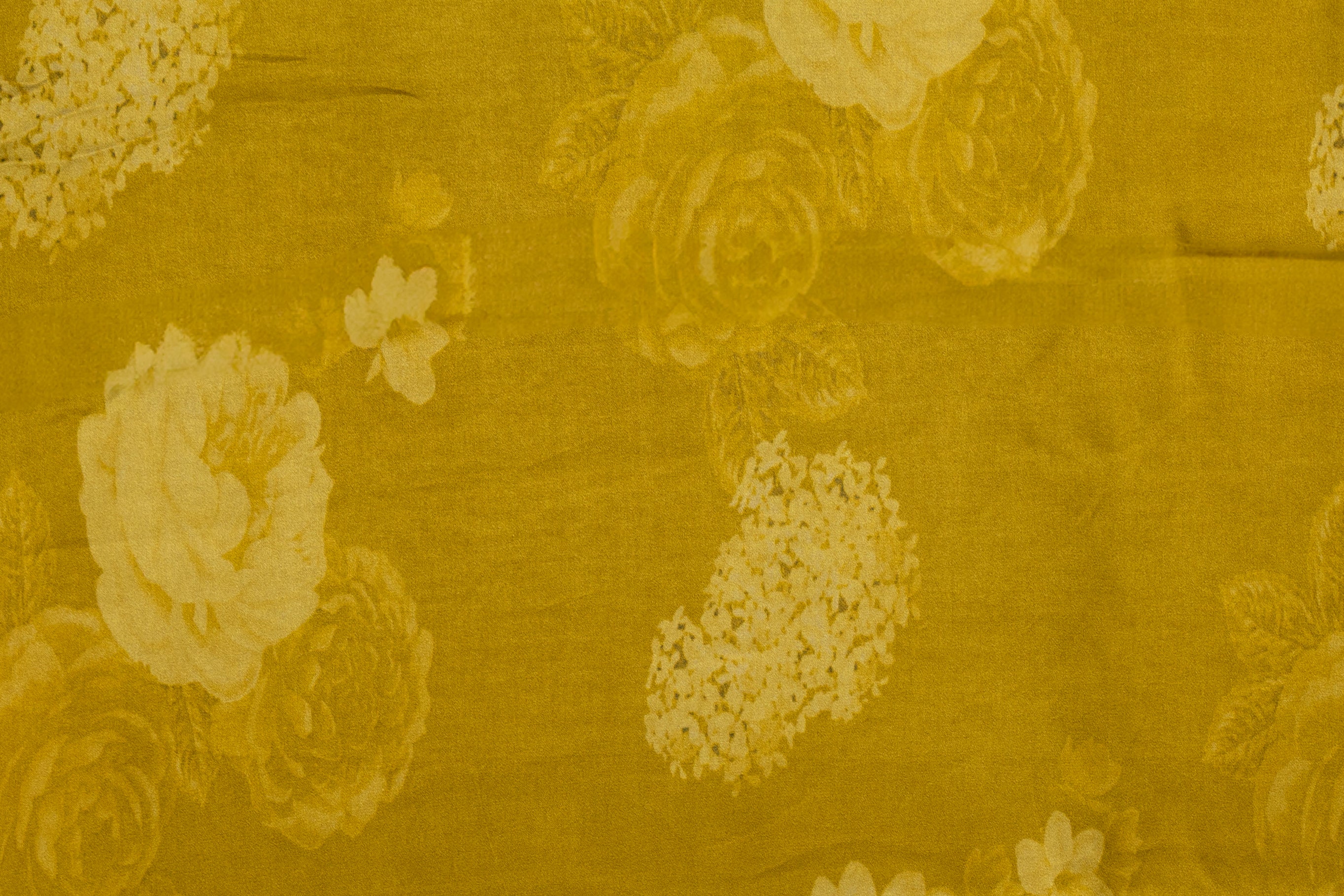 A captivating olive mustard saree with oversized red and white floral prints, perfect for the woman who loves to stand out in refined elegance.