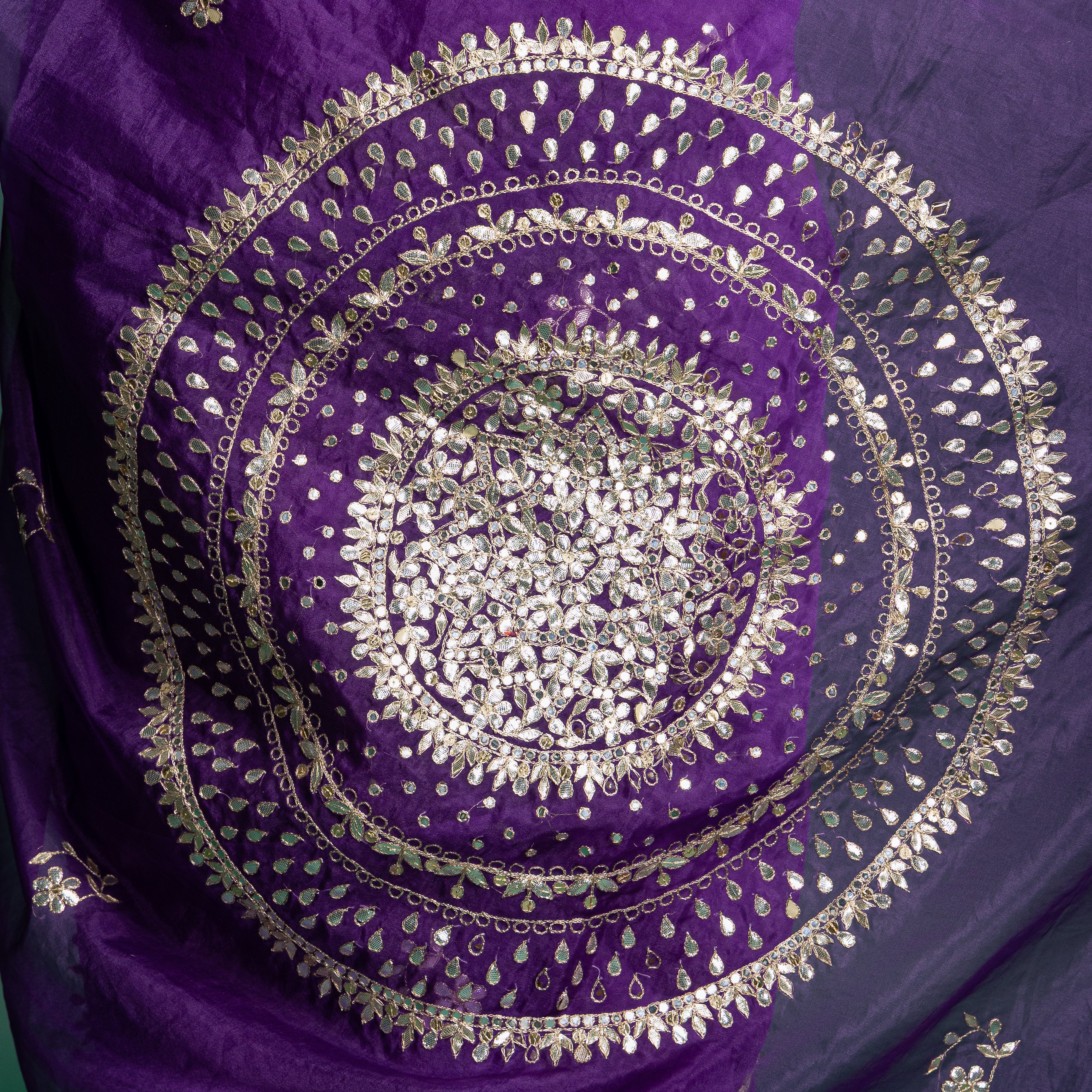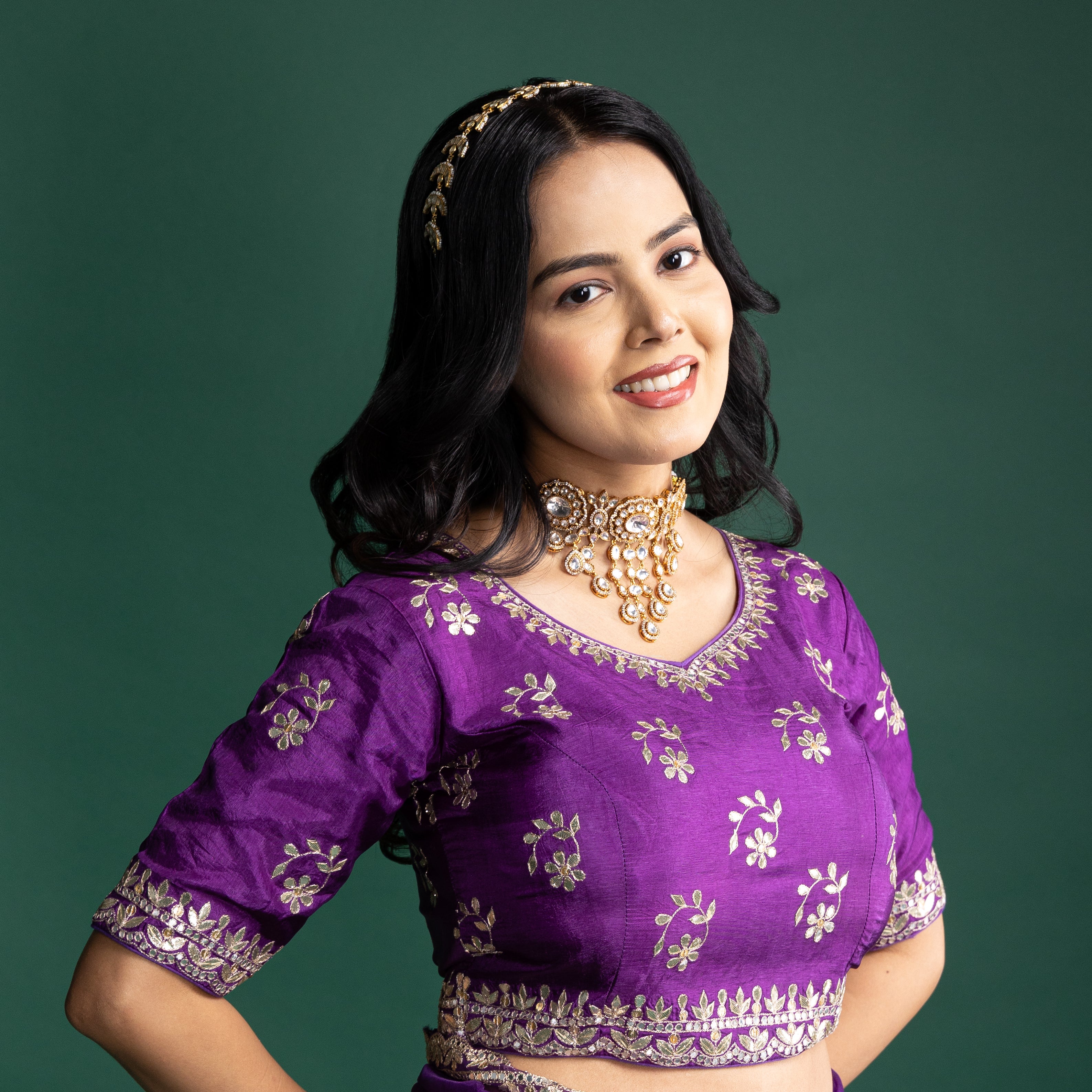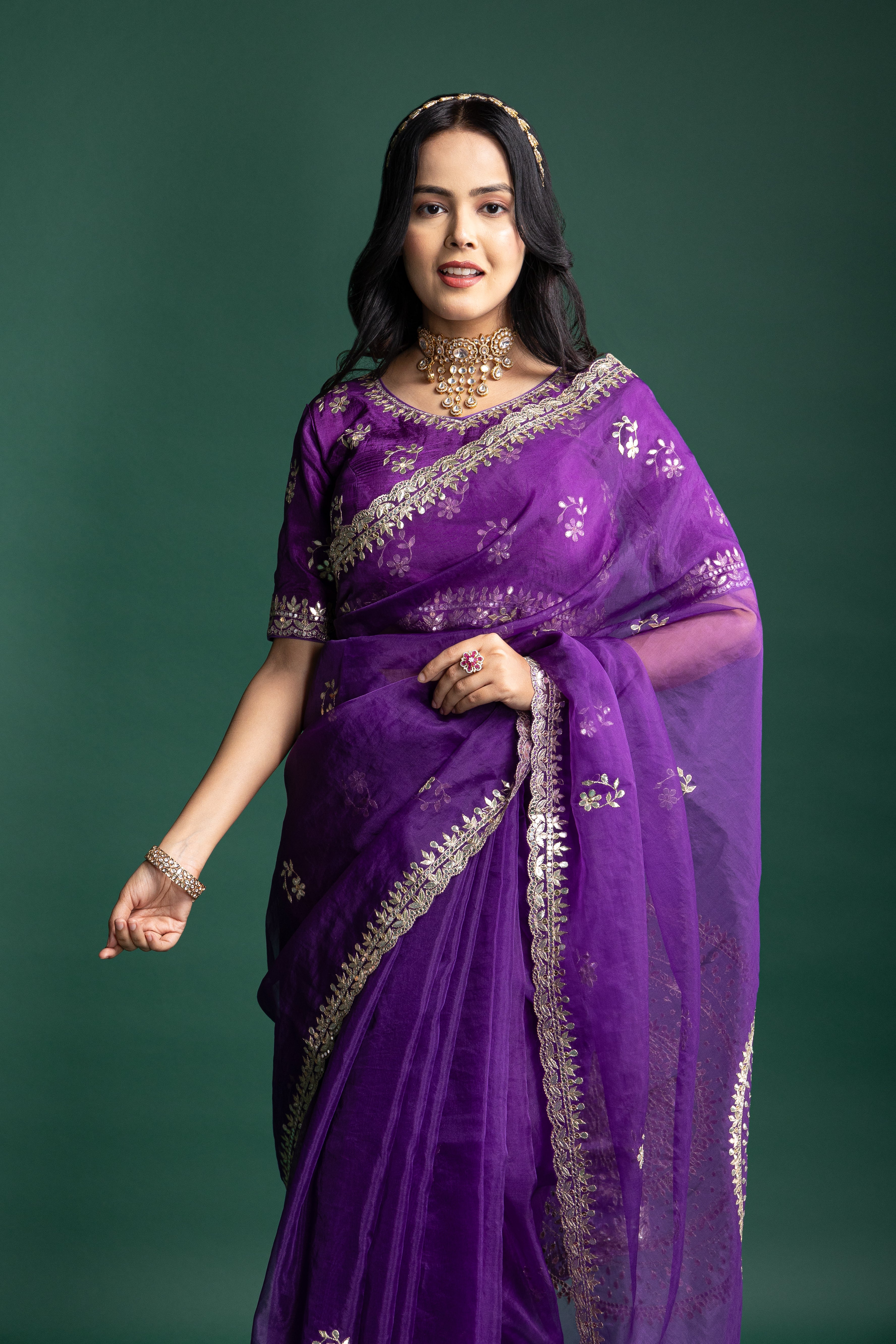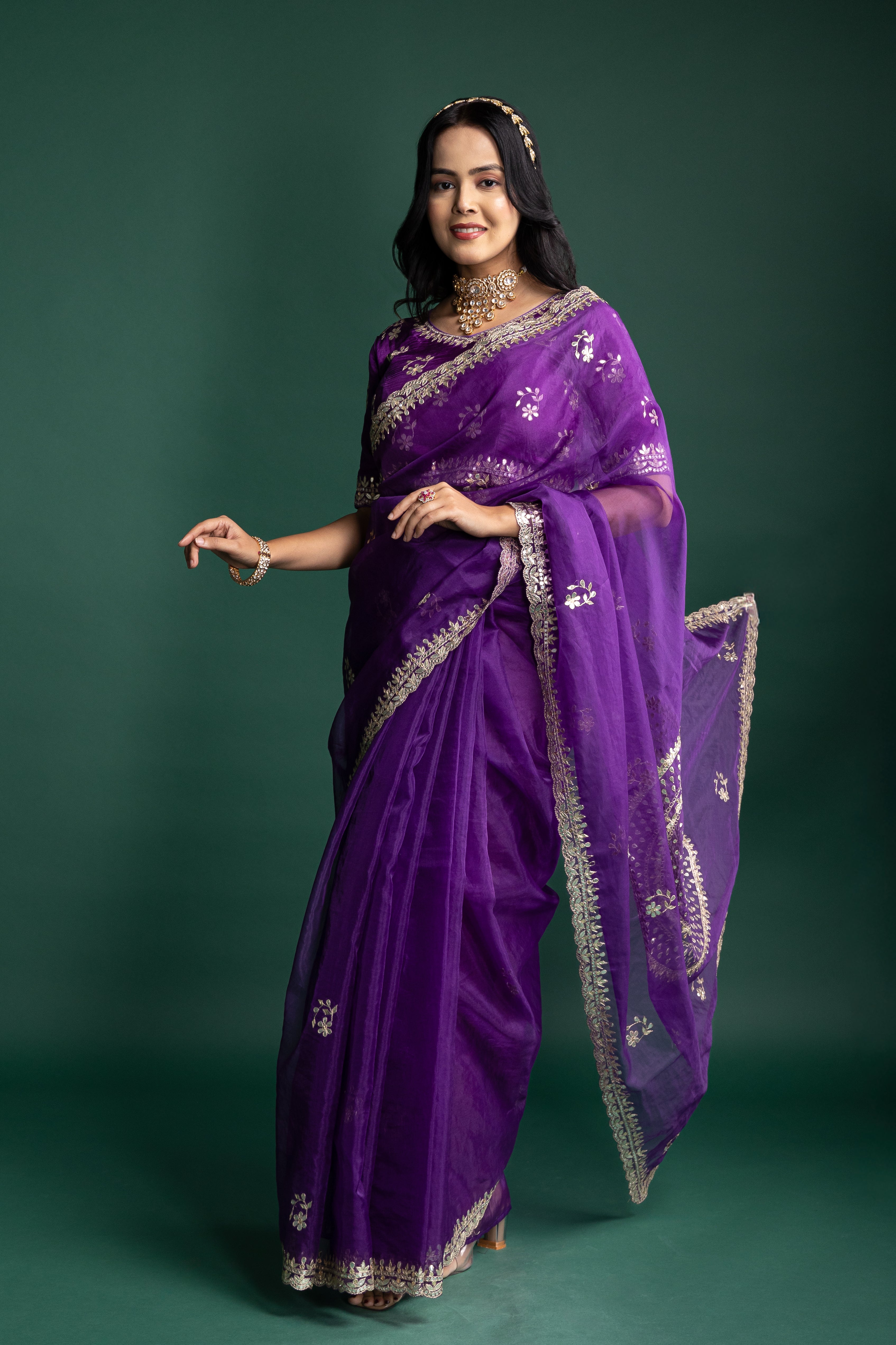 This orchid purple saree features intricate gold hand-embroidery and delicate borders, offering a graceful, ethereal drape perfect for premium festive occasions and refined evening celebrations.