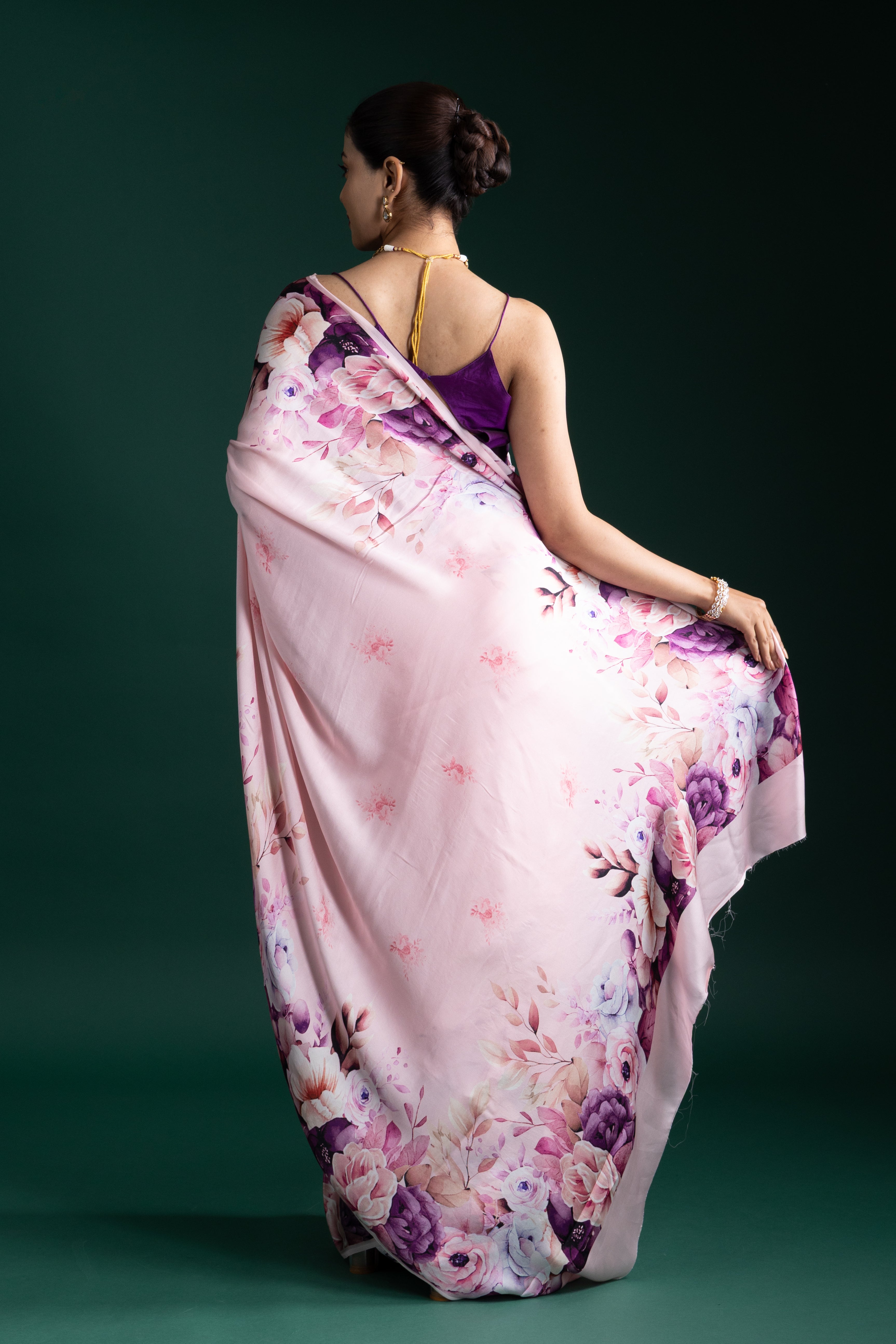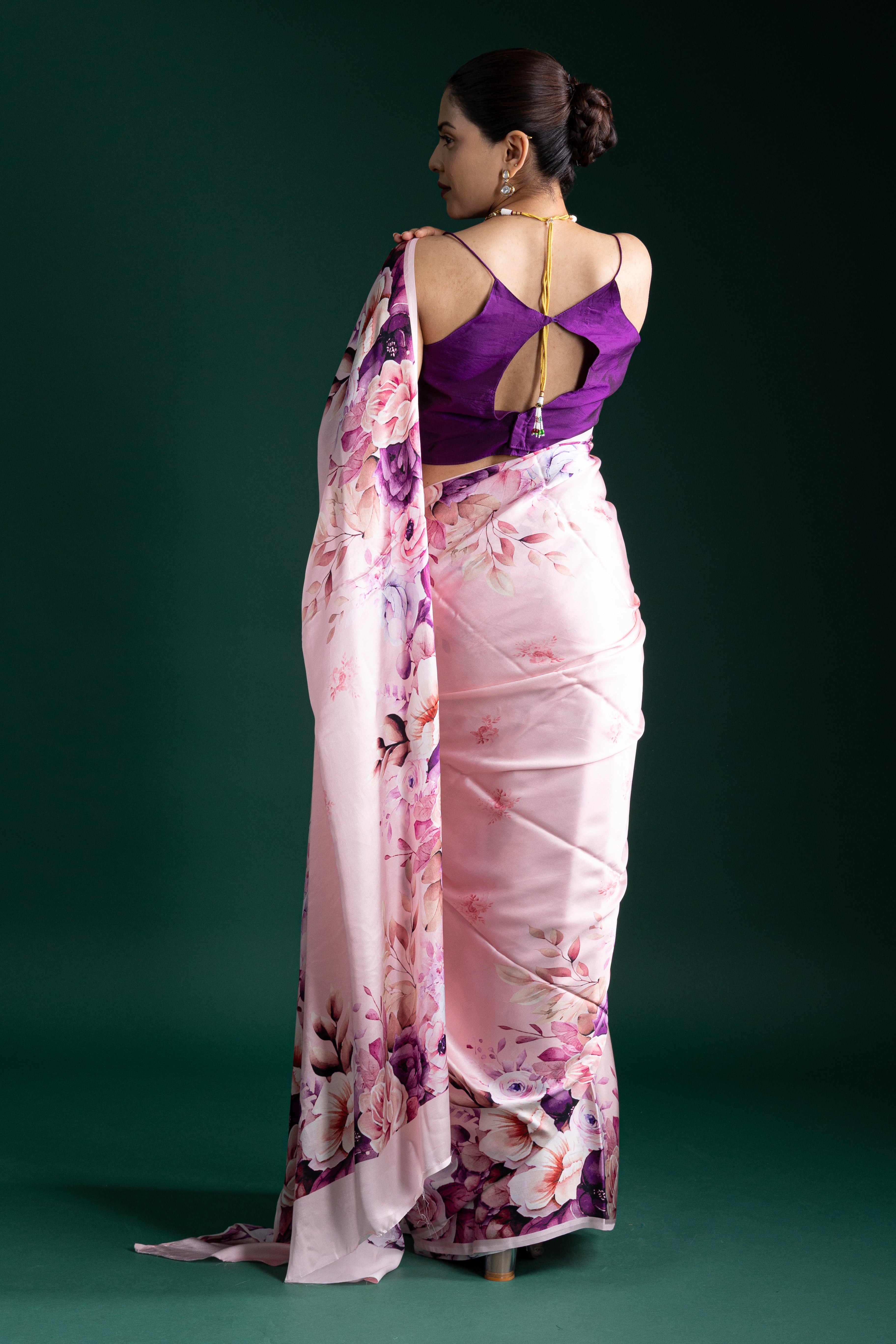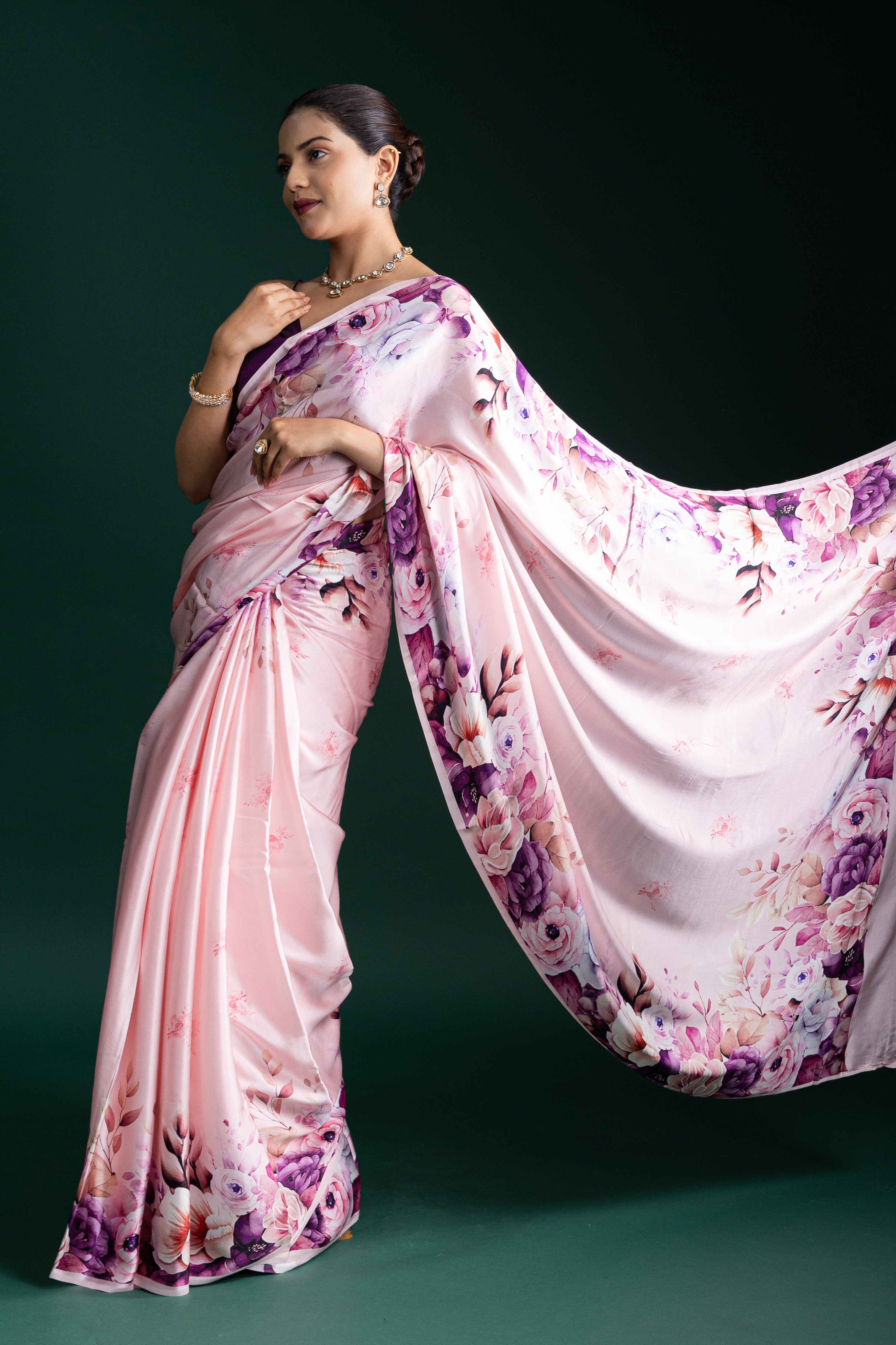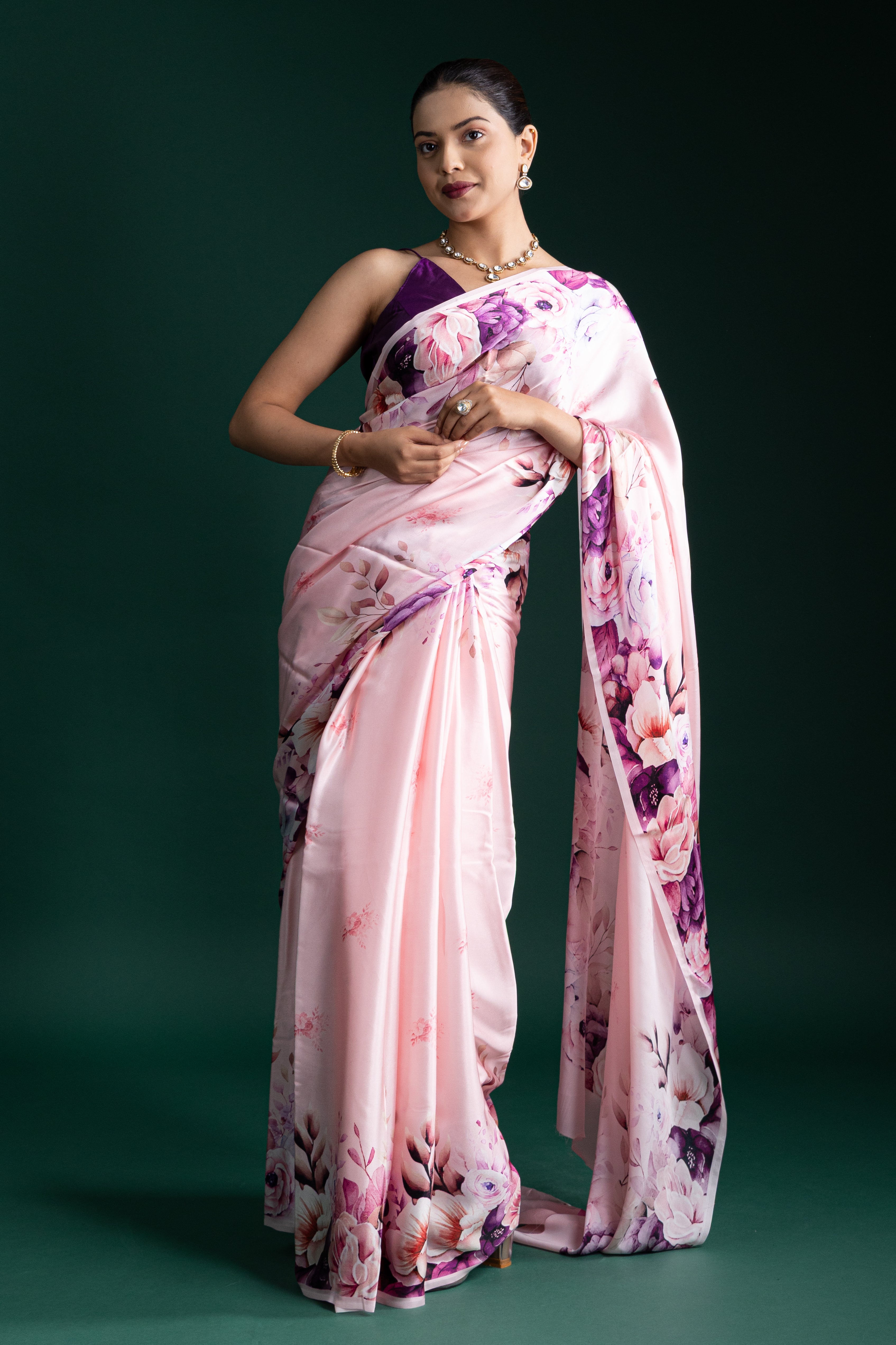 Graceful blush pink silk saree adorned with delicate floral patterns in vibrant tones. Crafted for elegance, this saree blends modern chic with timeless traditional appeal.