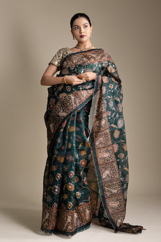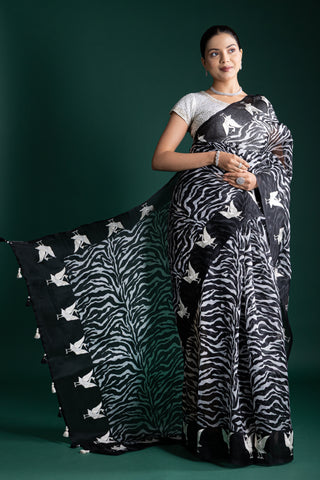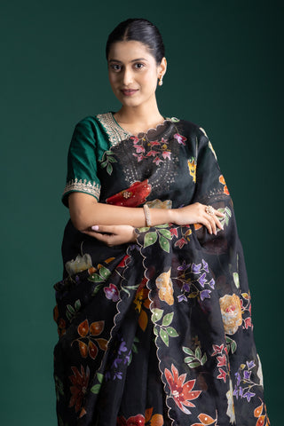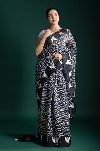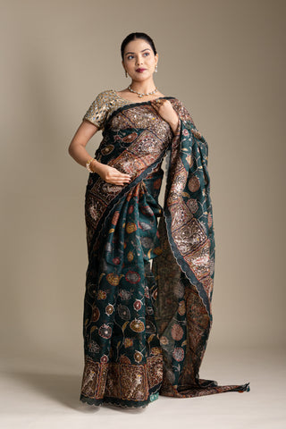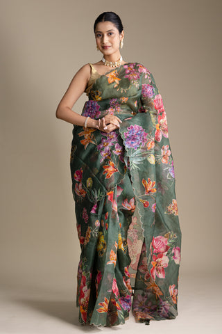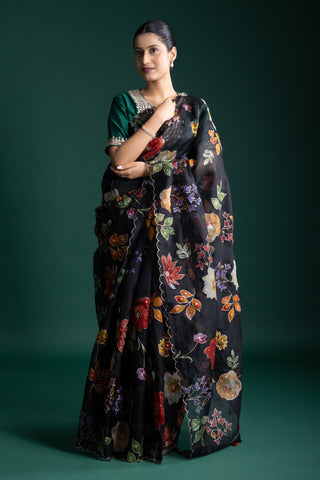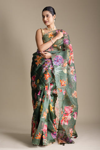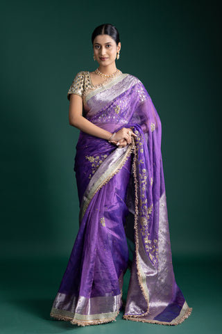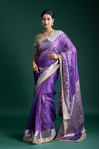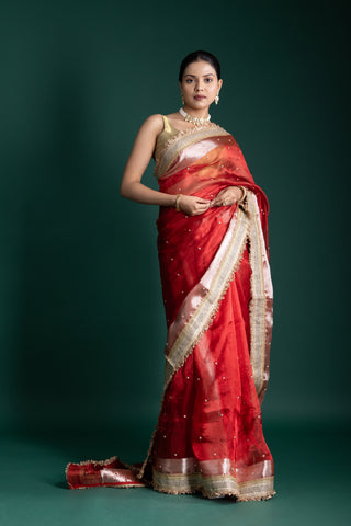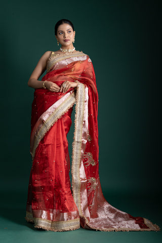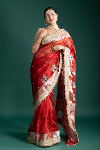 Vibrant Tangerine Organza Saree with Intricate Lattice Embroidery