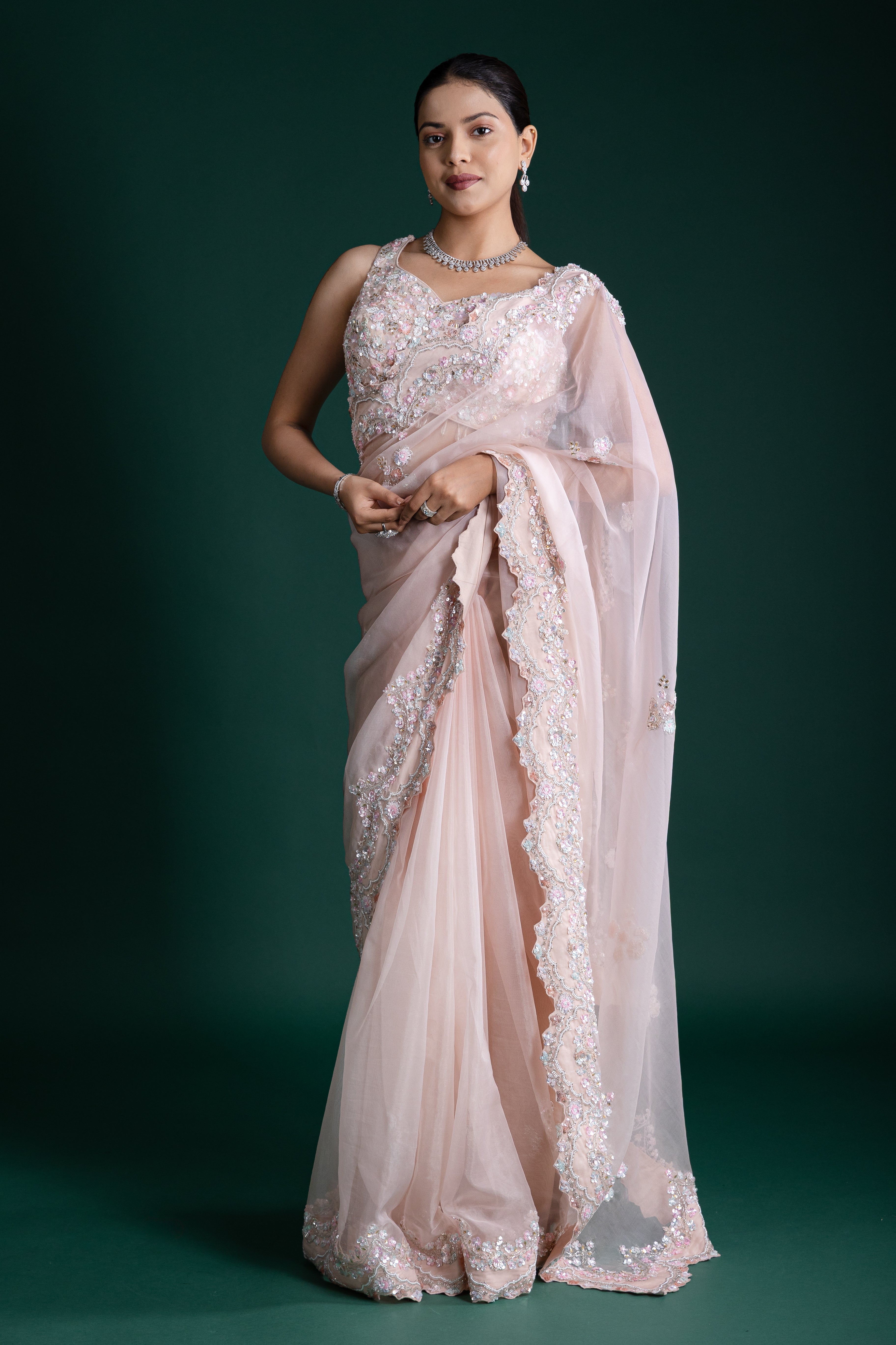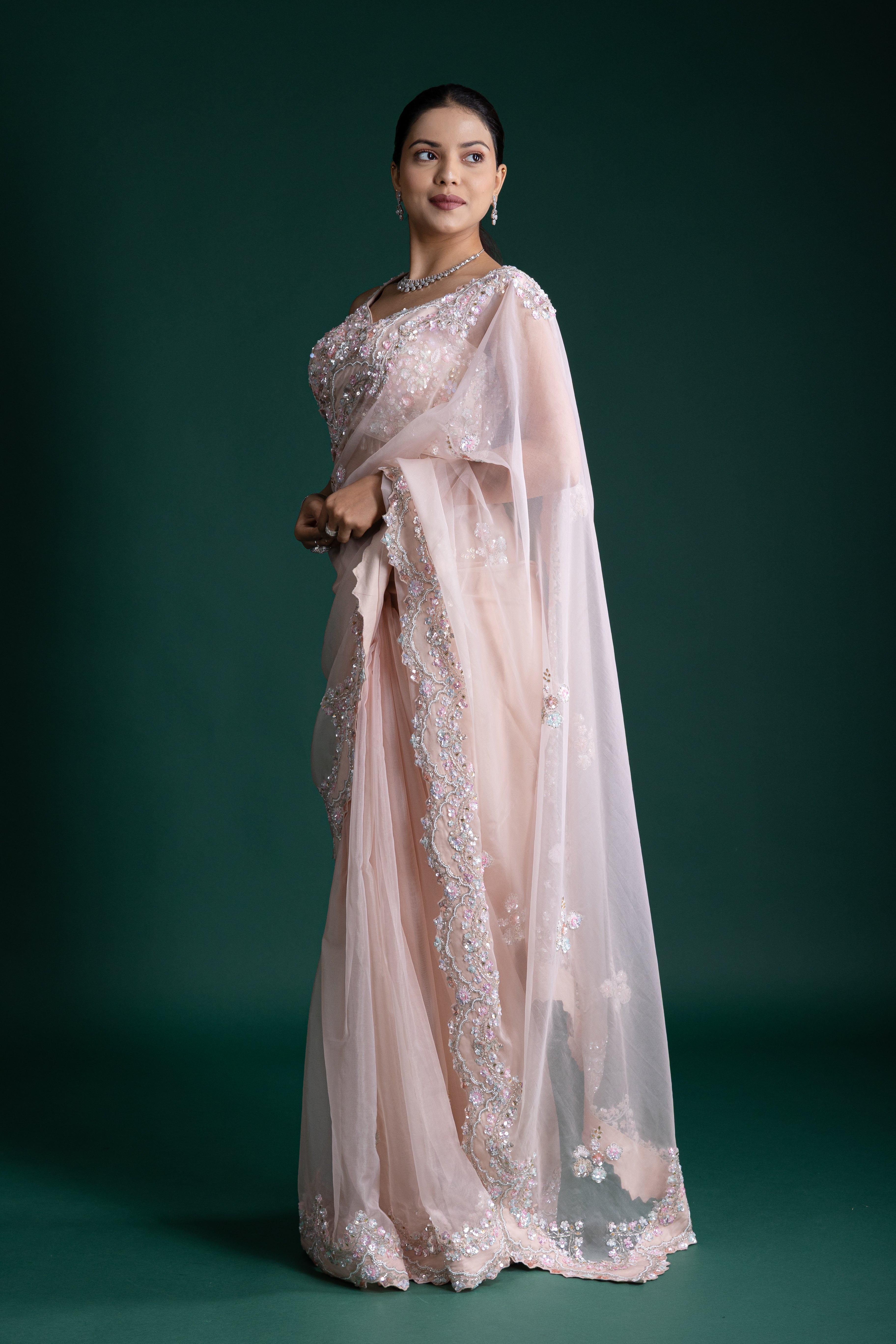 This blush pink net saree sparkles with intricate sequin detailing, creating a dreamy, romantic look ideal for evening wear and sophisticated celebrations.