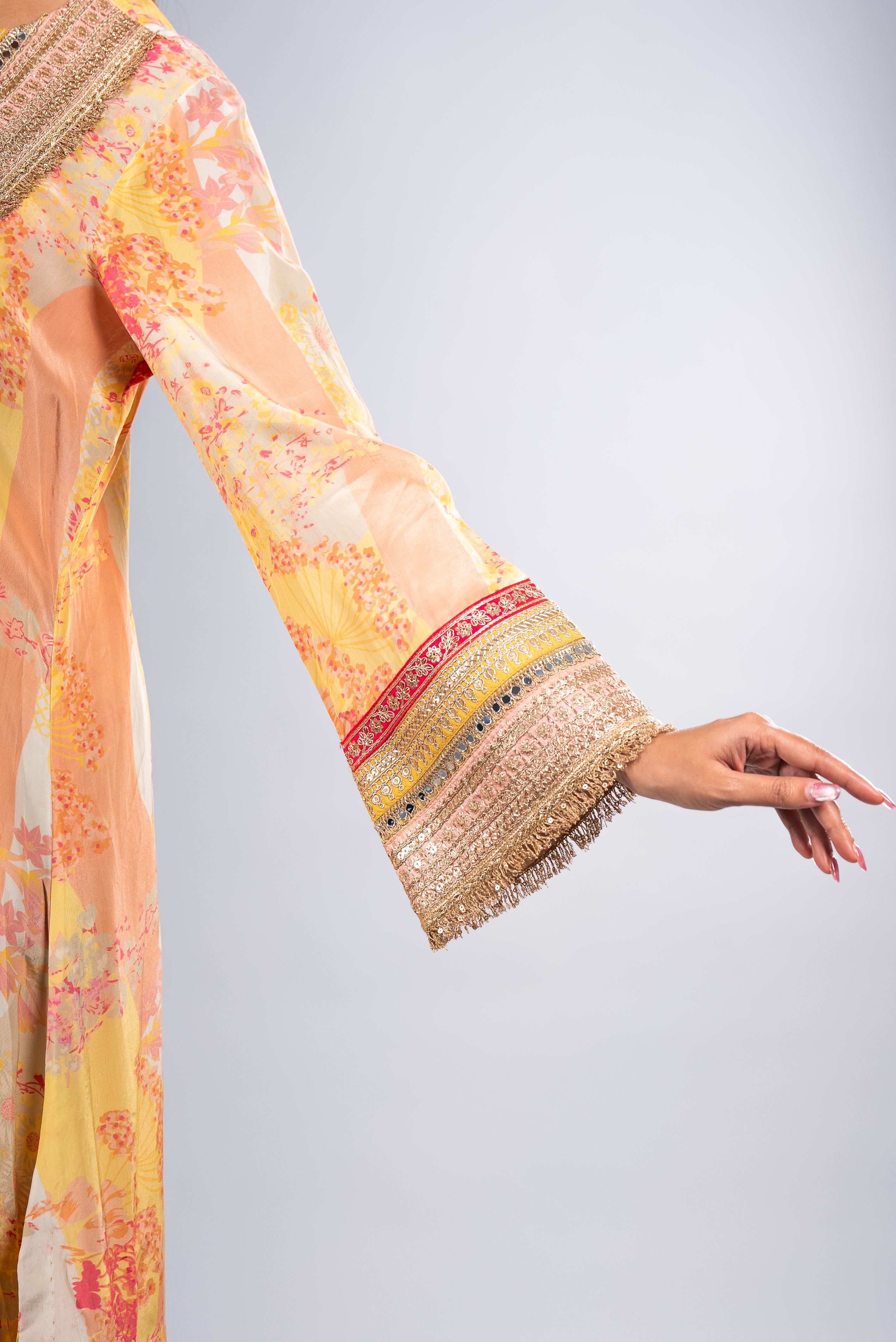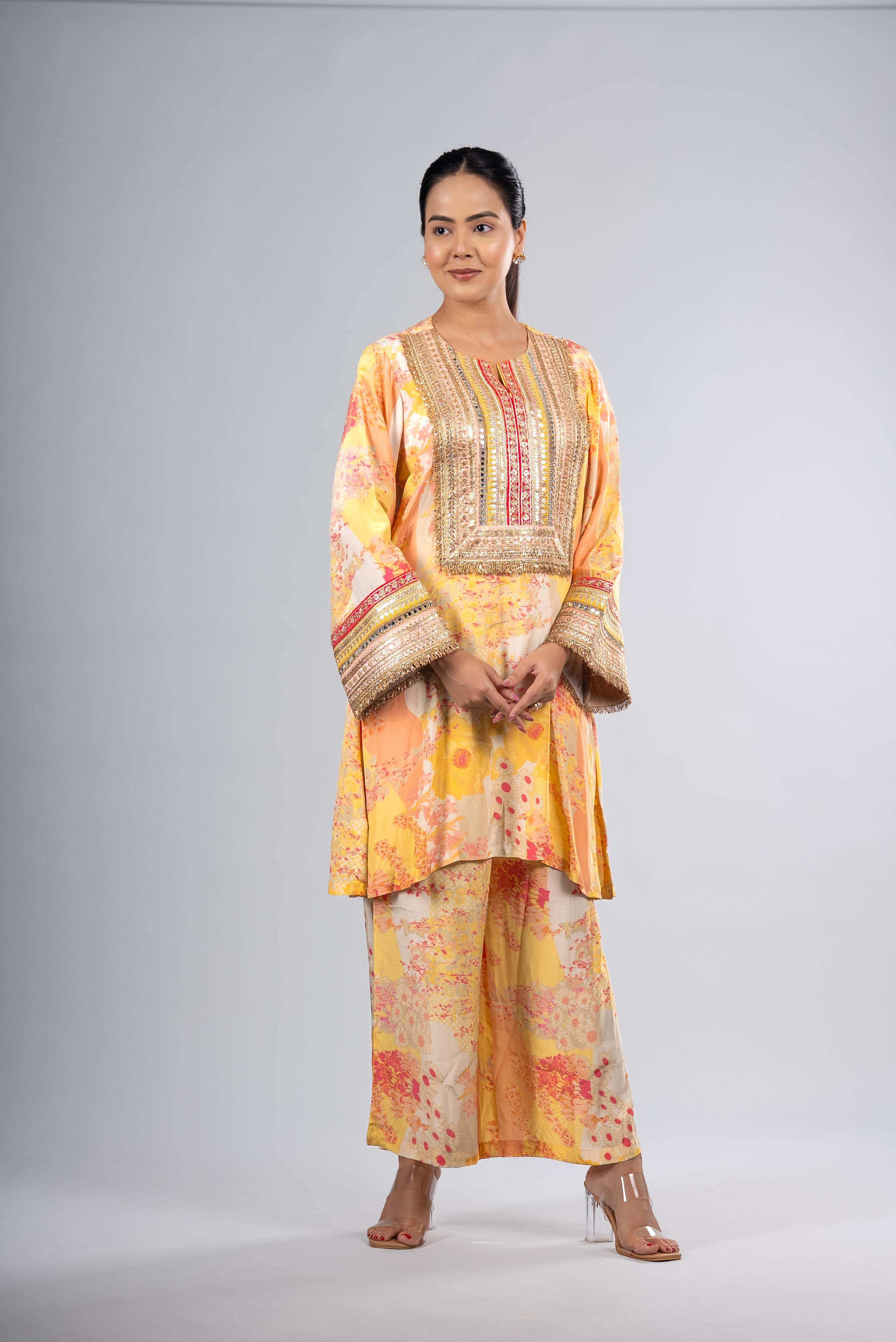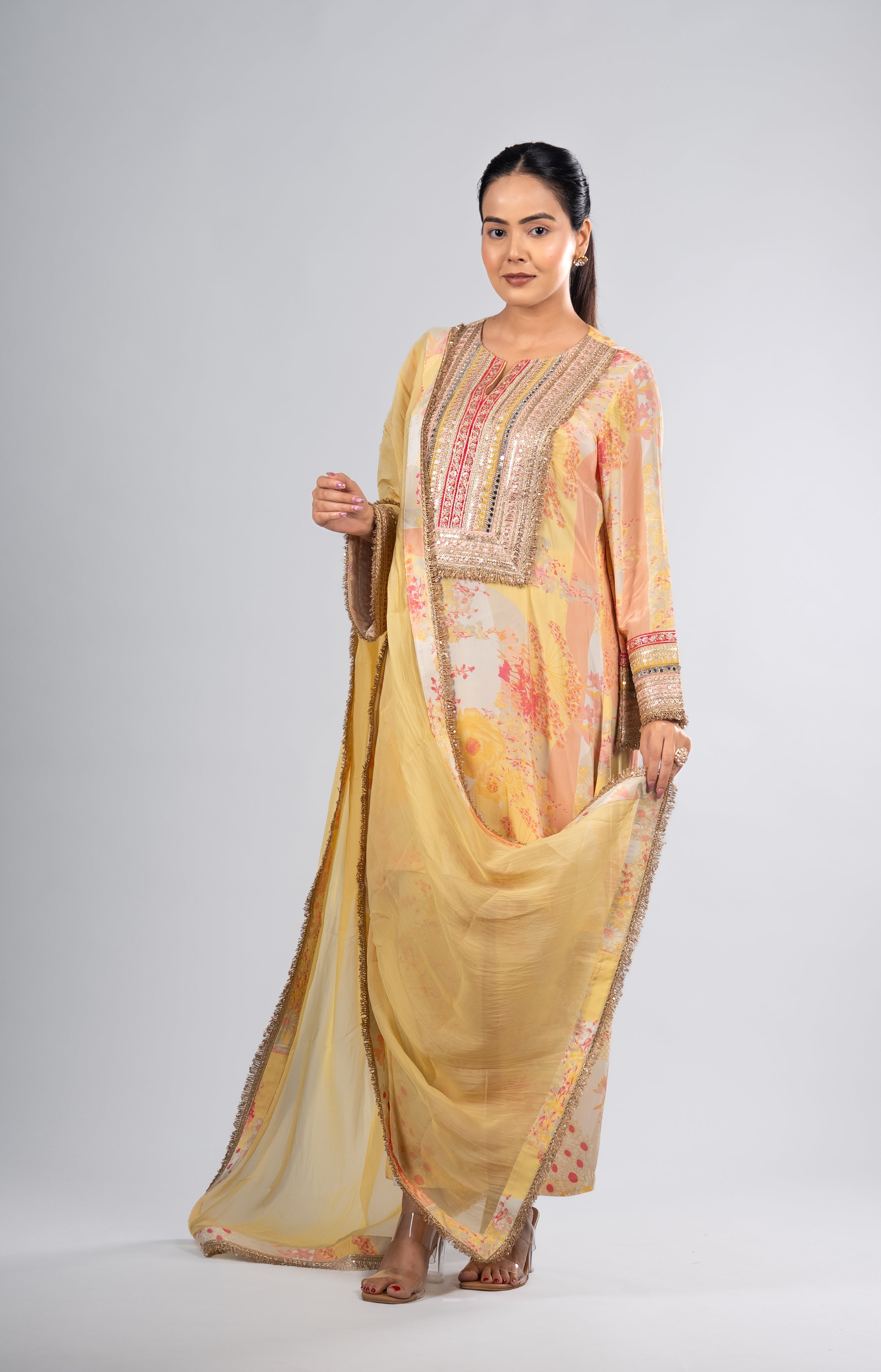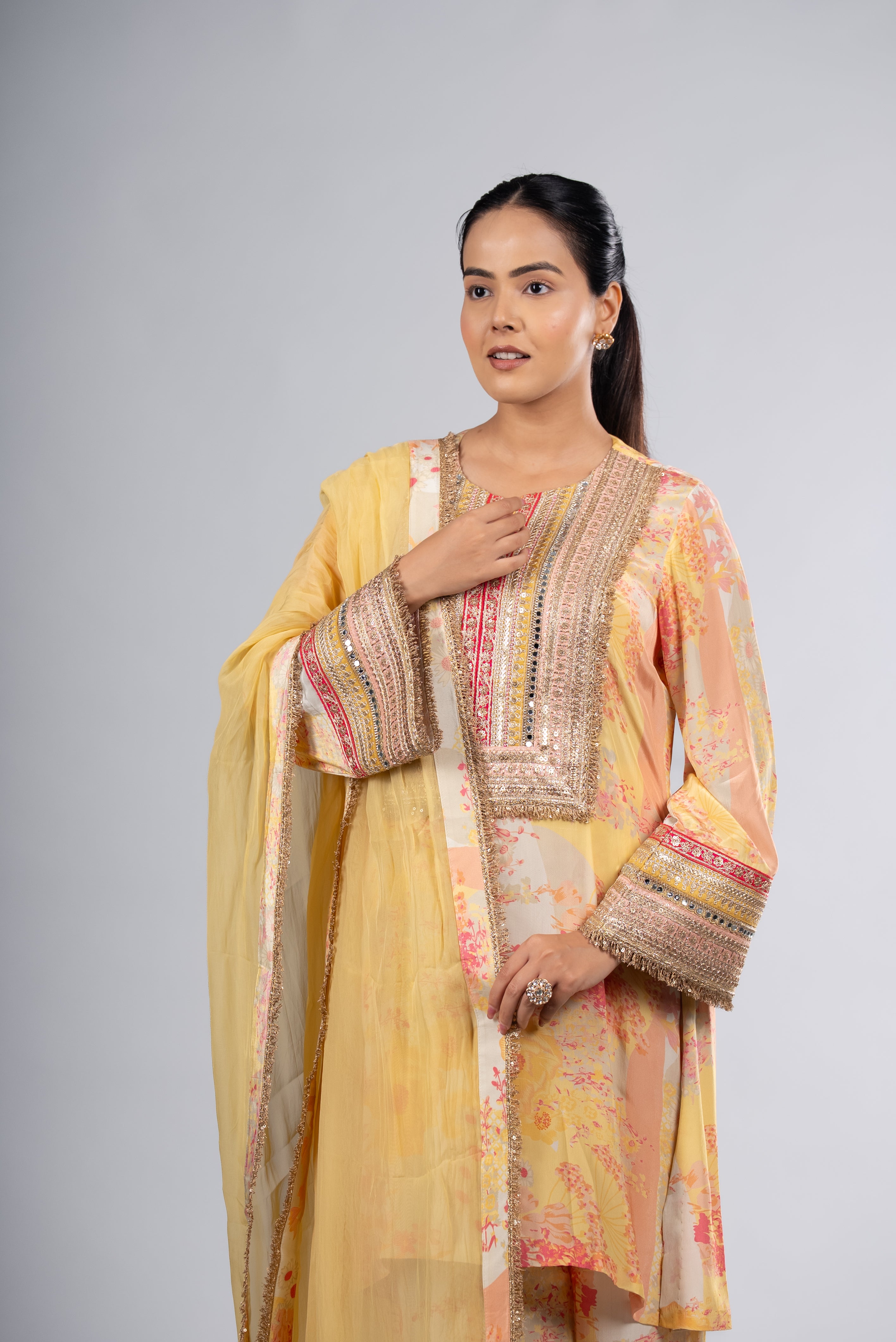 Bask in festive elegance with this golden sunrise suit set, highlighted by peach blossom detailing and mirror embroidery. A radiant choice for daytime weddings, festive soirées, and celebrations.