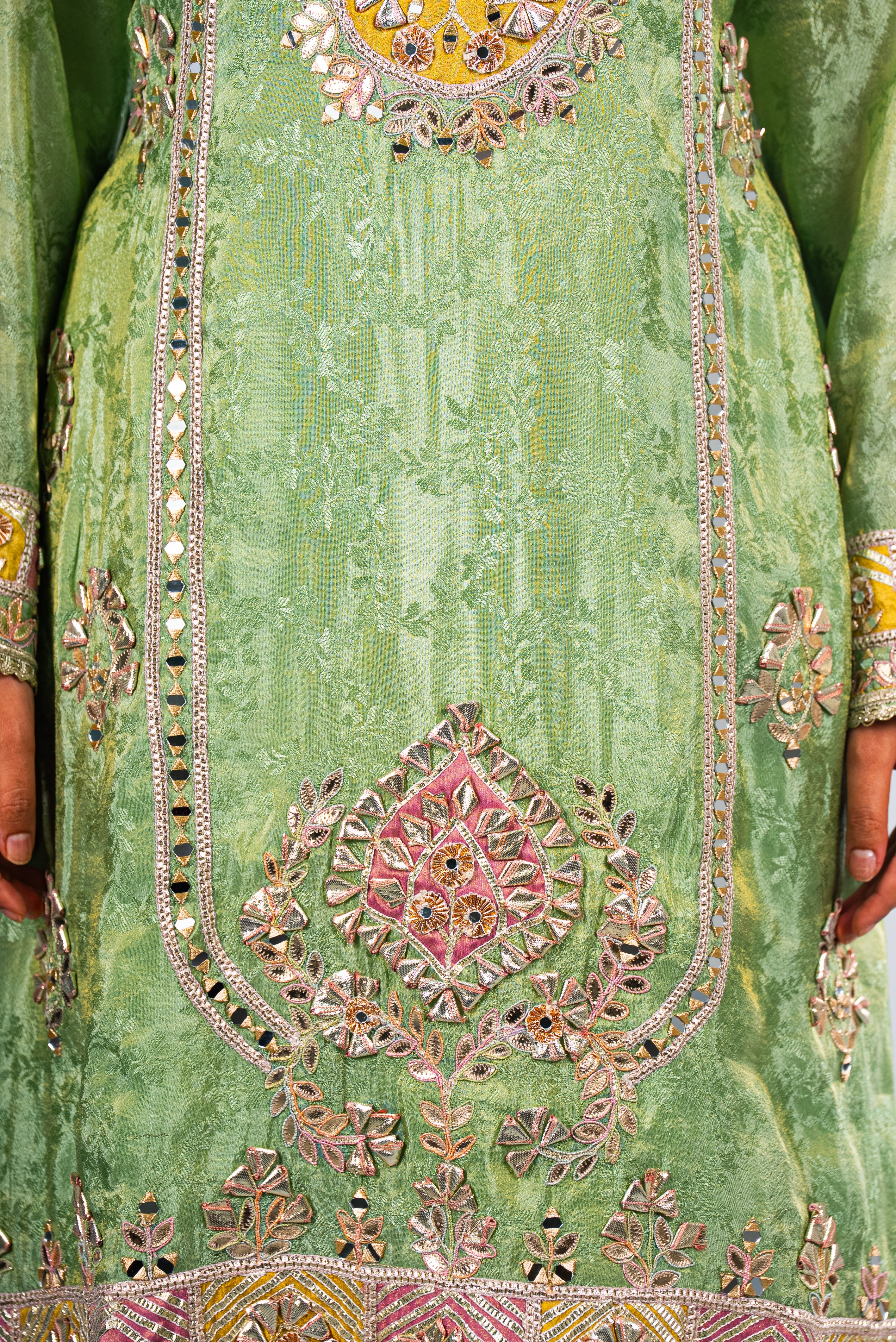 This pastel sage green palazzo set, paired with a mustard gold dupatta, features exquisite embroidery and mirror detailing, offering a perfect blend of elegance, tradition, and contemporary luxury.