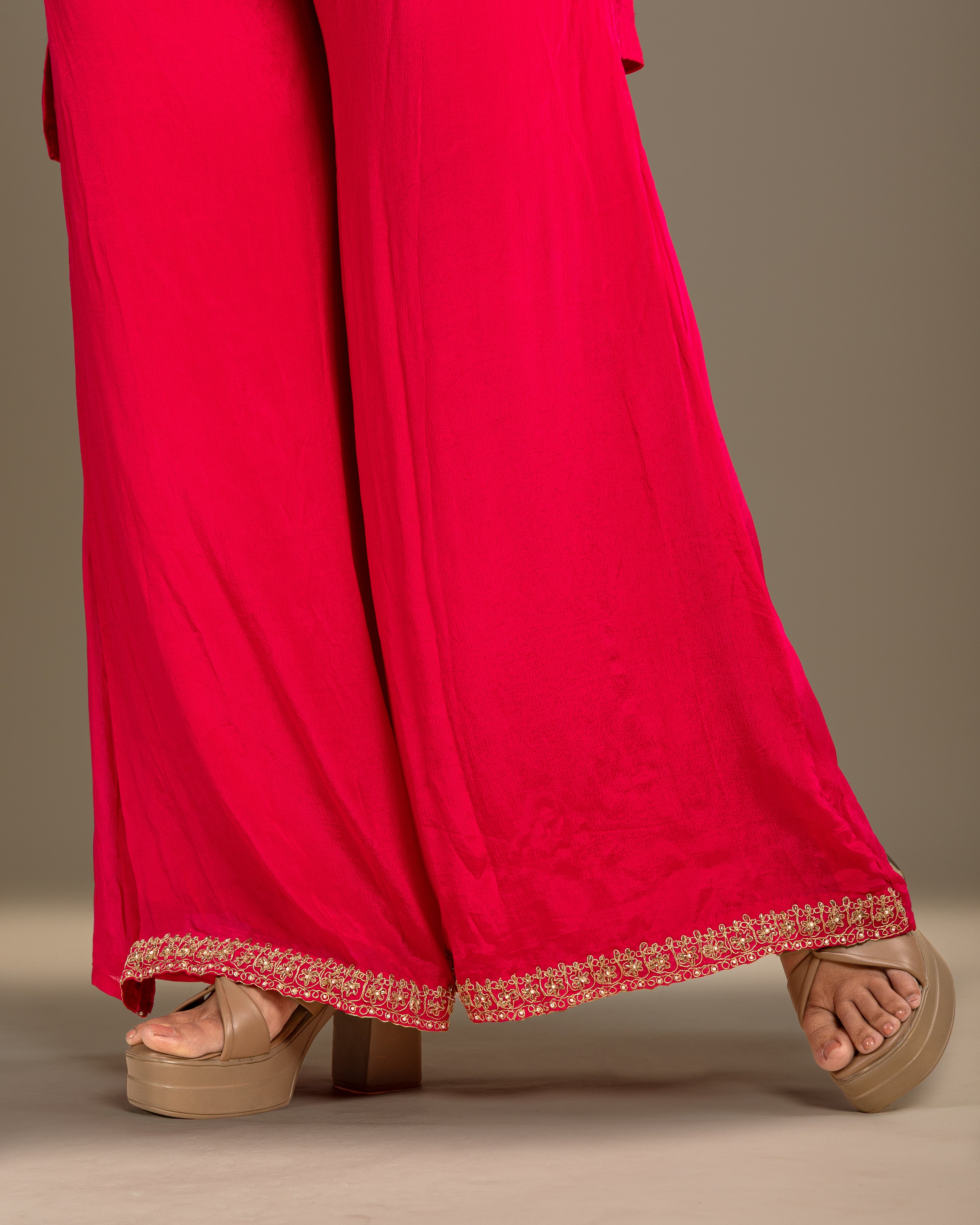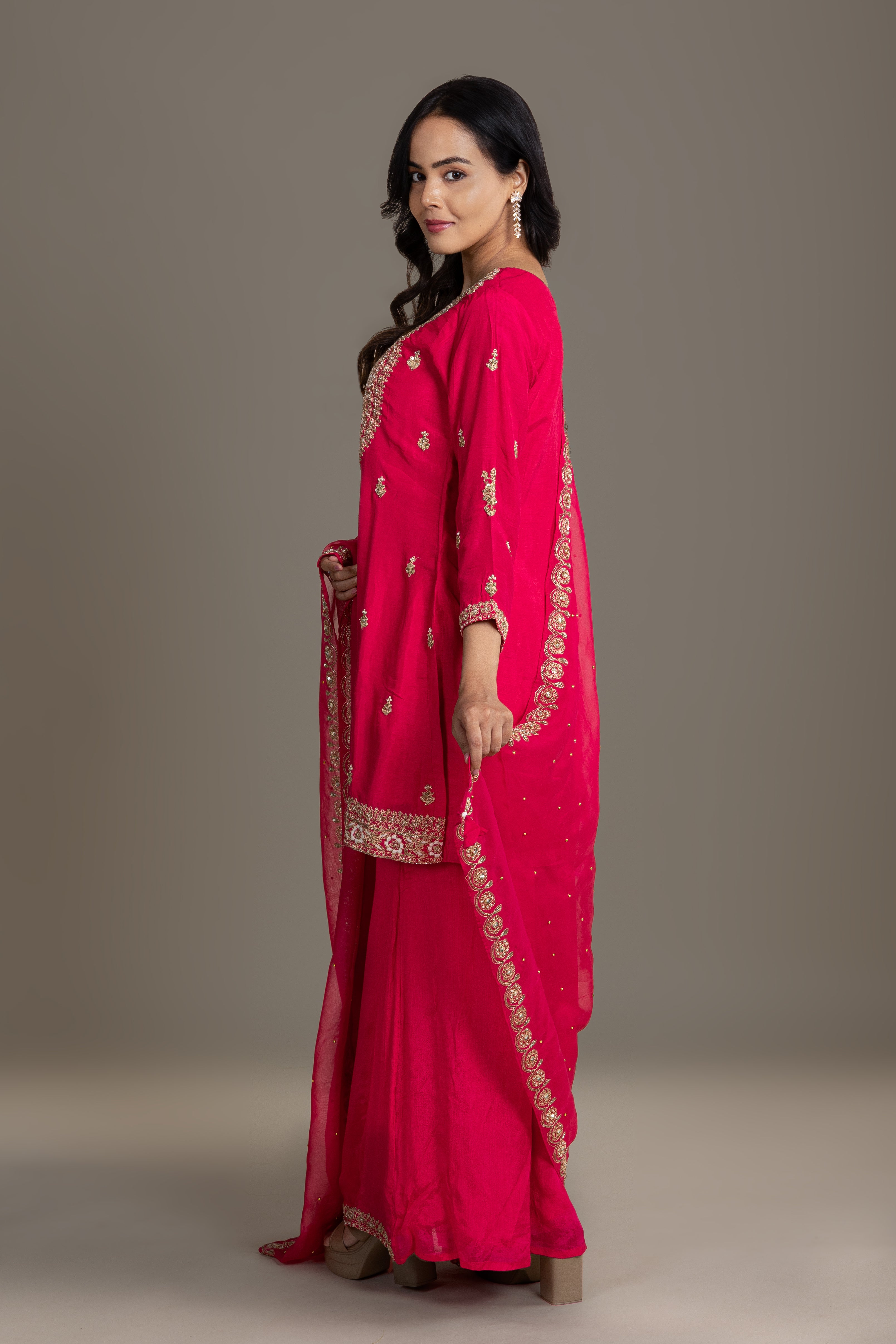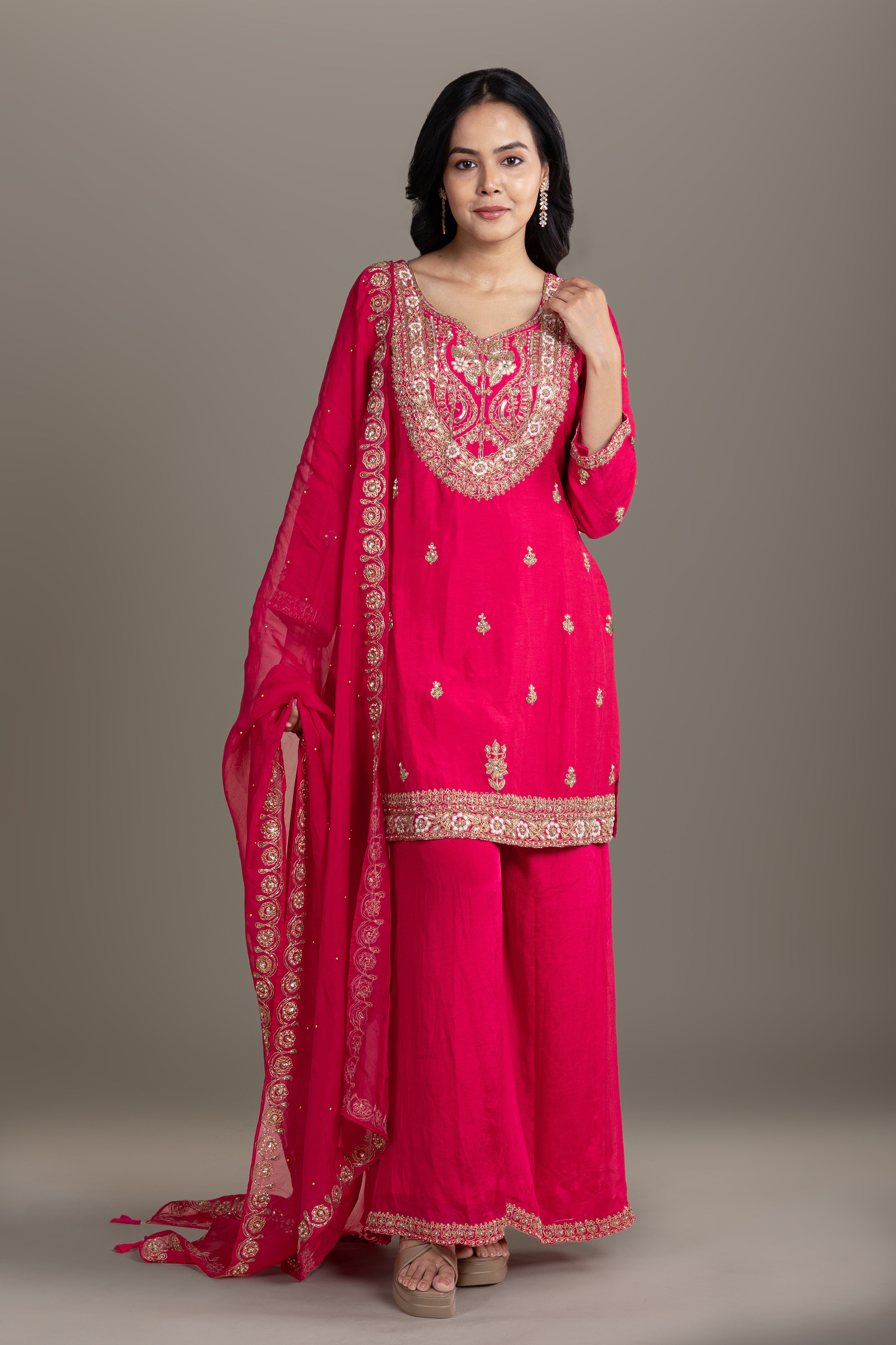 Royal rani pink kurta set featuring heavy gota embroidery and delicate detailing, curated for grand festive occasions and elegant evening functions.