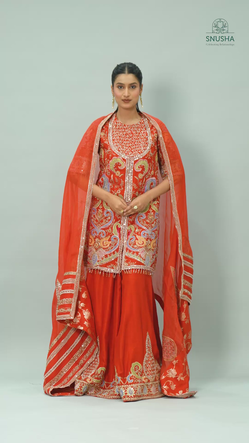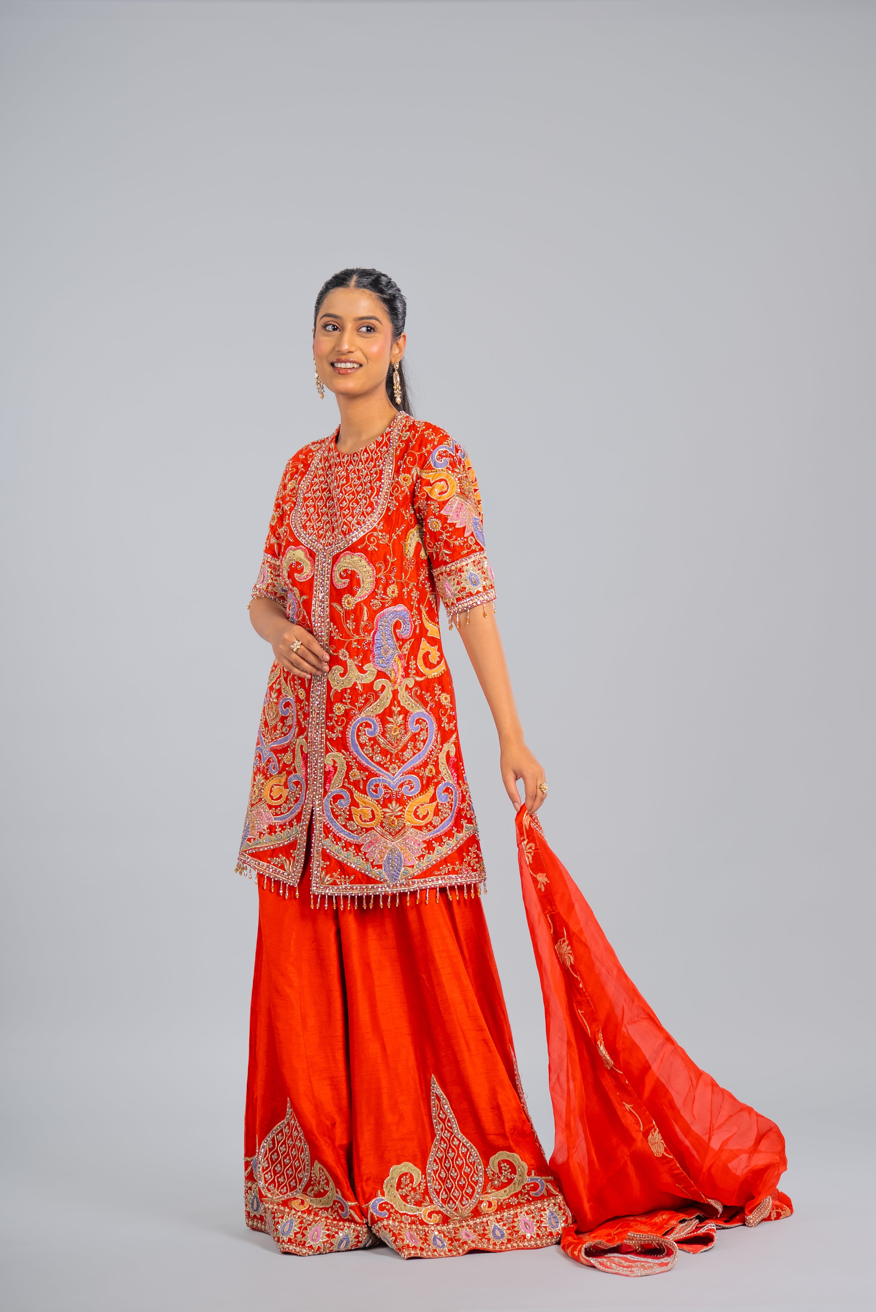 A striking rust orange palazzo set richly adorned with intricate zari, mirror, and sequin embroidery. The regal silhouette adds grandeur and festive glamour to your ethnic wardrobe.
