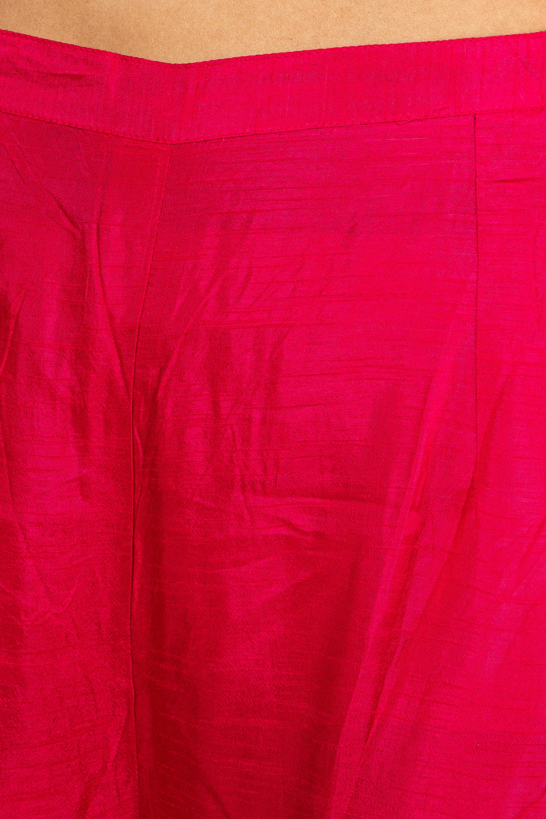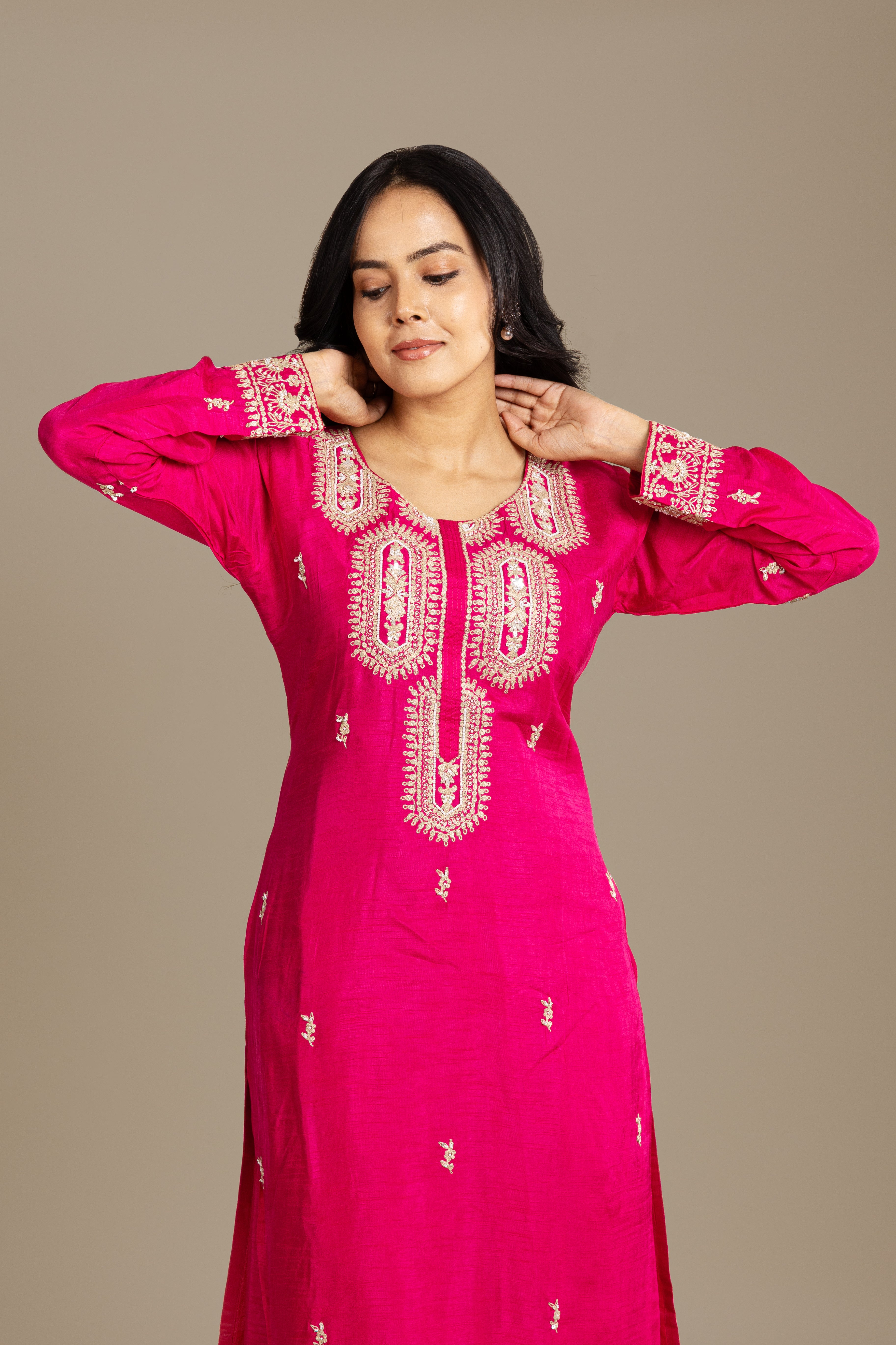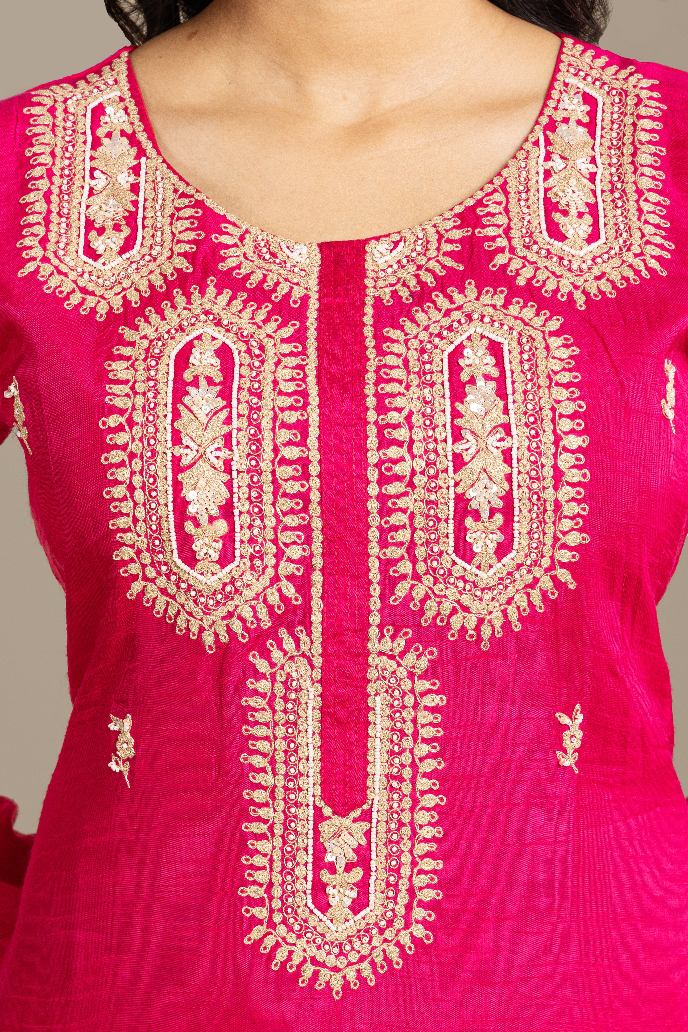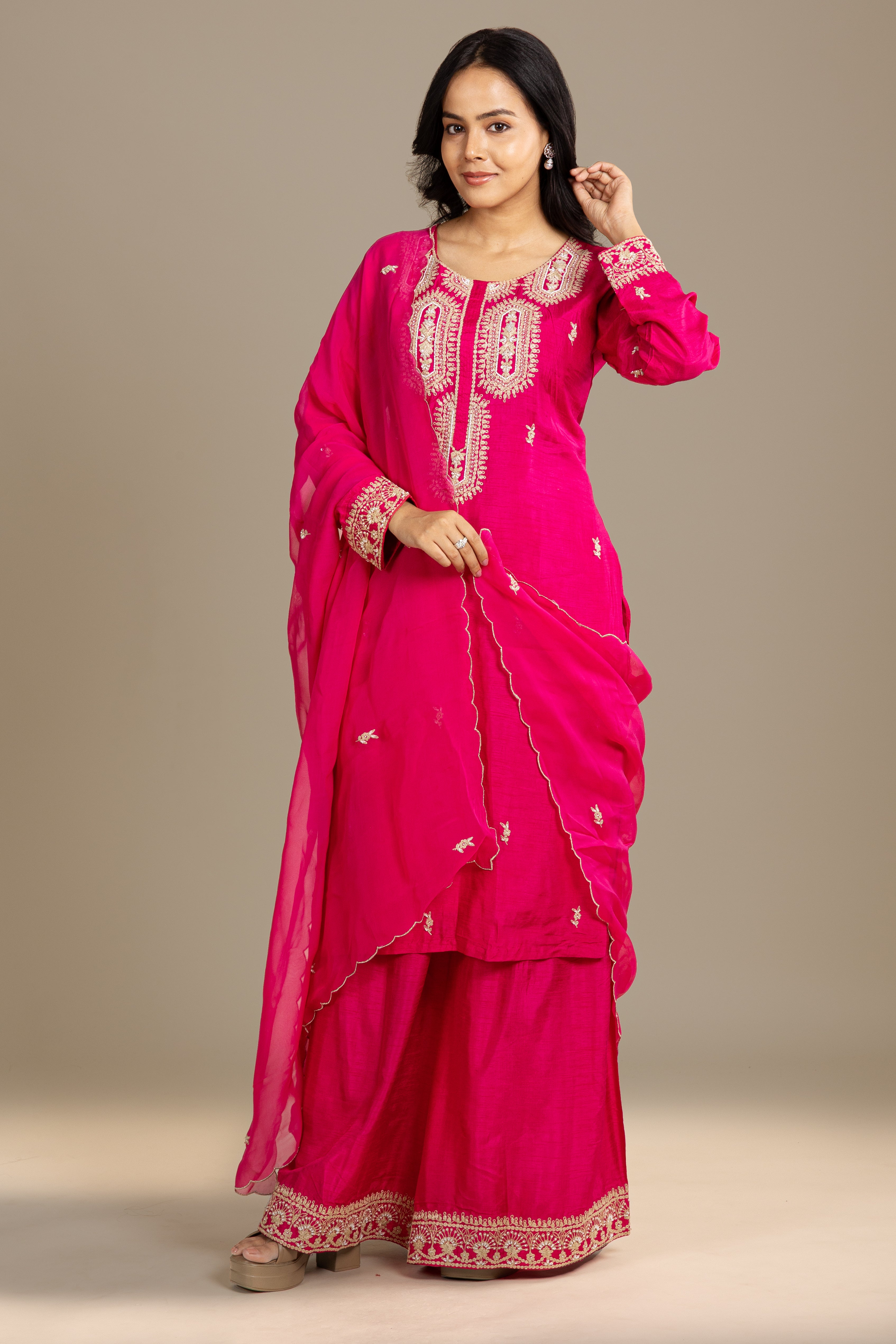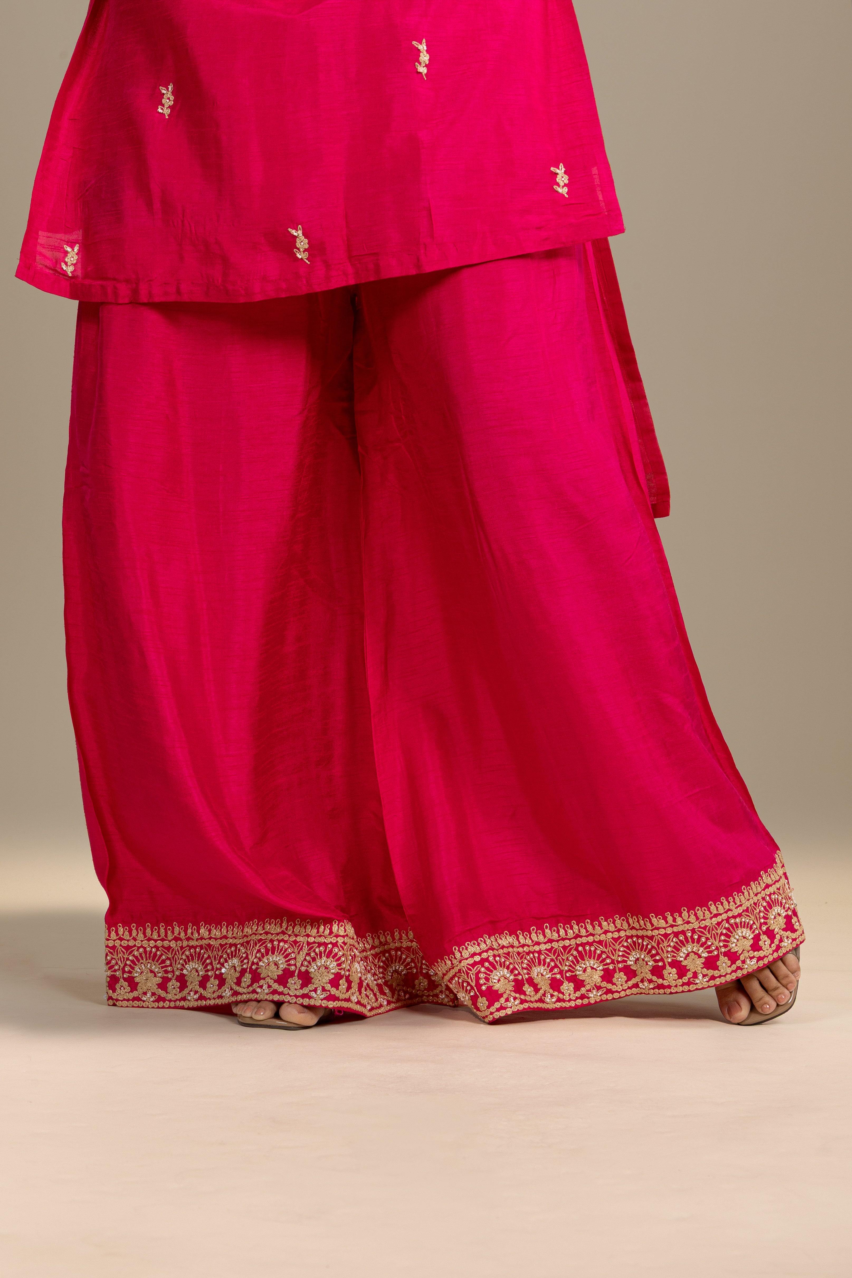 Vivid fuchsia pink kurta sharara ensemble with intricate golden motifs, designed for those who love to make a bold and chic festive statement.