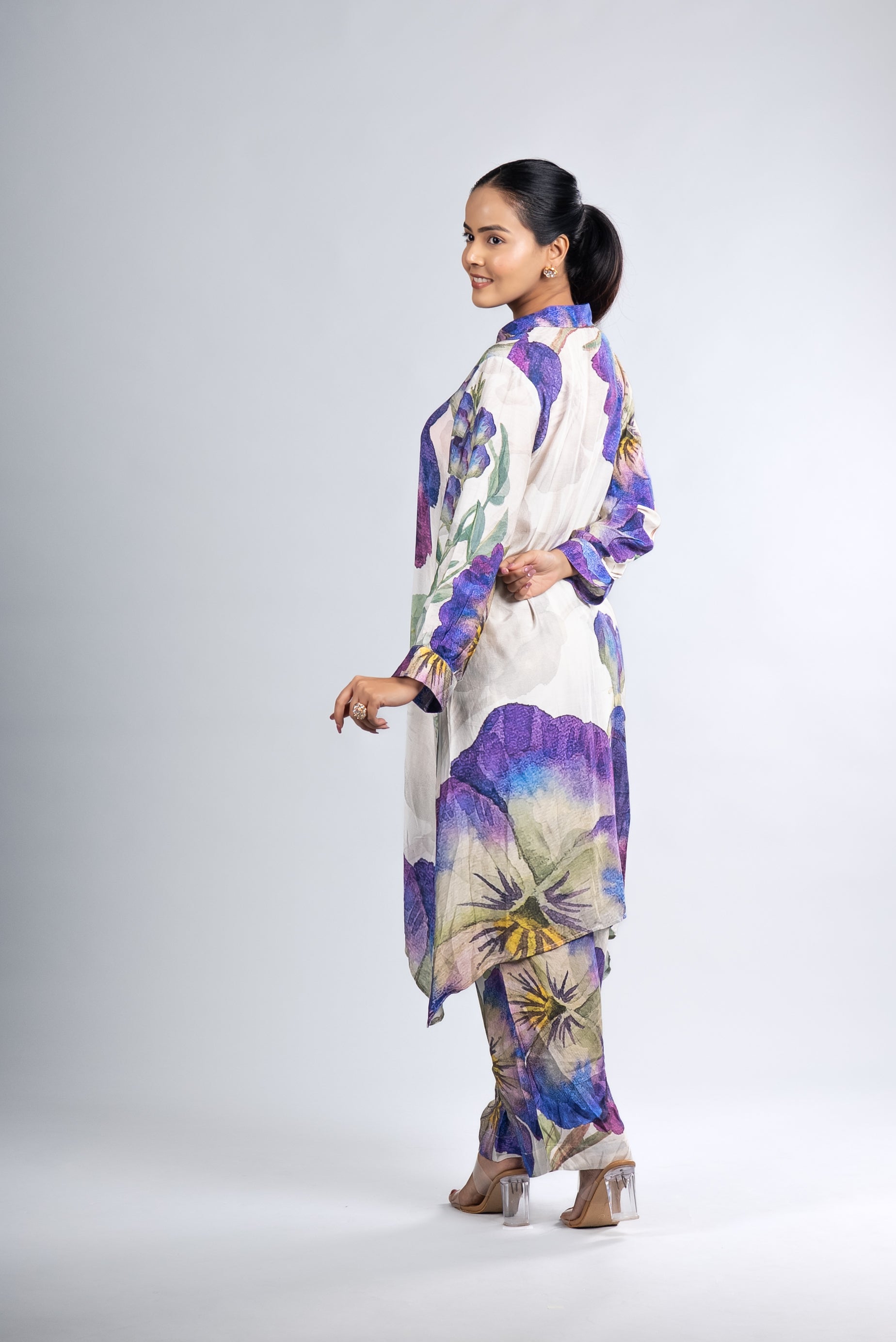 This ivory white kurta set, detailed with vibrant violet floral prints and green accents, blends modern freshness with timeless charm, perfect for sophisticated day-to-night elegance.