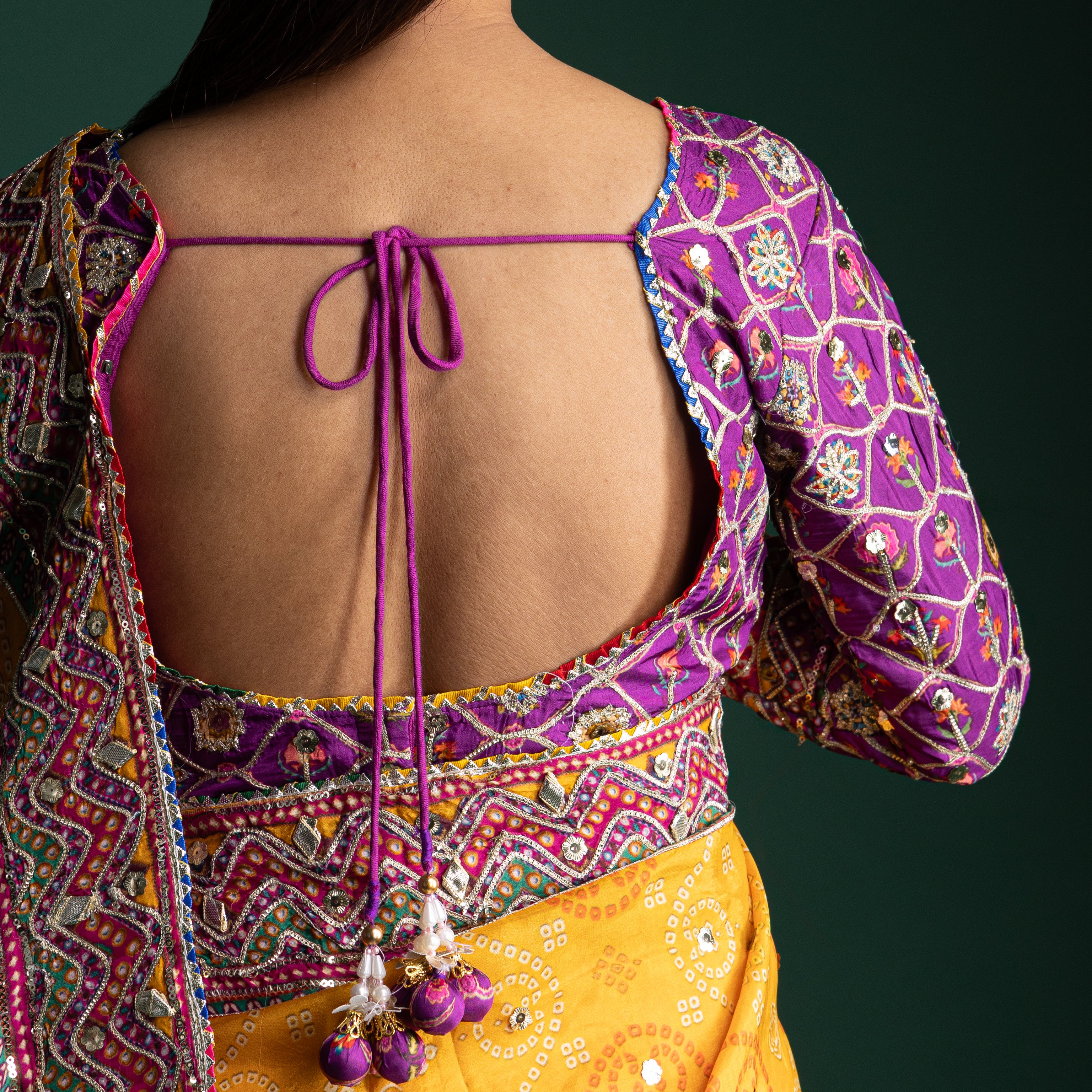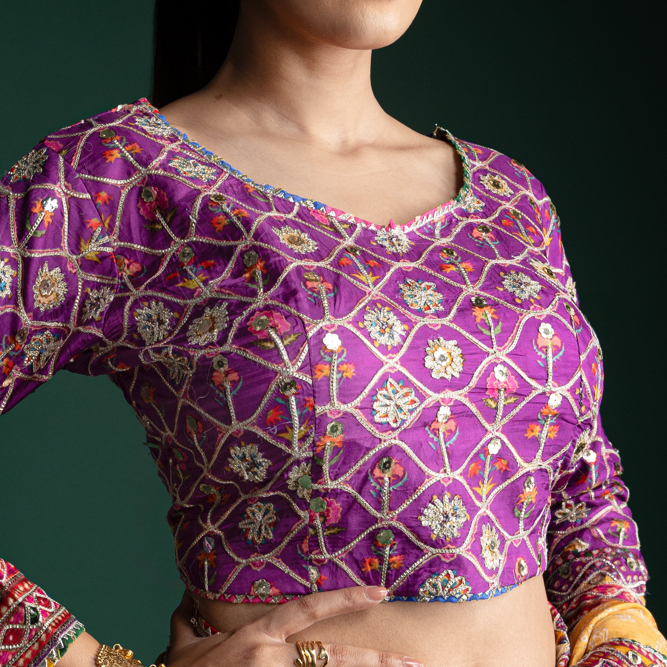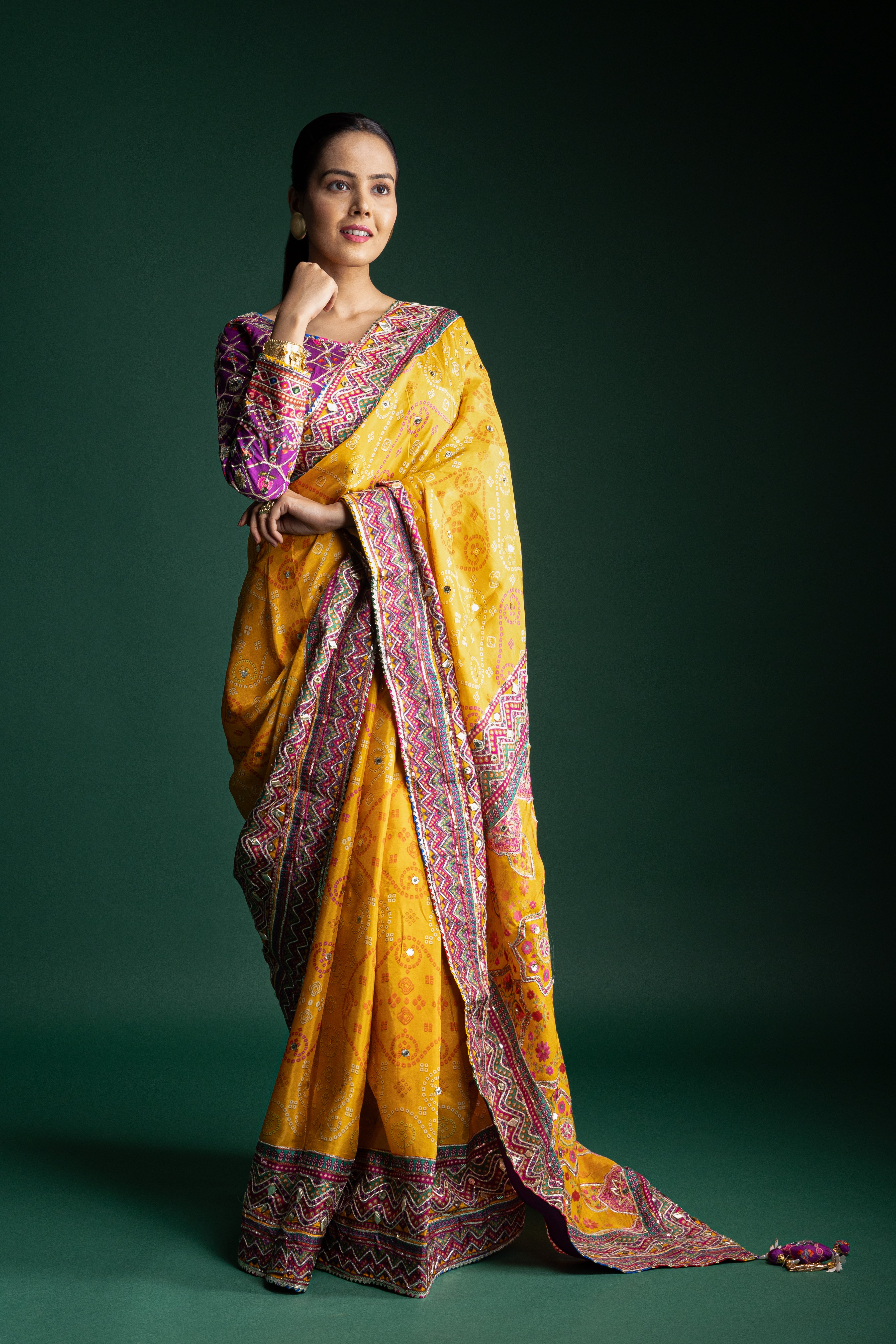 A luxurious saffron-toned silk saree enriched with intricate embroidery and a plum jewel-toned blouse, radiating elegance and grandeur for high-end celebratory events.