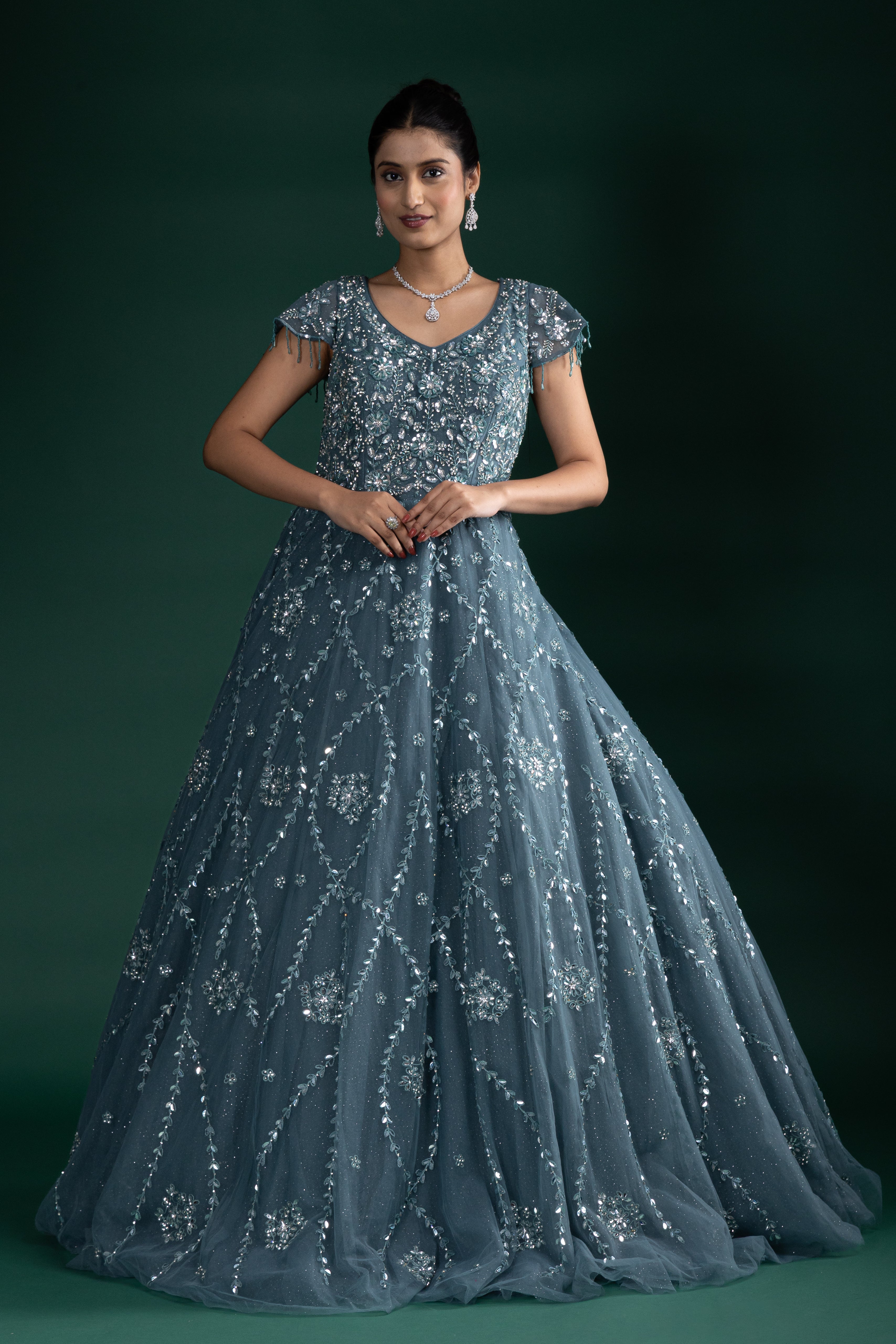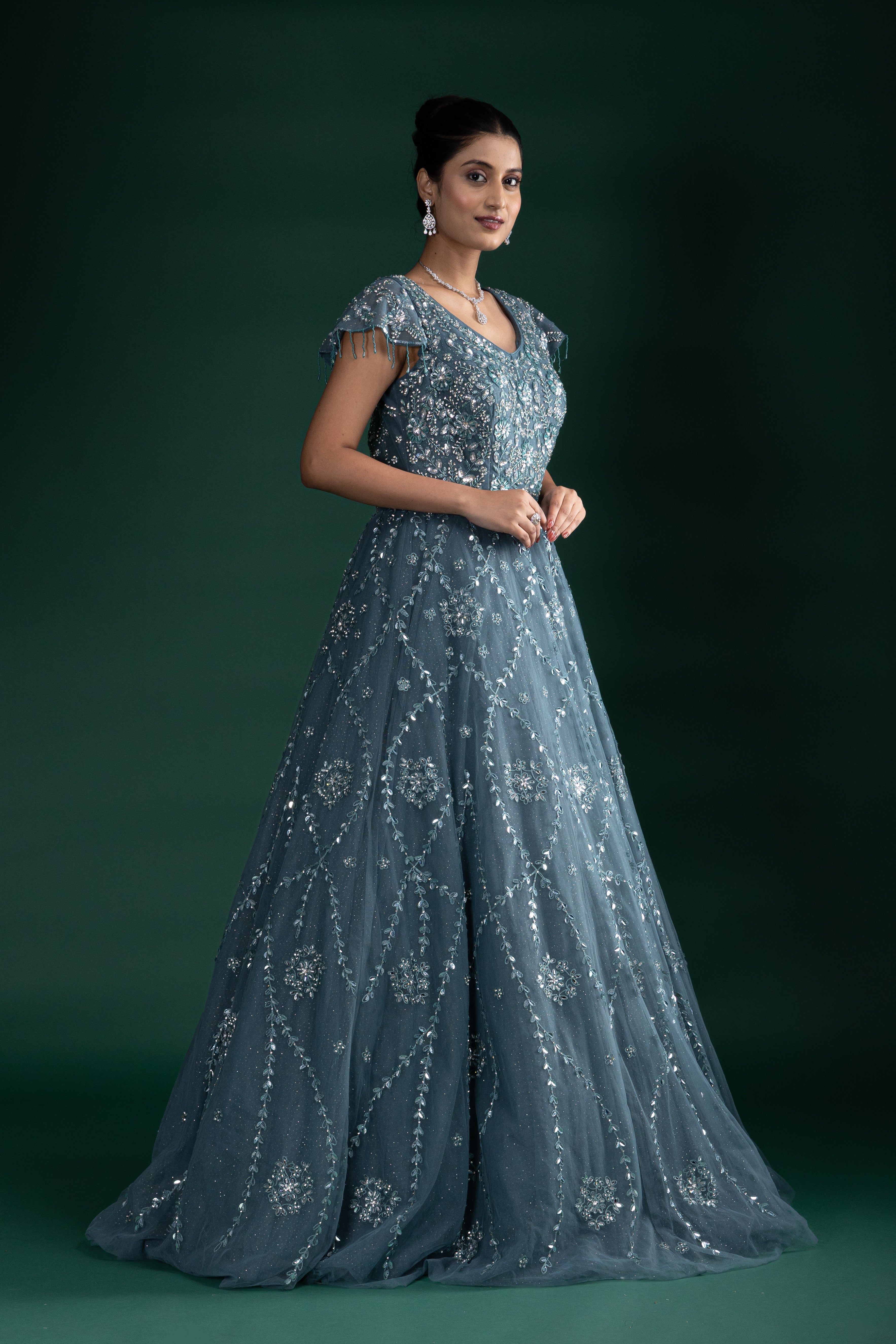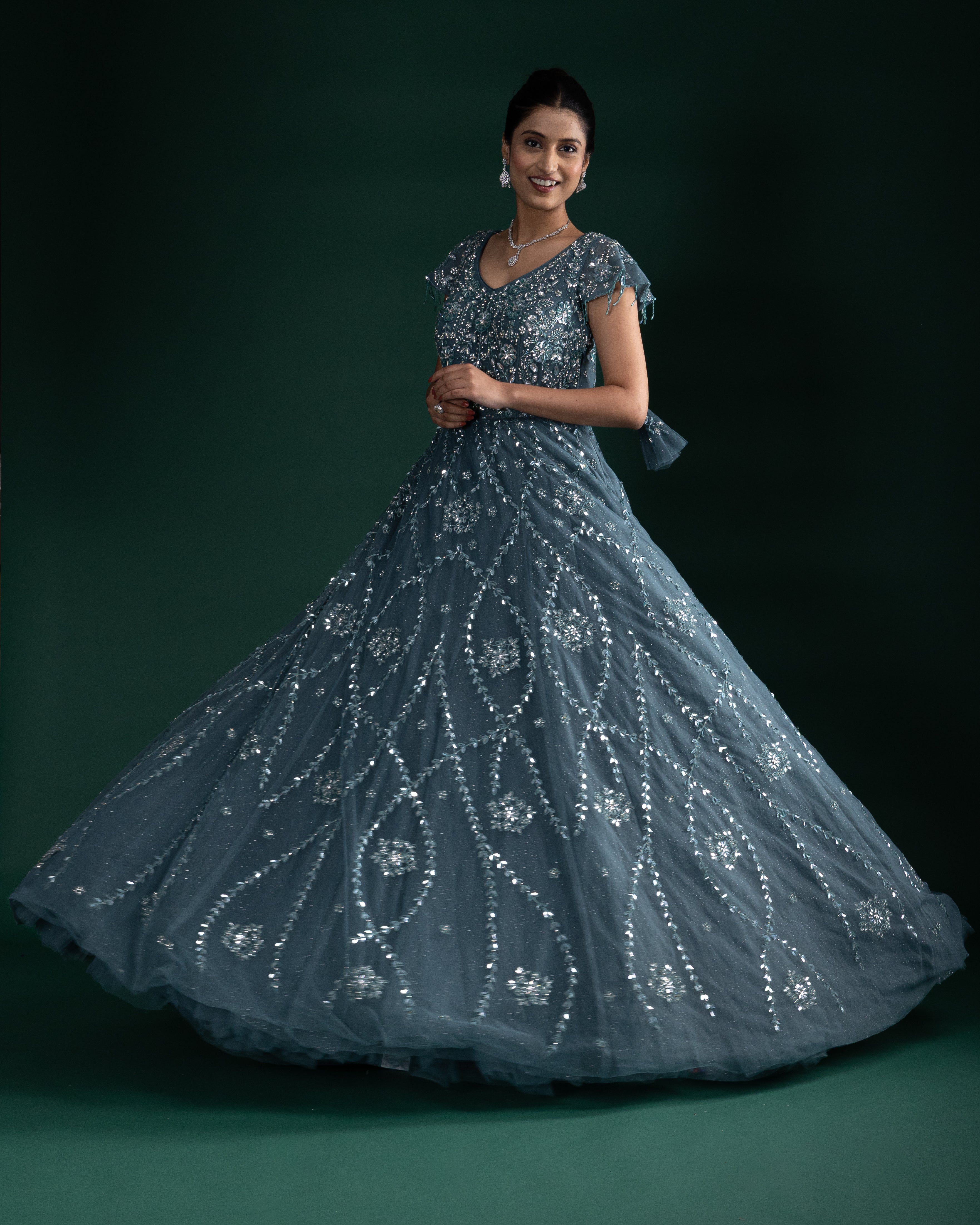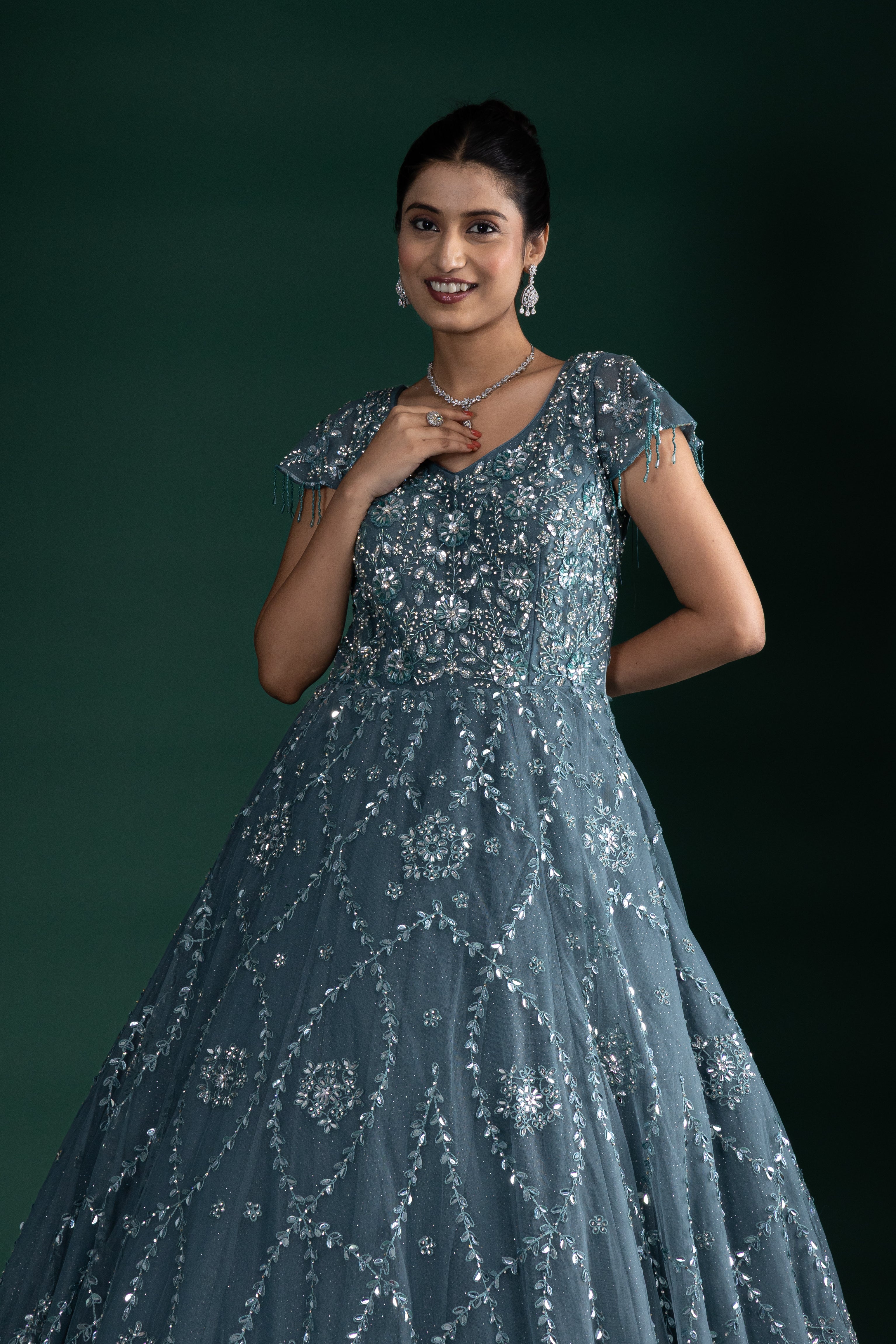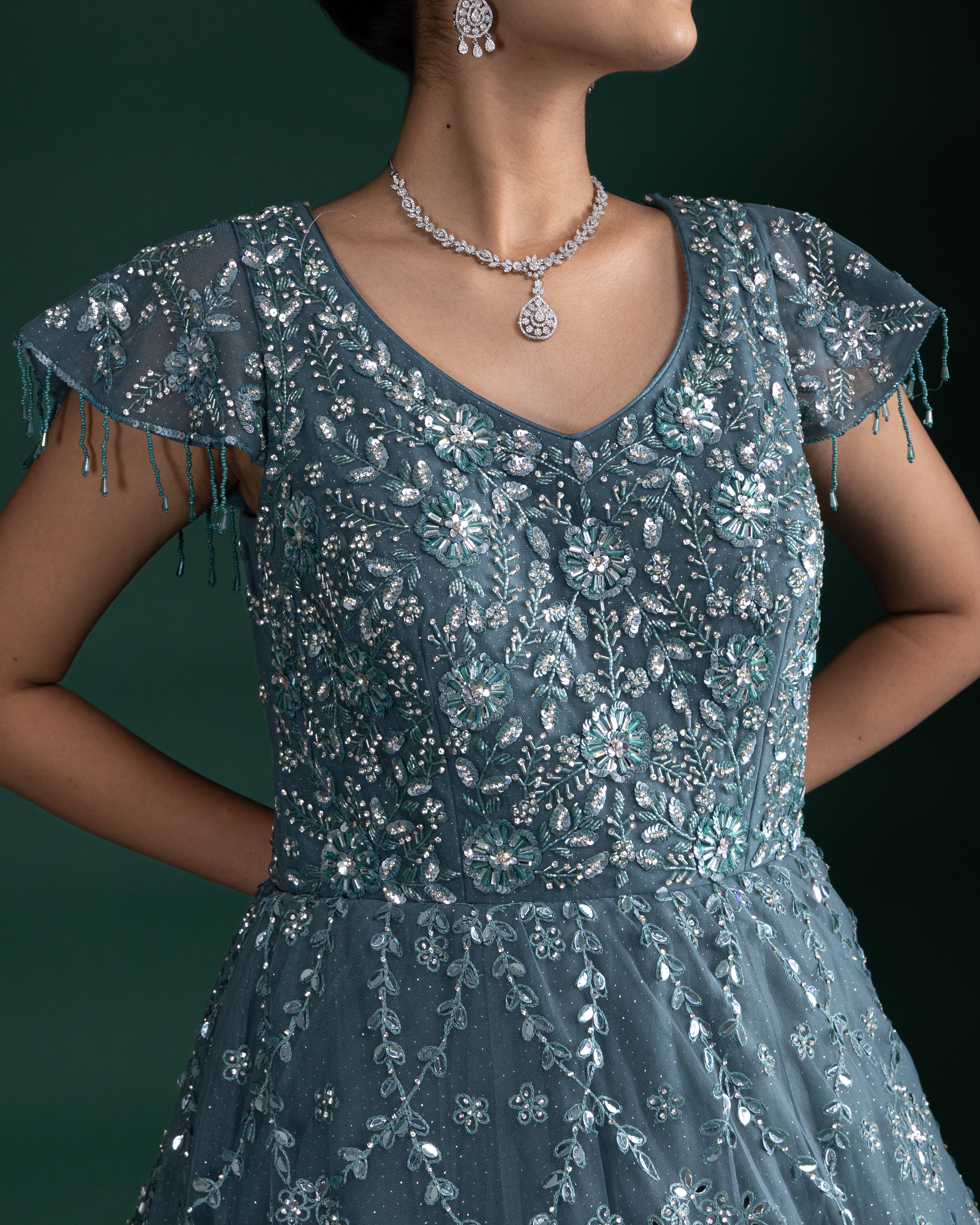 Dusty Teal Sequin Embroidered Gown