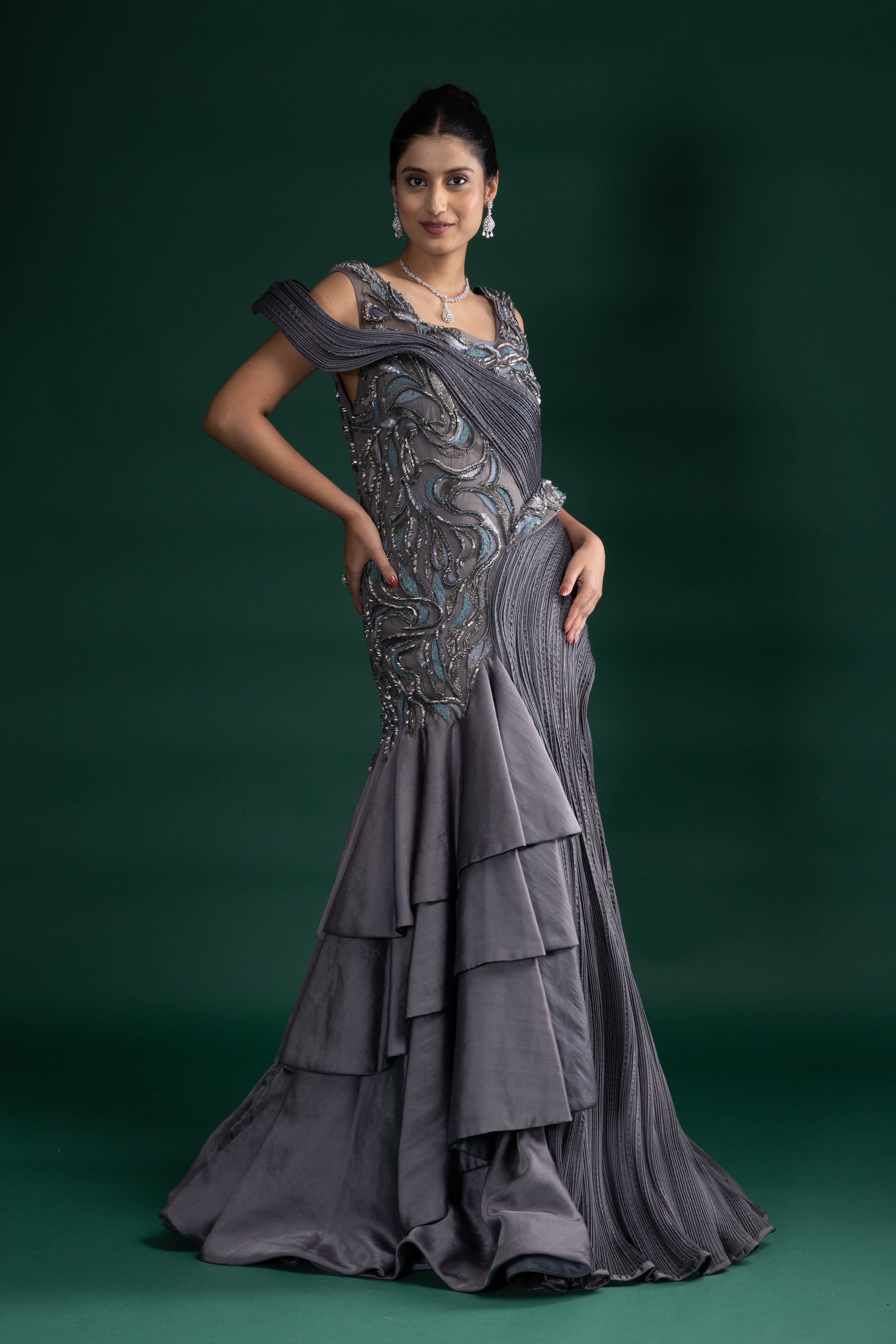 Step into the spotlight with this Smoky Metallic Grey designer gown, featuring architectural draped pleats, intricate sequin embroidery, and statement textures. Perfect for upscale cocktail and reception nights.