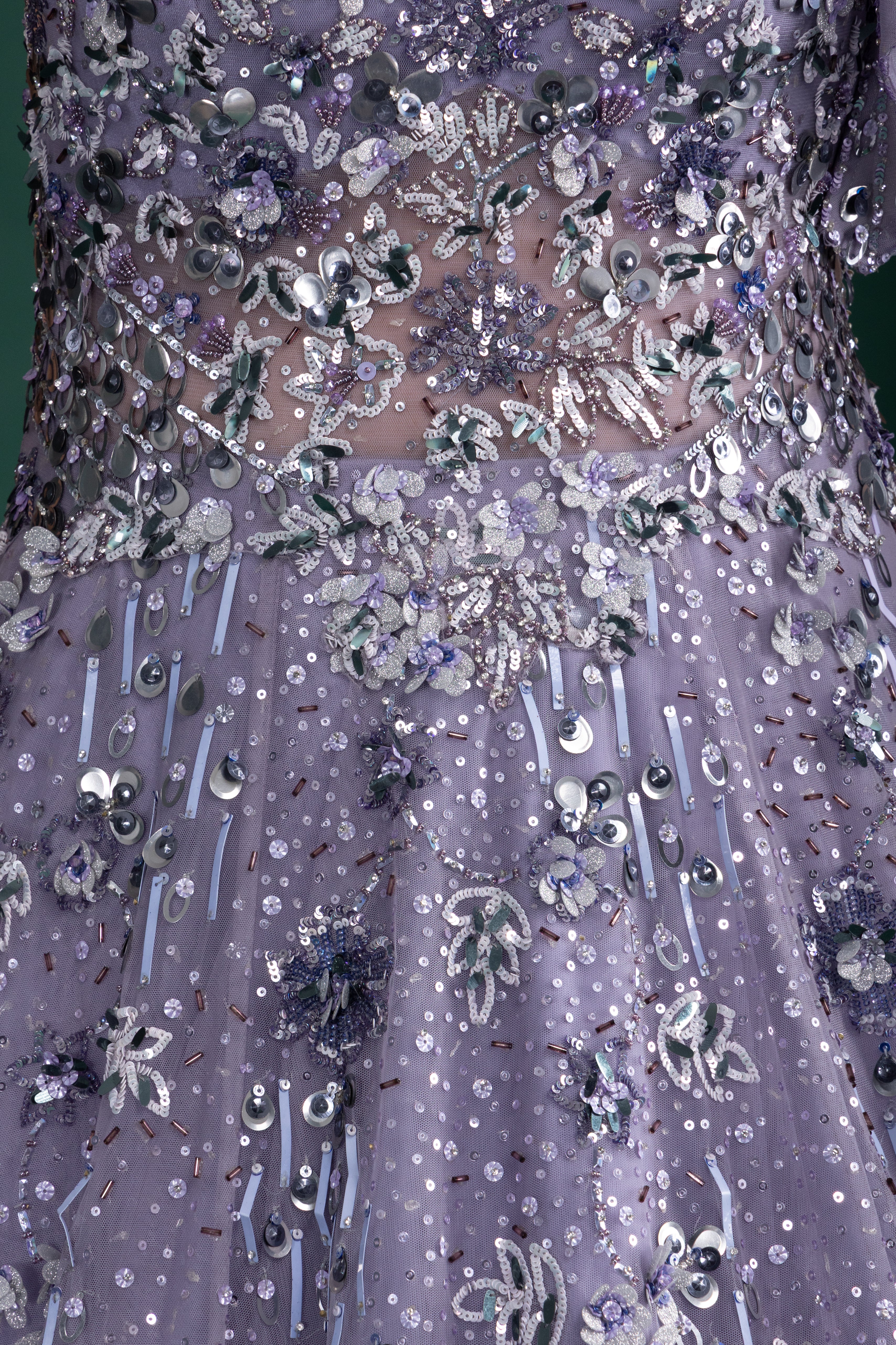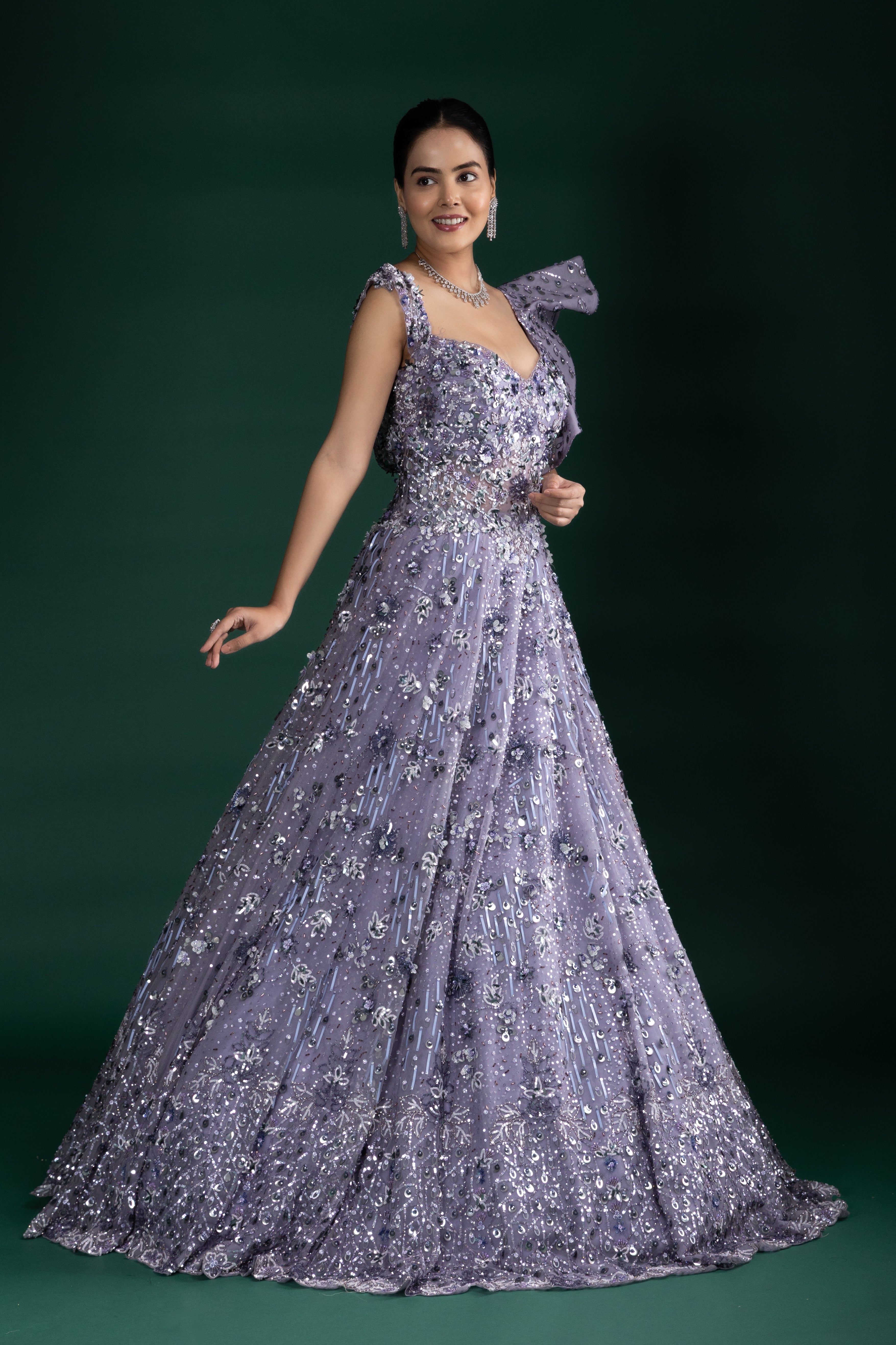 This lavender gown dazzles with dense sequin work, crystal embellishments, and an asymmetric statement shoulder ruffle. Its structured fit-and-flare design enhances modern feminine grace.