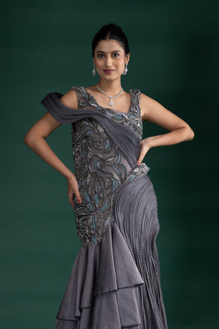 Ice Blue Crystal Embellished Gown With Draped Net Layers