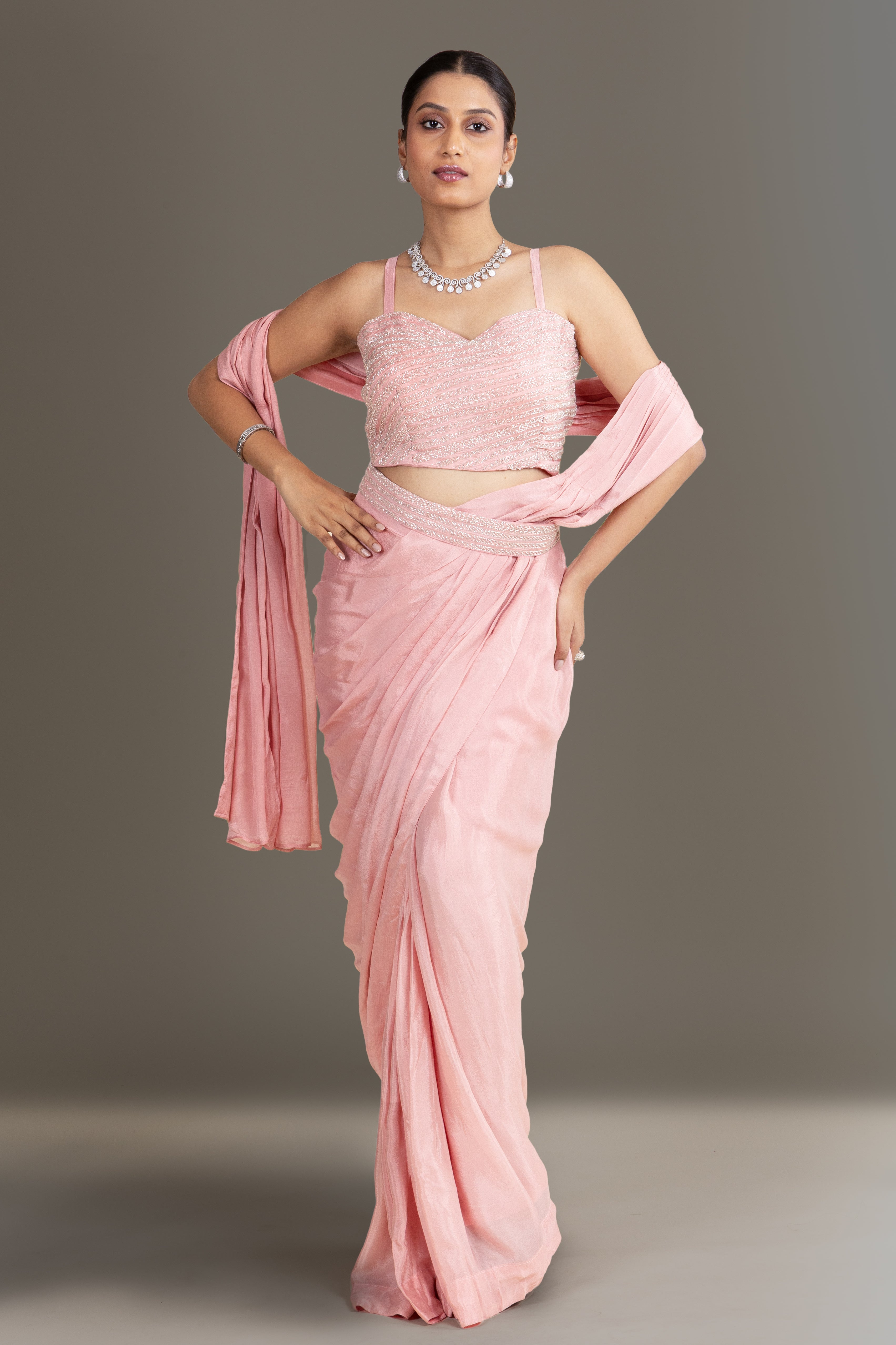 Exude soft elegance in this blush pink pre-draped saree, featuring a delicately beaded bustier blouse, ideal for understated yet luxurious ethnic ensembles.