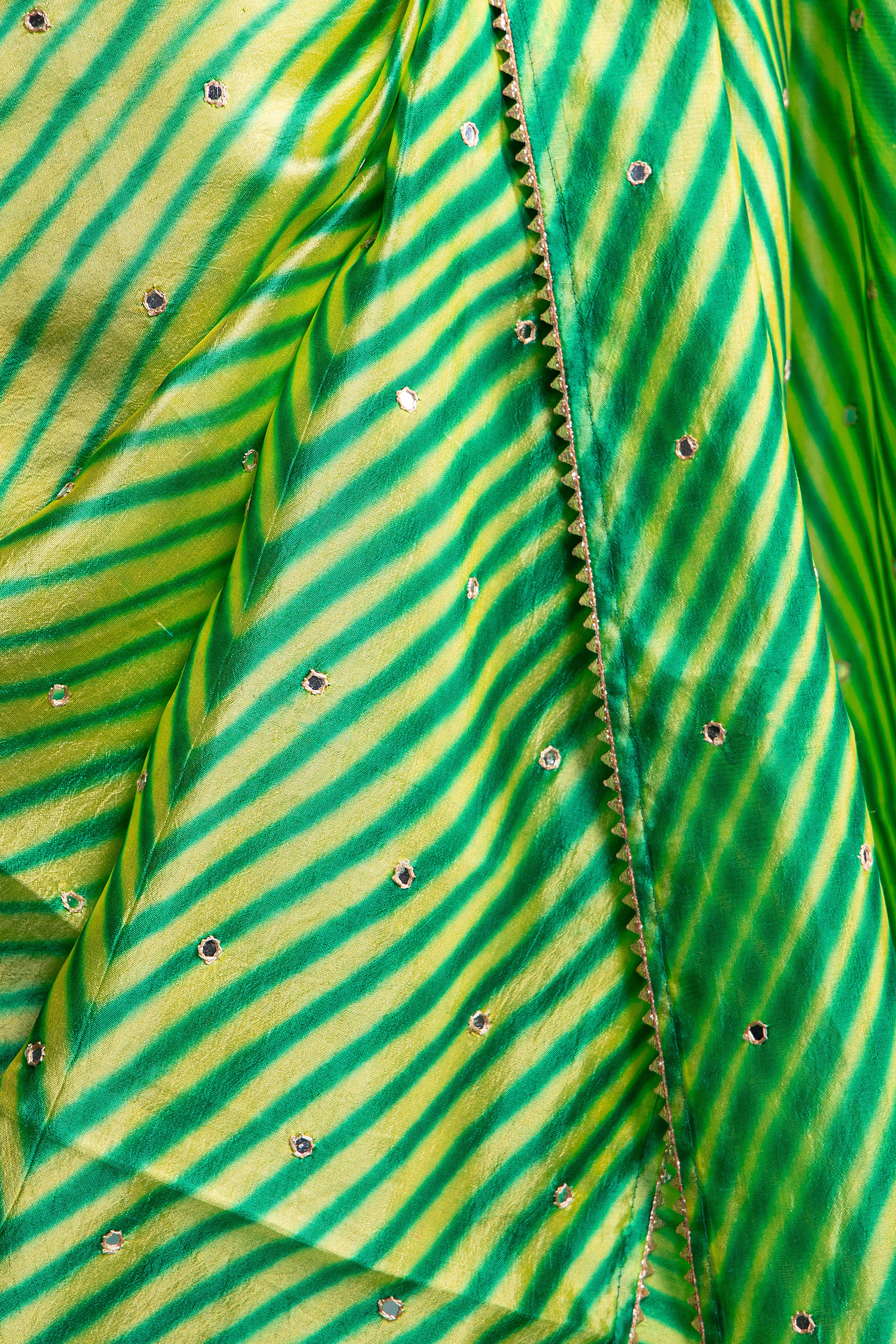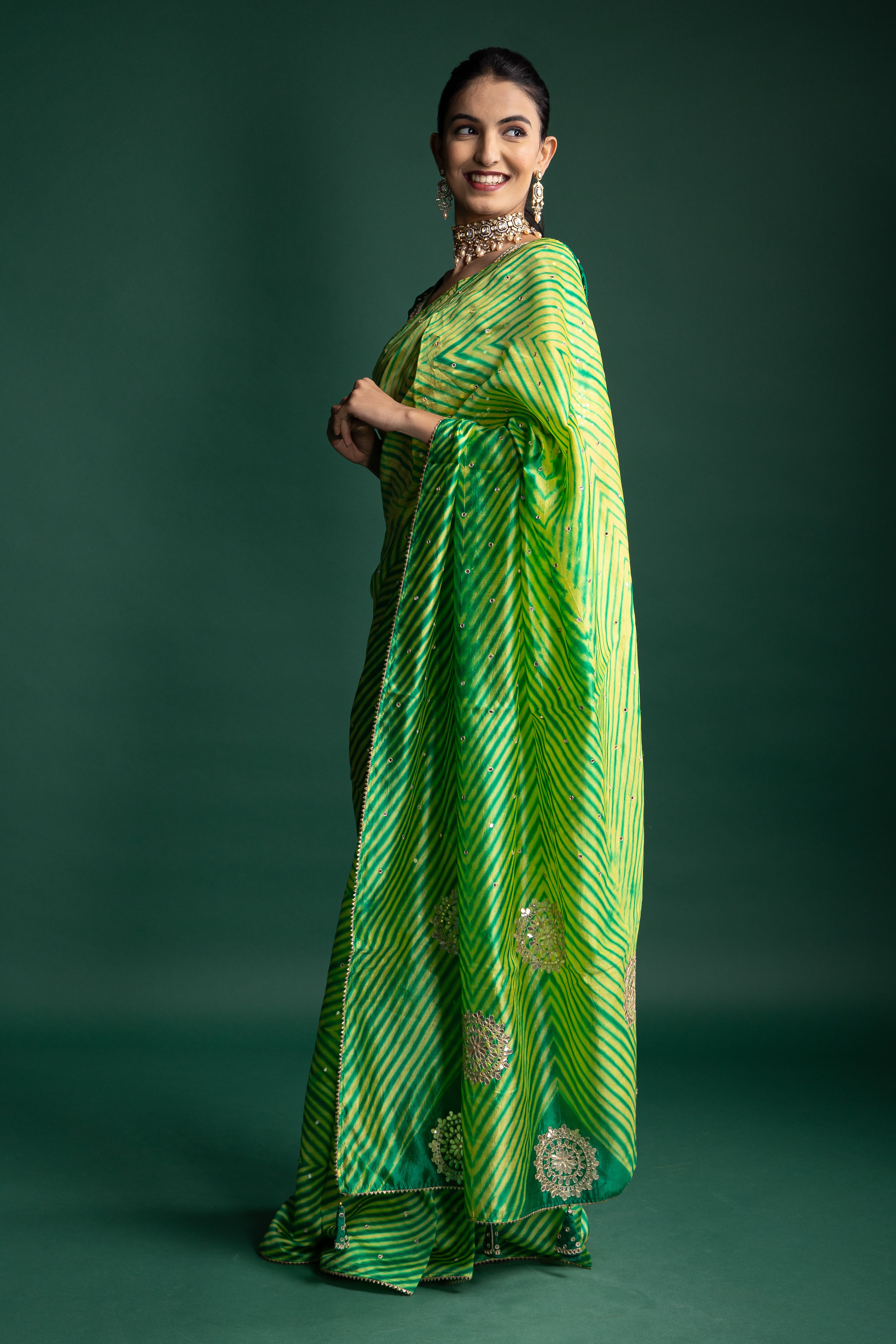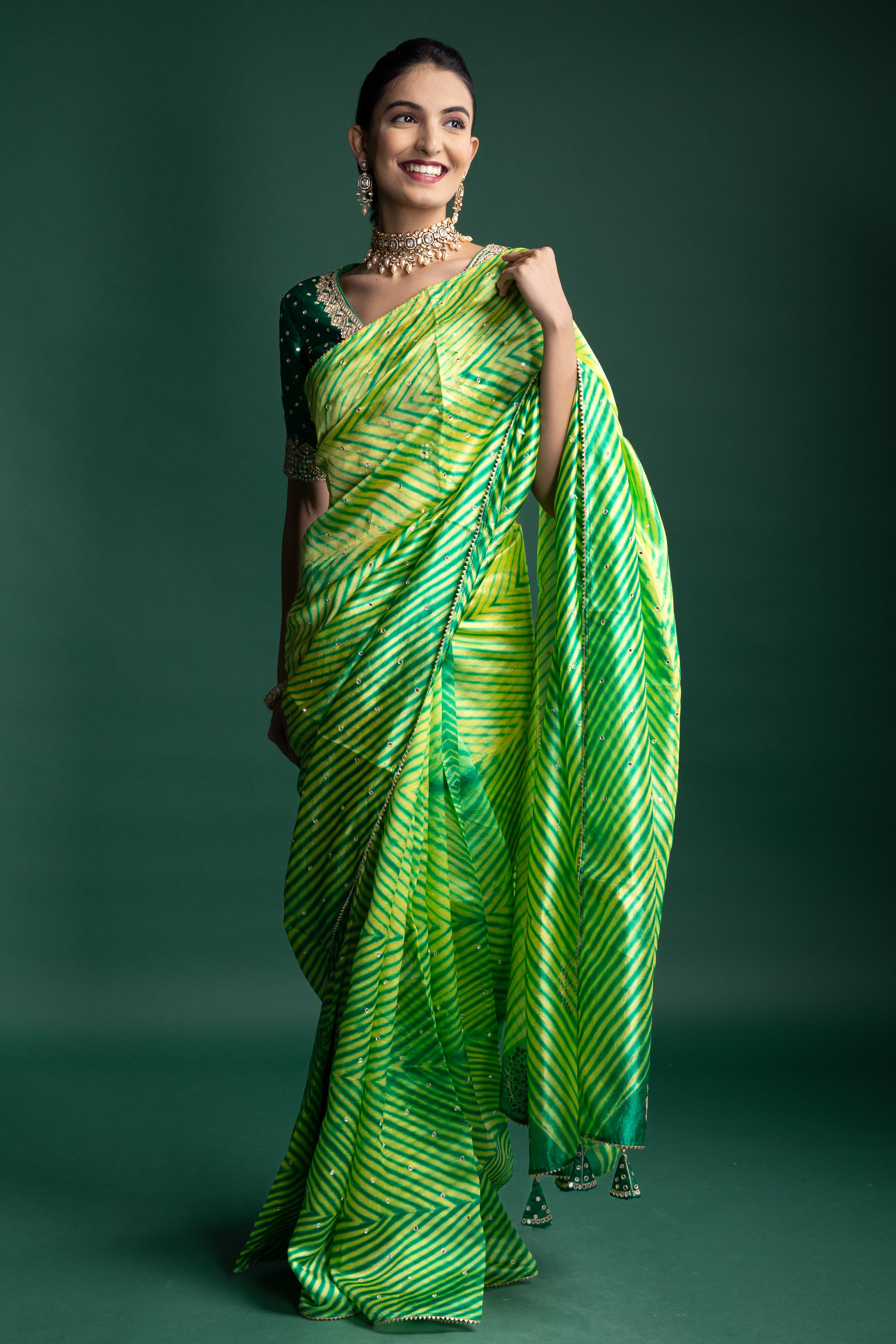 This lime fusion saree showcases a modern bandhani-inspired pattern with delicate embellishments, creating a lively and elegant drape perfect for festive celebrations and high-energy traditional events.
