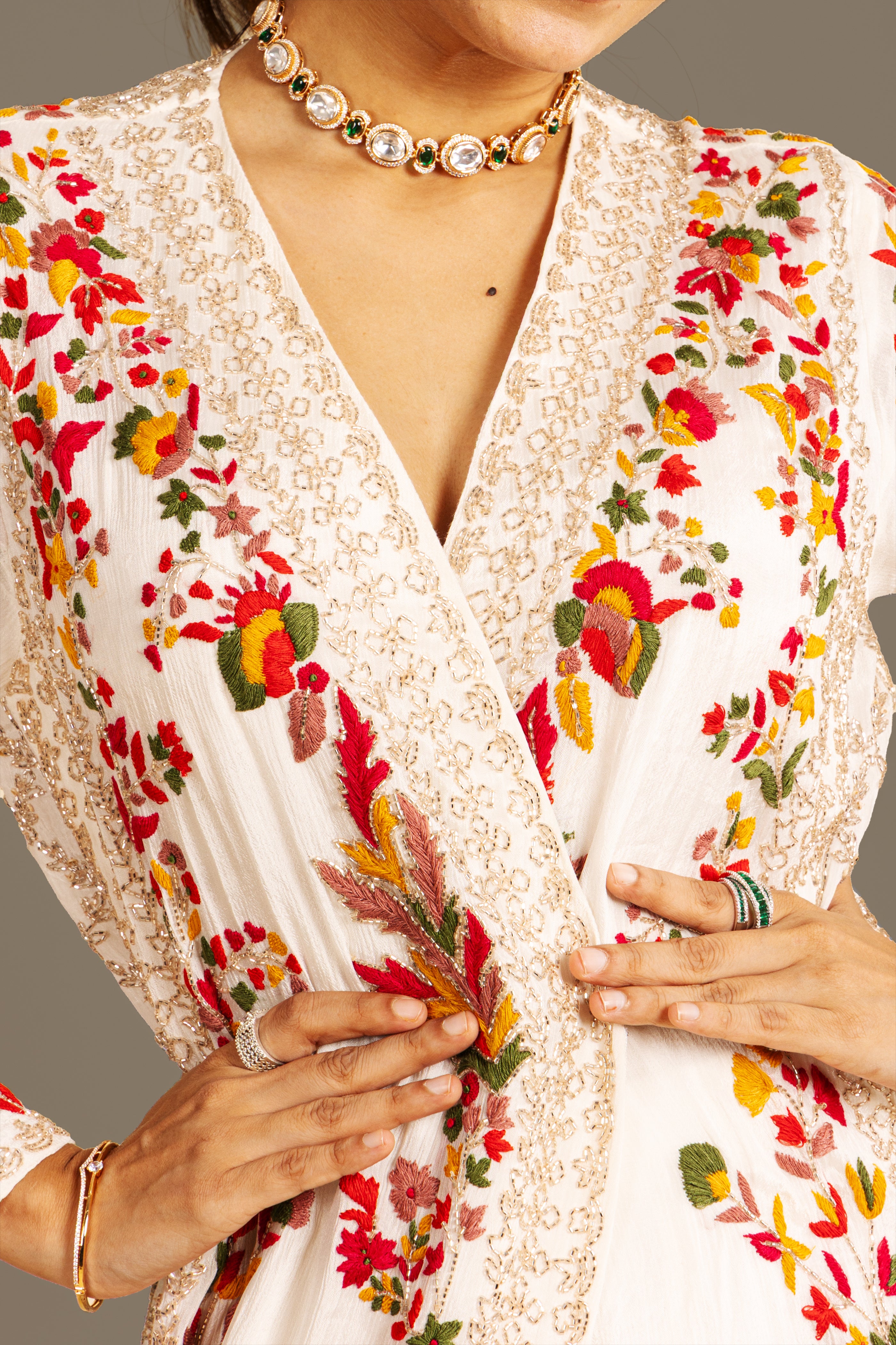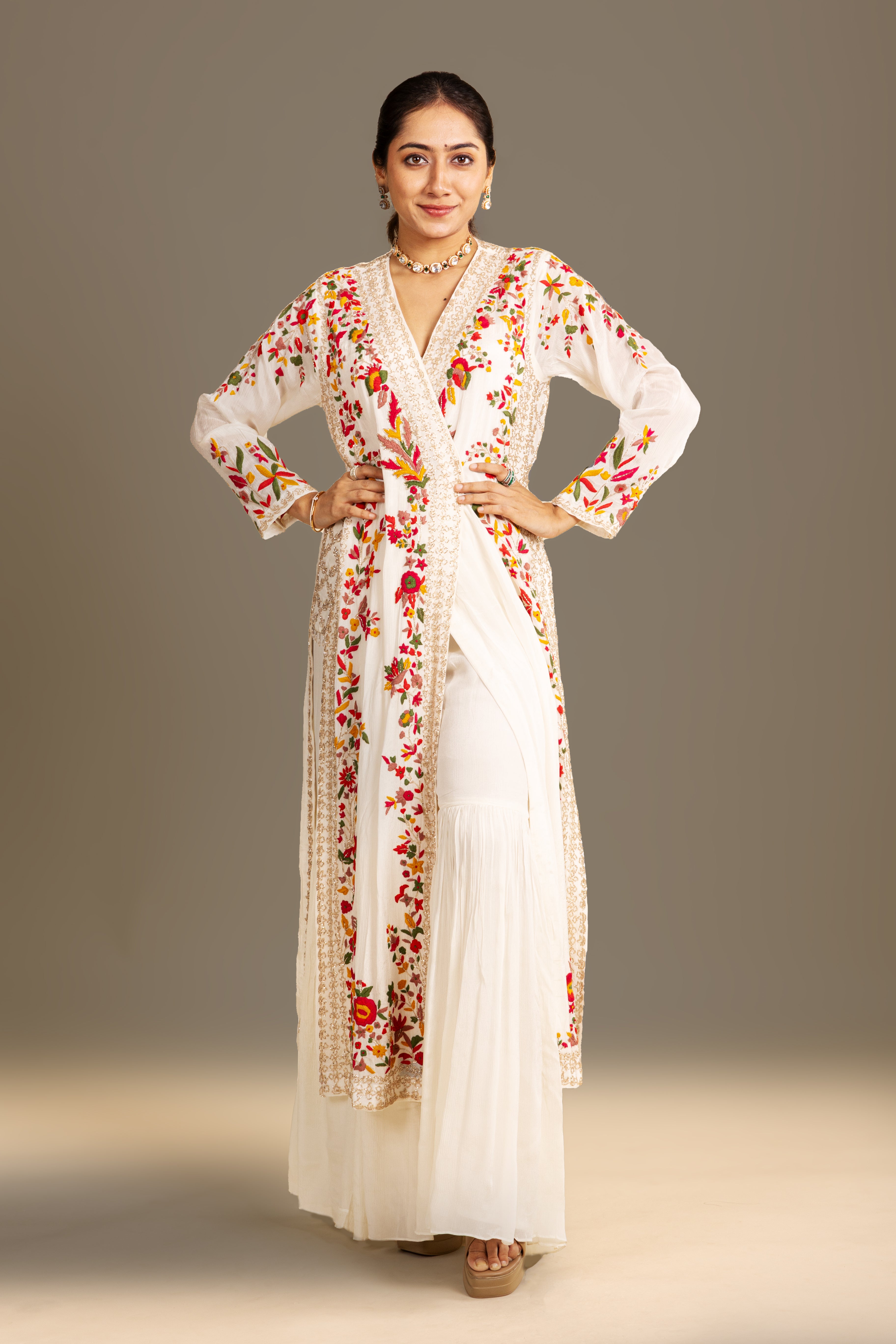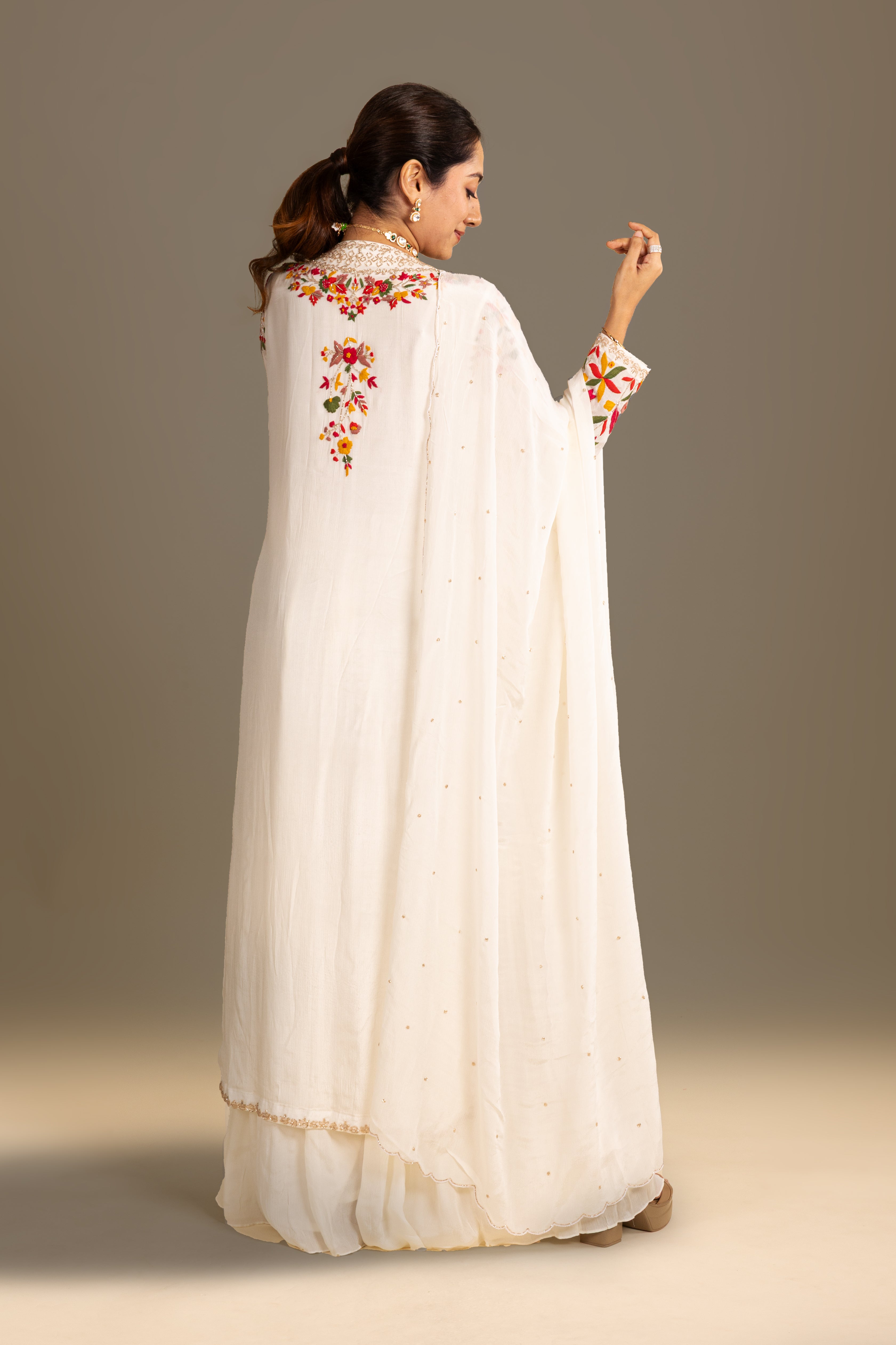 Ivory white Anarkali suit richly embroidered with multi-colored floral motifs, radiating grace and sophistication for special gatherings.