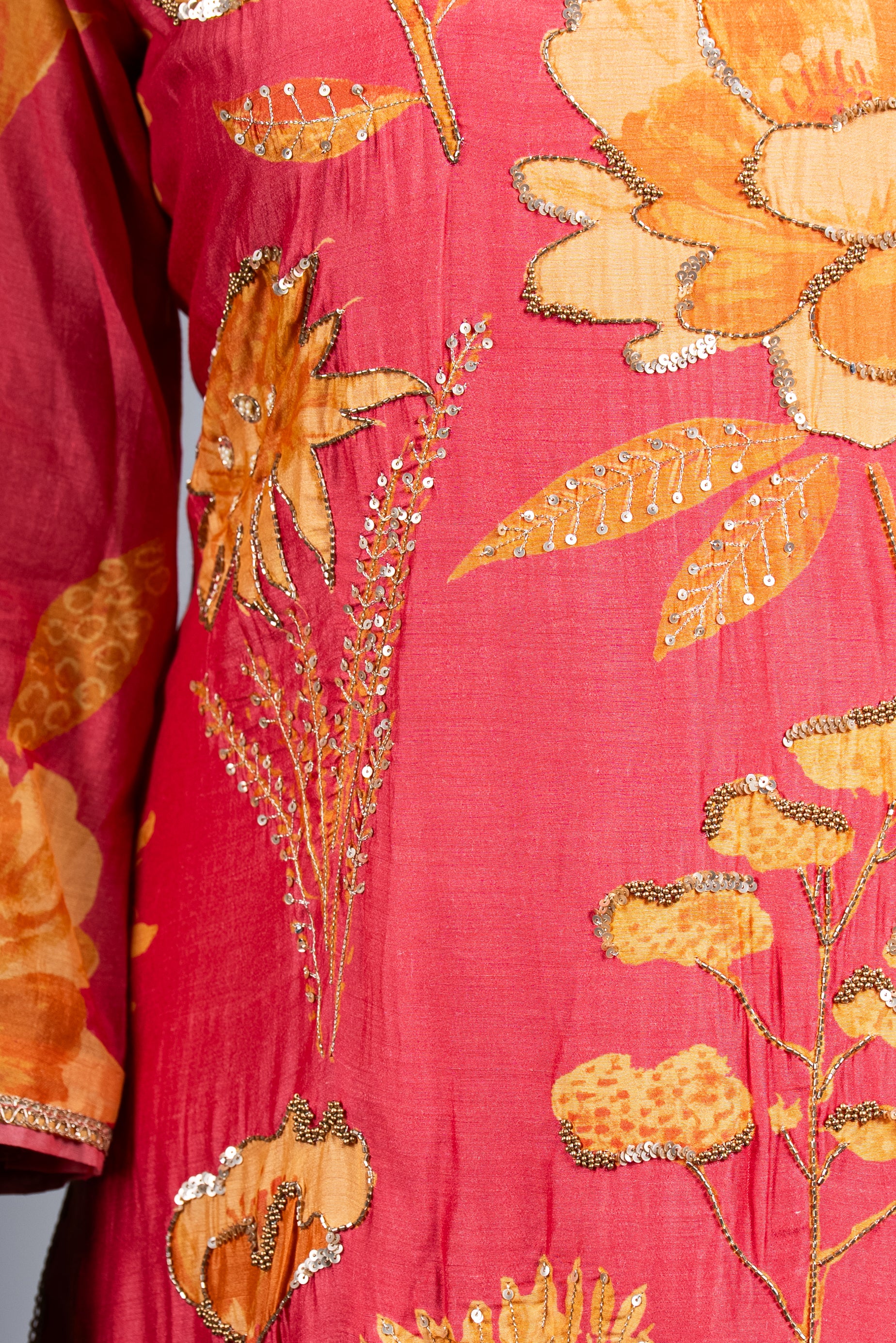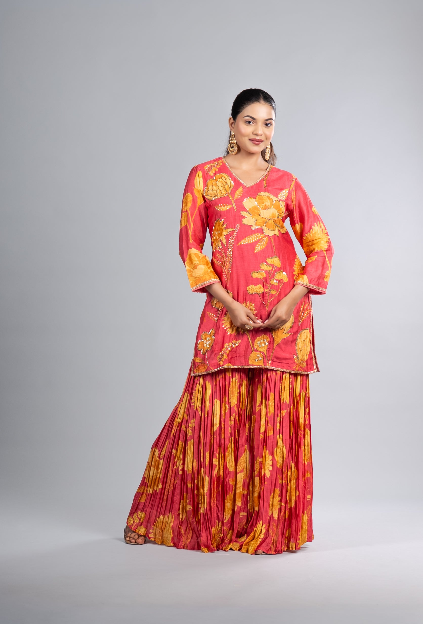 A radiant rose pink sharara set highlighted with golden marigold floral motifs and delicate embellishments, offering elegance, vibrancy, and charm for festive gatherings and timeless celebrations.