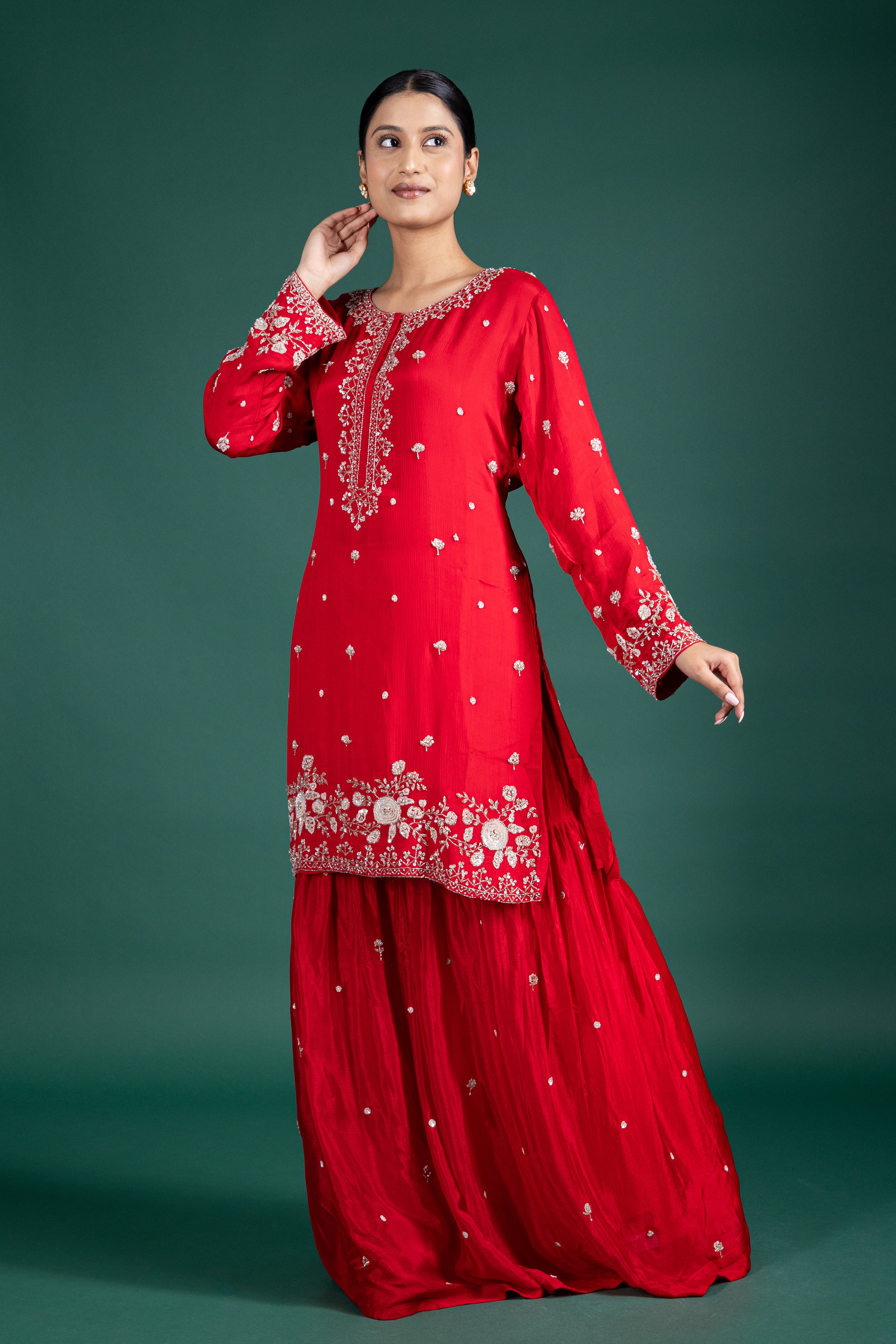 Scarlet Red Sharara with Embroidered Silver Detailing