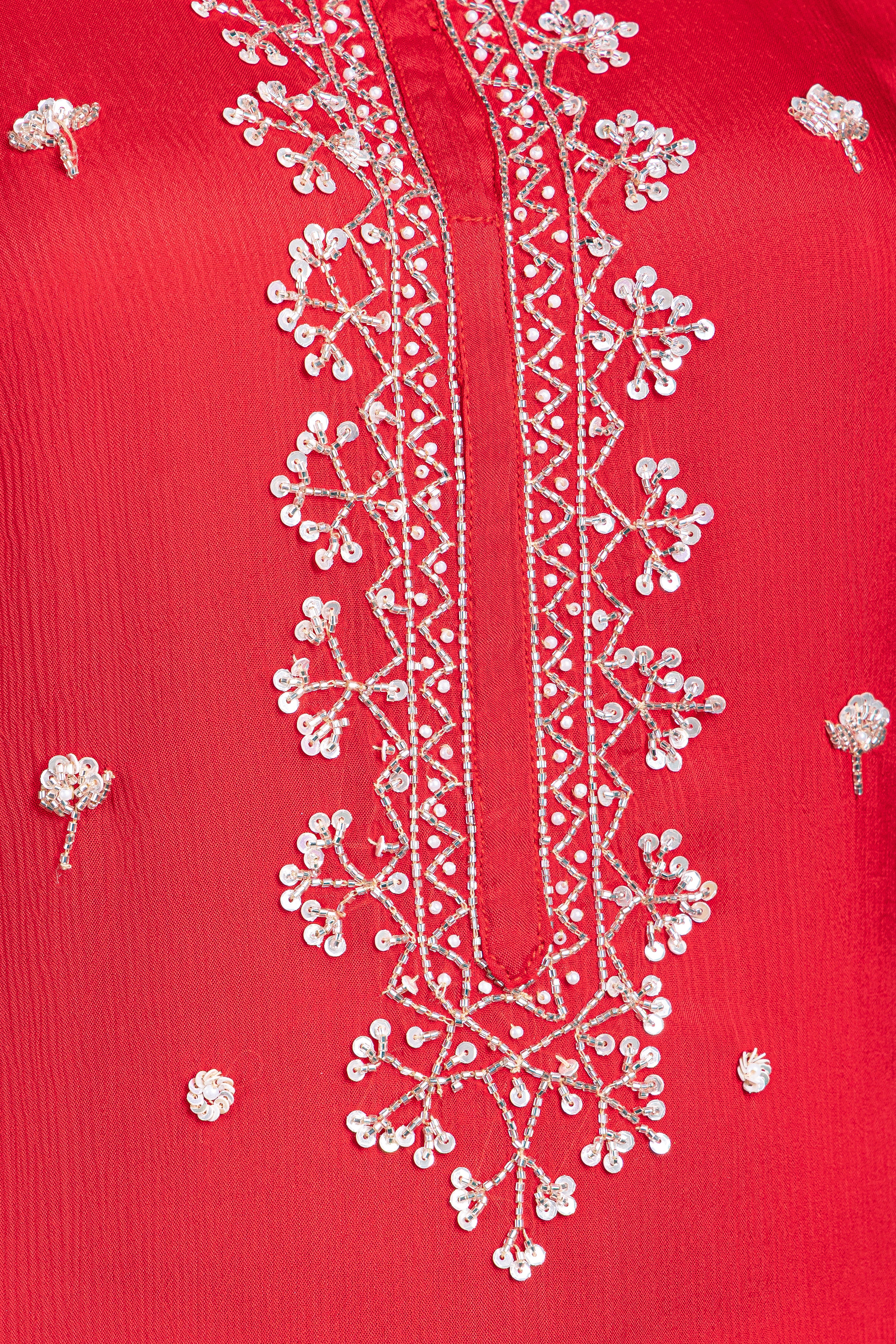 In a bold scarlet hue, this Sharara set showcases refined silver floral embroidery and scattered sequin accents—designed to exude festive luxury with a striking cultural identity.
