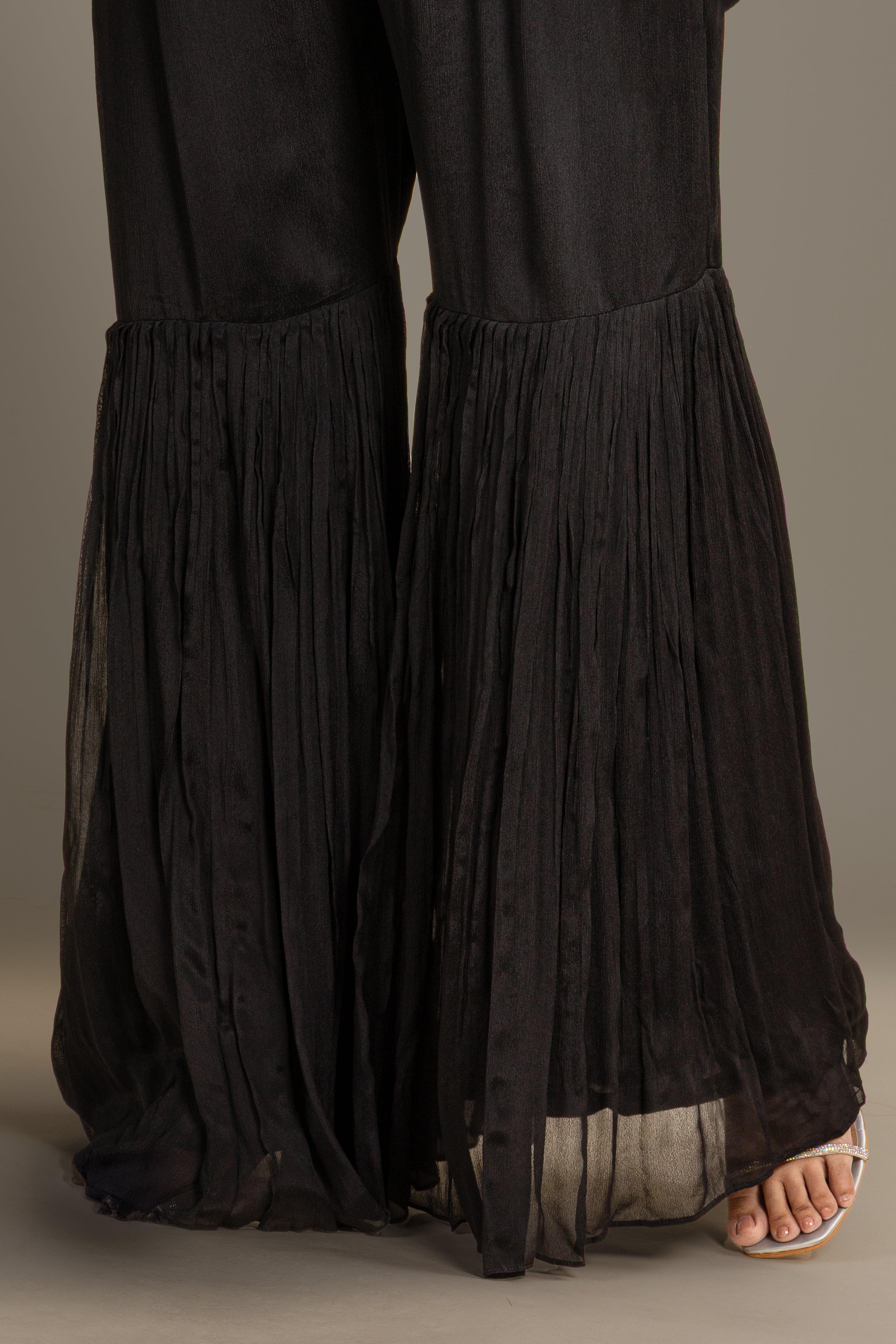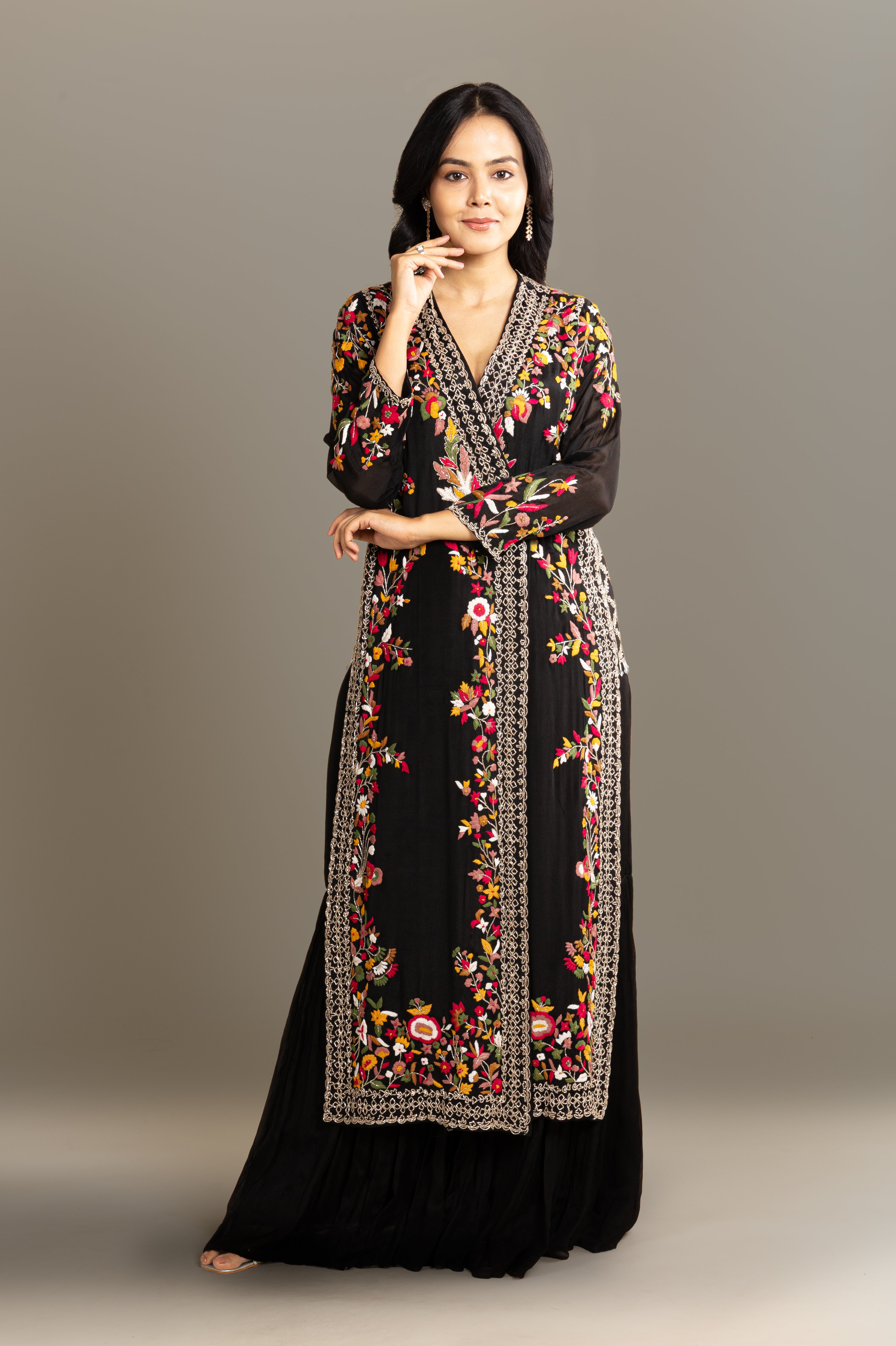 Deep Black Anarkali suit richly embroidered with multi-colored floral motifs, radiating grace and sophistication for special gatherings.
