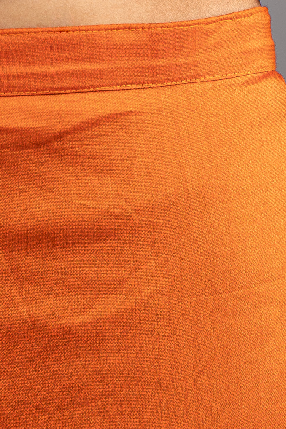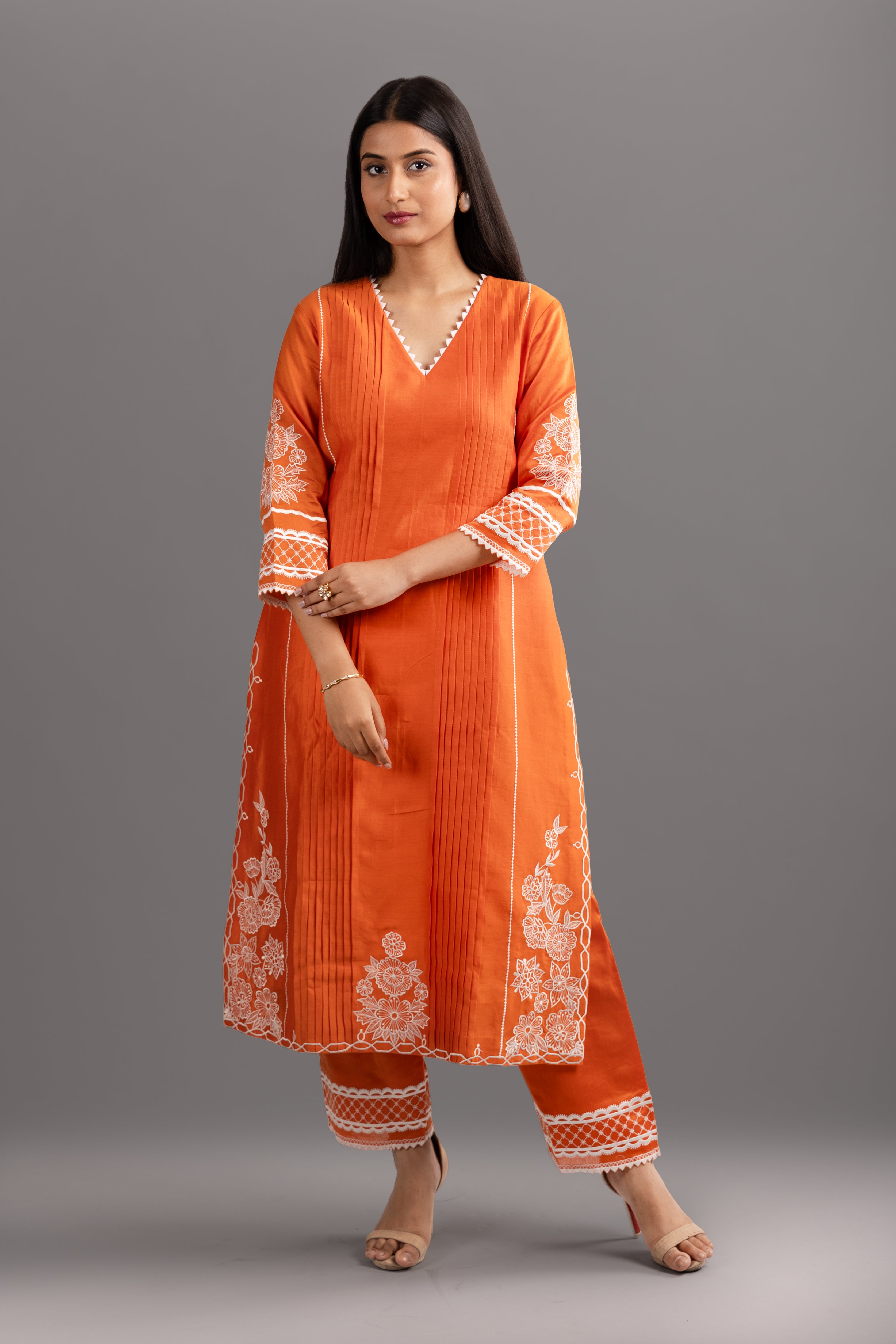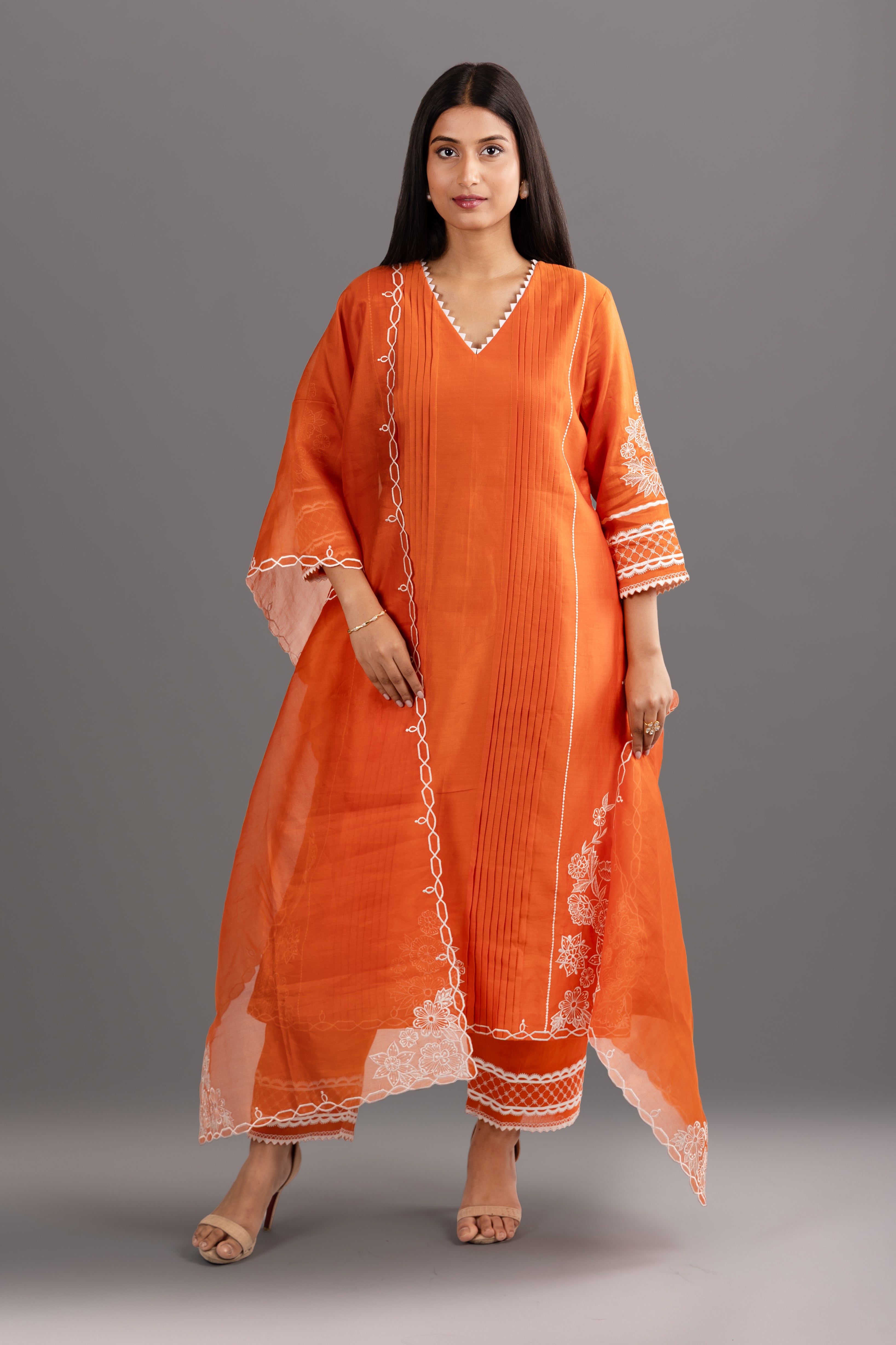 This vibrant orange kurta set showcases refined pintucks detailing, white floral embroidery on the sleeves and hem, and a sheer Dupatta—offering bright ethnic style with minimalist charm.
