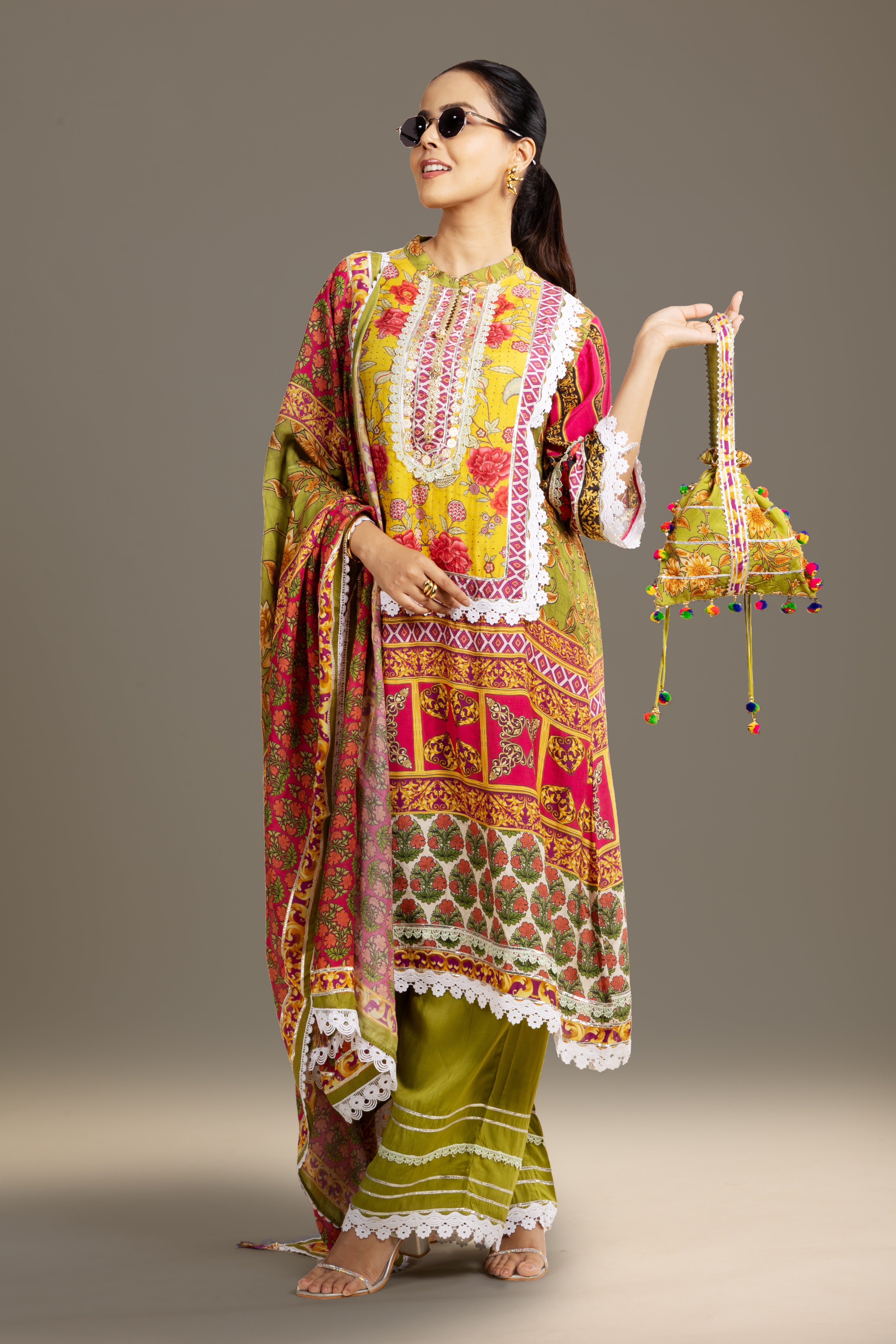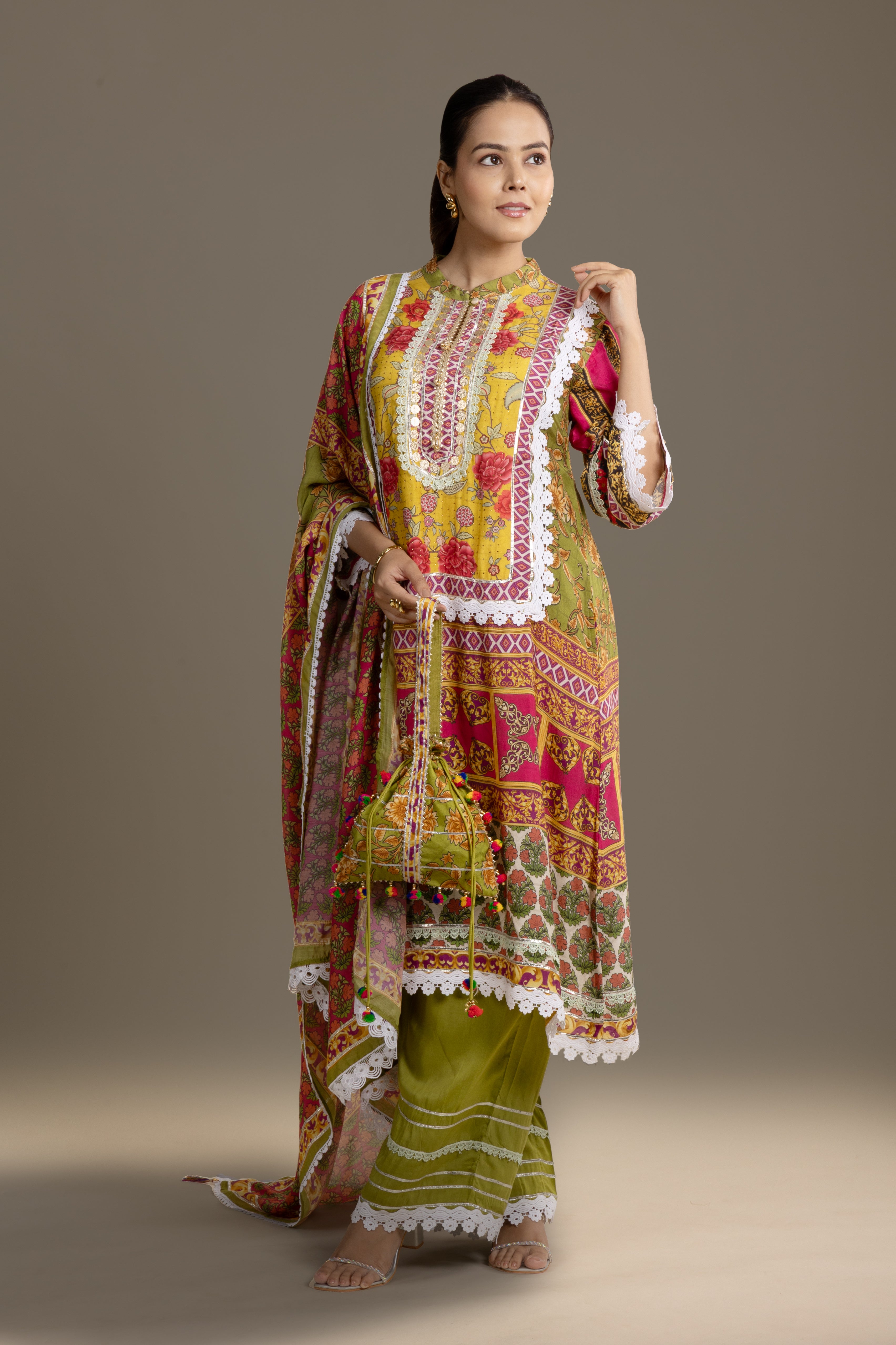 Charming Vintage Blossom Mosaic Kurta Set with Intricate Lace Accents