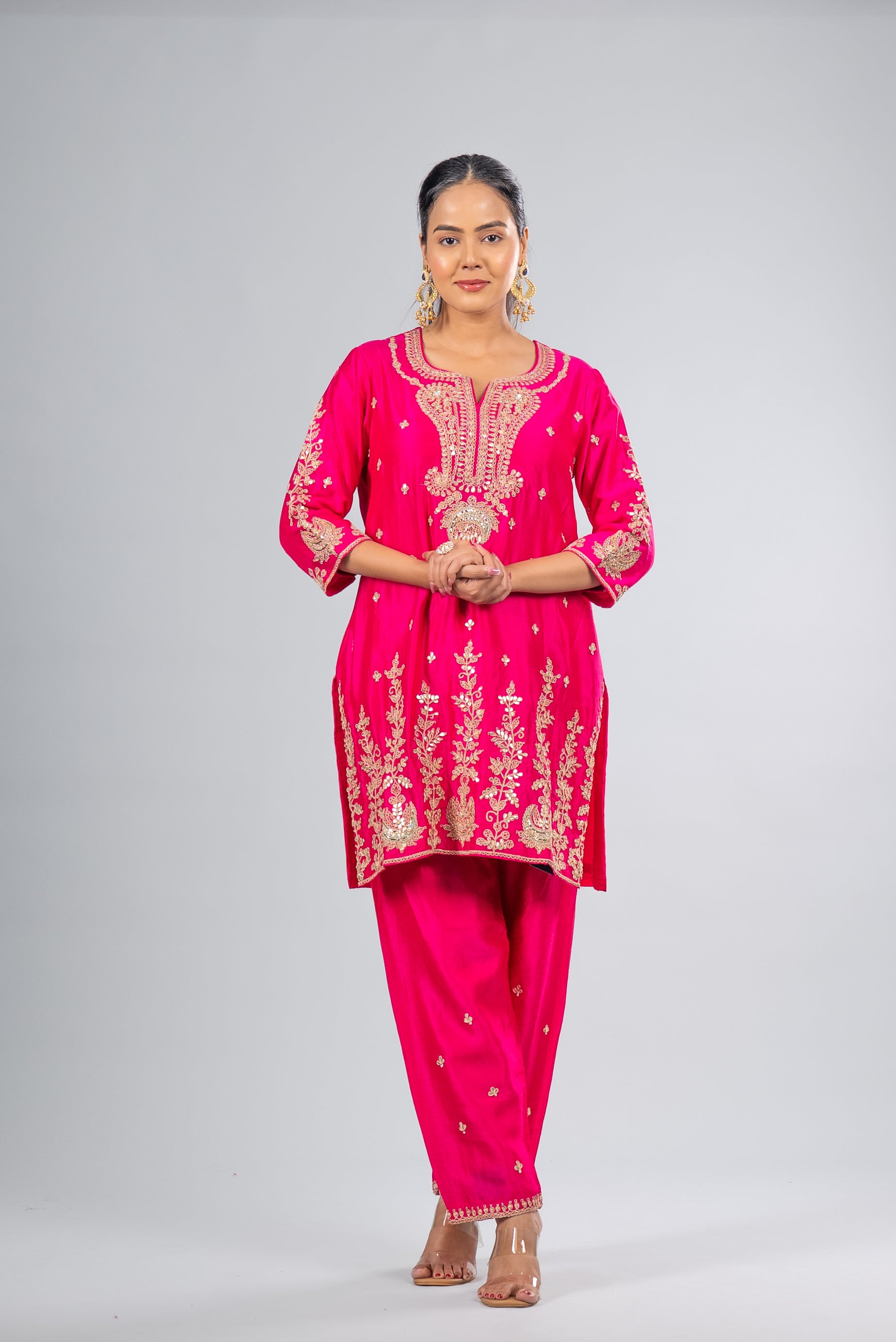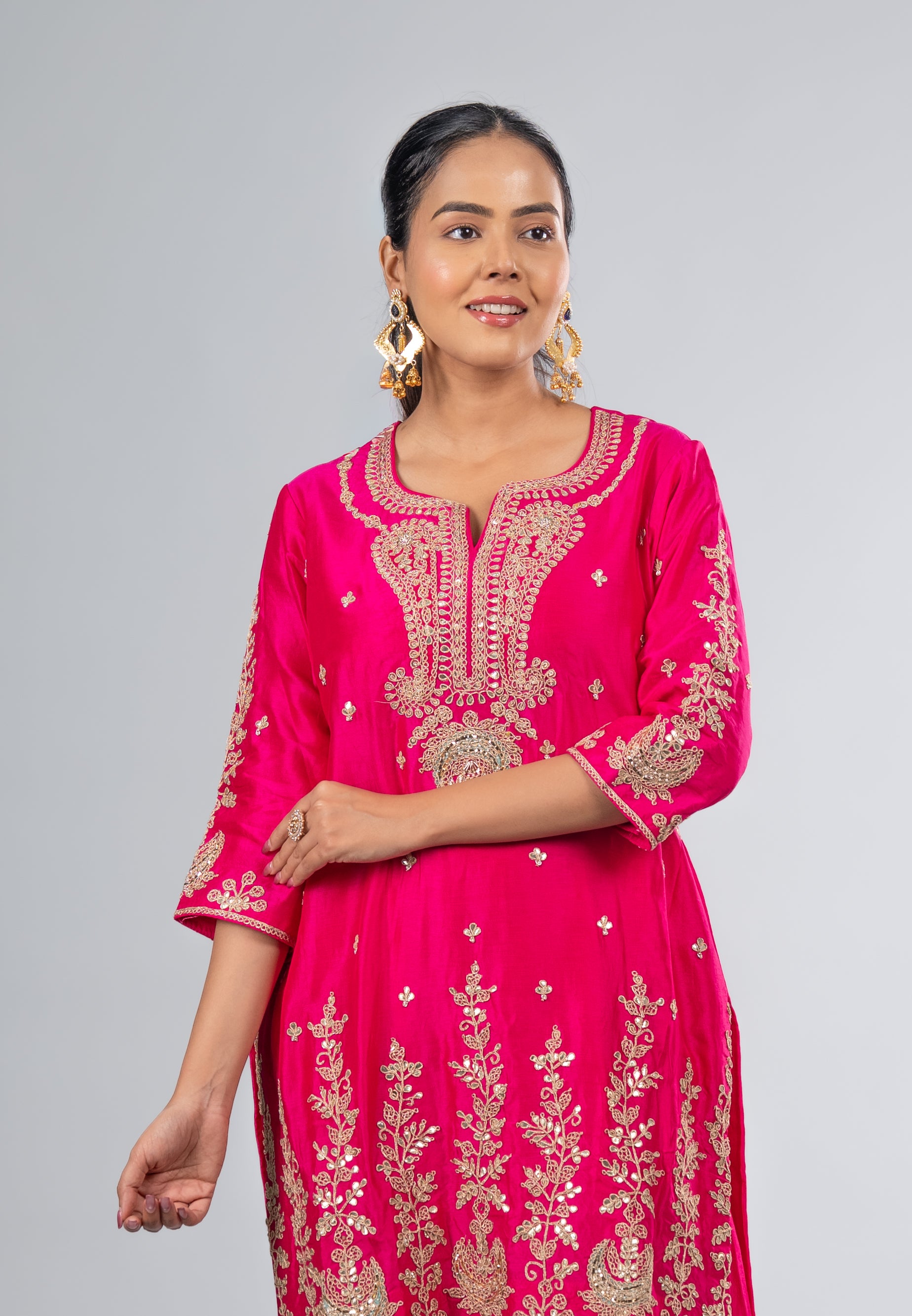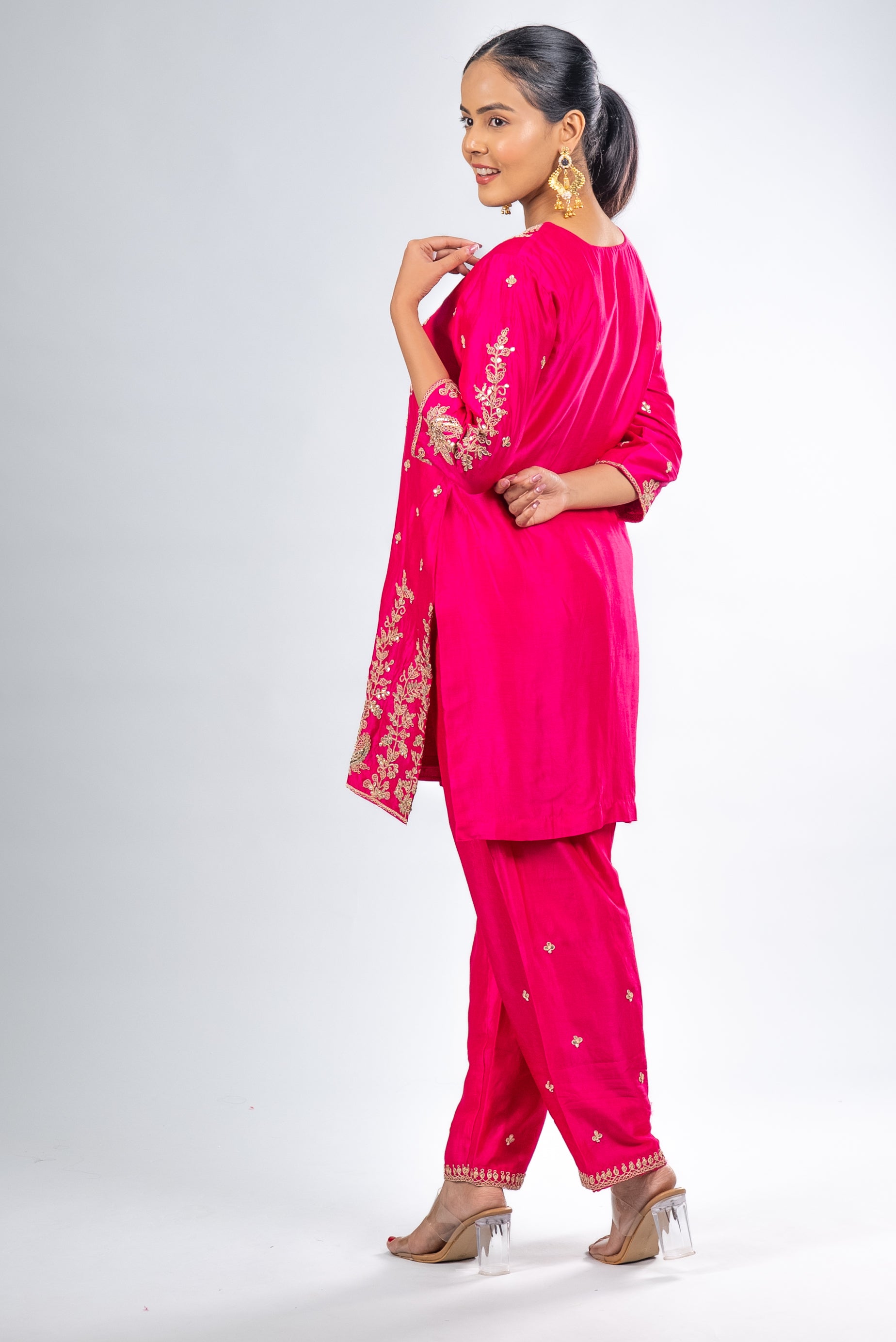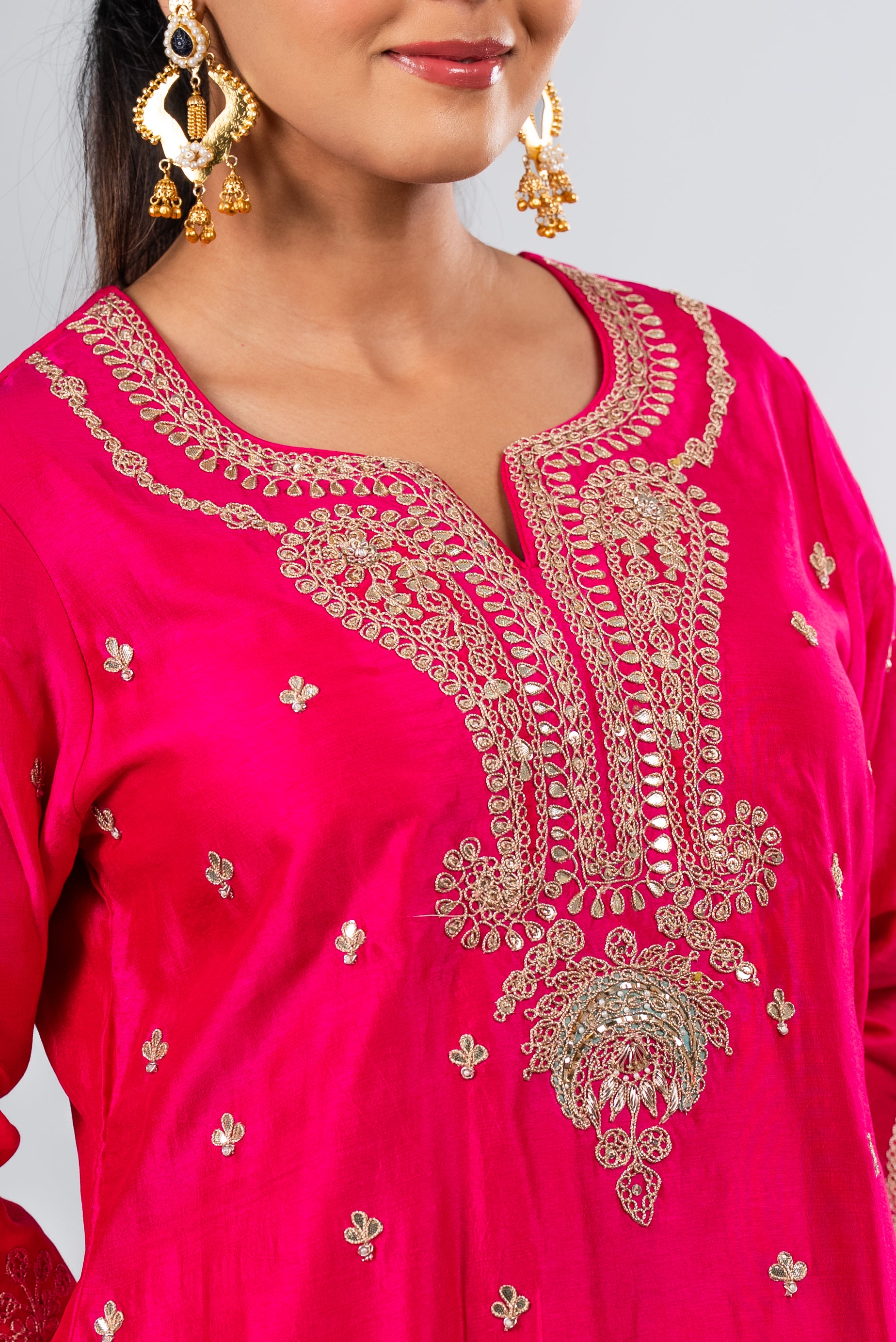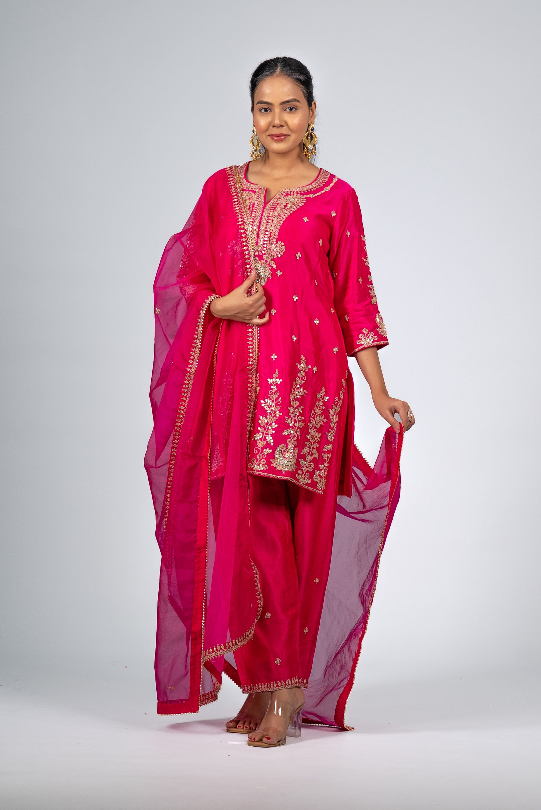 This fuchsia pink kurta set dazzles with intricate golden embroidery and a sheer dupatta, blending elegance and festive charm for weddings, celebrations, and high-society gatherings