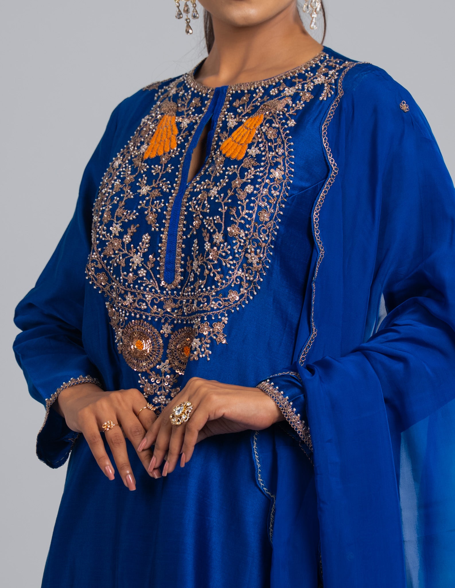 An elegant royal blue kurta set adorned with intricate Zari embroidery in gold and orange highlights. A perfect blend of traditional artistry and modern sophistication.