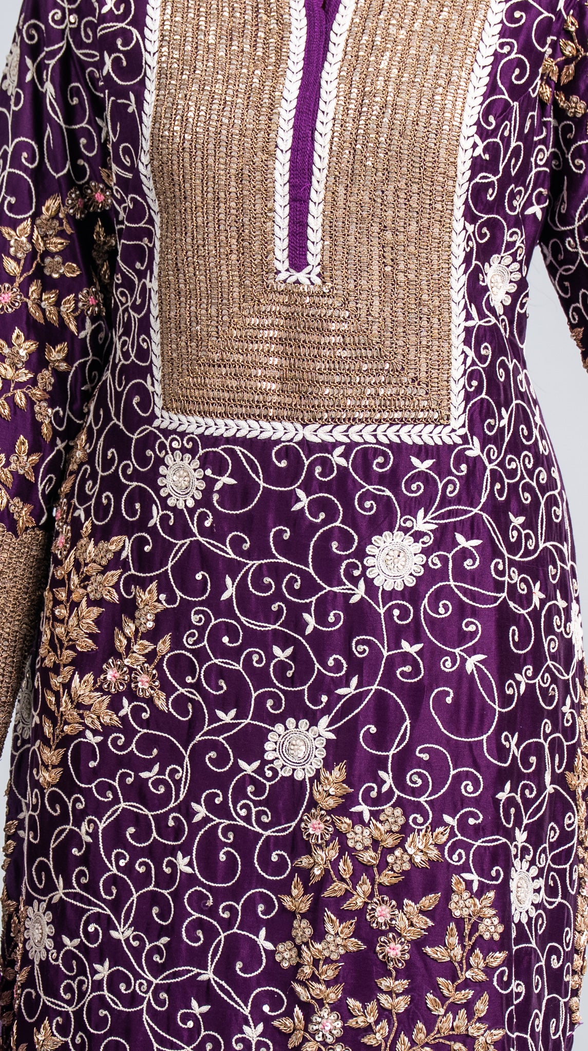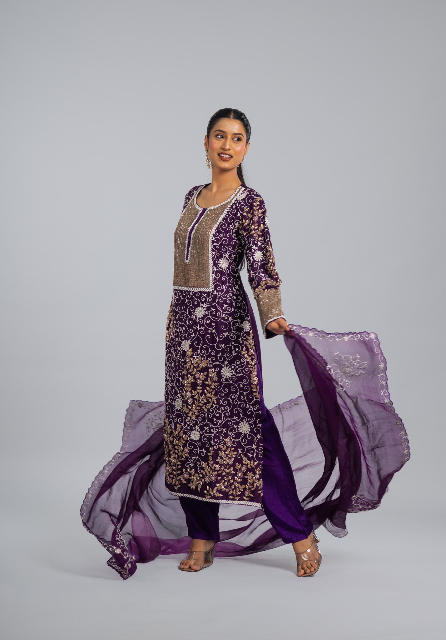 A rich royal purple straight kurta set featuring intricate embroidery with gold and silver threadwork. Paired with matching pants and a delicate organza dupatta for a timeless festive look