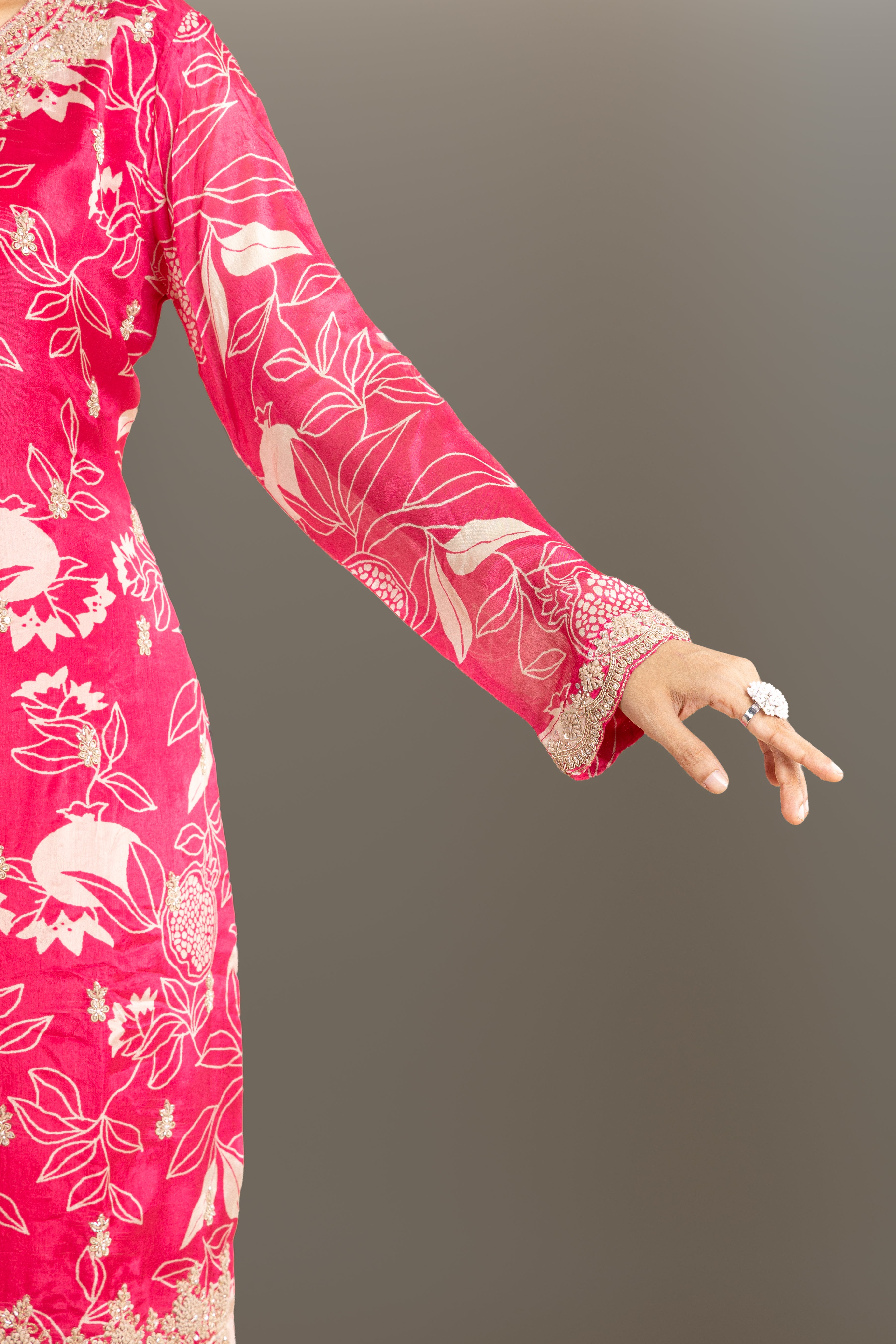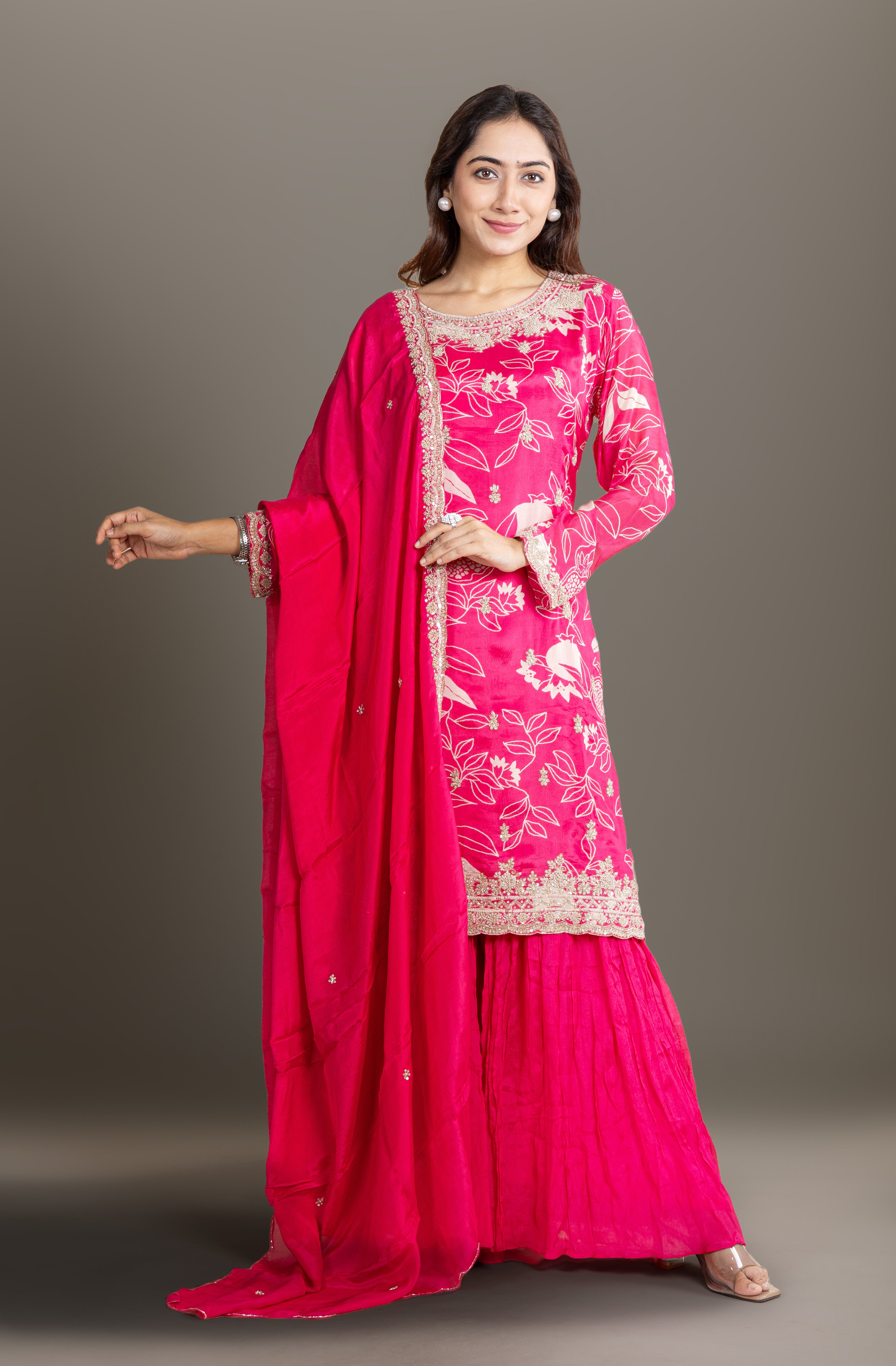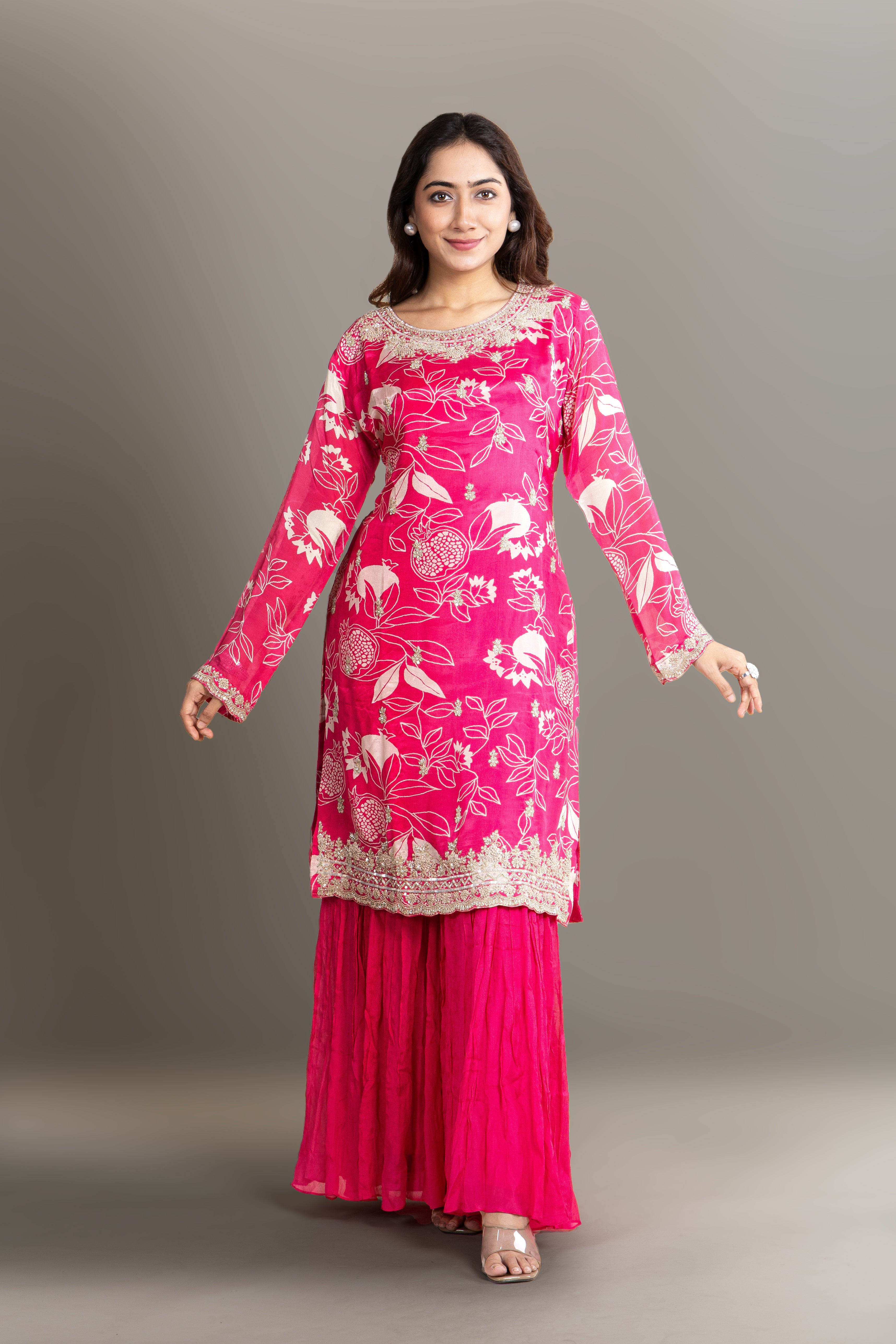 Fuchsia bloom kurta set with detailed embroidery on the kurta and flowing sharara, designed for statement festive dressing, perfect for sangeet nights and traditional gatherings.