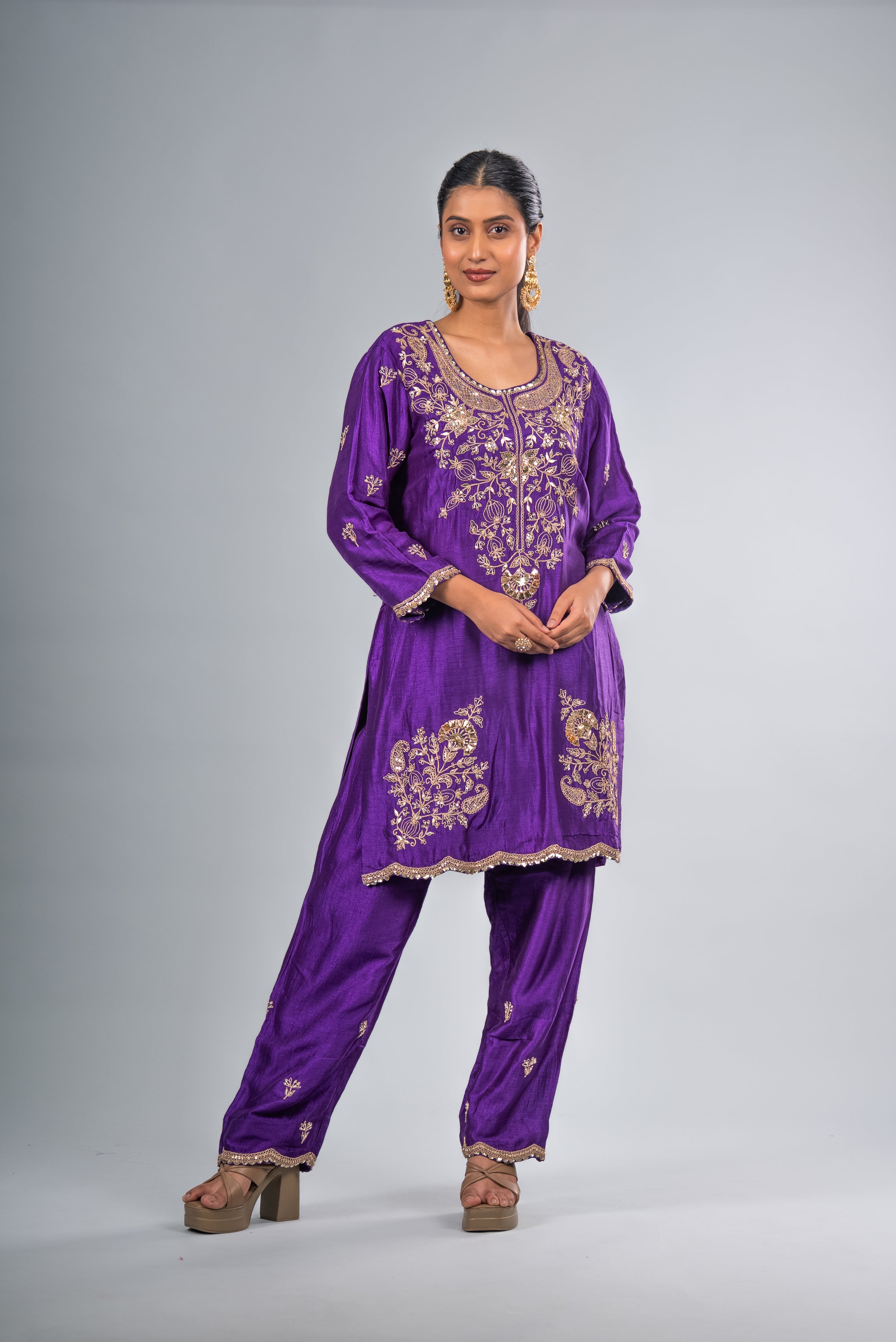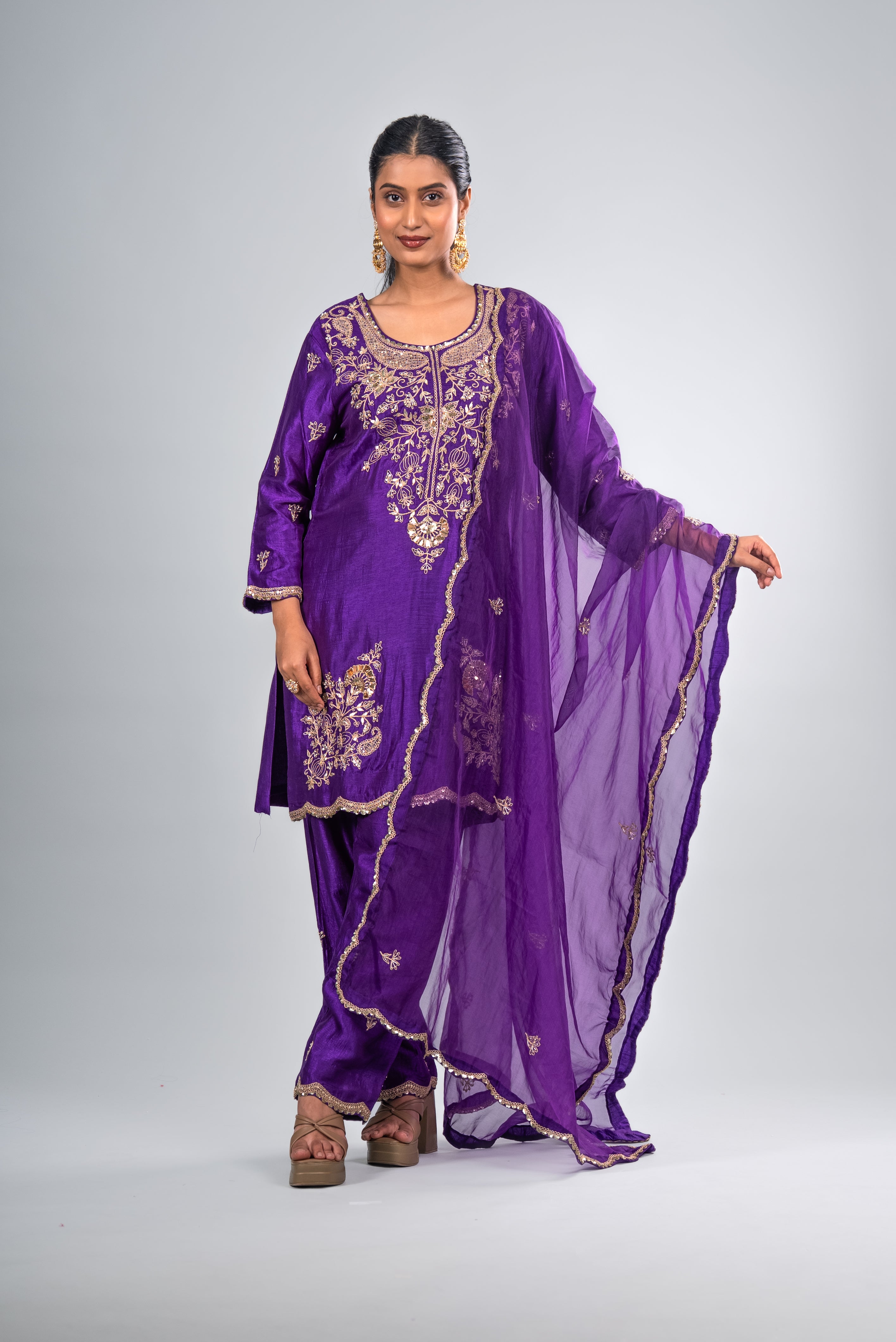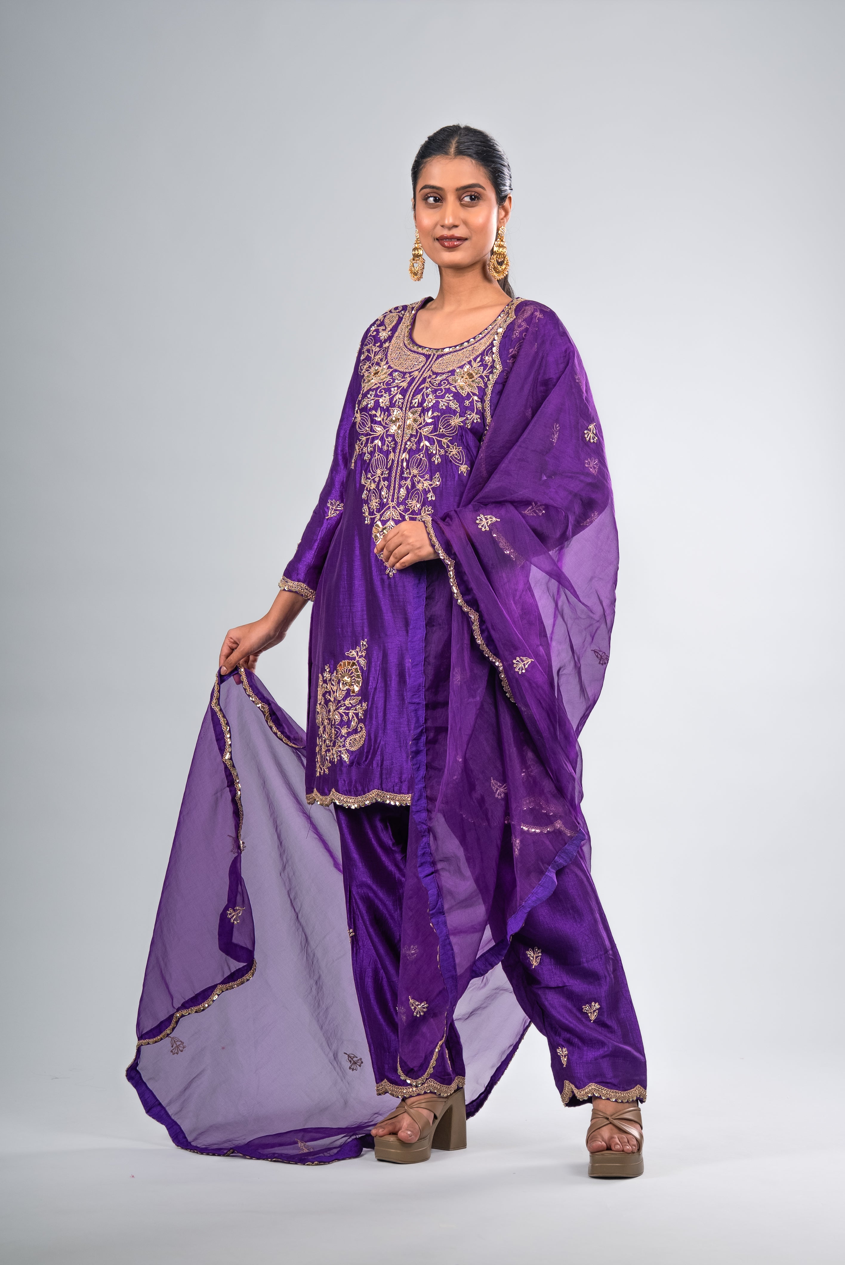 This royal purple suit is adorned with intricate golden embroidery, paired with matching bottoms and a flowing dupatta. A regal choice for festive evenings, weddings, and cultural gatherings.