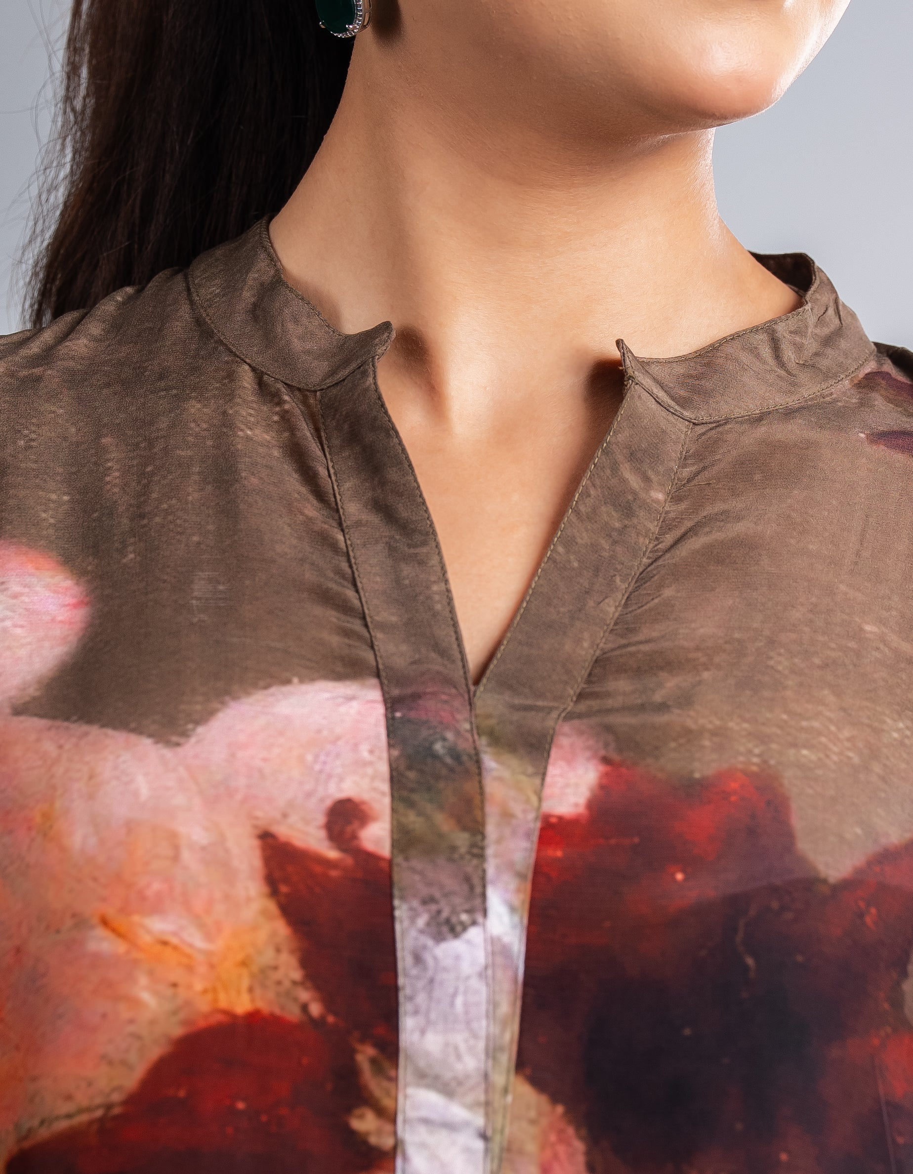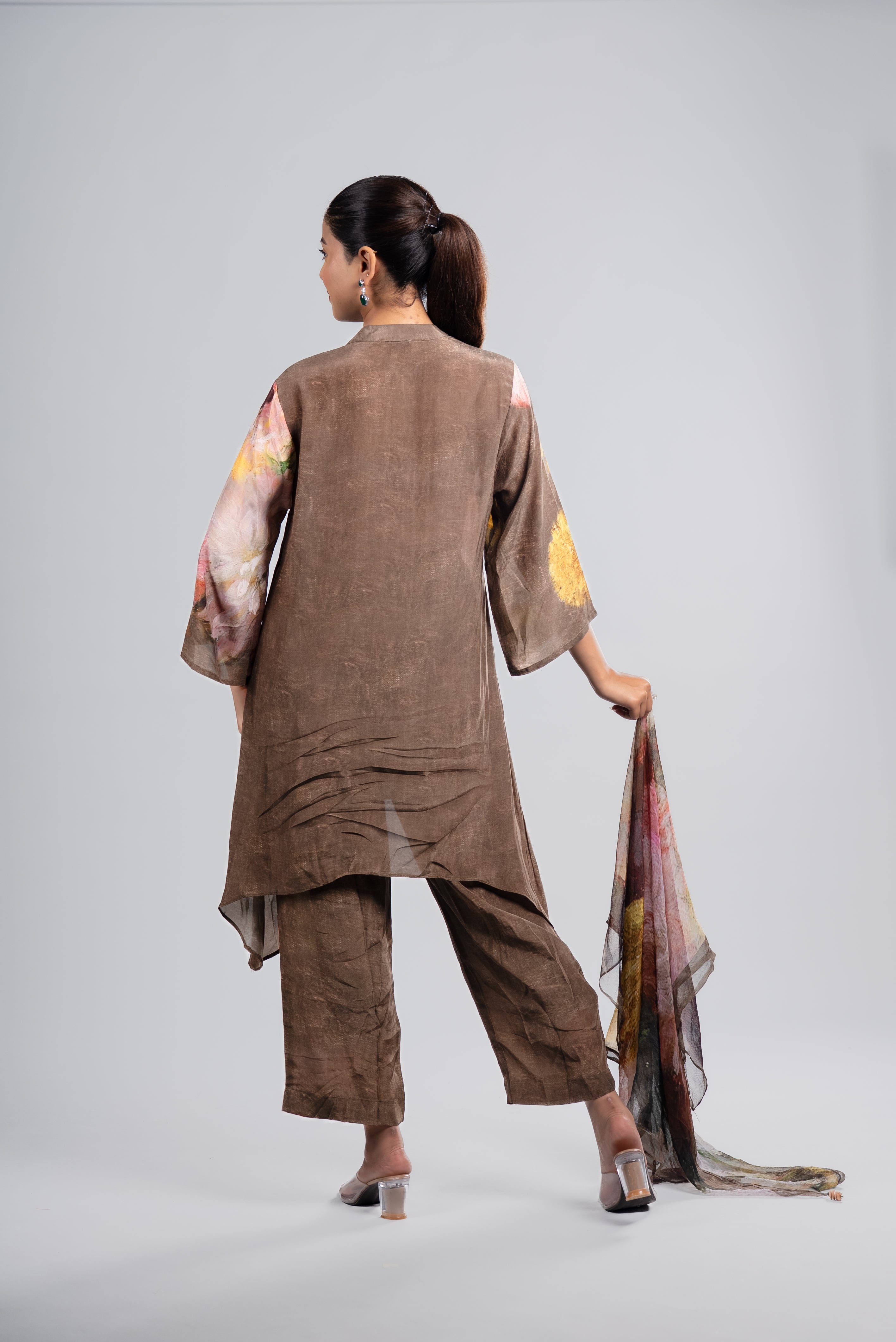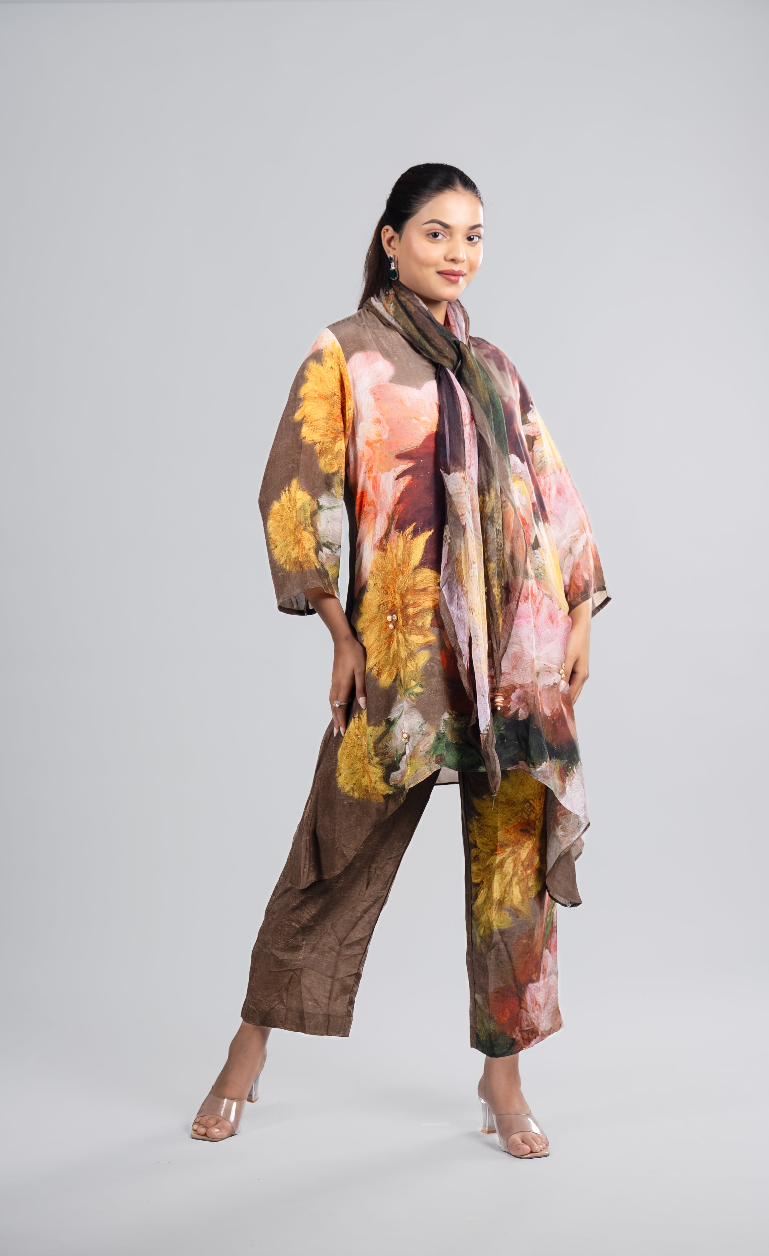 Elevate your ethnic wardrobe with this earthy brown co-ord set adorned with vibrant floral prints. Its flowing silhouette and lightweight fabric make it chic yet effortlessly comfortable.