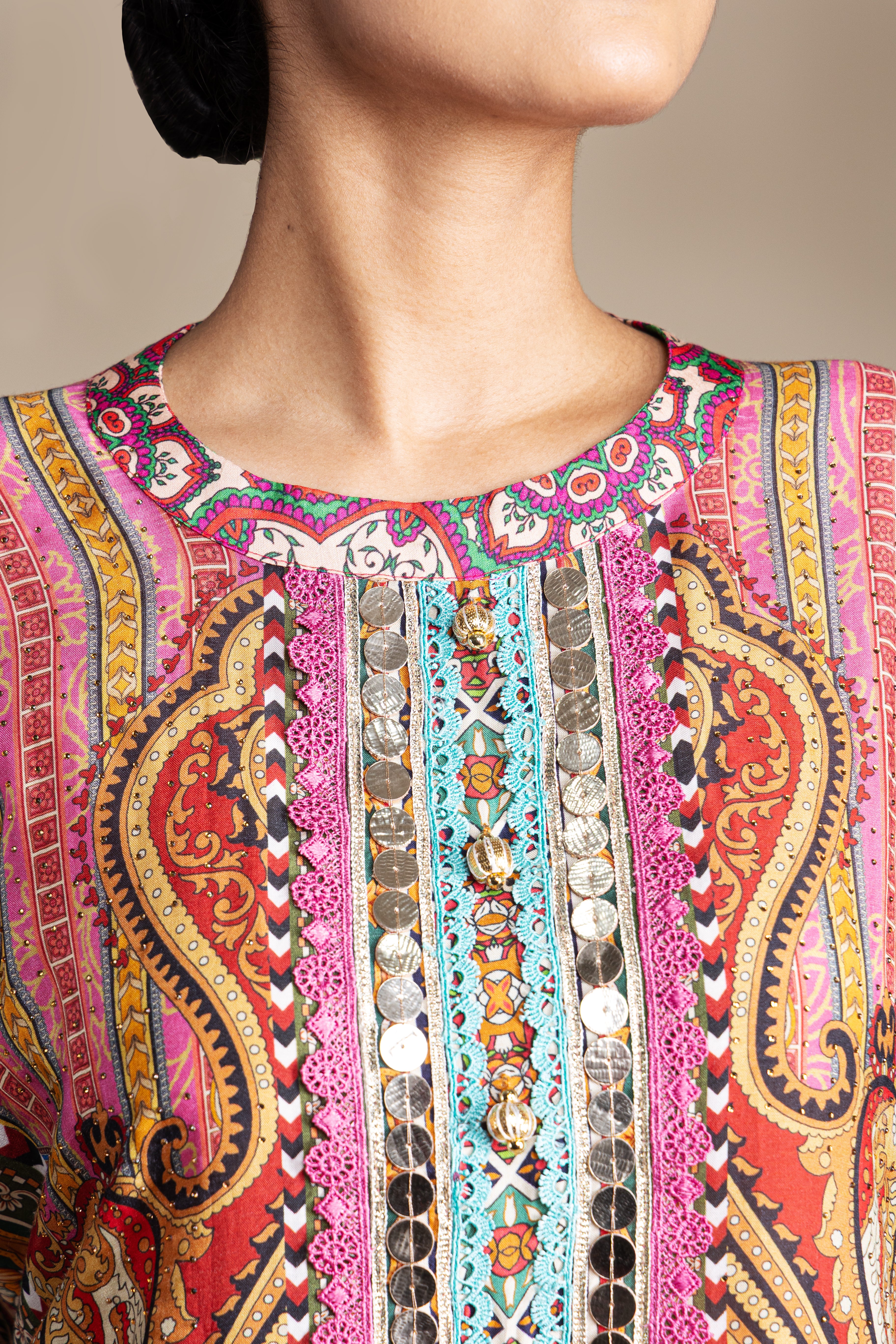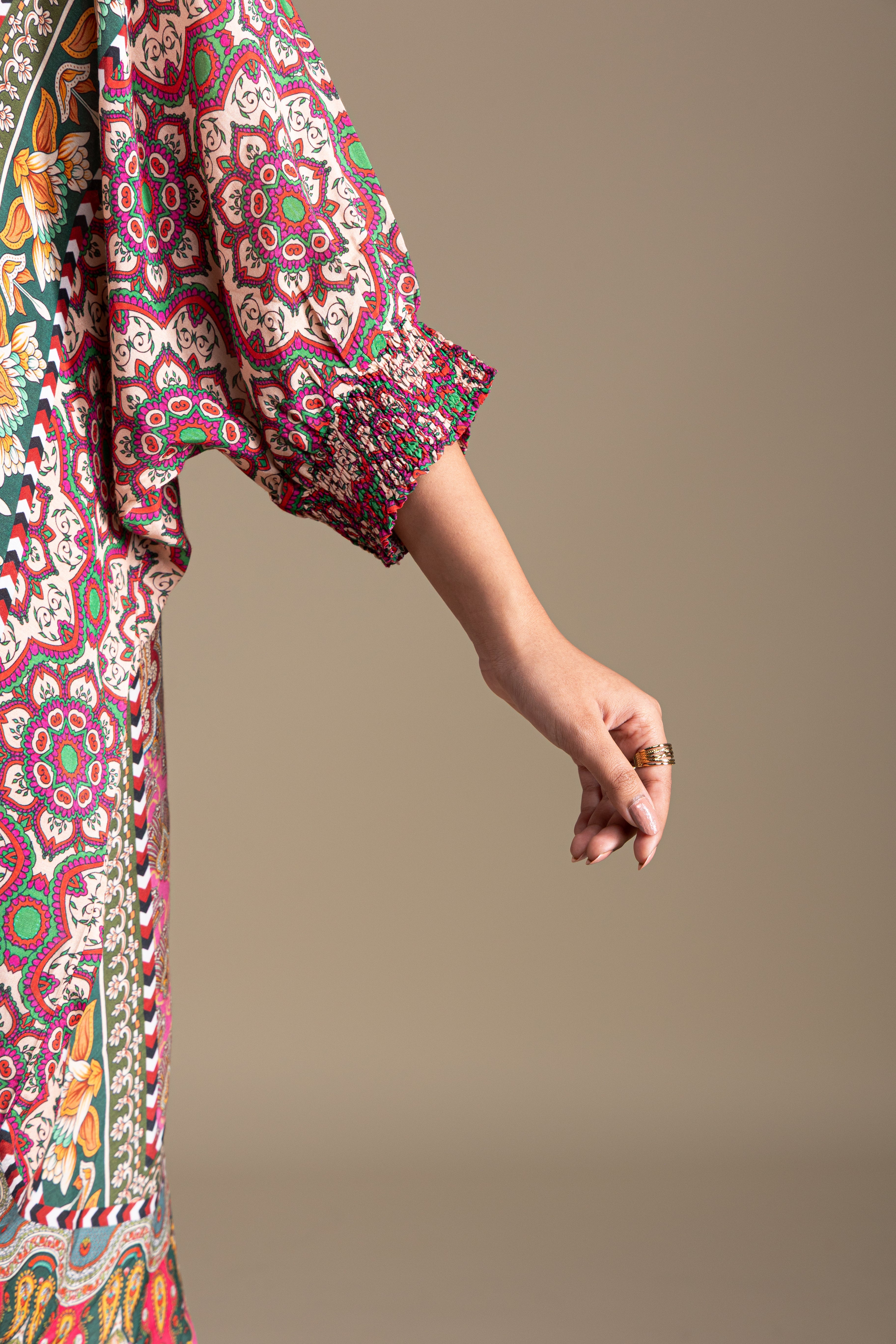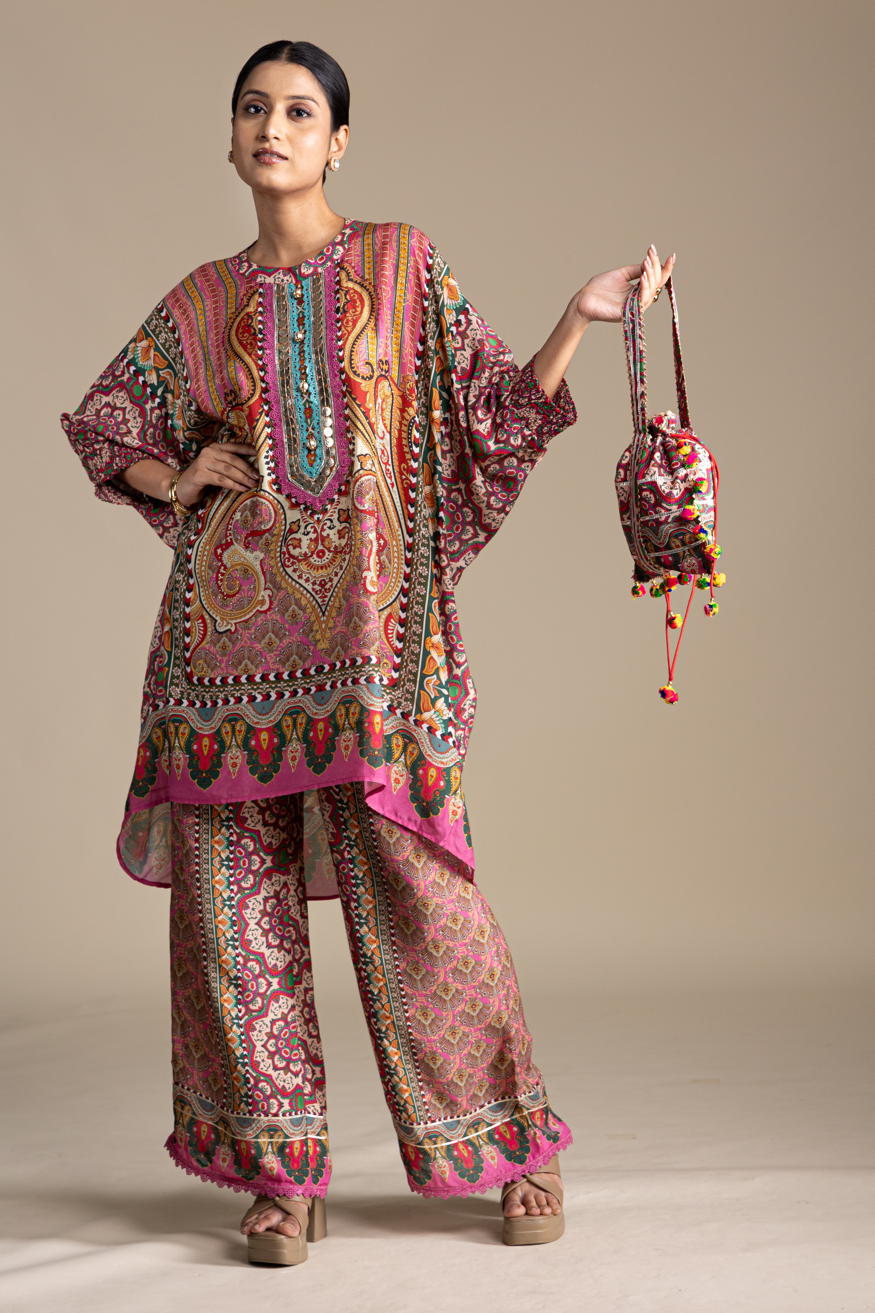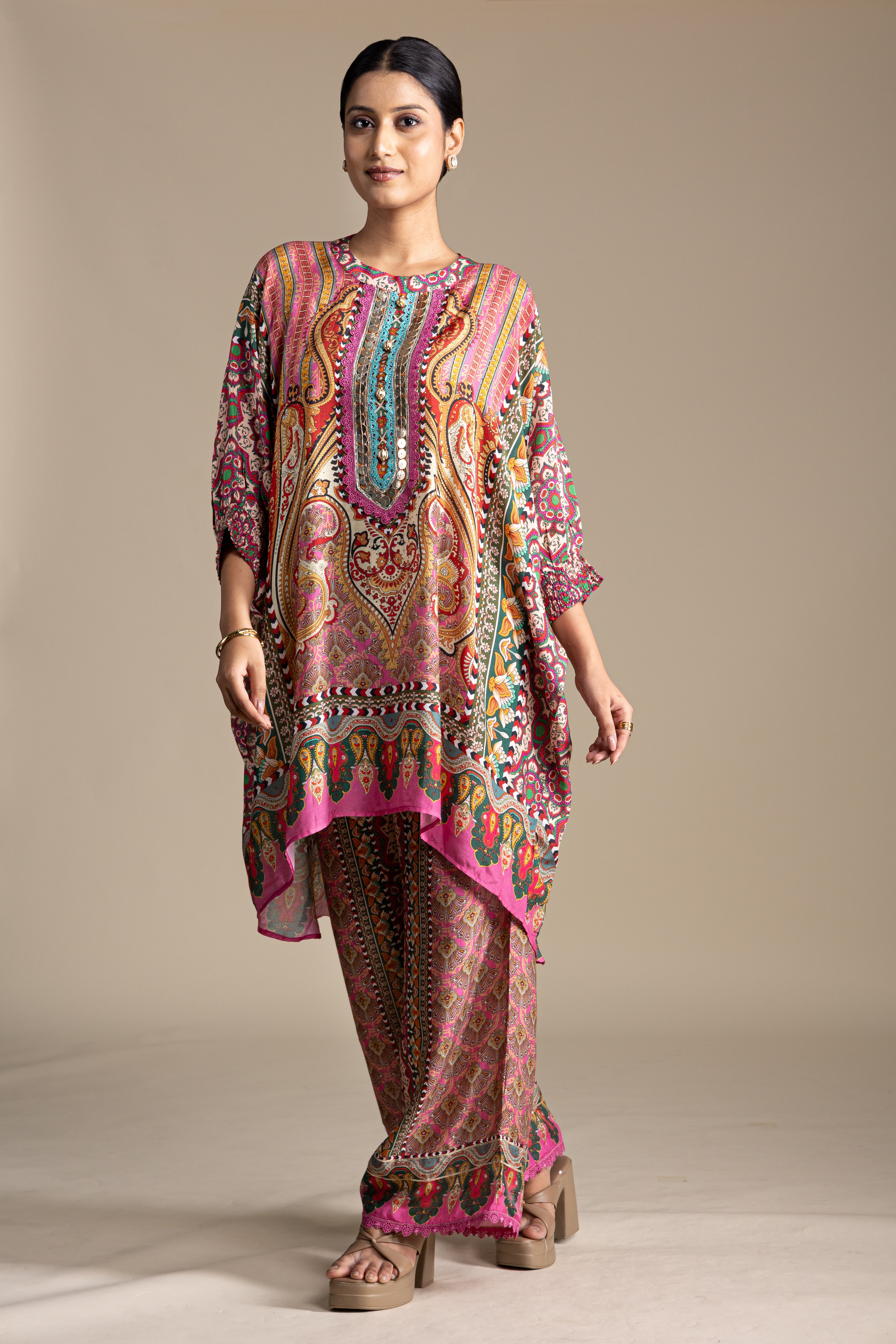 This bohemian multi-coloured kaftan co-ord set features intricate traditional prints, creating a vibrant statement look. Ideal for ethnic wear lovers who enjoy bold, expressive fashion.