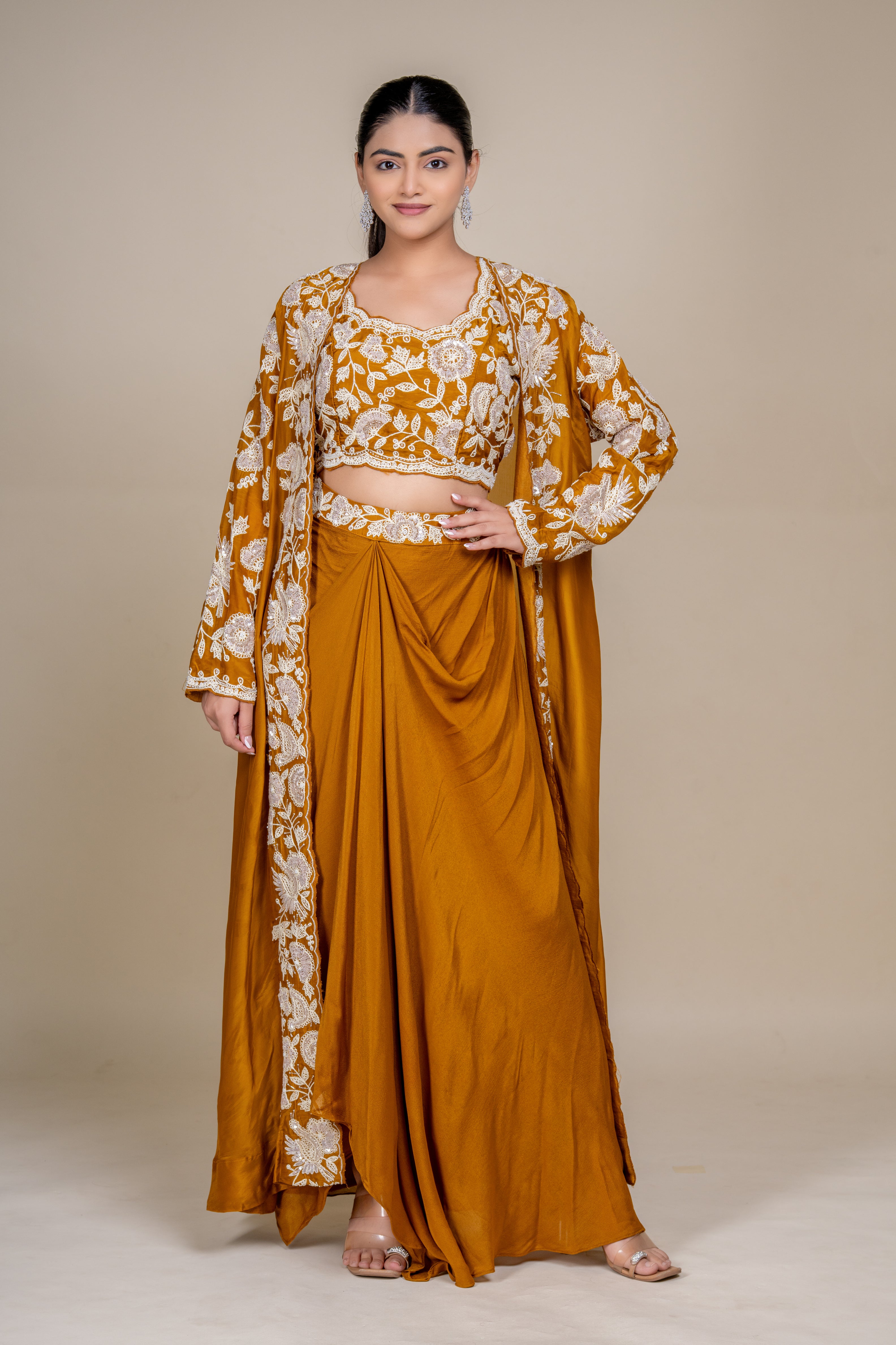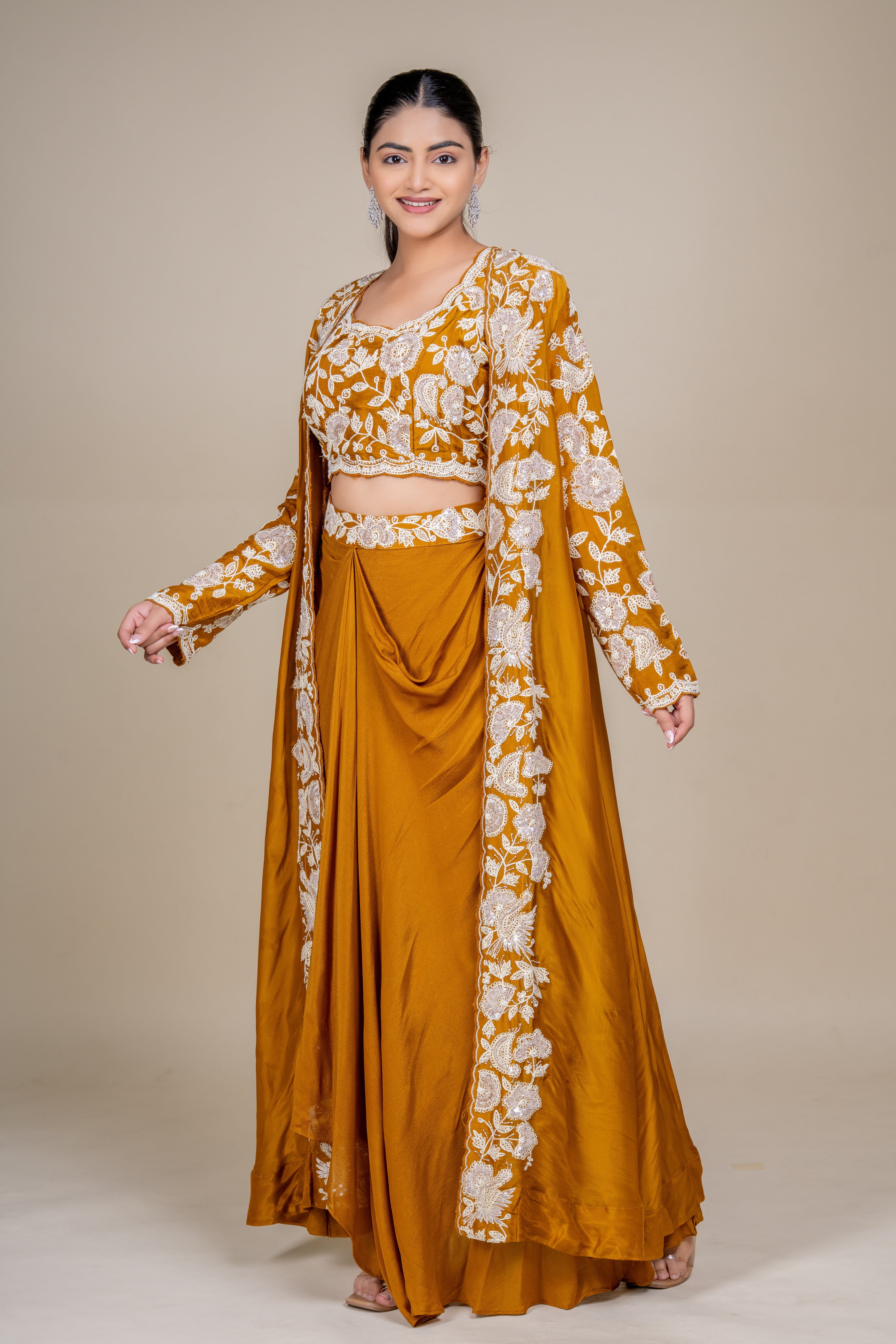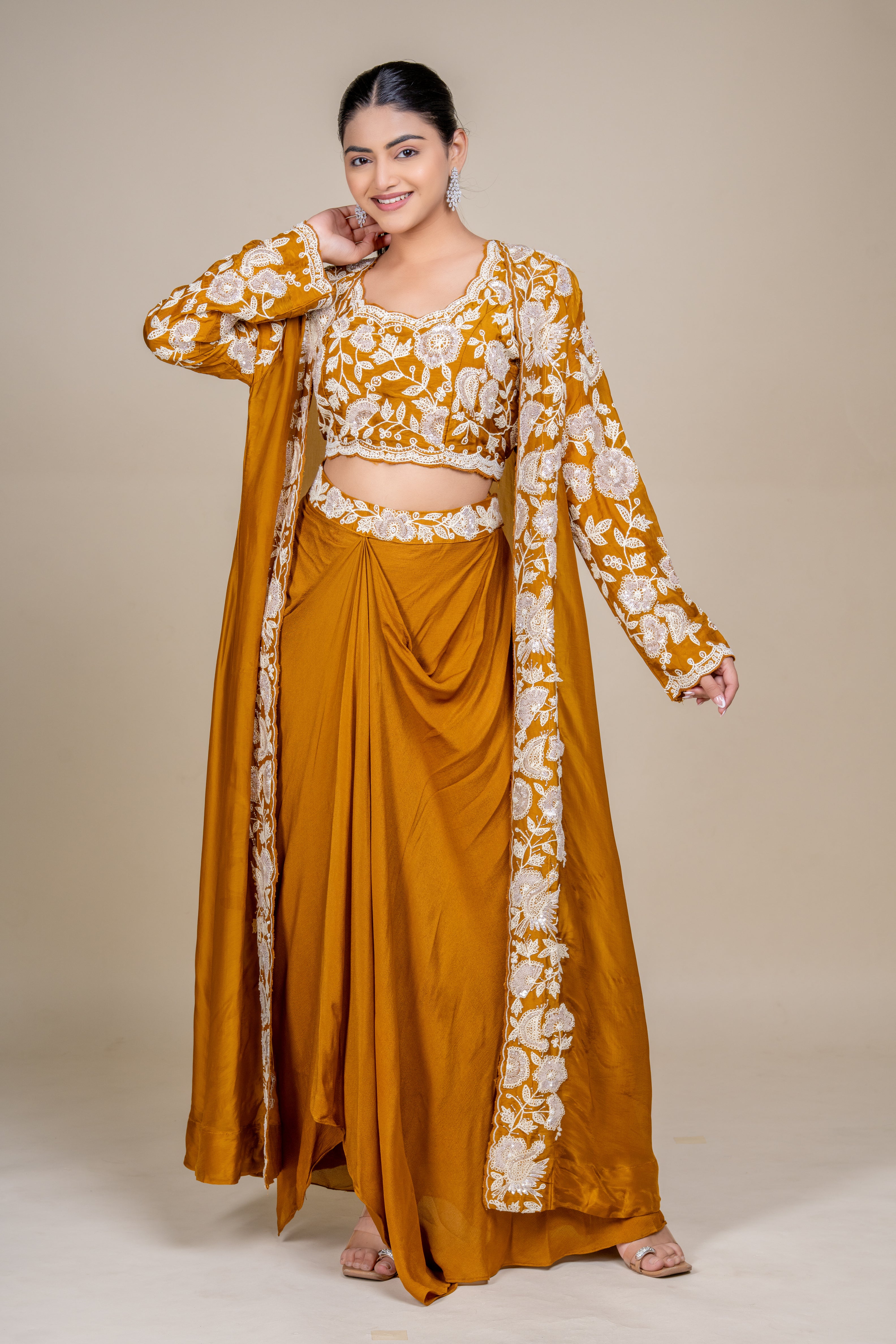 An opulent royal saffron silk drape skirt set featuring delicate white floral embroidery, statement blouse, and flowing long jacket—perfect for refined festive celebrations and luxury occasion wear.