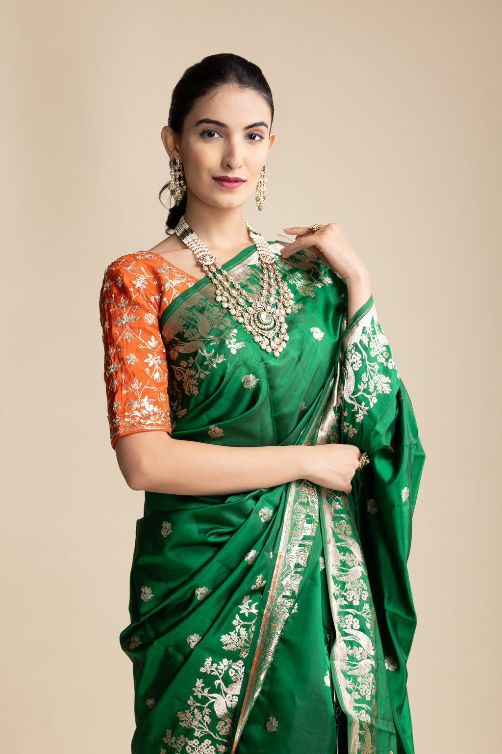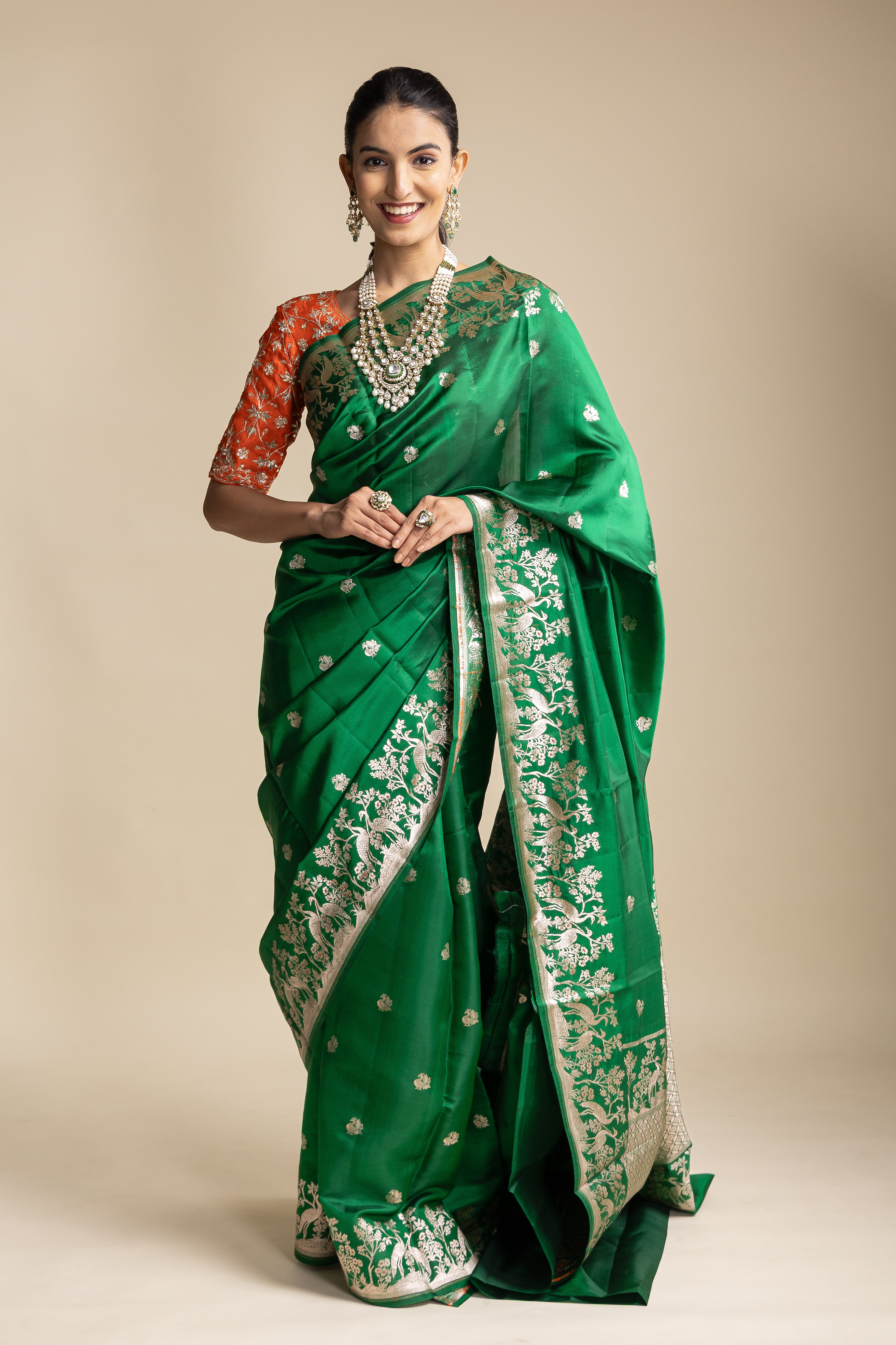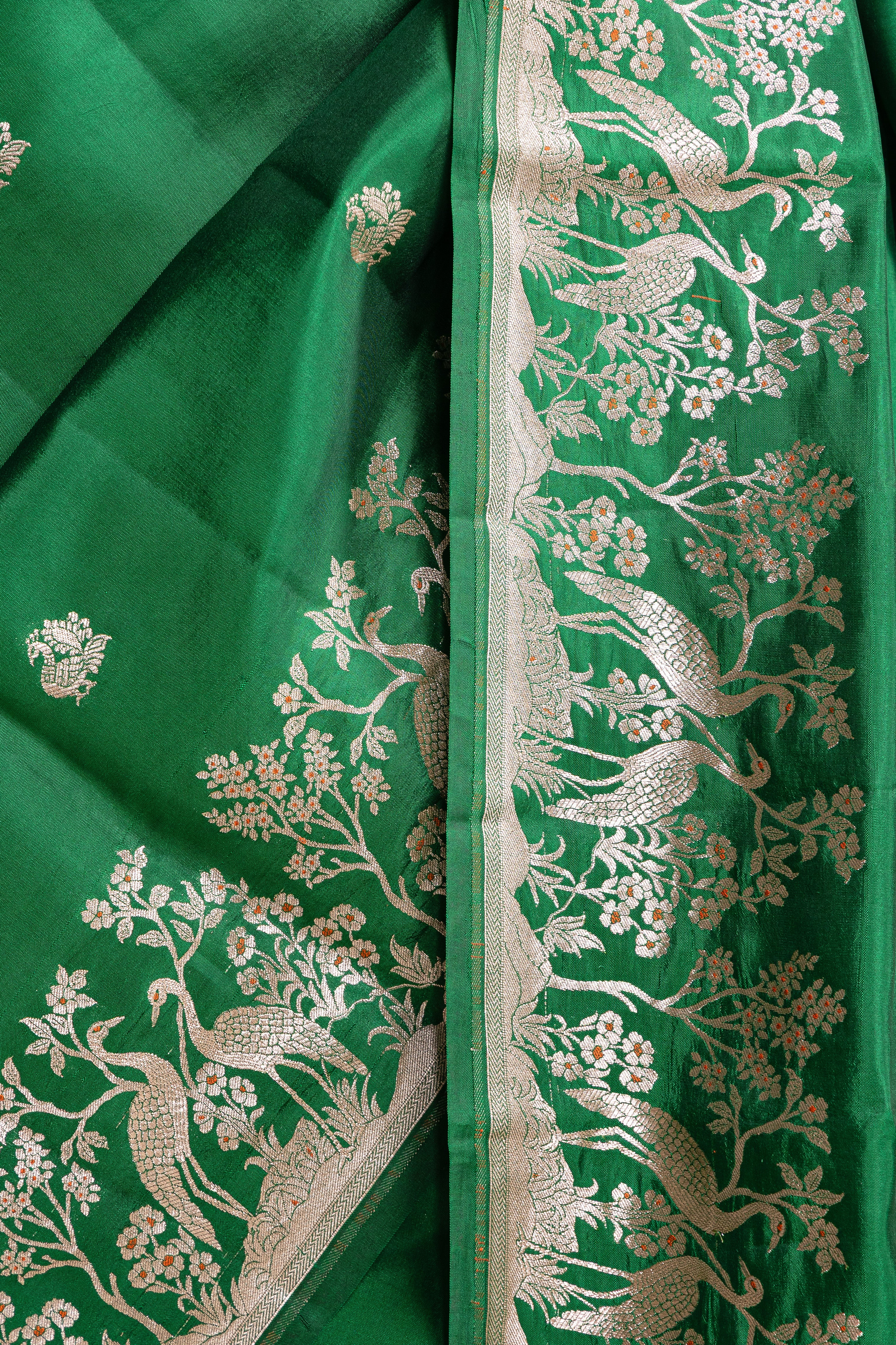 This imperial emerald green Banarasi silk saree features intricate zari and fine woven detailing, offering a rich, luxurious drape perfect for grand festive occasions and premium wedding celebrations