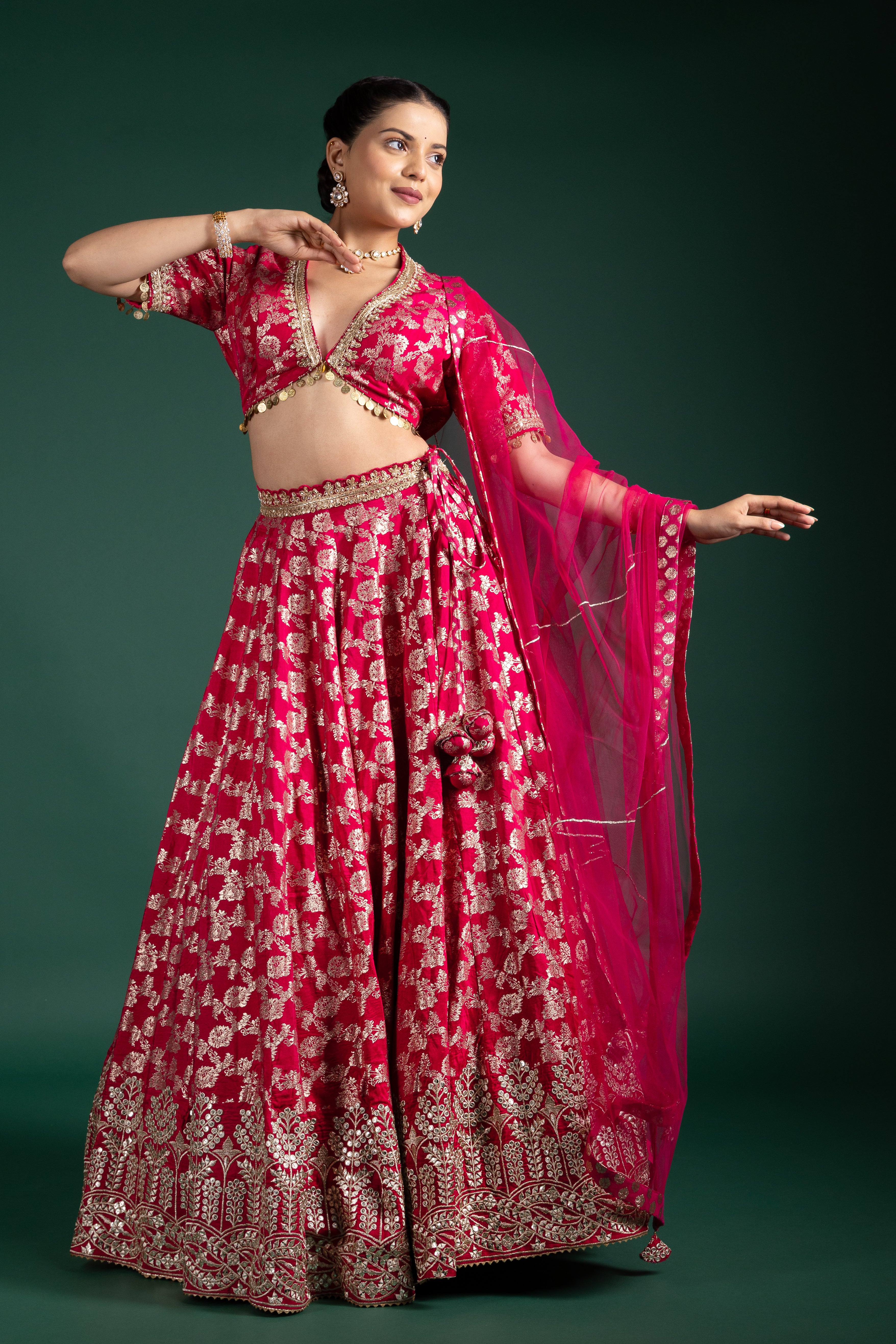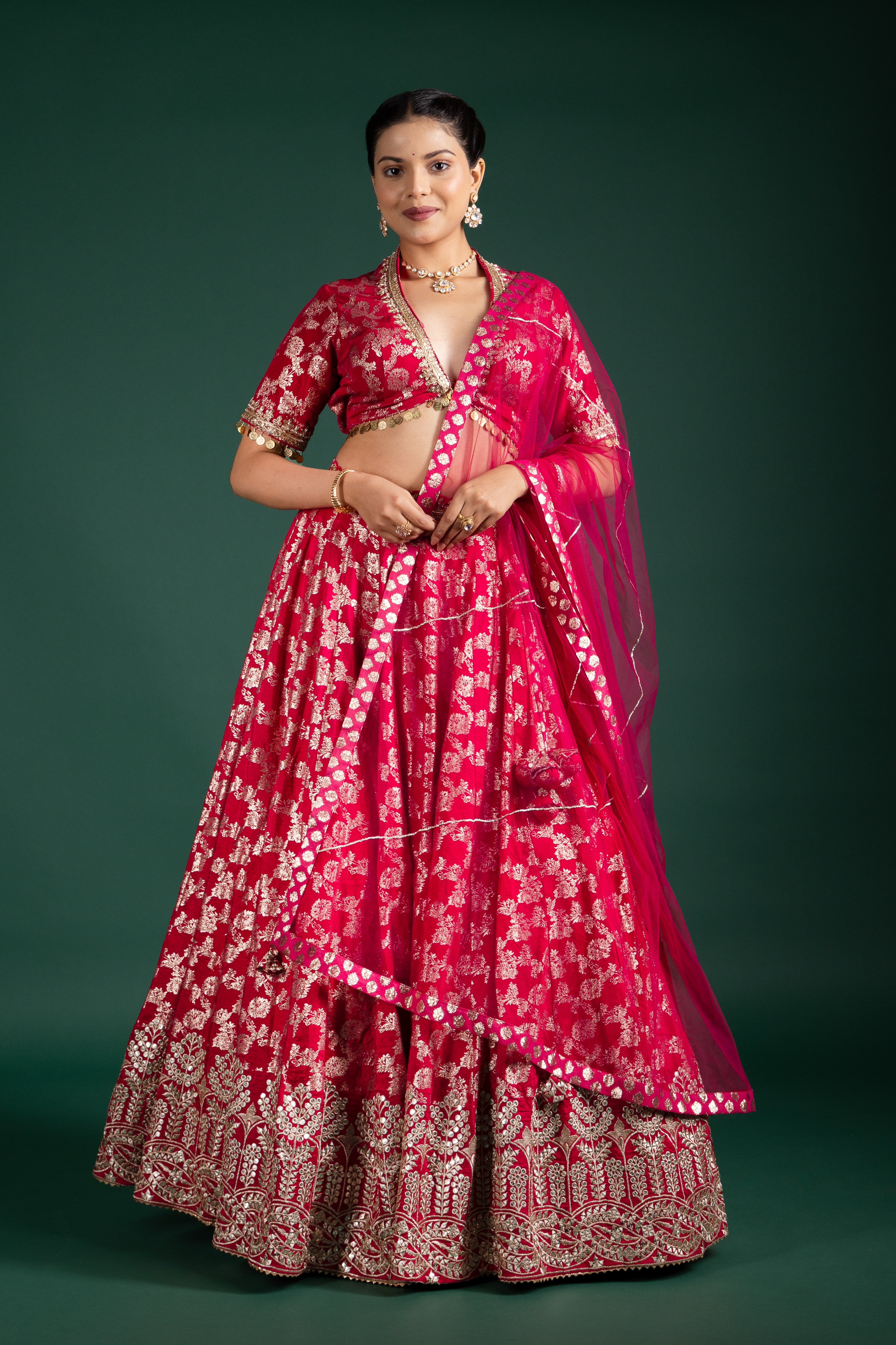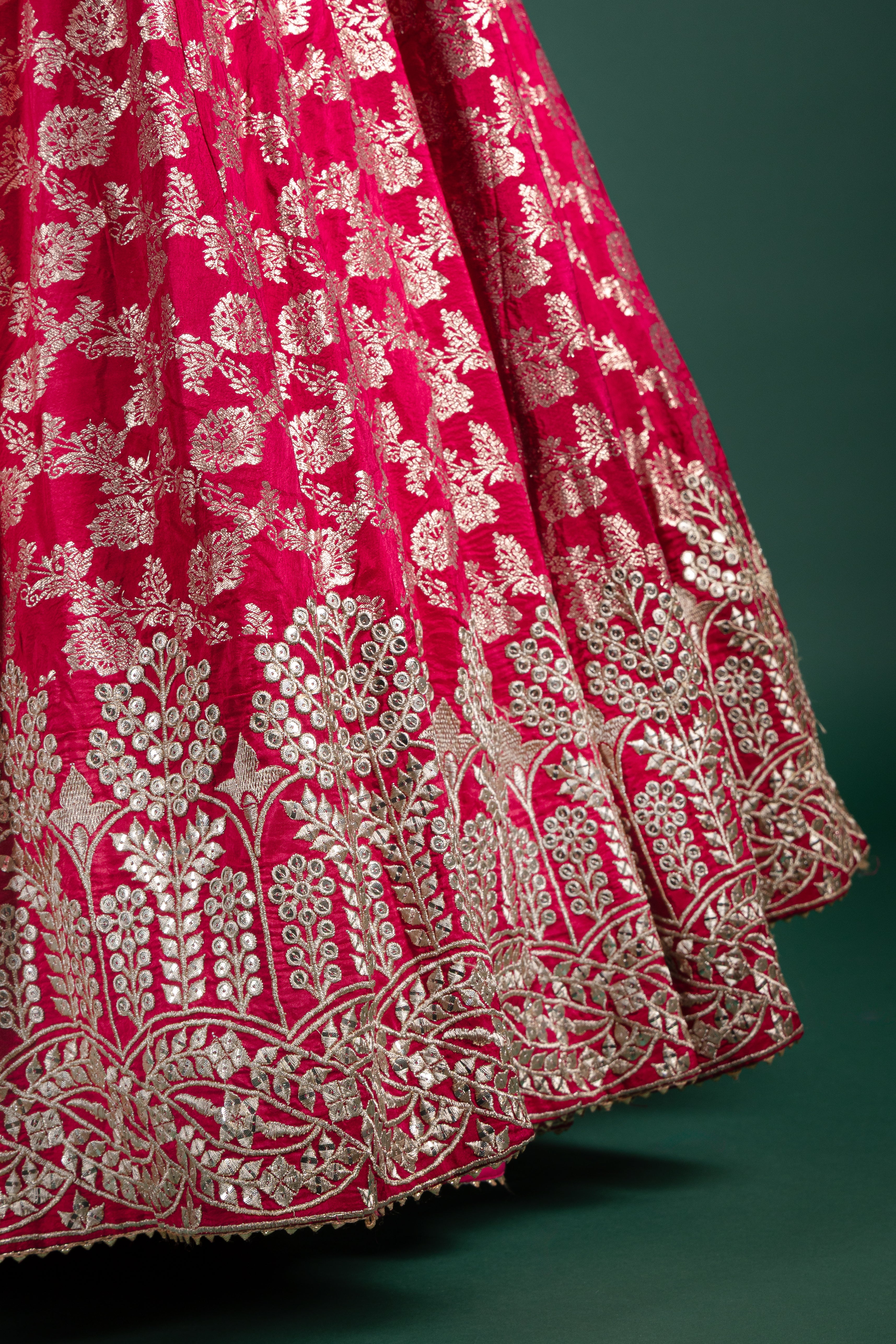 This fuchsia pink lehenga with shimmering golden zari work exudes power and poise, perfect for brides seeking a modern yet traditional look.