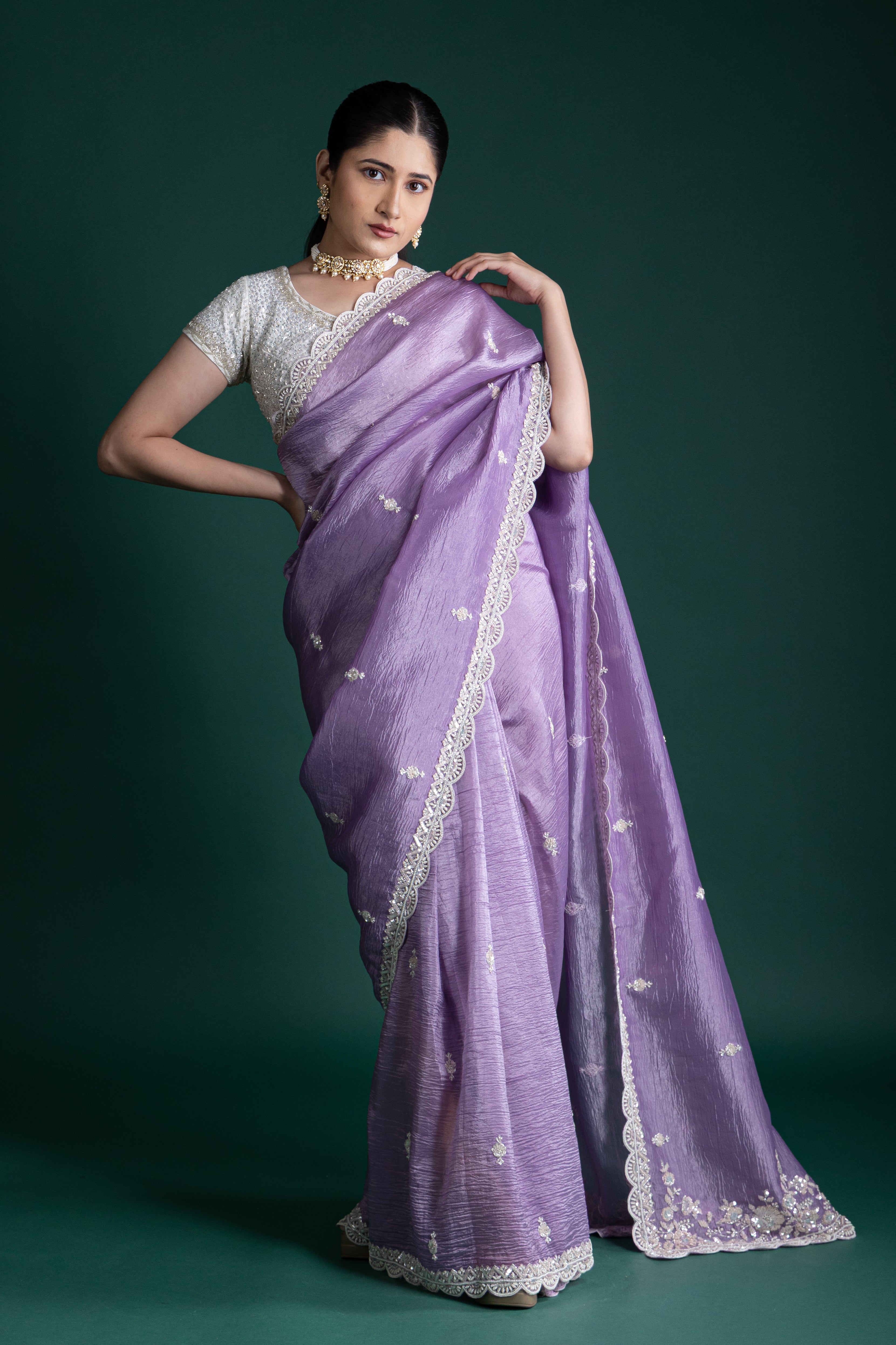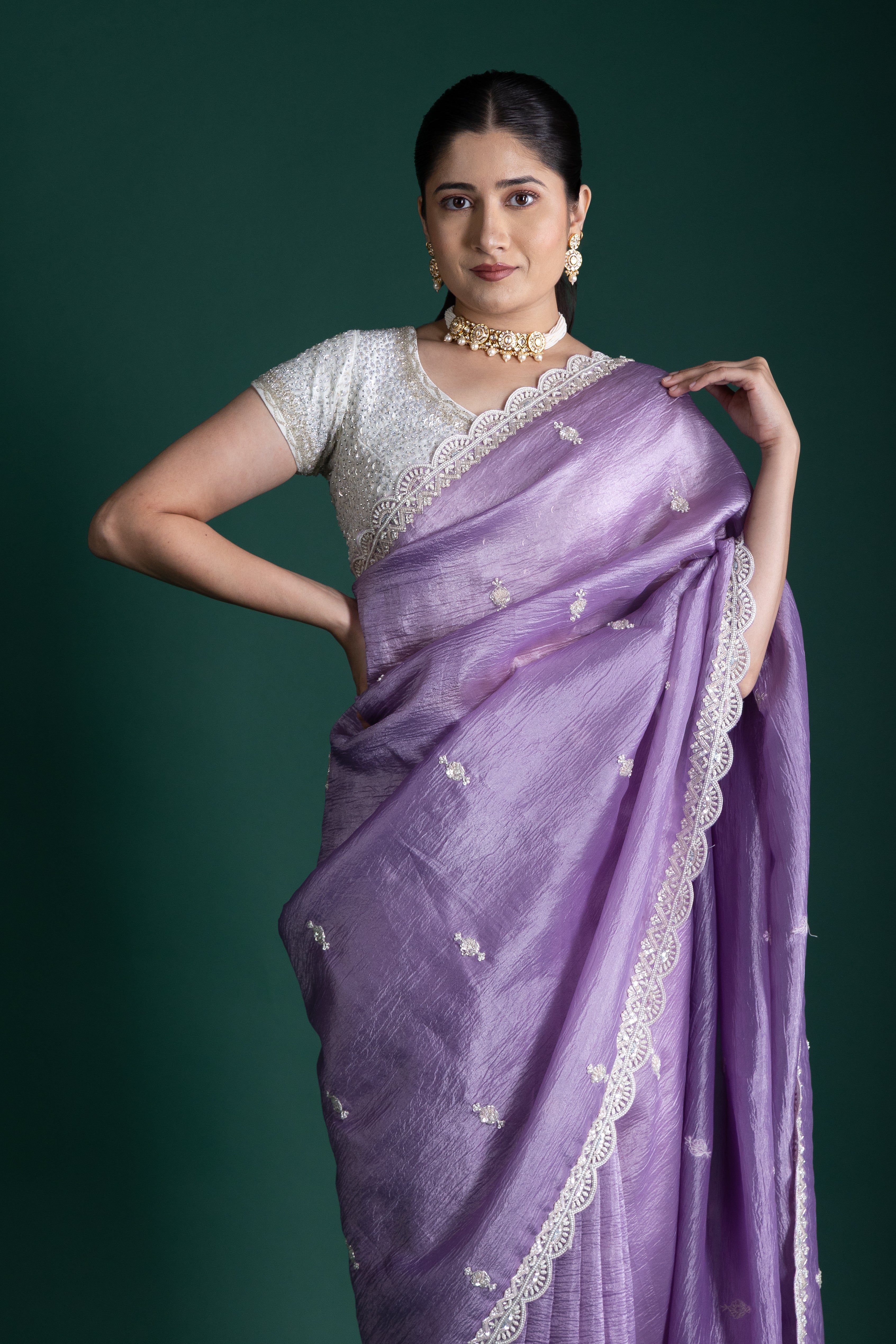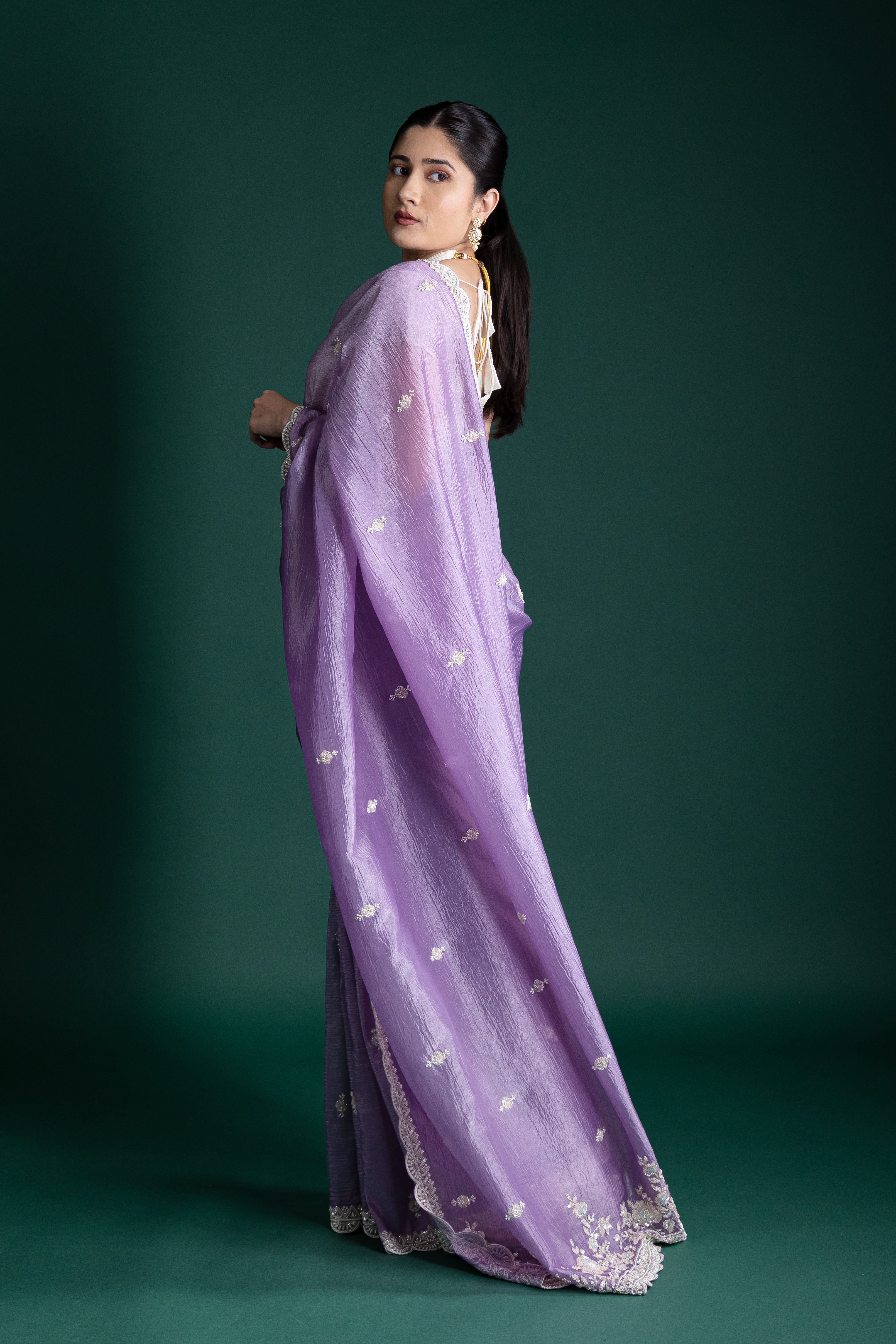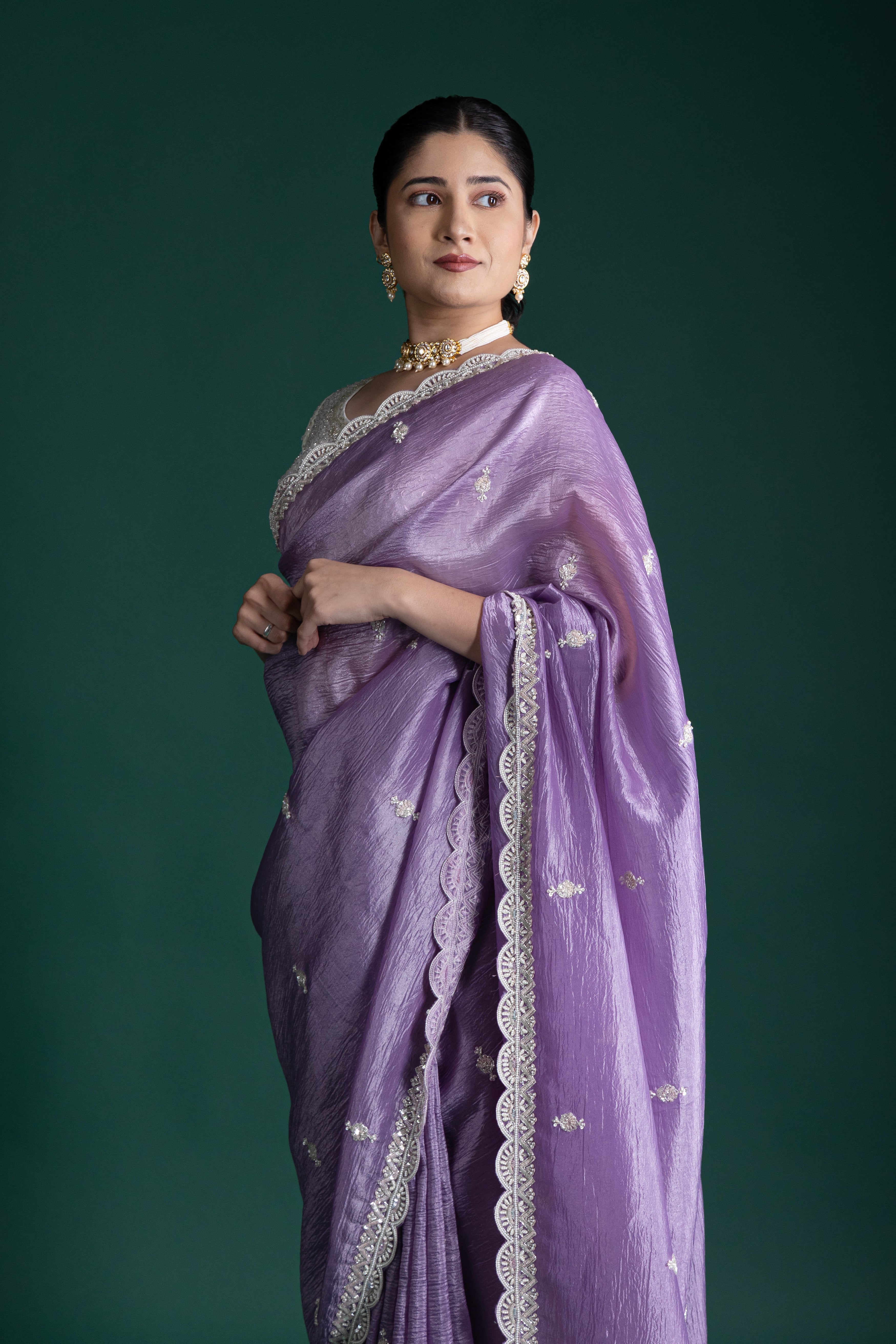 A luxurious lavender silk saree featuring fine silver thread embroidery, perfect for graceful celebrations and elegant evening soirées. Lightweight drape enhances timeless beauty and sophistication effortlessly.